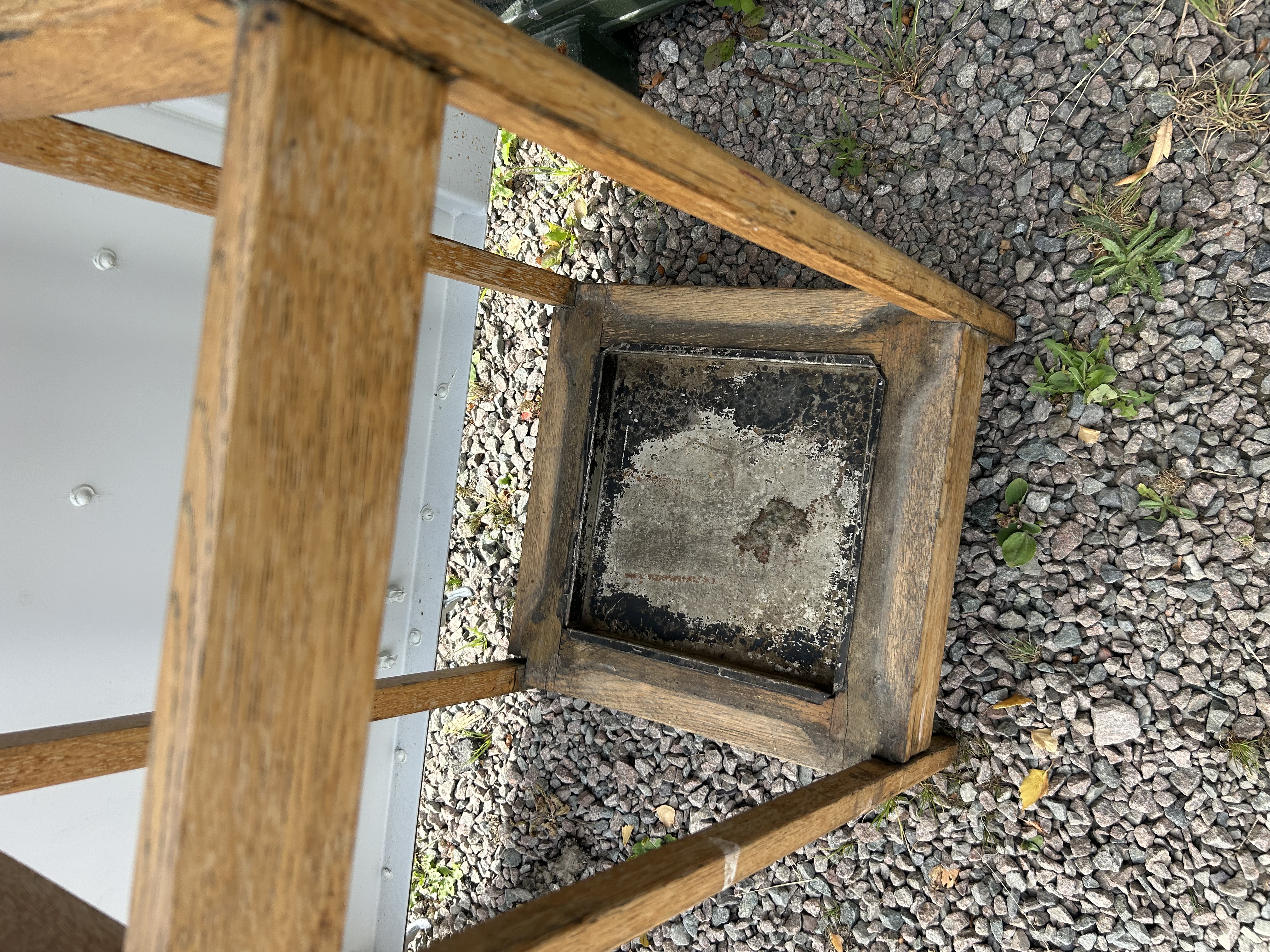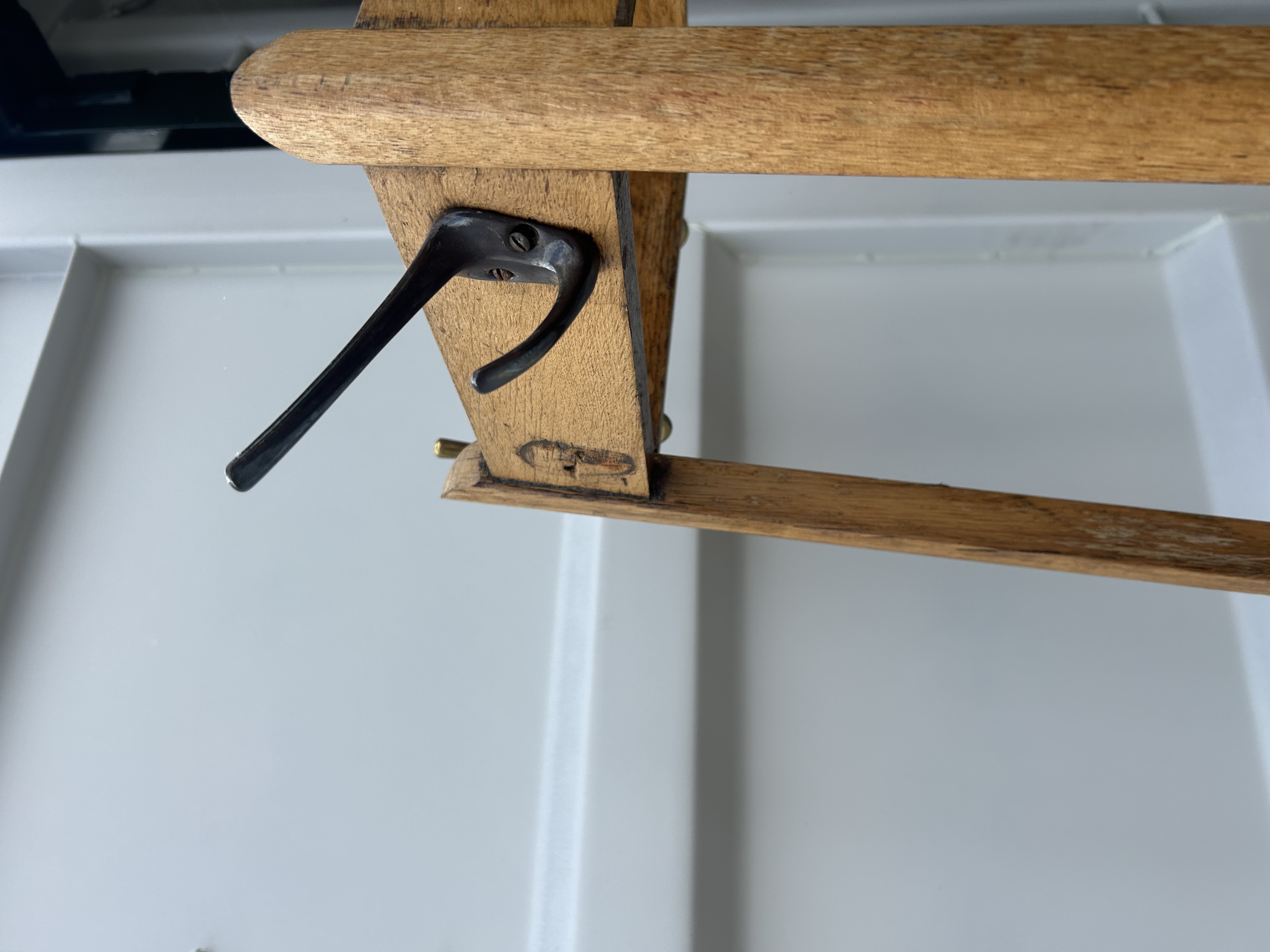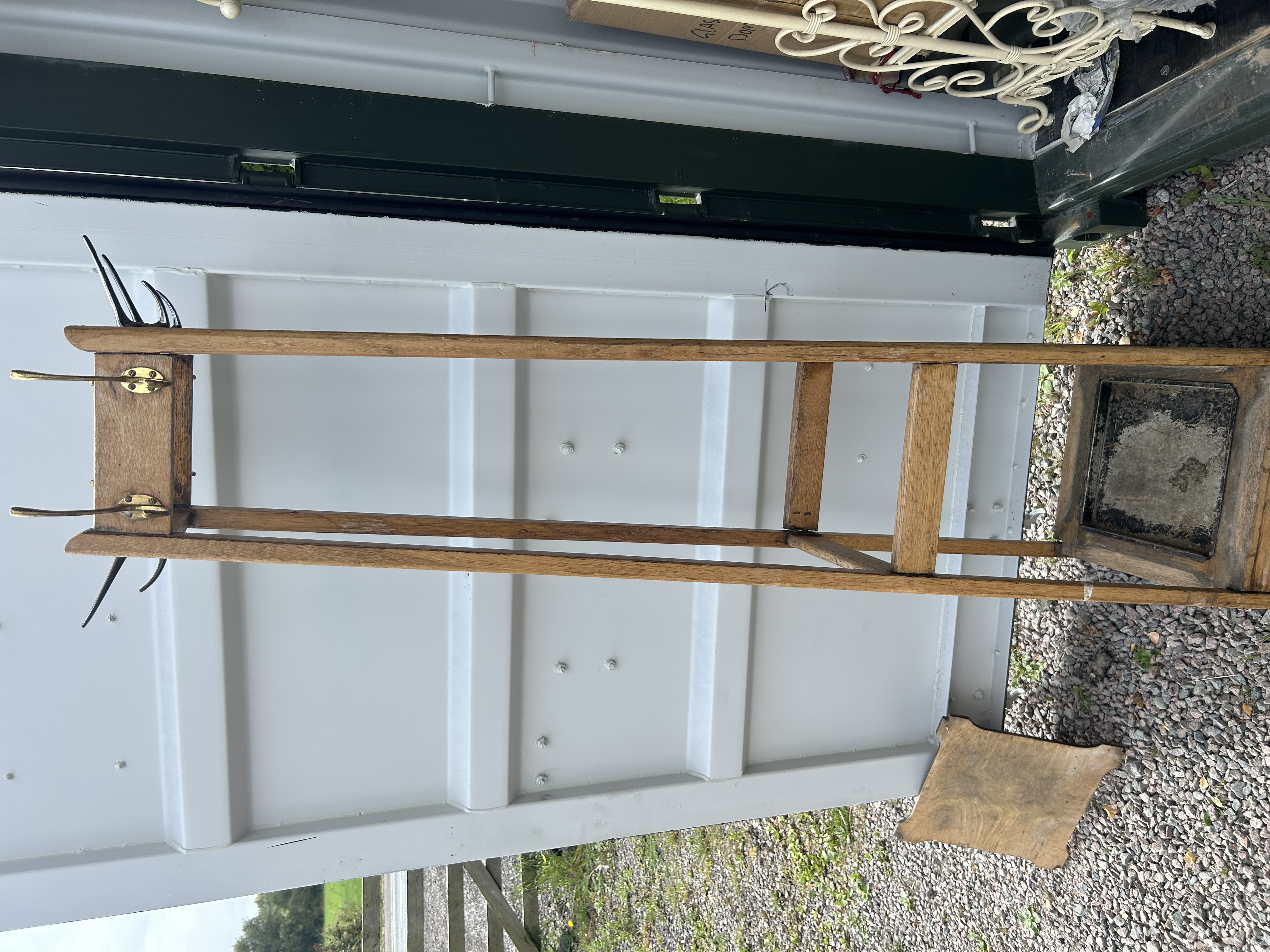 A tall, free-standing hall stand, likely dating to the early 20th century. Constructed primarily from a light-to-medium-toned hardwood, likely oak, it features an upper section fitted with a mix of dark-finished and brass-toned metal coat hooks. The base incorporates a wooden frame holding a removable, rectangular dark metal drip tray, suggesting its function as an umbrella or walking stick stand. A faint, indistinct branded or carved mark is visible on one wooden upright, but no clear text or maker’s details are discernible.