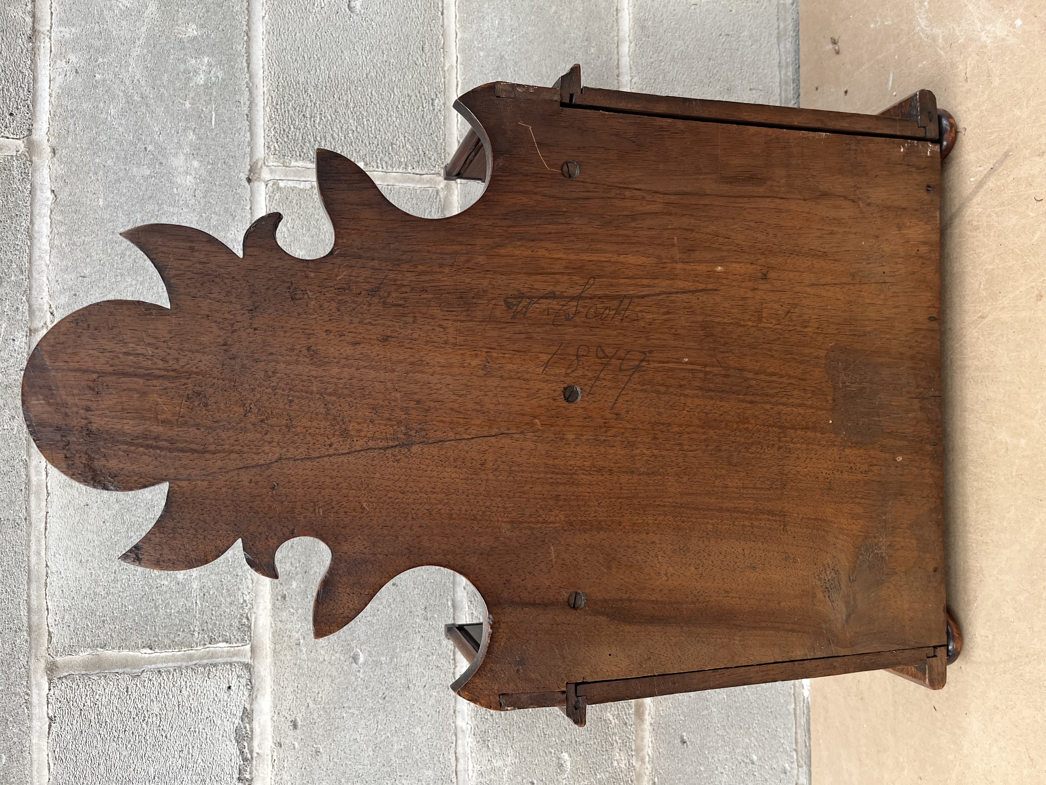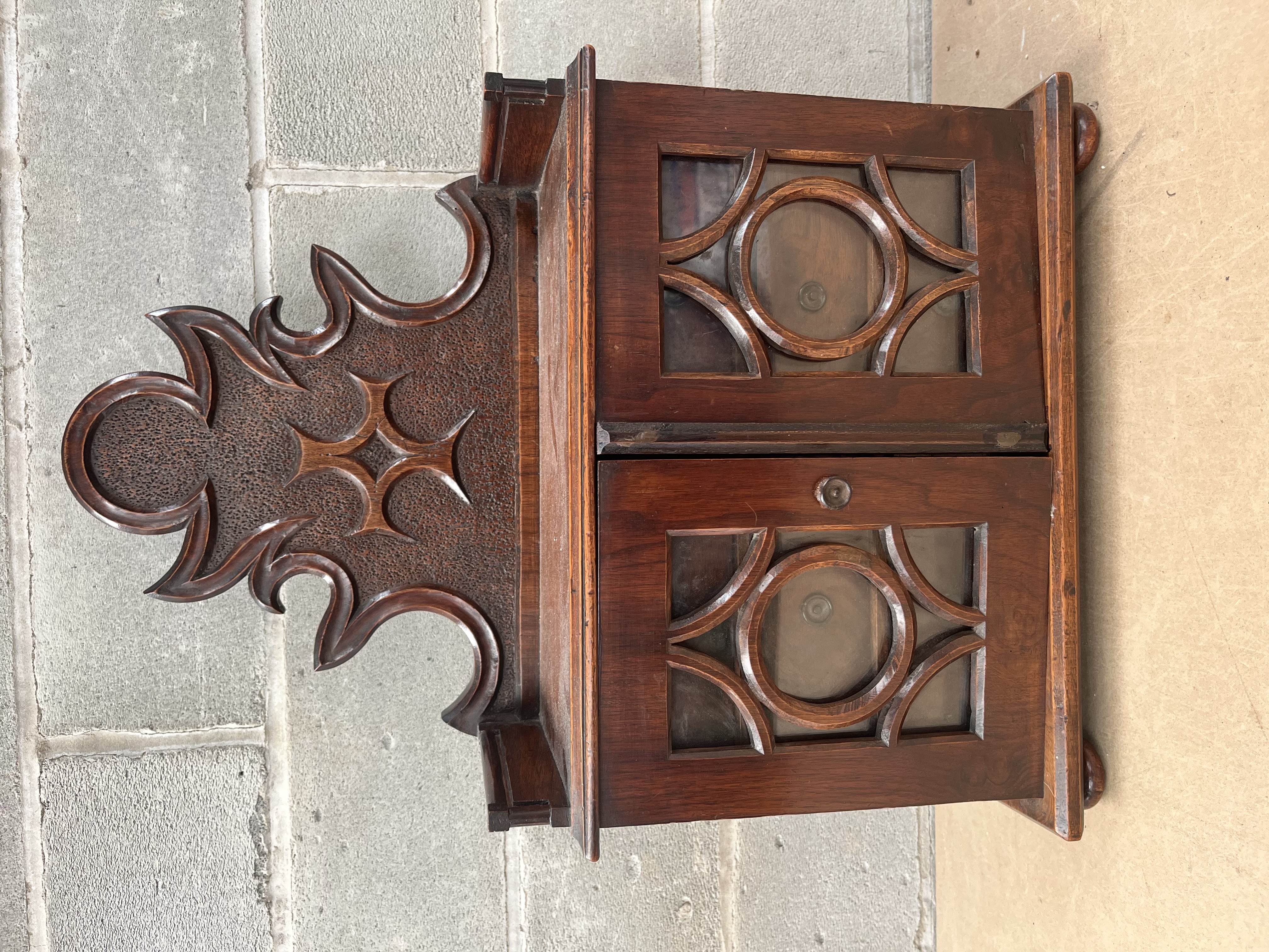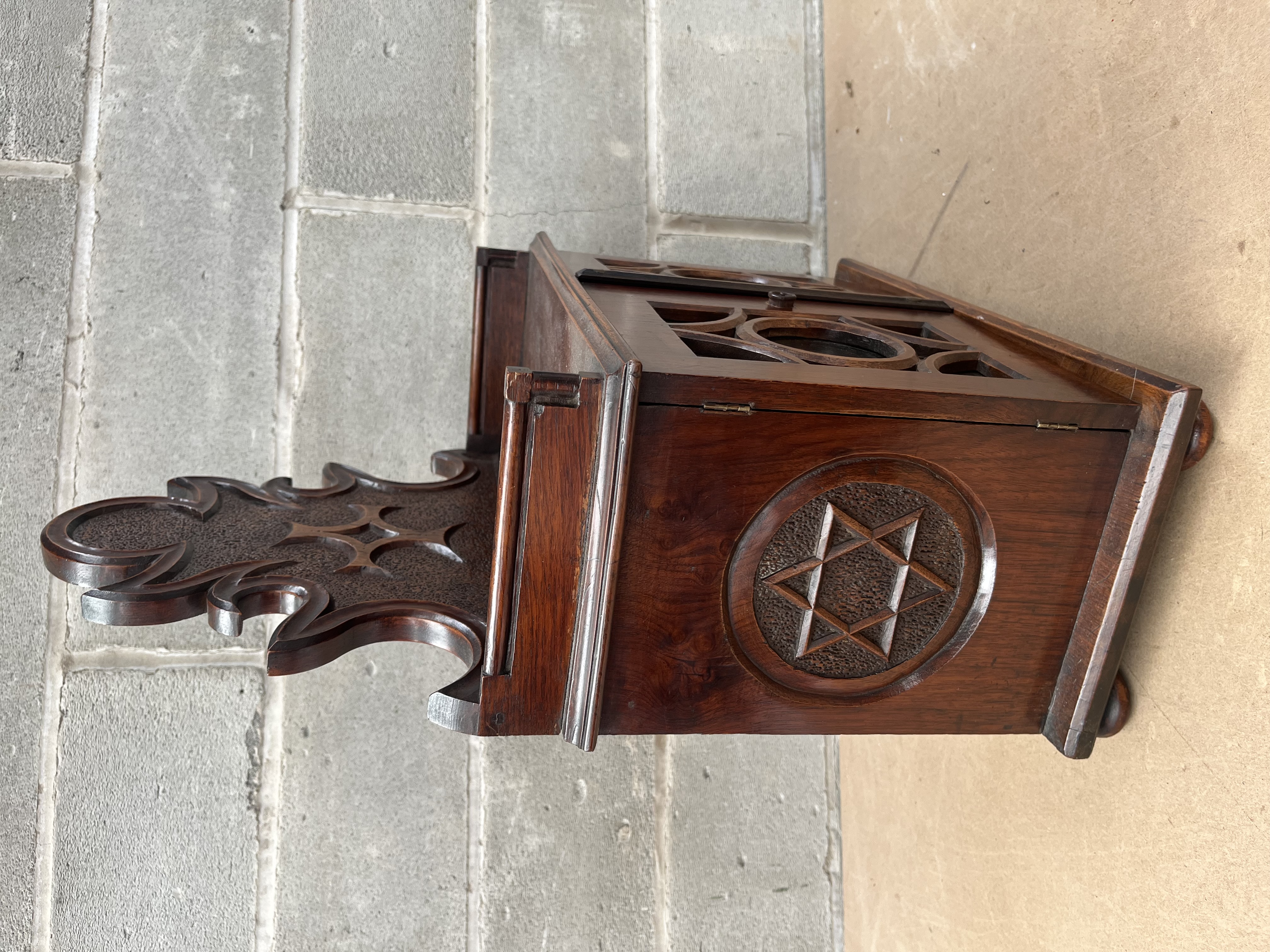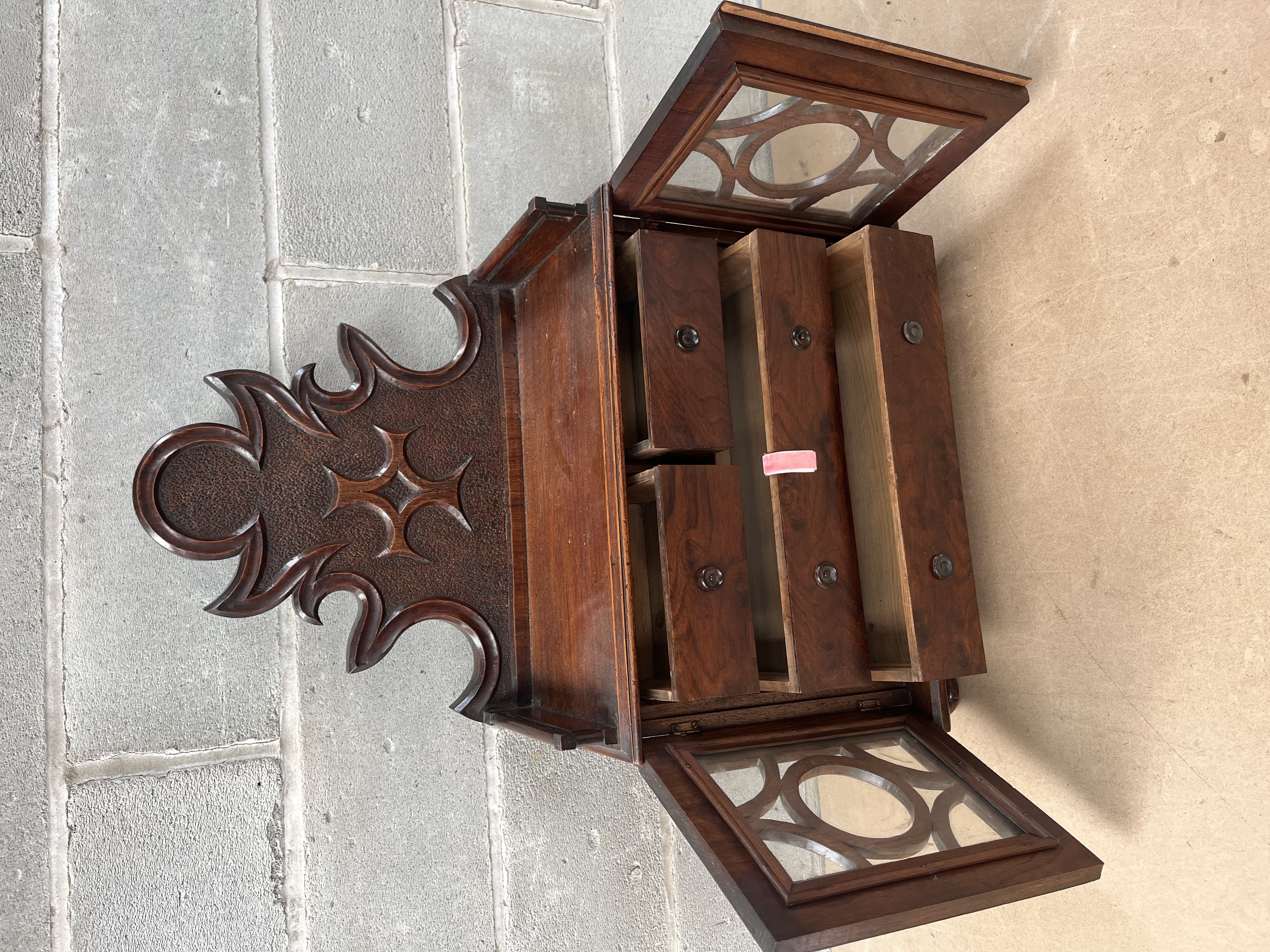 A dark, polished hardwood tabletop cabinet or miniature chest of drawers, dating to the Victorian period. The piece features an ornate, carved crest with a central quatrefoil motif. The front presents two doors with openwork geometric patterns and clear or frosted inserts, which open to reveal four small internal drawers fitted with wooden knobs. Each side panel is adorned with a prominent carved Star of David motif, suggesting a possible Judaica context. The back panel exhibits faint, illegible handwritten numbers, possibly a date. The piece rests on four small bun feet.