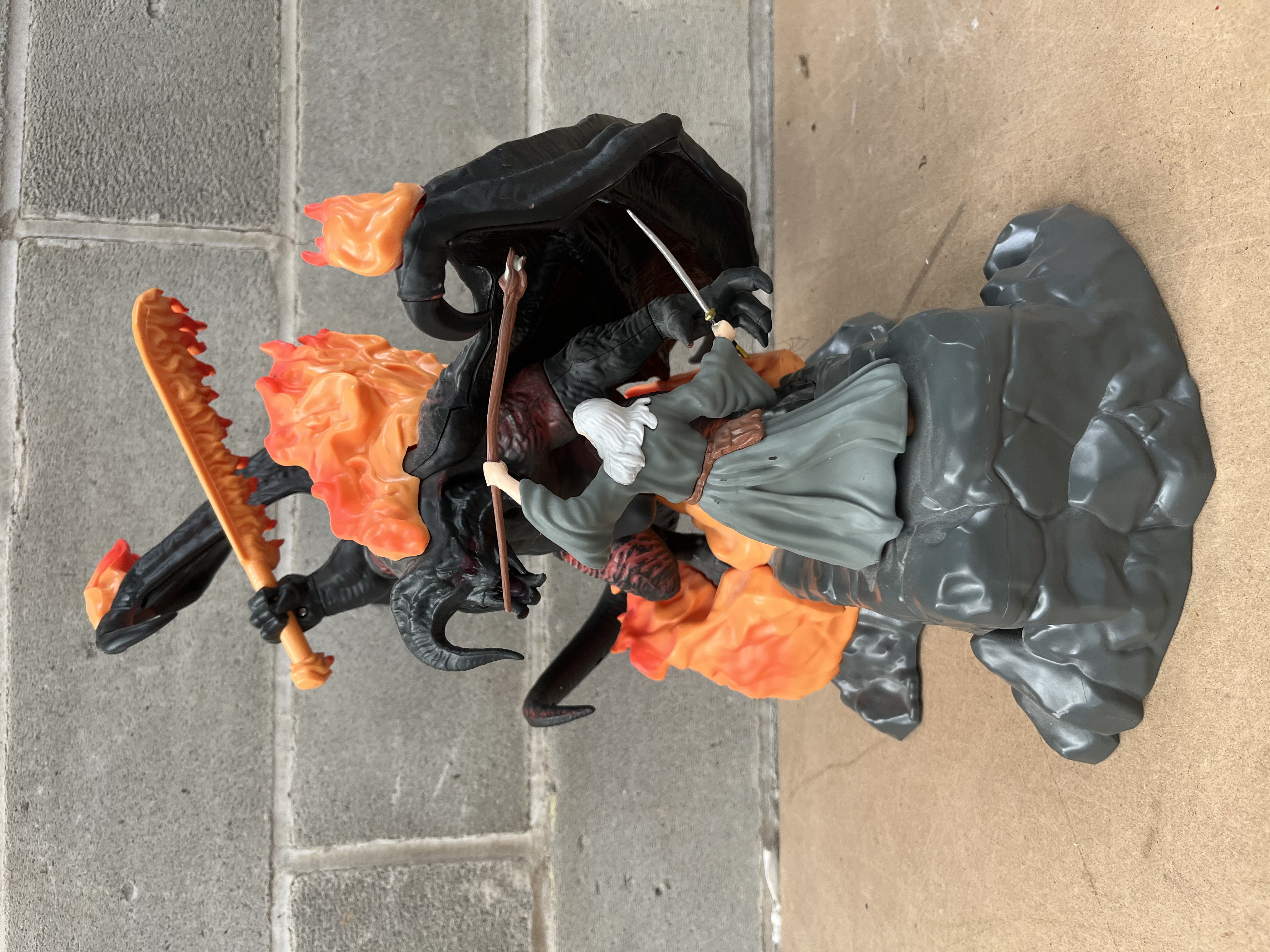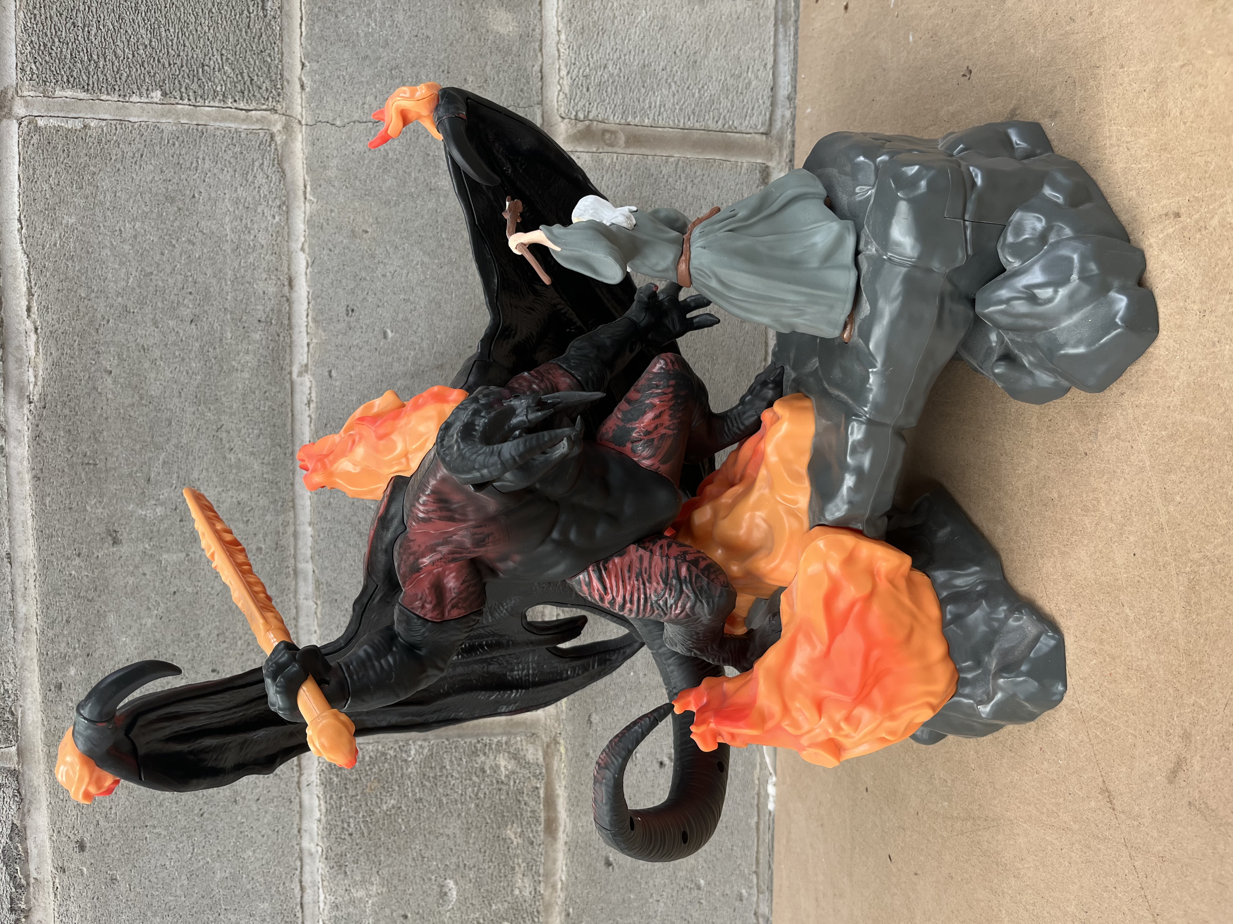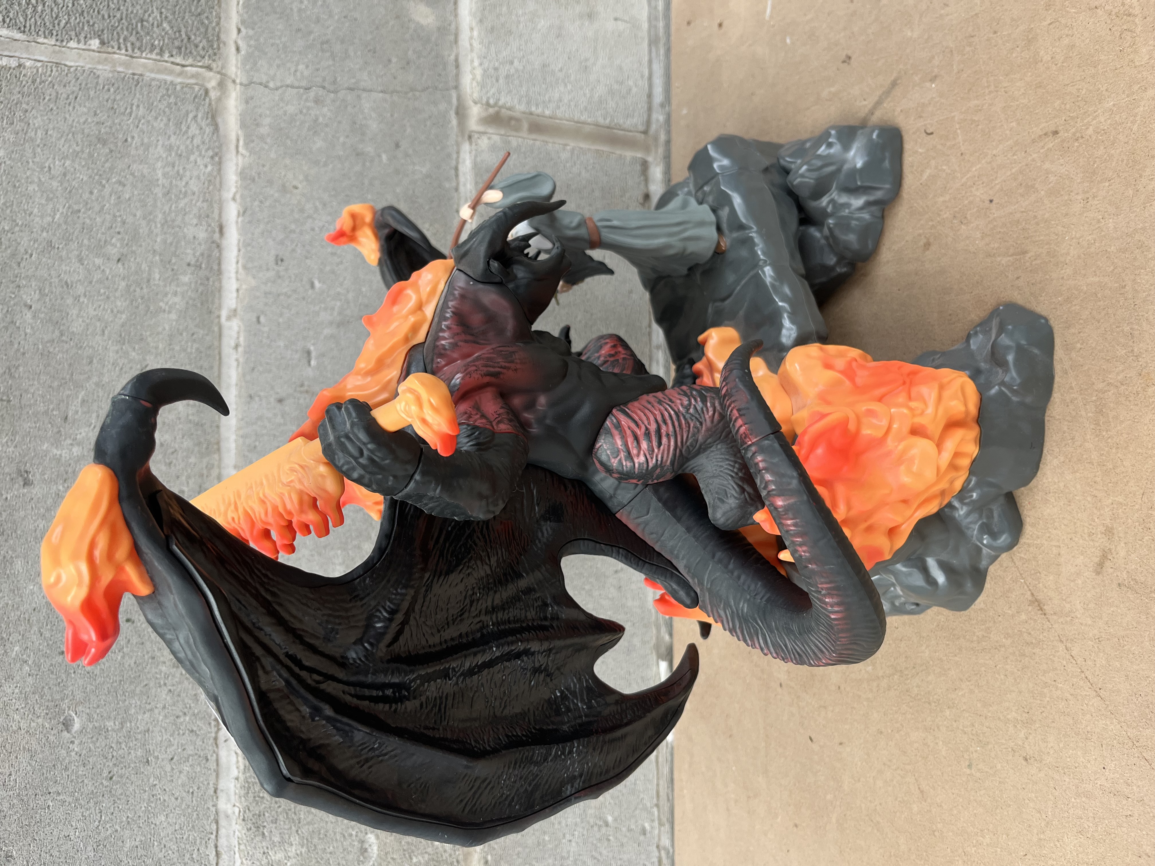 A Lord of the Rings Balrog vs. Gandalf Figural Light Lamp, depicting a dramatic battle scene between two figures on an integrated rock-textured base. The larger figure is a black, winged, horned, monster-like creature with red-orange accents, wielding an orange jagged sword. Opposing it is a smaller, grey-robed, white-haired wizard-like figure, holding a staff and a sword. Bright orange flame elements are prominently integrated throughout the base and around the figures, enhancing the fiery battle theme. The item is constructed from molded plastic, characteristic of modern collectible merchandise, likely dating from the early 21st century. No visible text, manufacturer markings, or date stamps are discernible from the provided images.