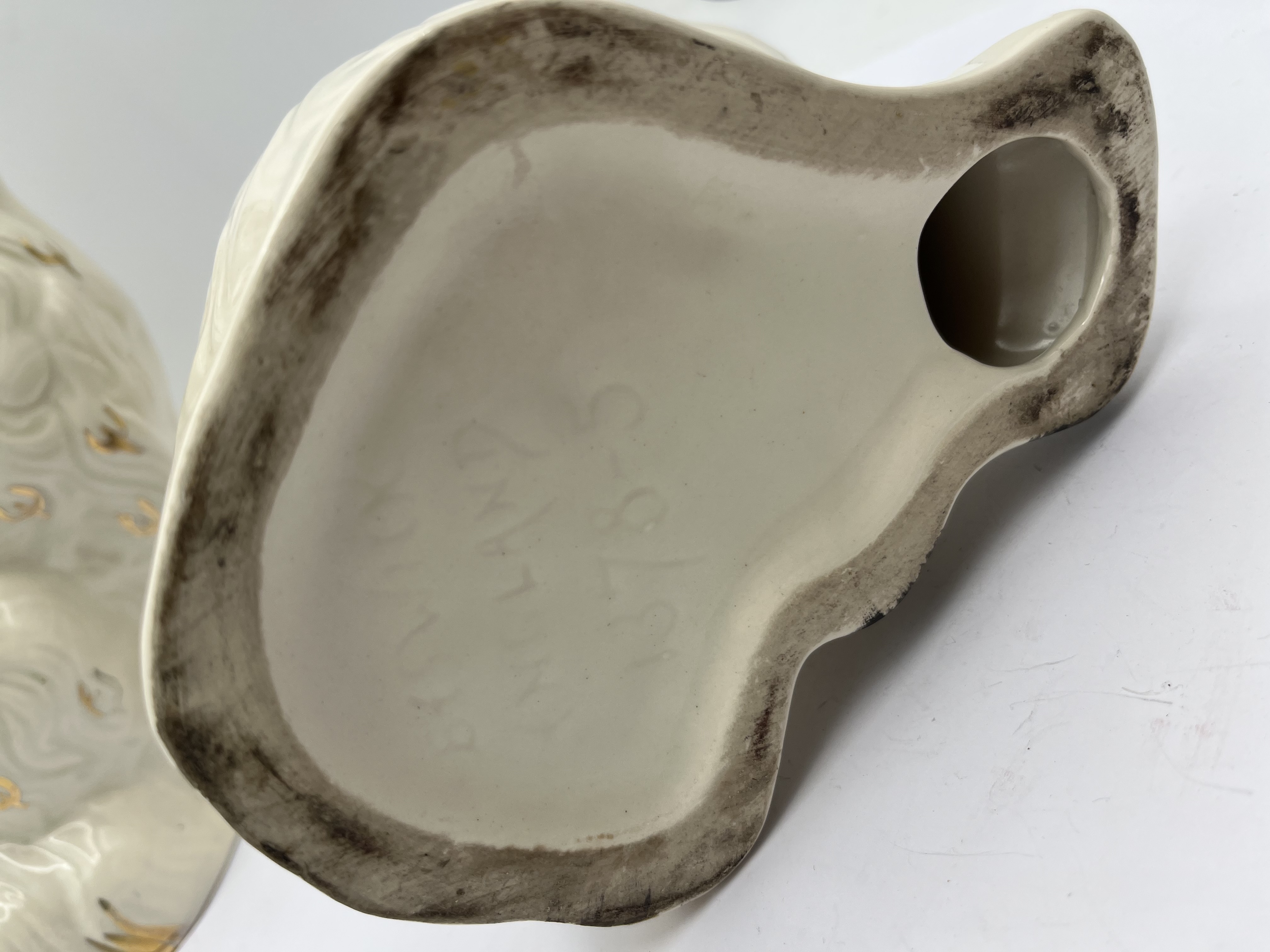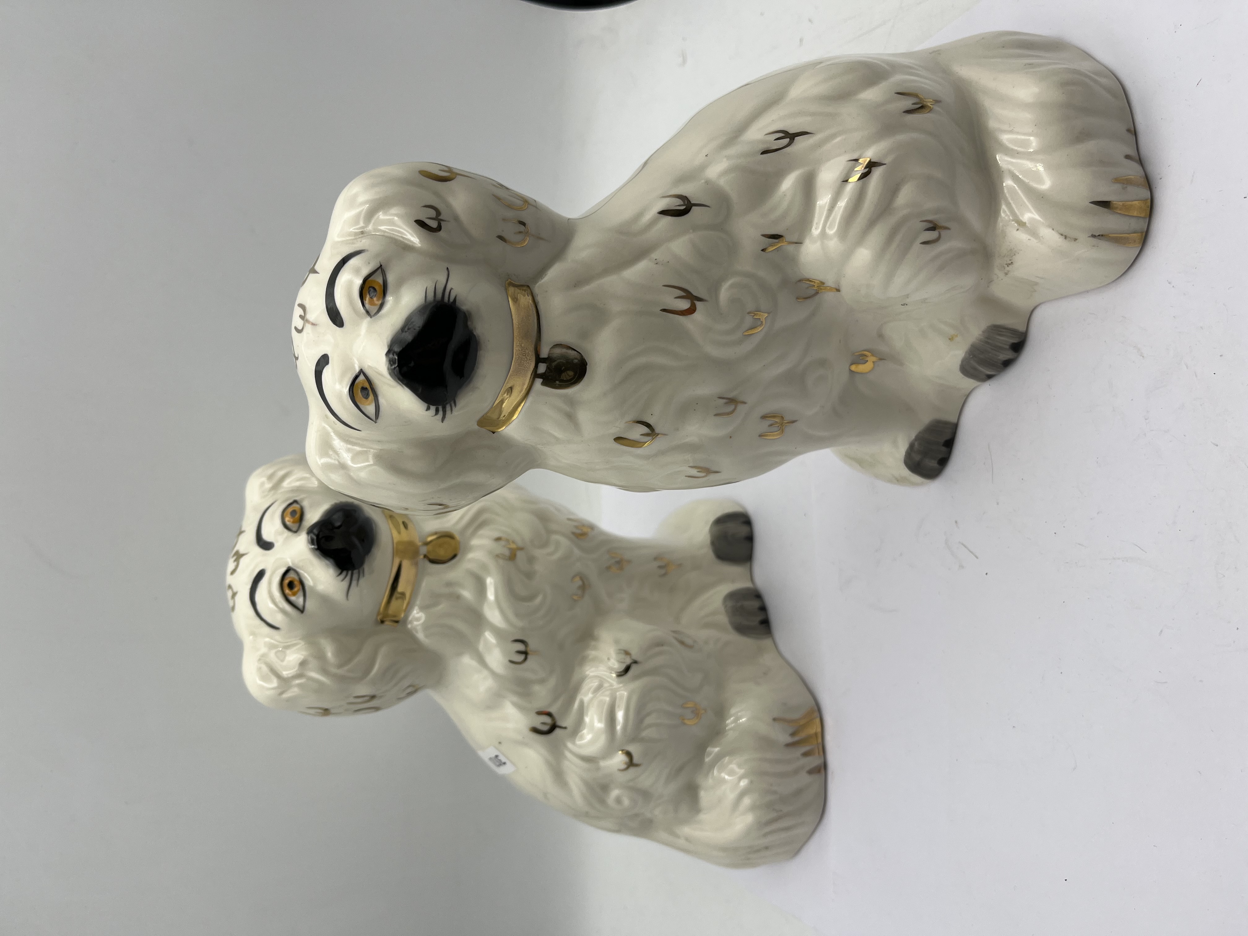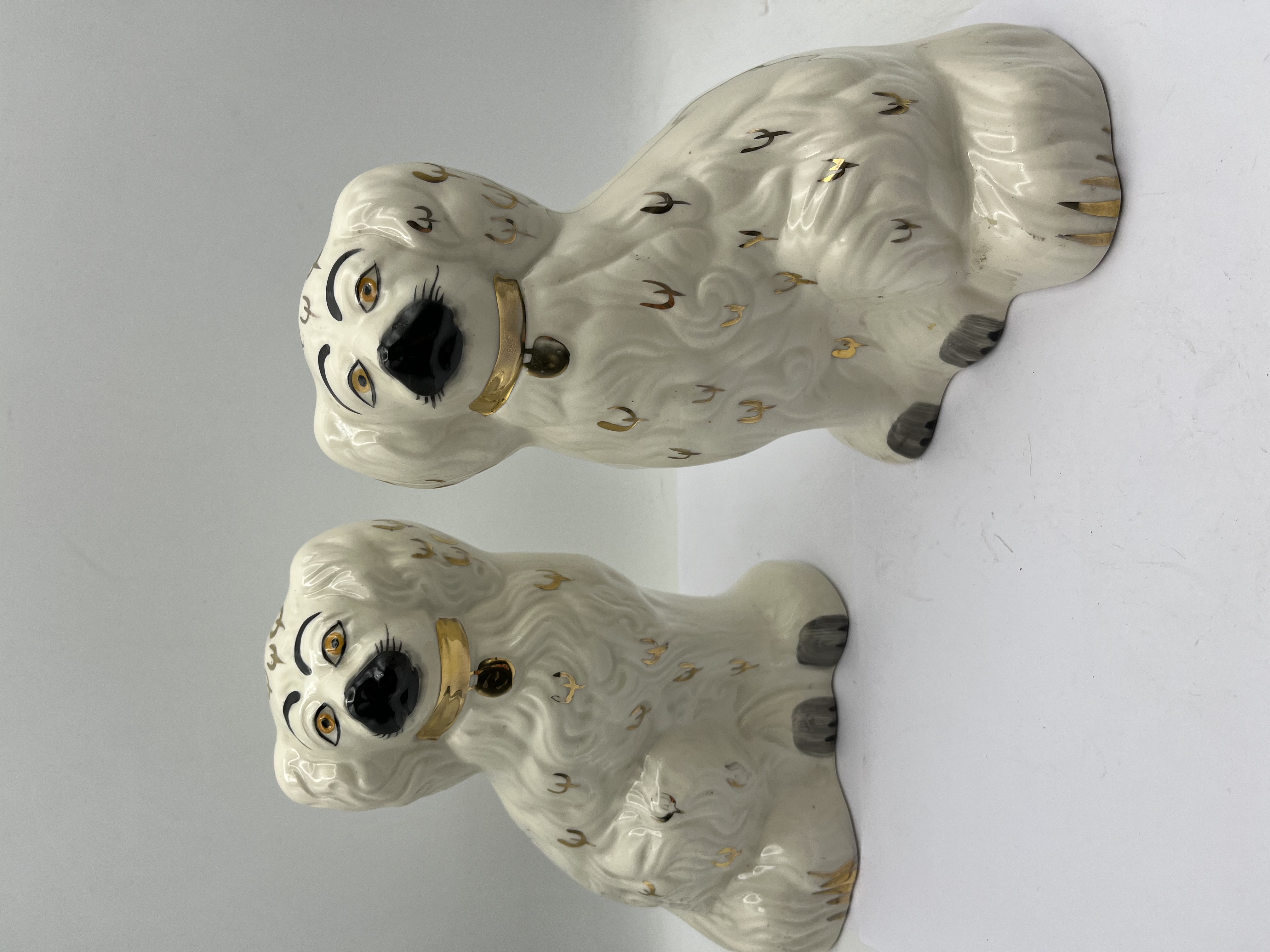 A Pair of English Beswick Staffordshire Spaniel Mantle Dogs, Model 1378-5. Each figure features a cream-colored, glossy glazed body with black painted facial features and extensive gold embellishments simulating fur and a prominent gold collar with a small medallion. The underside of one figurine is impressed with ‘BESWICK ENGLAND 1378-5’.