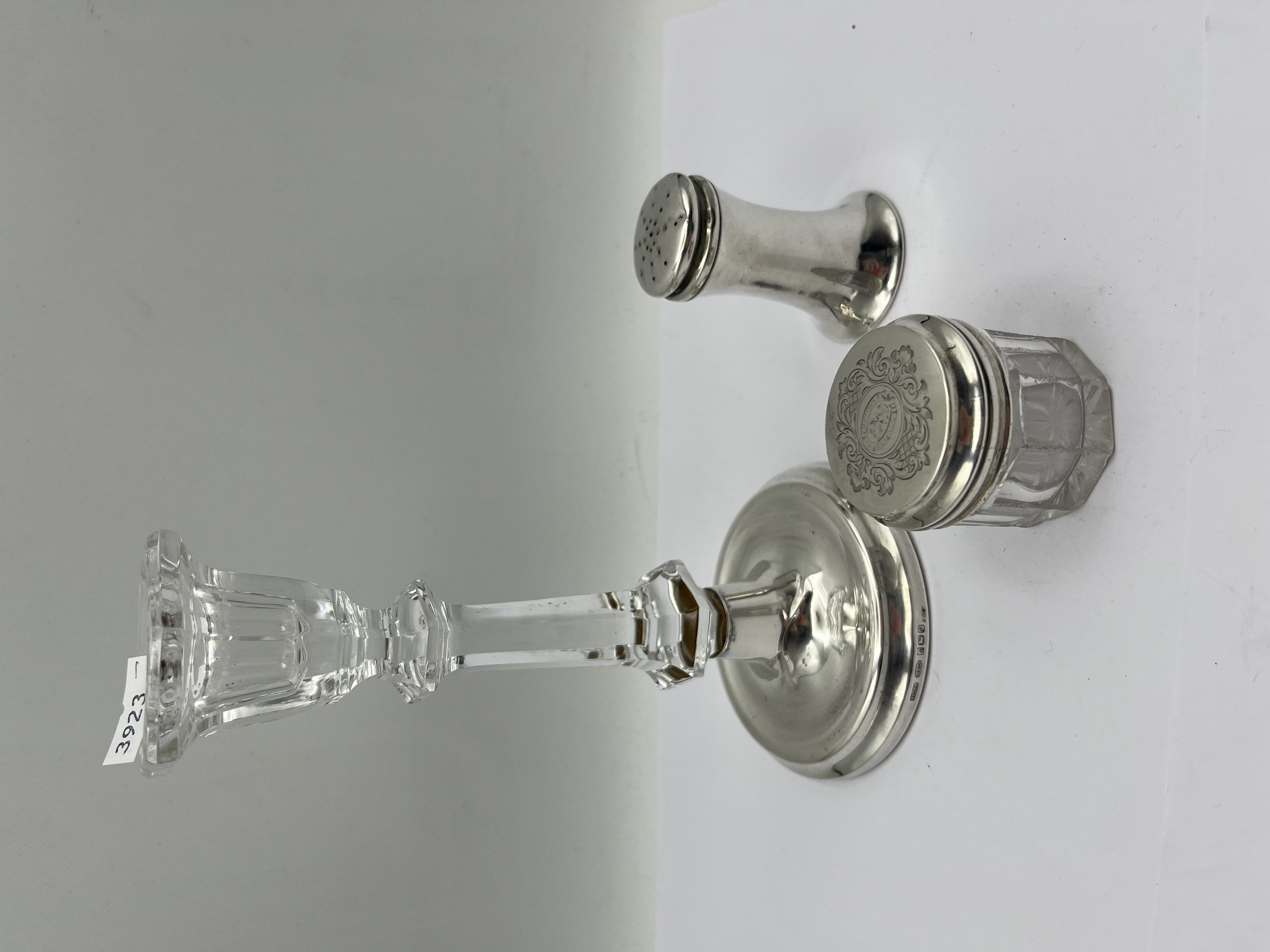 A collection of three items, comprising a weighted silver-based crystal candlestick, a silver tapering shaker, and a cut-glass jar with a silver lid.