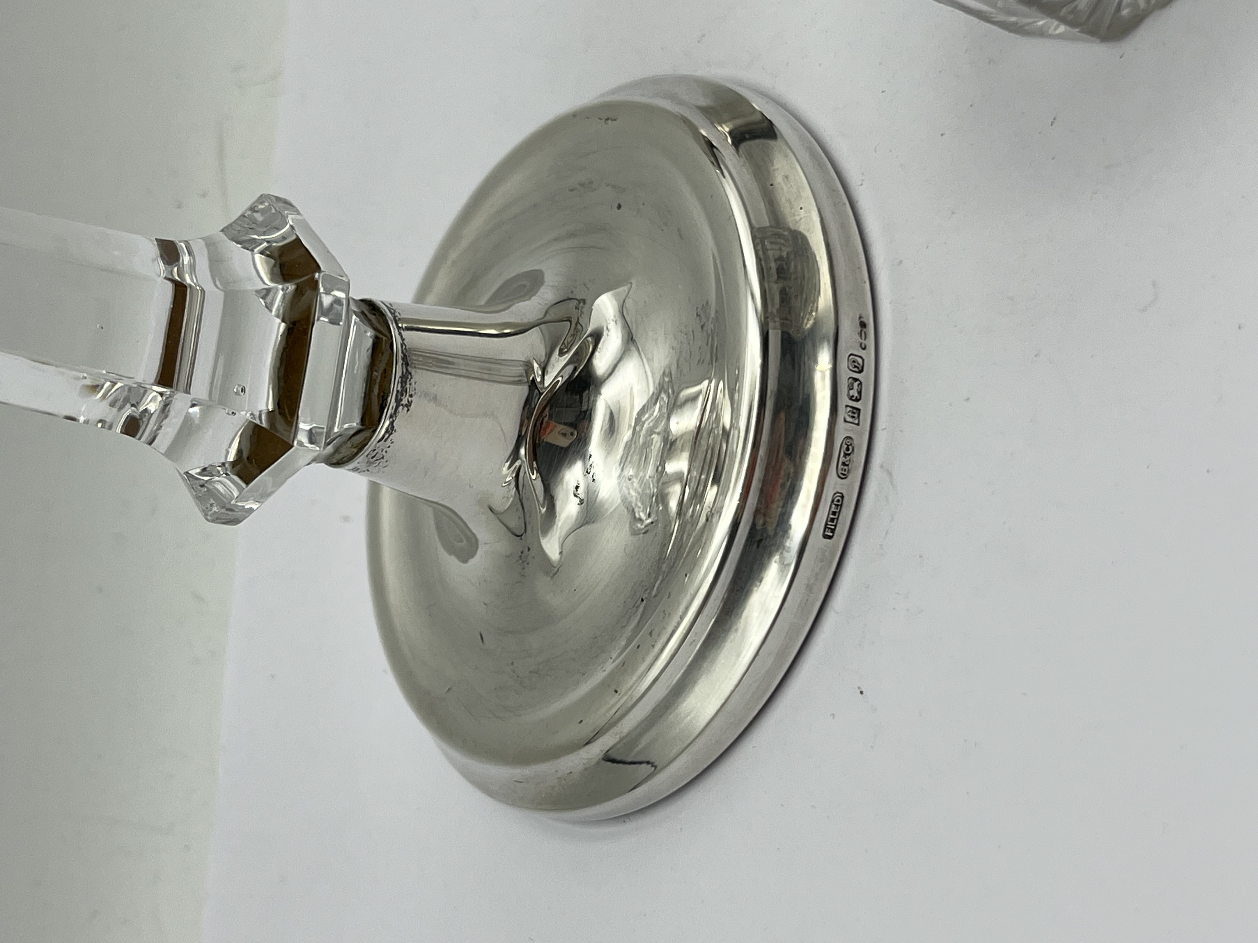The candlestick features a faceted crystal stem rising from a round, weighted silver base. The base is marked “FILLED”, “H A C” or “HA CO”, and bears British hallmarks including a lion passant, an anchor for Birmingham, and a date letter ‘q’, indicating a circa 1915-1916 manufacture. A paper label on the stem reads “3923”.