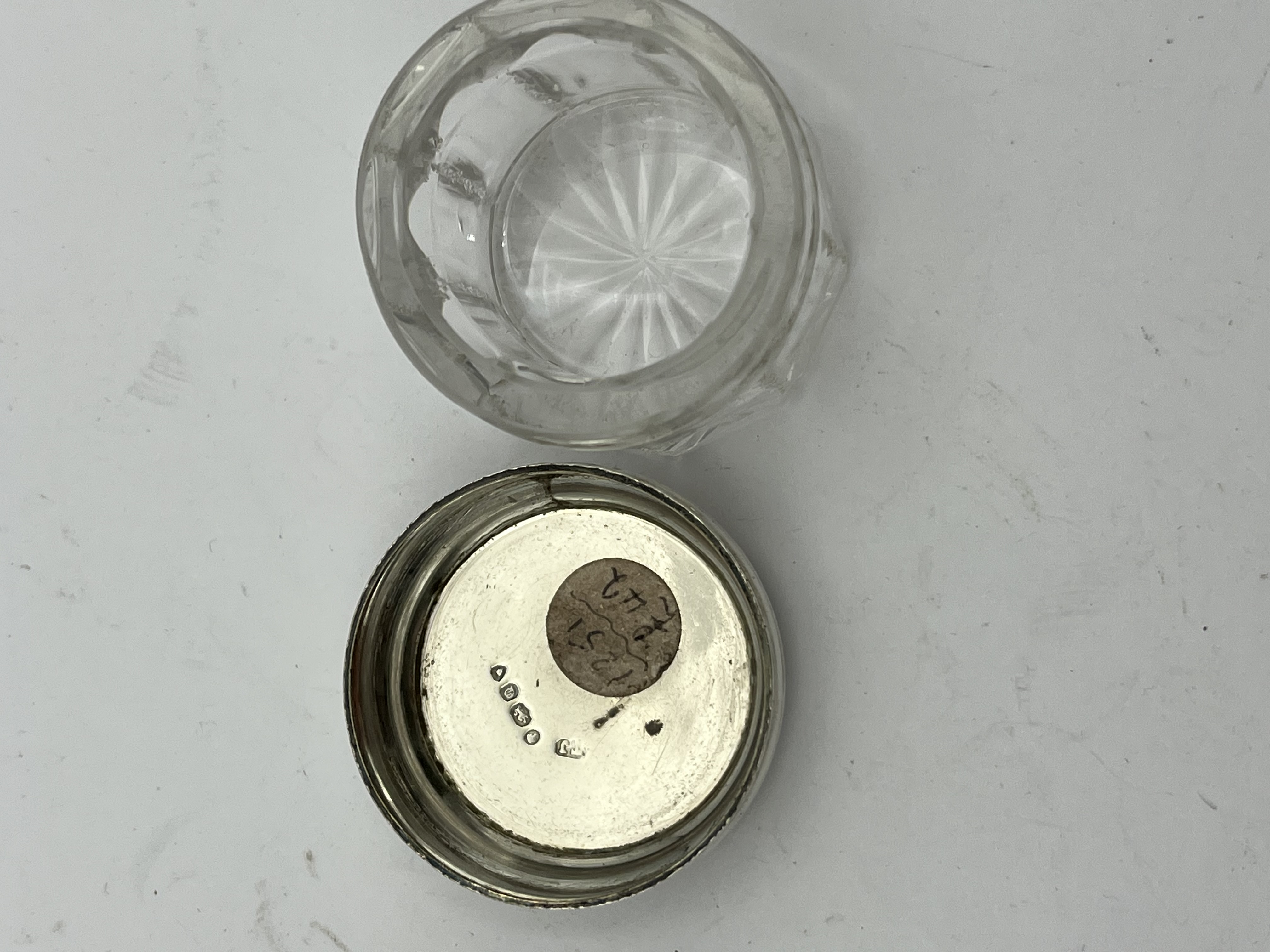 The small cut-glass jar has a faceted body and a starburst base, topped with a silver lid intricately engraved with a crest or monogram. The lid is marked “0000” and contains an internal paper label marked “1251 R.W.” or “P.M.”.
