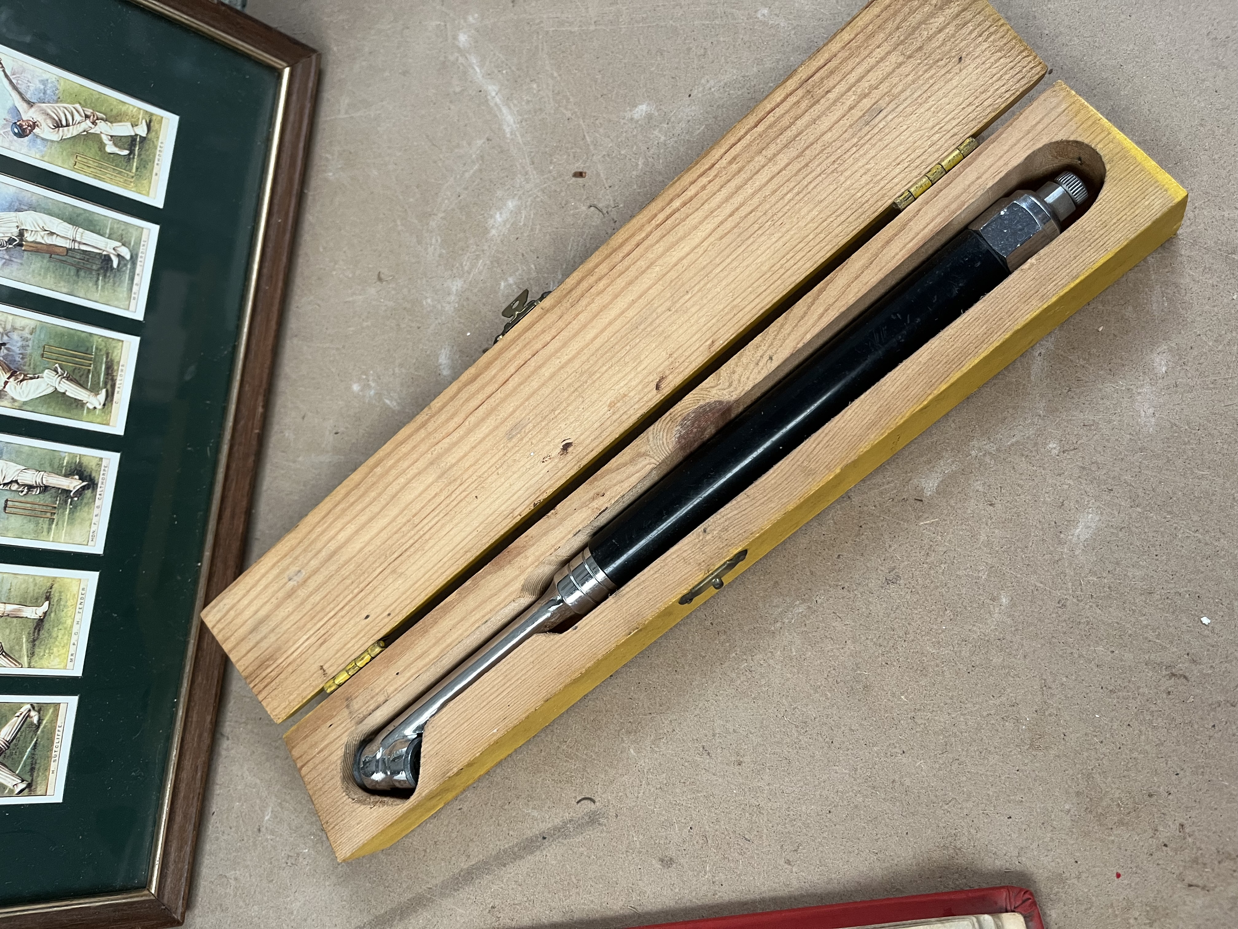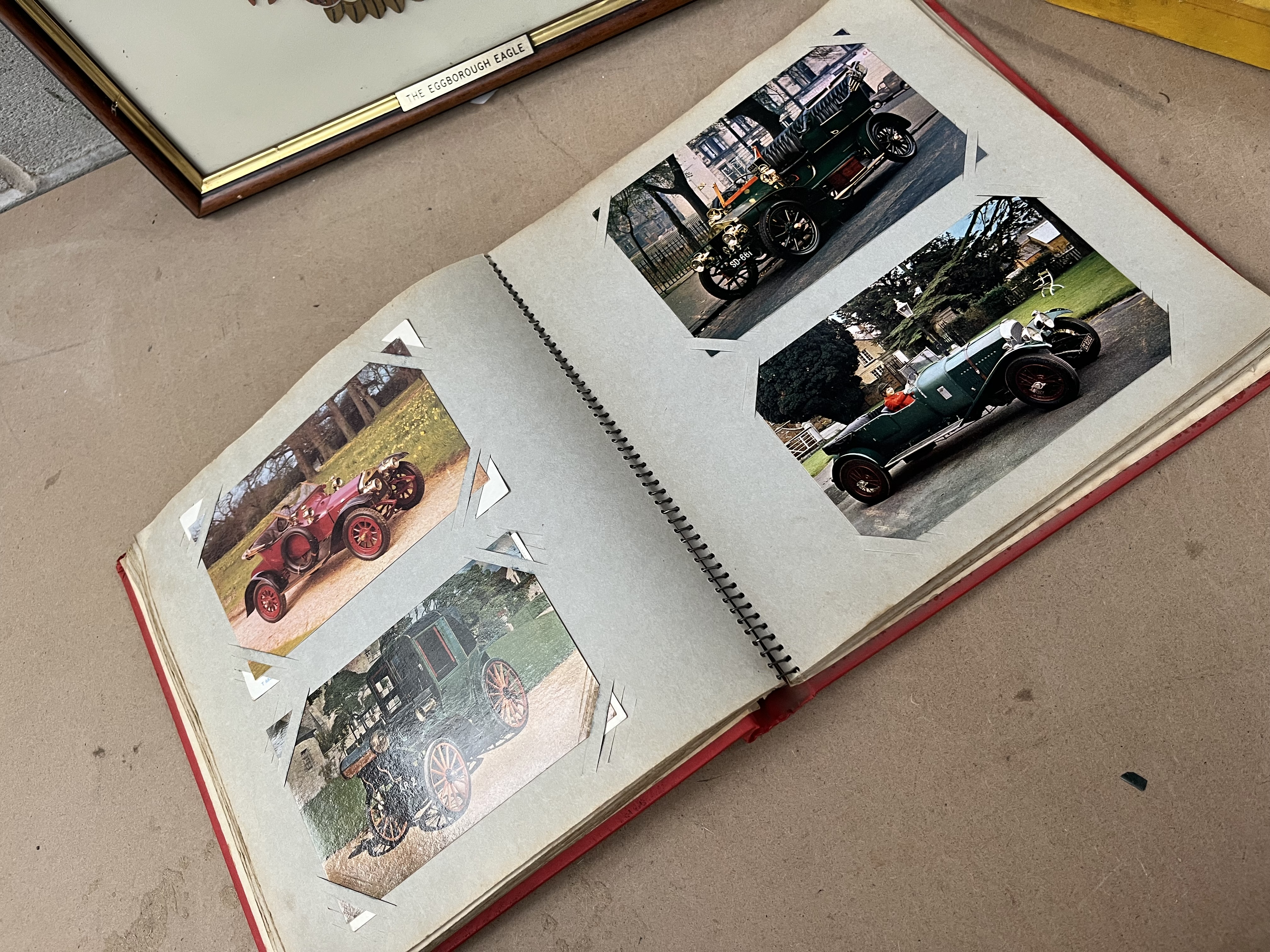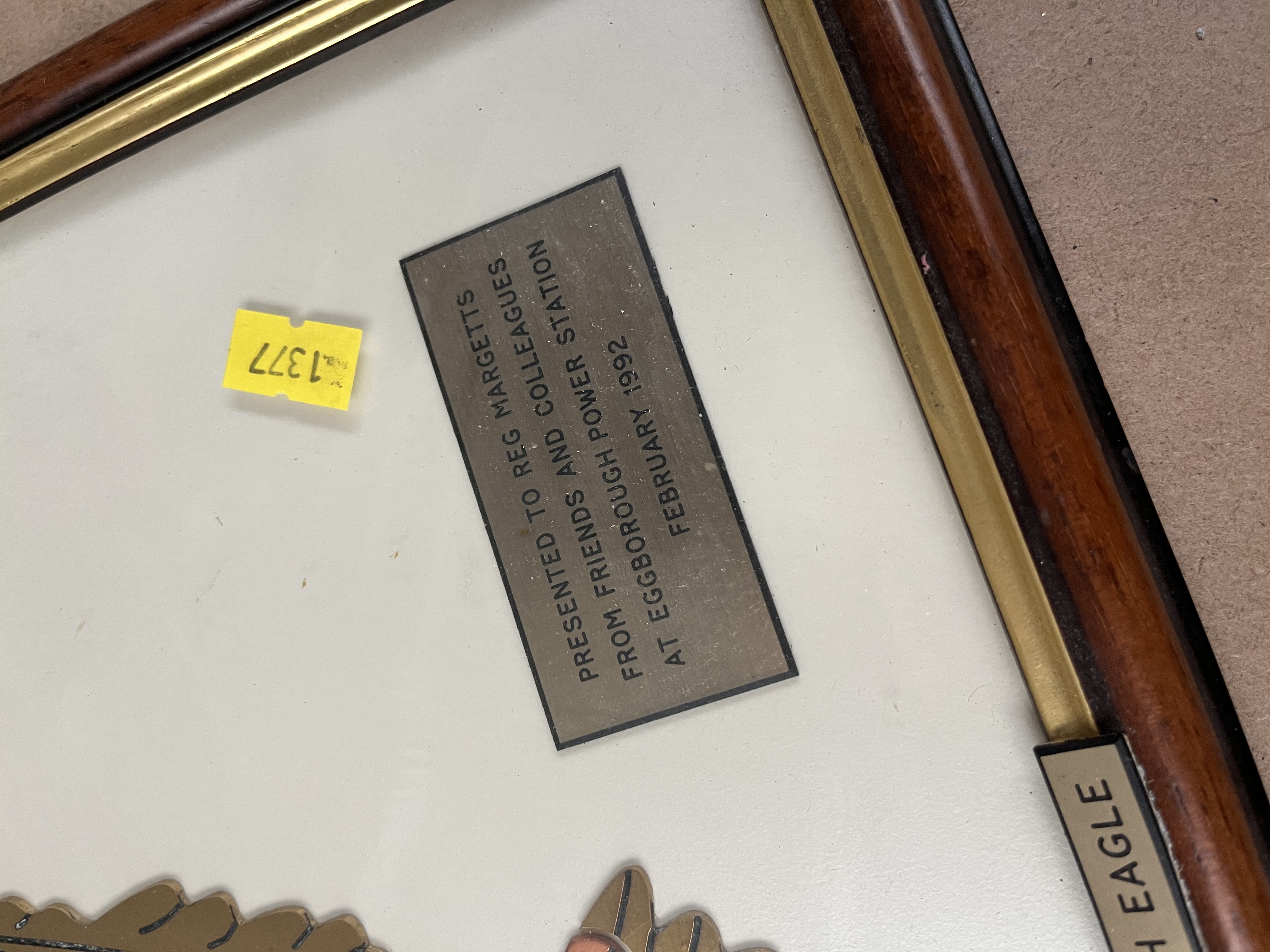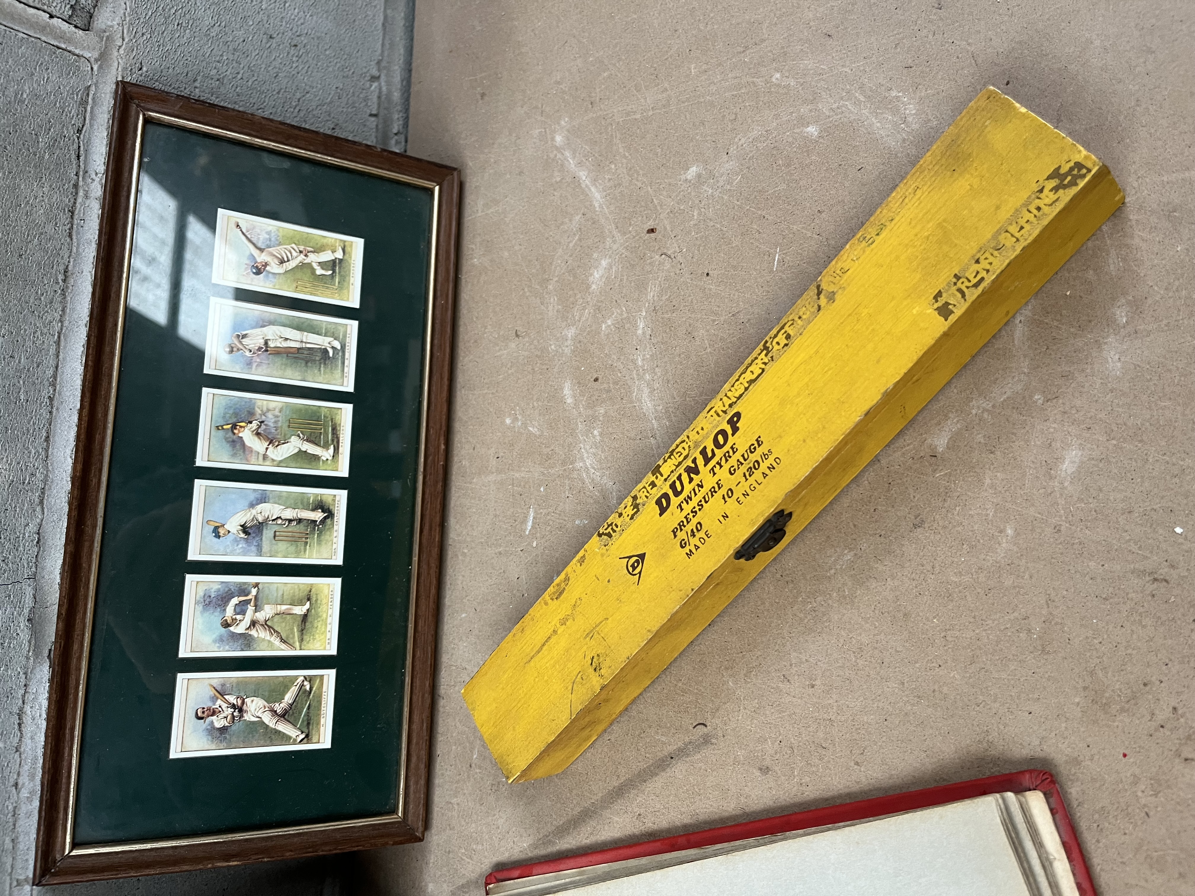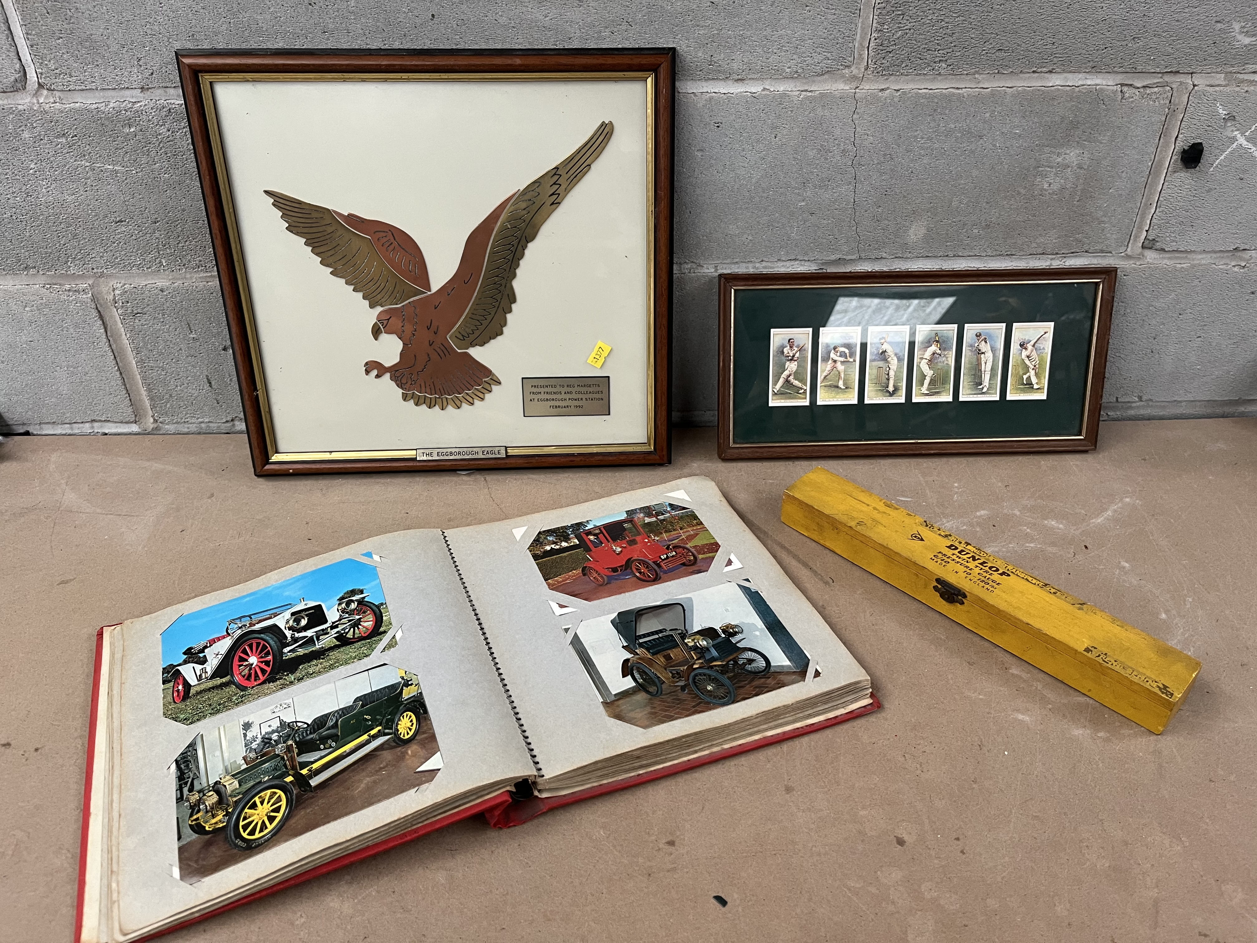 A diverse collection of items. The first is a large framed commemorative plaque, dated February 1992, featuring a stylized brass-tone eagle. The plaque bears a dedication to “Reg Margetts” from “Eggborough Power Station” and is presented in a dark wood frame with a gold accent. The base of the frame reads “THE EGGBOROUGH EAGLE.” The second item is a smaller, dark wood-framed display containing six individual, vintage-style printed cards depicting cricket players. The third item is a red, spiral-bound photo album filled with mounted color photographs of various antique and vintage automobiles from the early 20th century. Finally, there is a yellow painted wooden box, prominently marked “DUNLOP / TYRE PRESSURE GAUGE / PAT. NO. 465660 / .0 TO 100 LBS. / MADE IN ENGLAND,” which houses a matching vintage metal and black-handled tire pressure gauge.