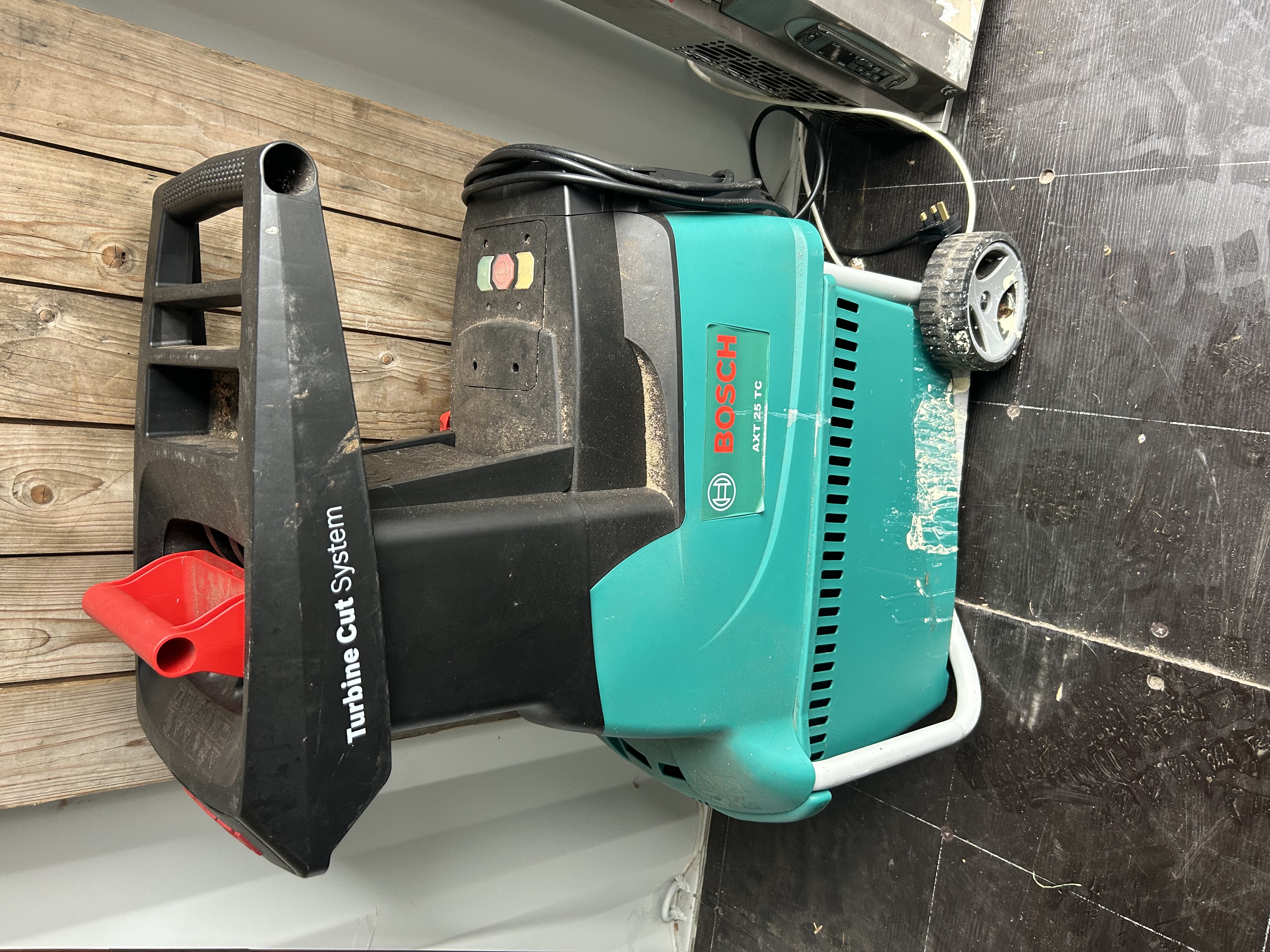 A Bosch AXT 25 TC electric garden shredder, presenting a contemporary style. It is primarily constructed from dark grey/black and teal-green plastic, with a white painted metal frame and small plastic wheels. Visible text includes “Turbine Cut System” on the top black housing, and the “BOSCH” brand logo with the model designation “AXT 25 TC” on the teal-green body. A red plastic feeding tool is present in the top opening. Control buttons are visible in green, red, and yellow.