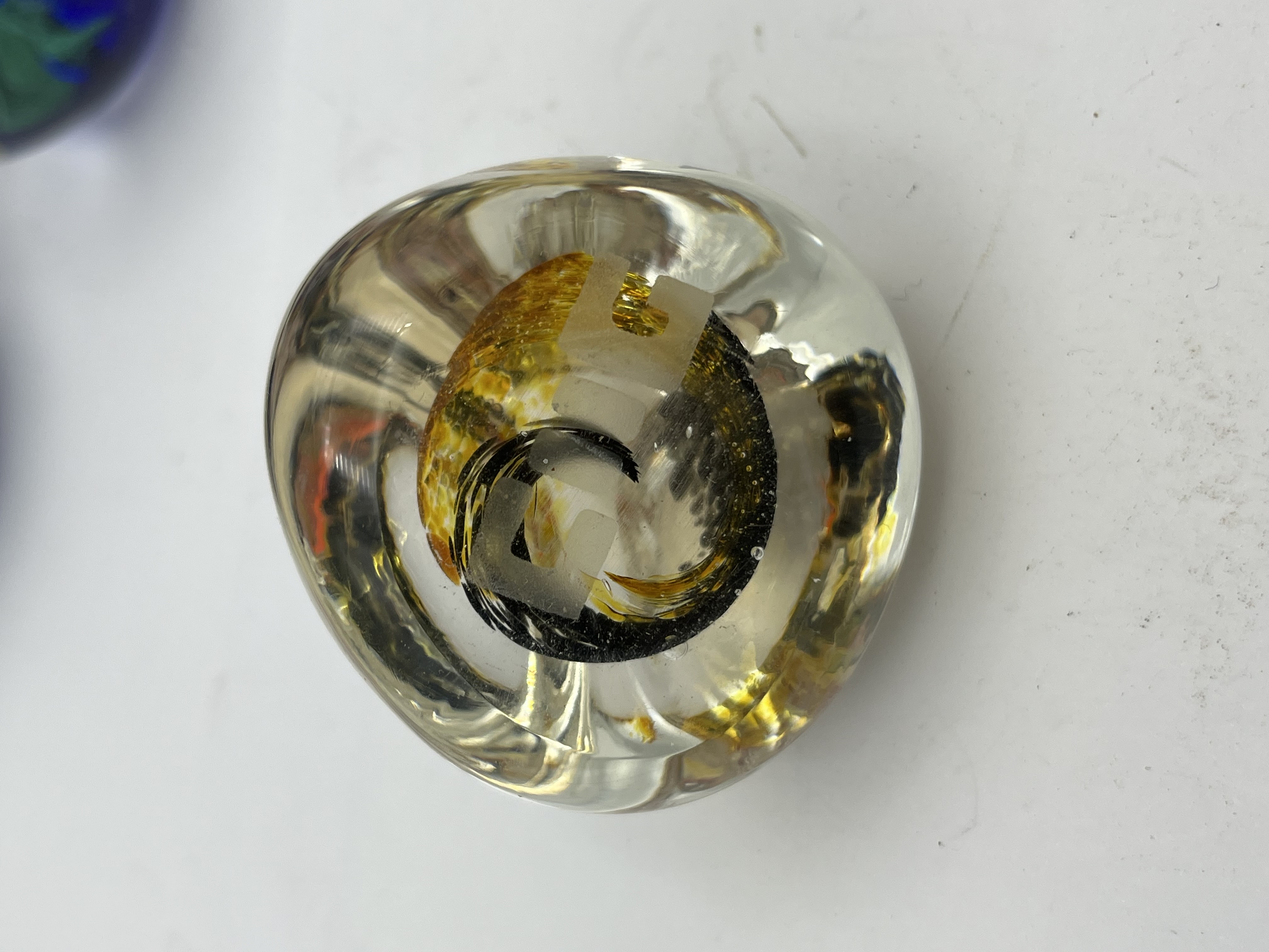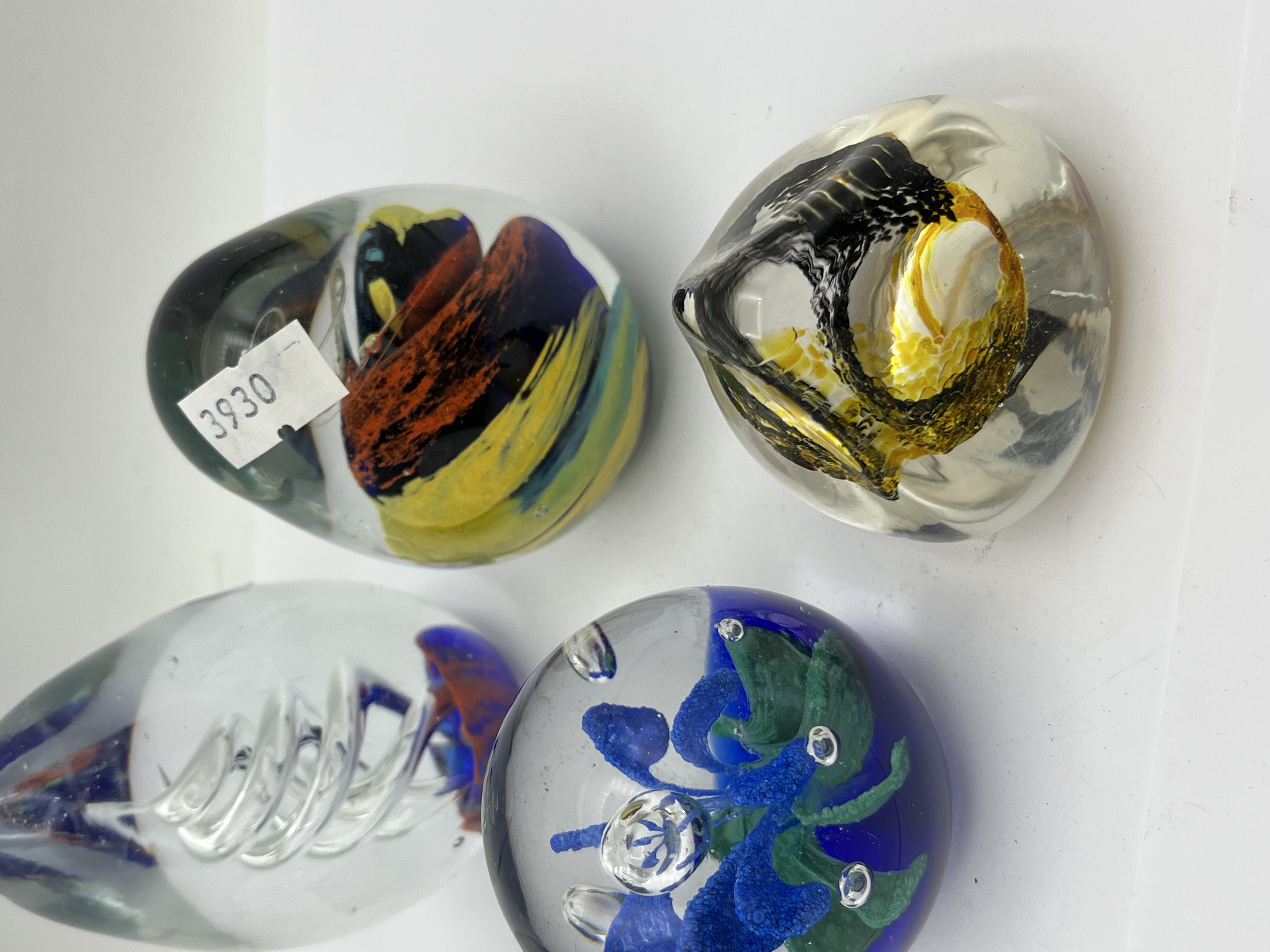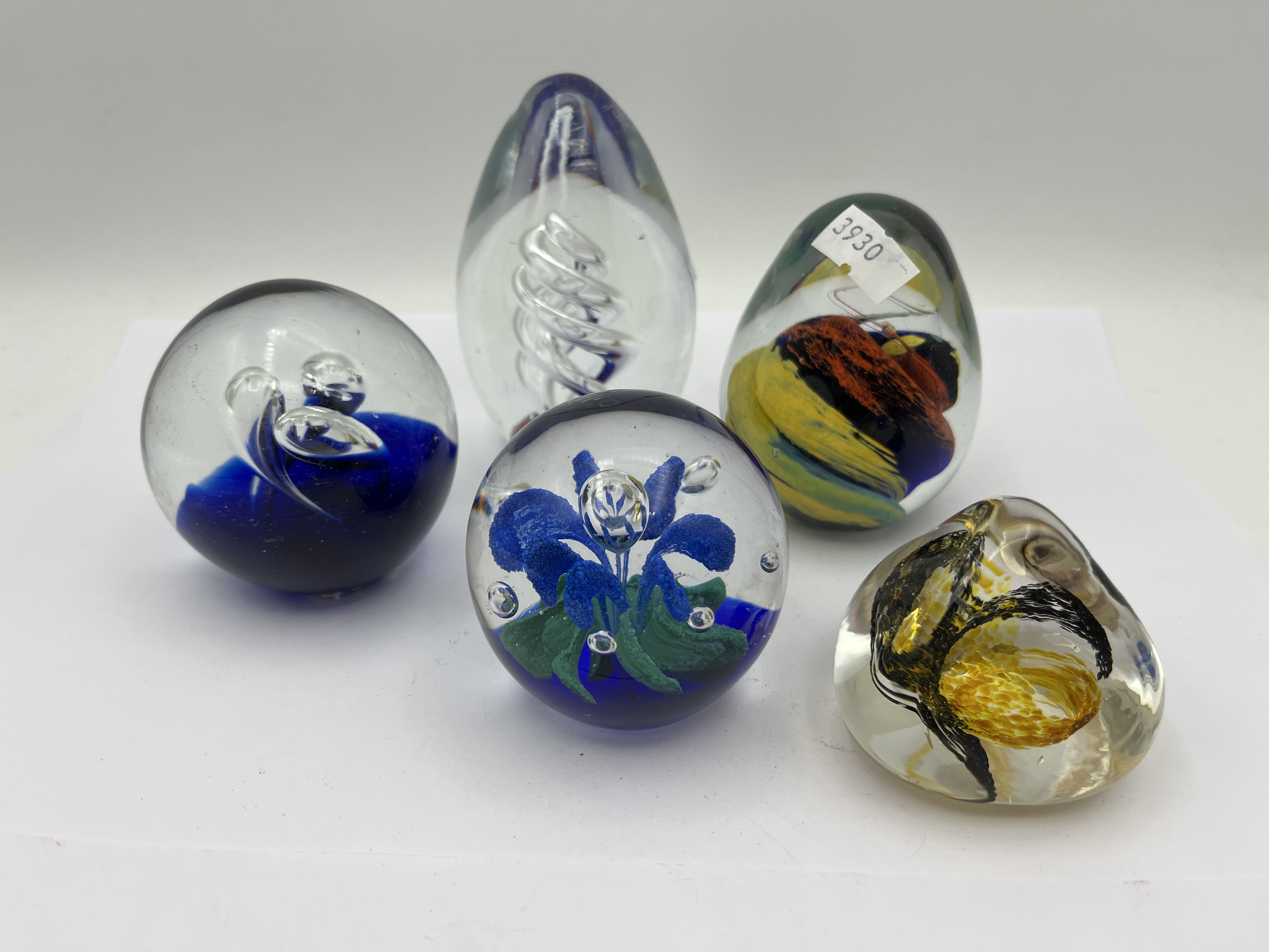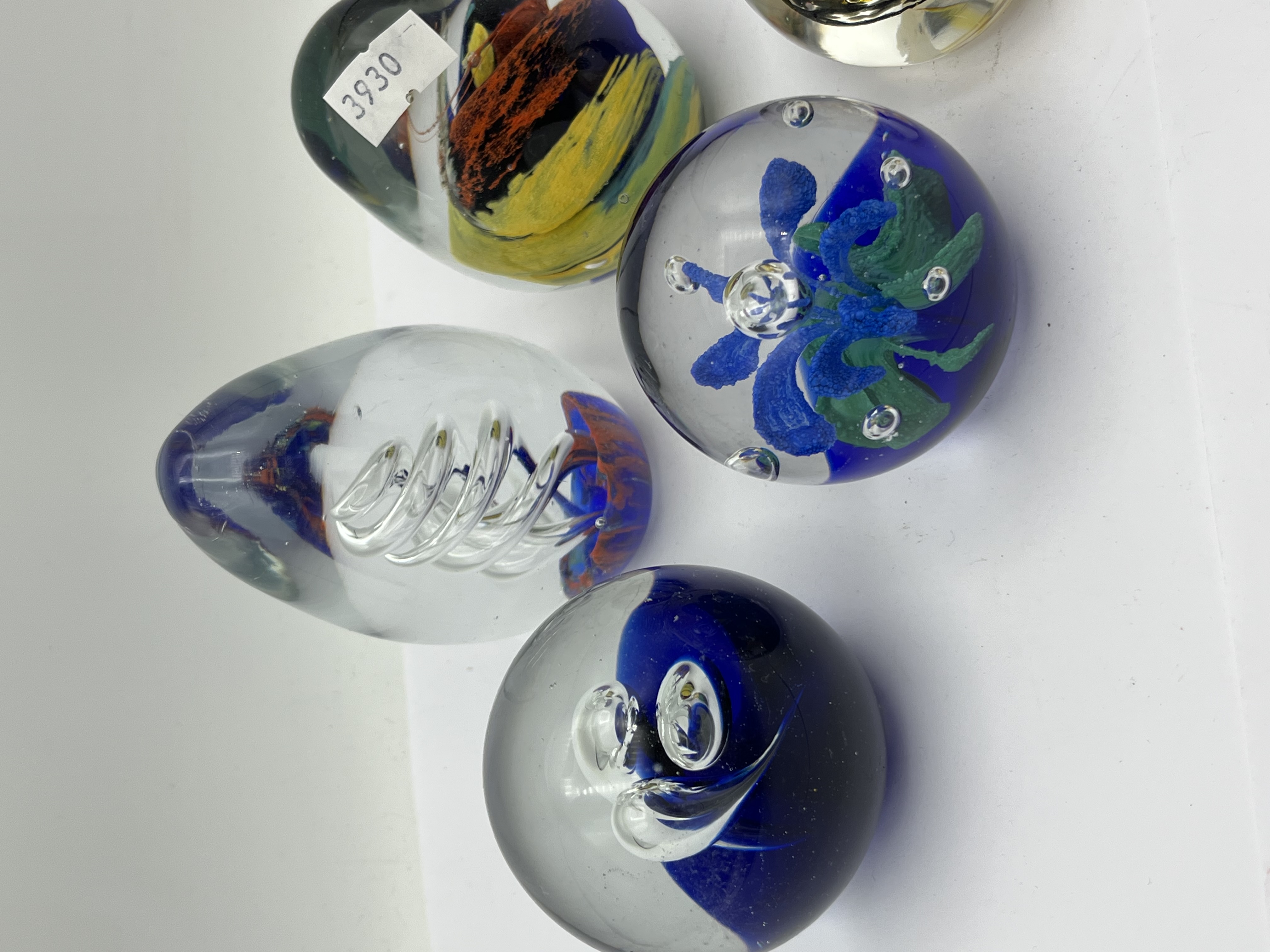 A group of five Dynasty Gallery art glass paperweights. This lot consists of five modern decorative glass paperweights. Two are spherical, two are ovoid, and one features an irregular, flattened ovoid shape. Each paperweight encases distinct internal designs: one spherical example has a deep blue base with controlled clear bubbles; another spherical piece displays a blue floral motif, possibly an orchid, also with controlled bubbles; a larger ovoid form contains a metallic silver spiral; a second ovoid item features abstract swirls of red, yellow, and blue, with a white sticker bearing the numbers ‘3930’; and the final irregular piece exhibits abstract swirls of yellow, black, and white. Crafted from clear and colored art glass.