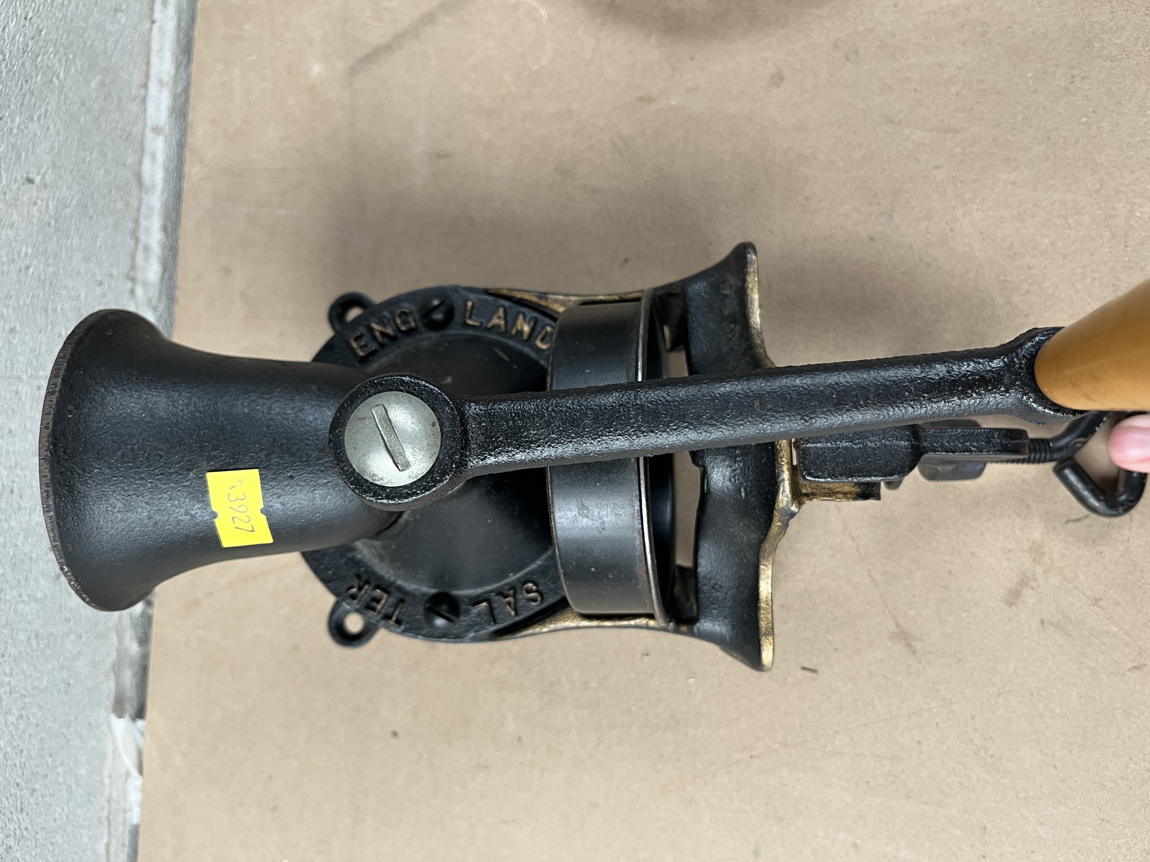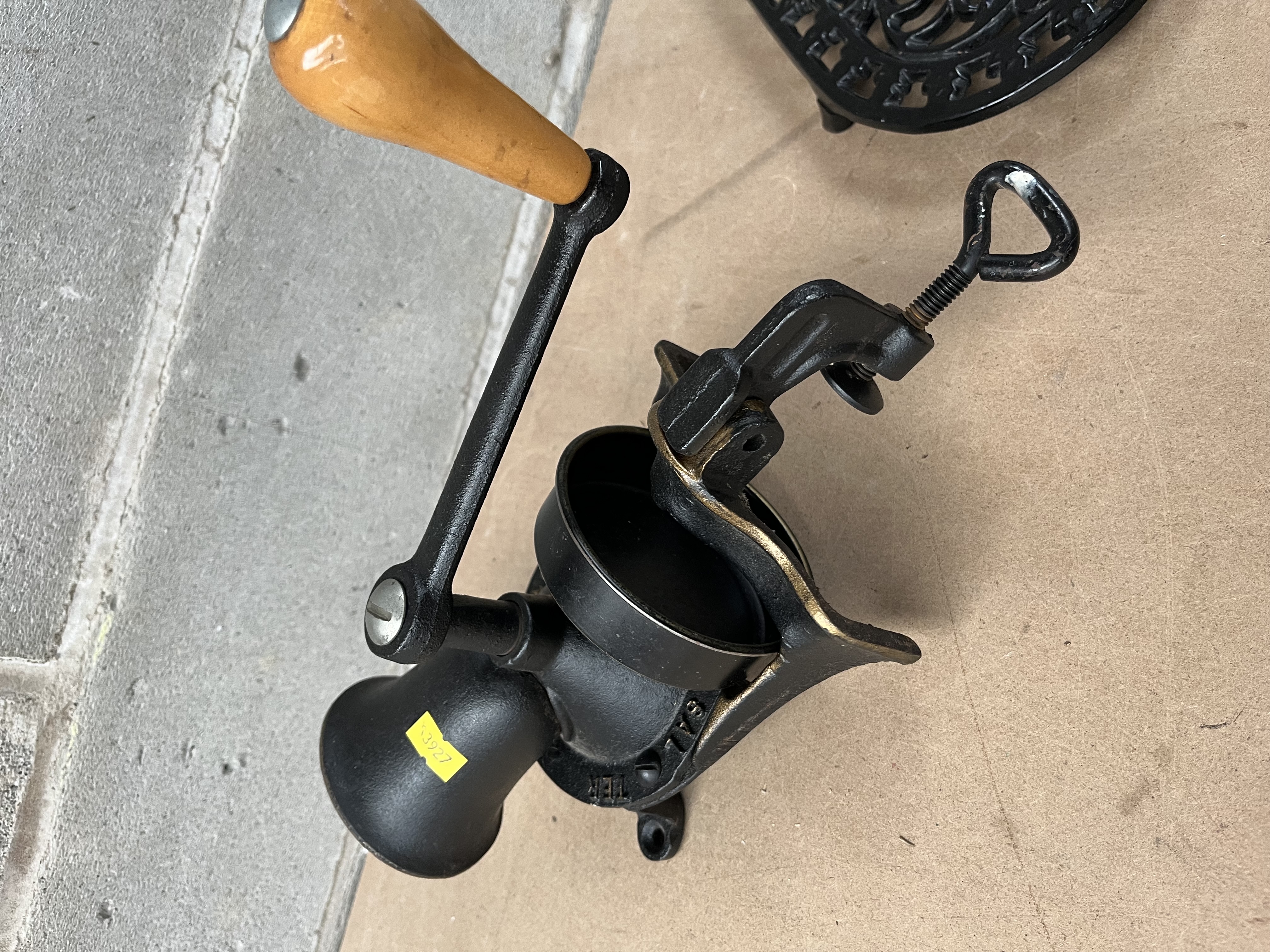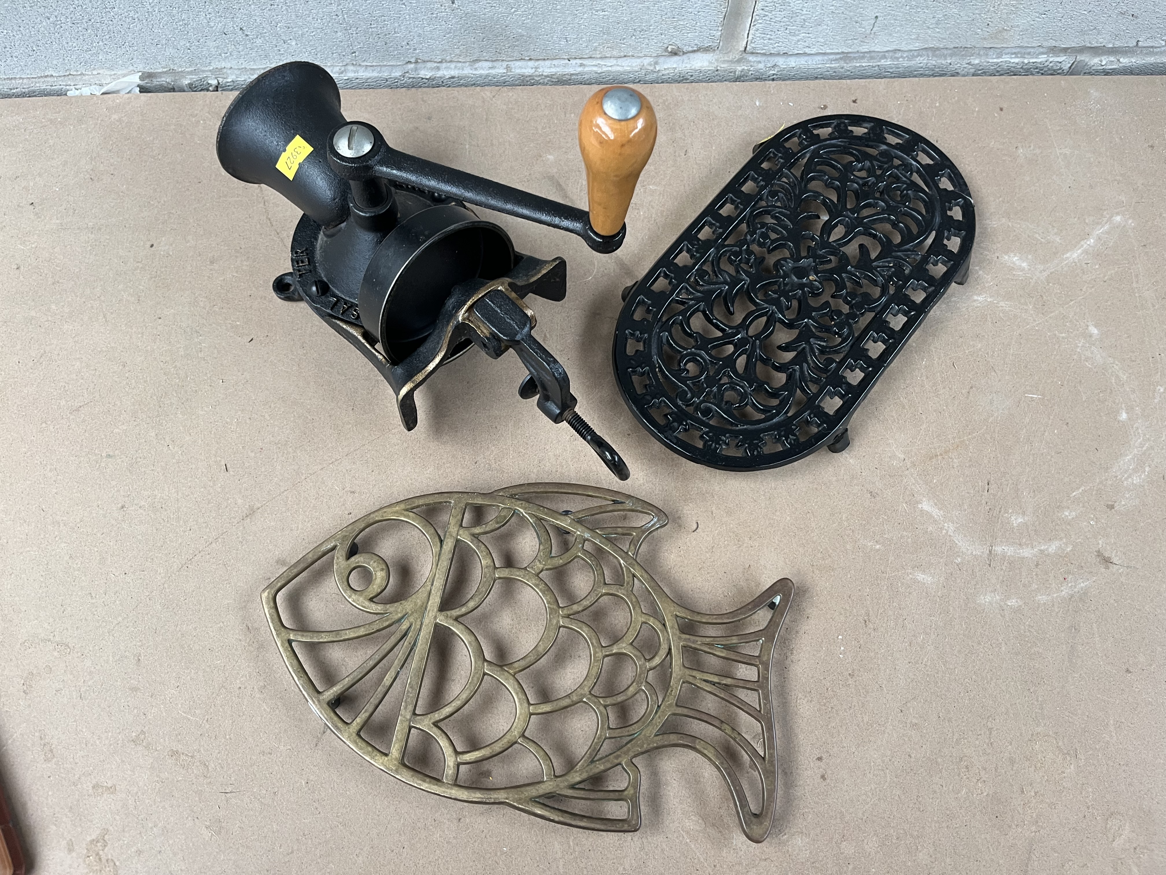 A Spong & Co. black painted cast iron clamp-on hand grinder, likely a coffee or spice mill, with a wooden handle. The body bears partial visible text including ‘TER’, ‘SAL’, and ‘ENGLAND’, along with a yellow sticker marked ‘4327’. Accompanied by a fish-shaped openwork trivet crafted from brass or bronze, and an oval cast iron scrollwork trivet finished in black.