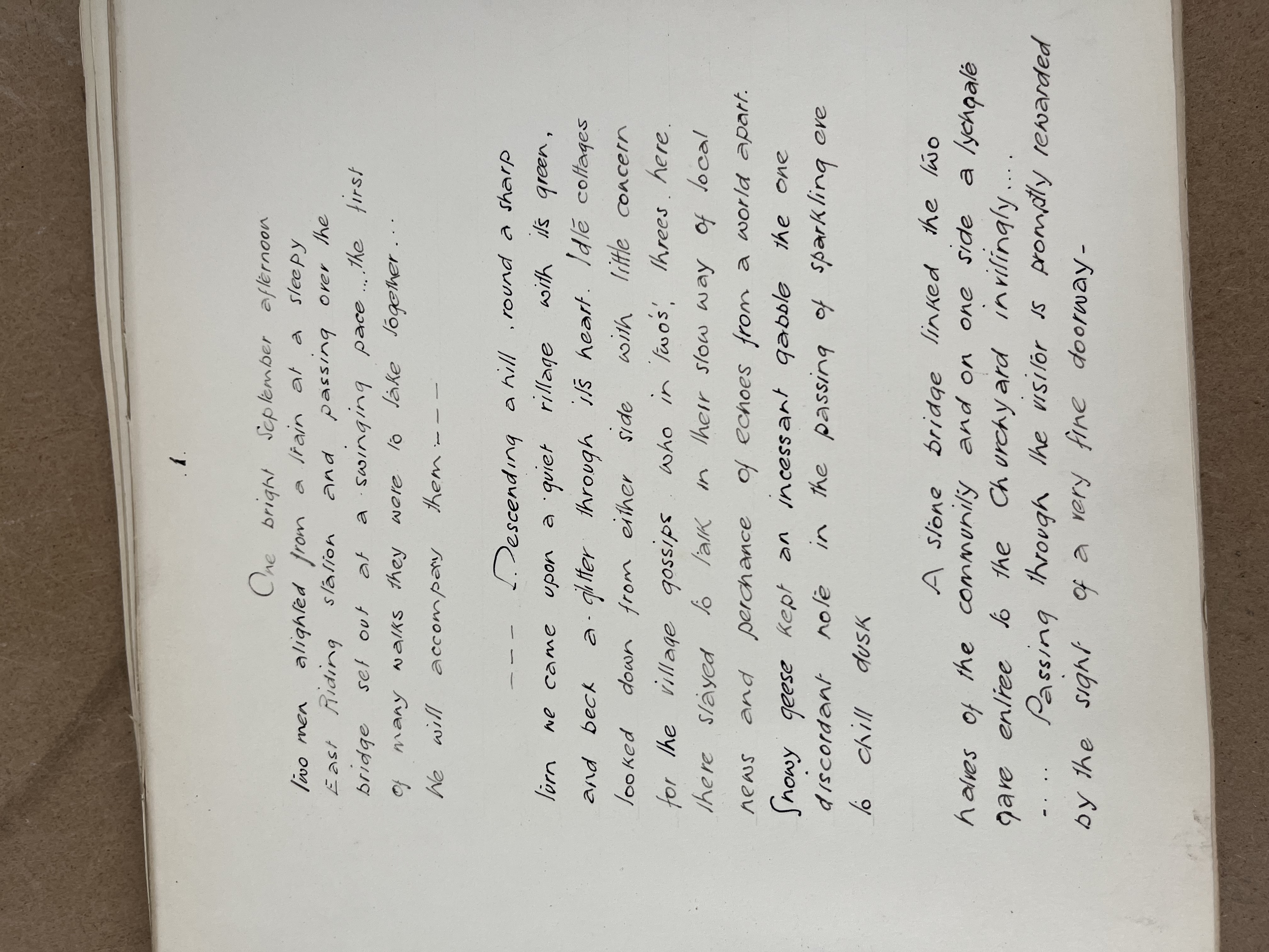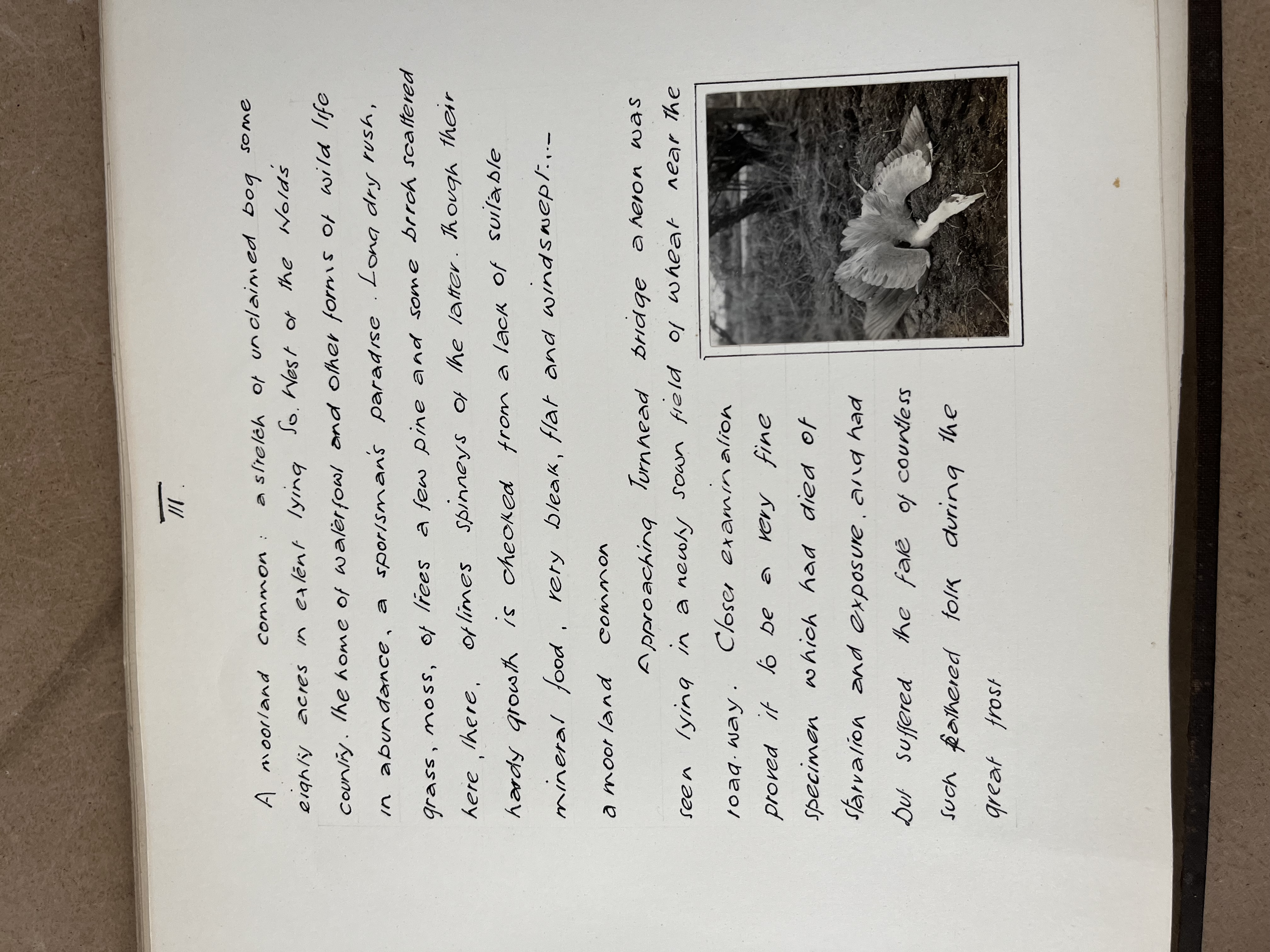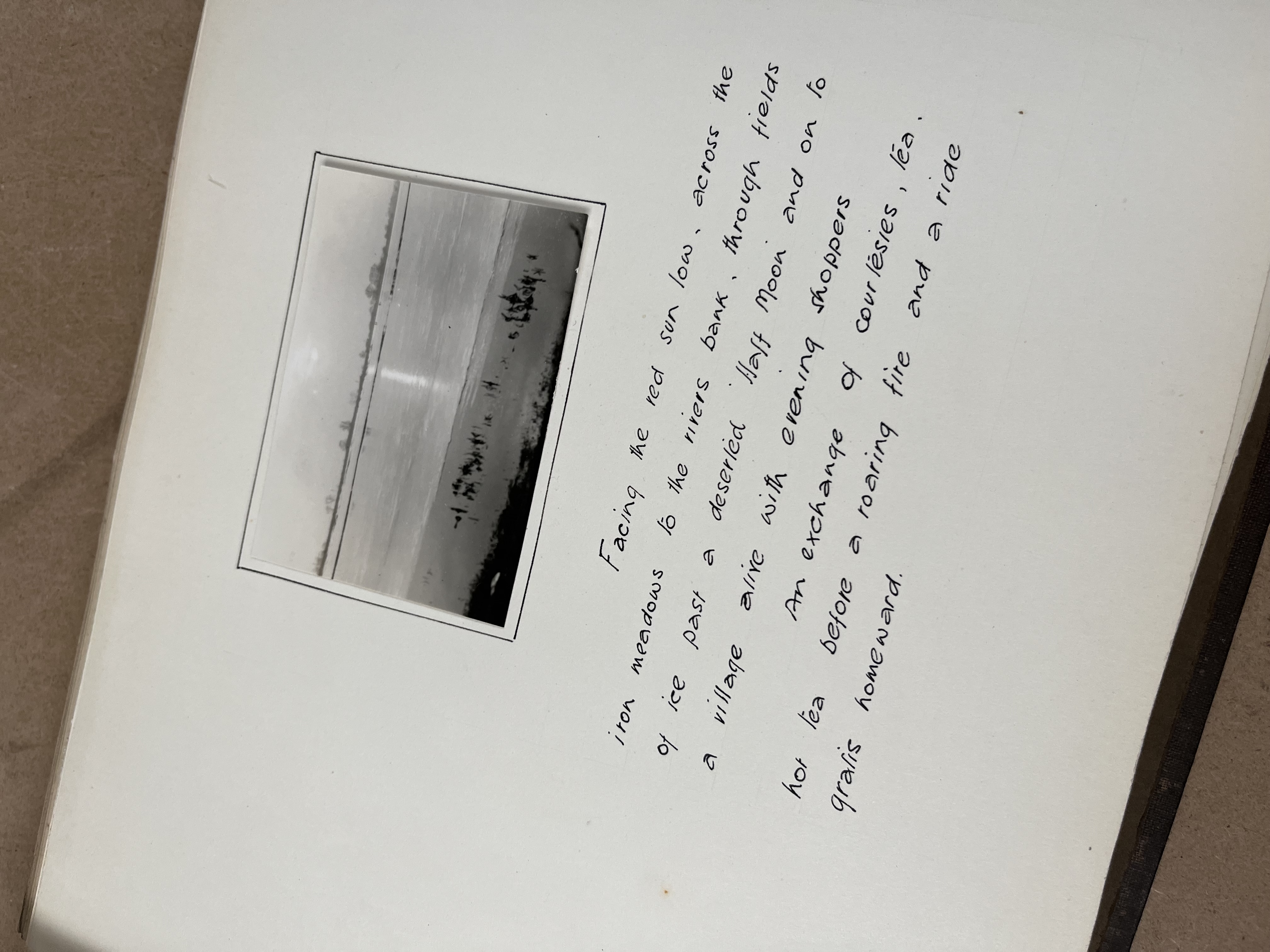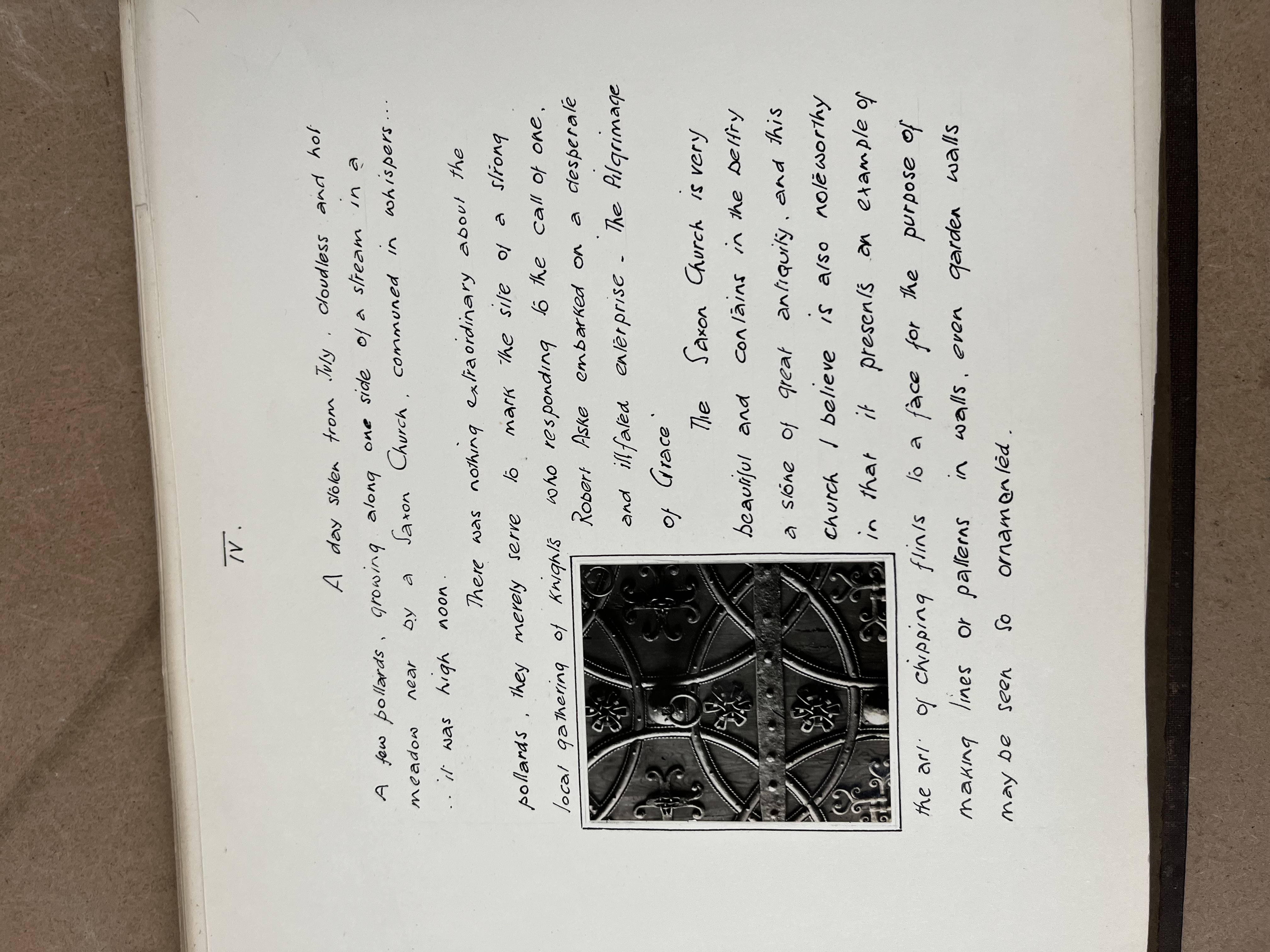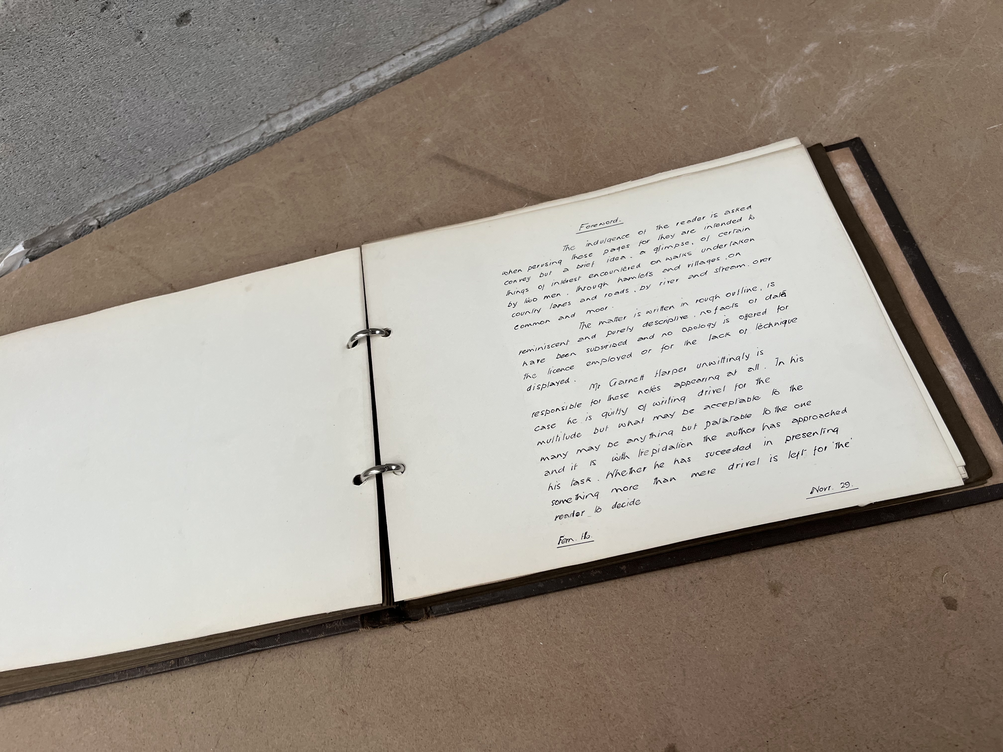 A bound manuscript book, likely a personal journal or chronicle, from approximately the mid-20th century, displaying an artisanal quality. It features off-white paper pages filled with meticulous handwritten English prose and poetry in a neat, flowing script, alongside small, square black-and-white photographs. The eclectic content includes descriptive nature writing, travel narratives, and historical or architectural observations, with a visible “Foreword” attributing authorship to “C. Rance Harper.” The book is presented in a dark, hardback binding, possibly cloth-over-board.