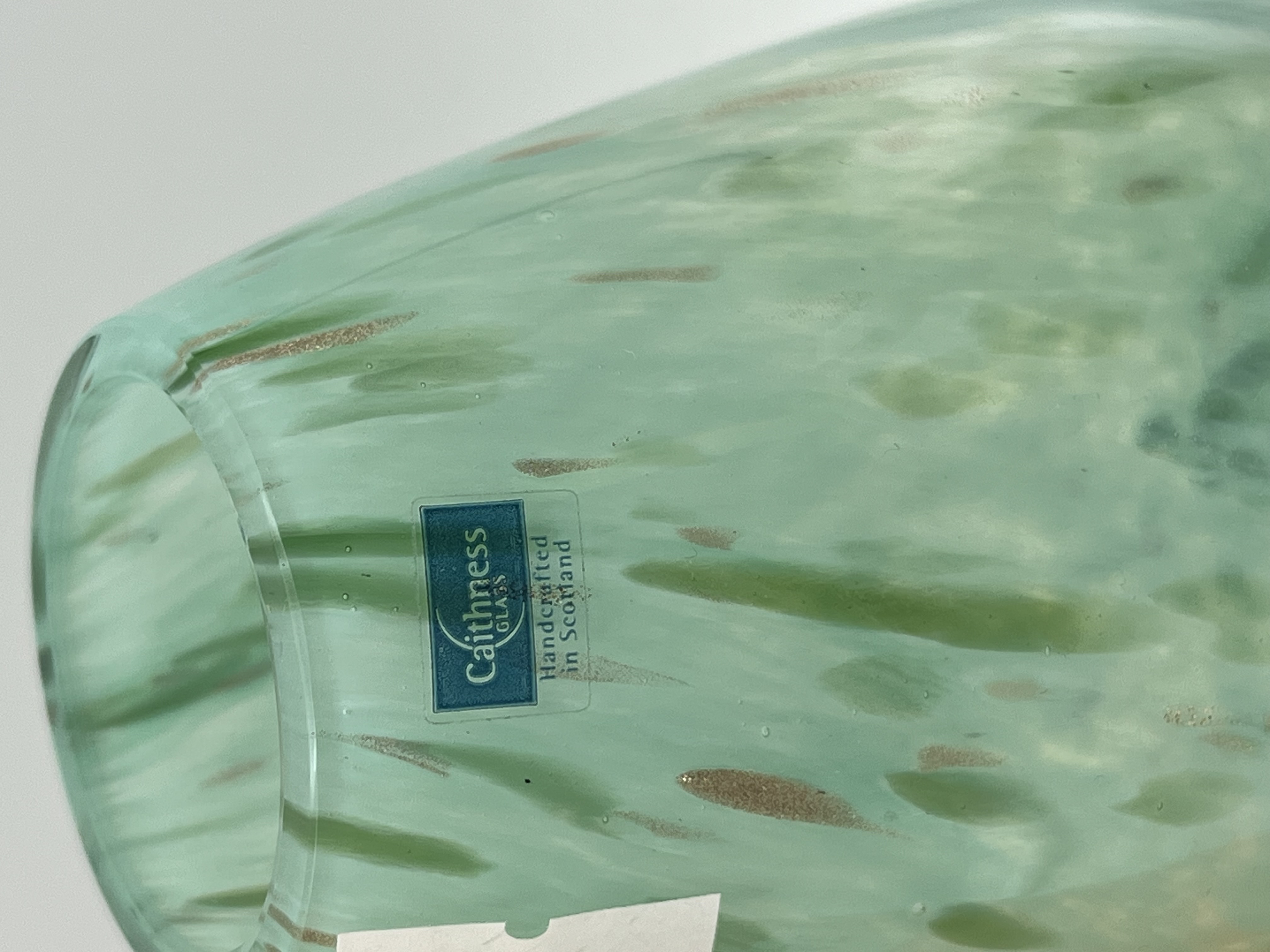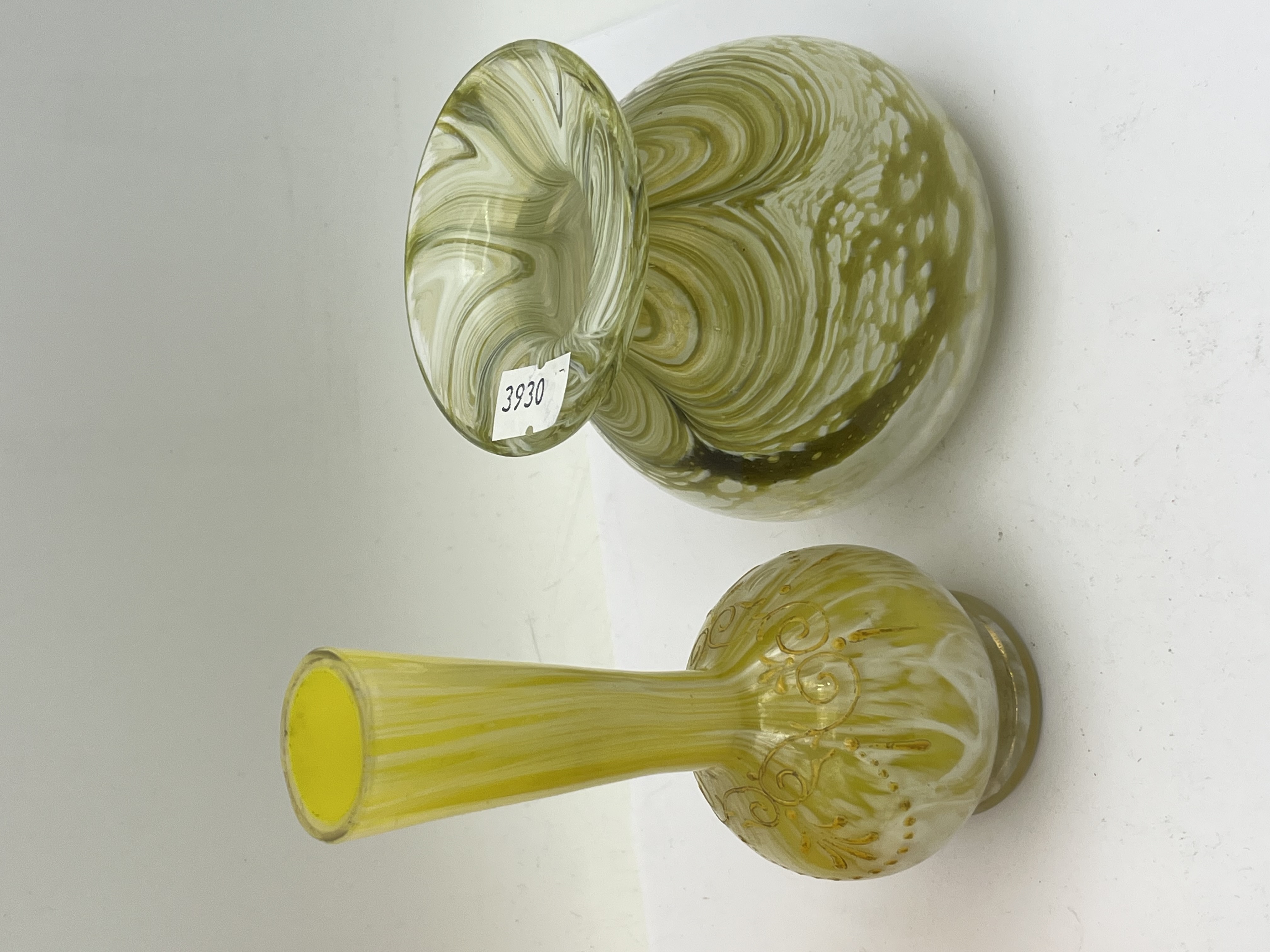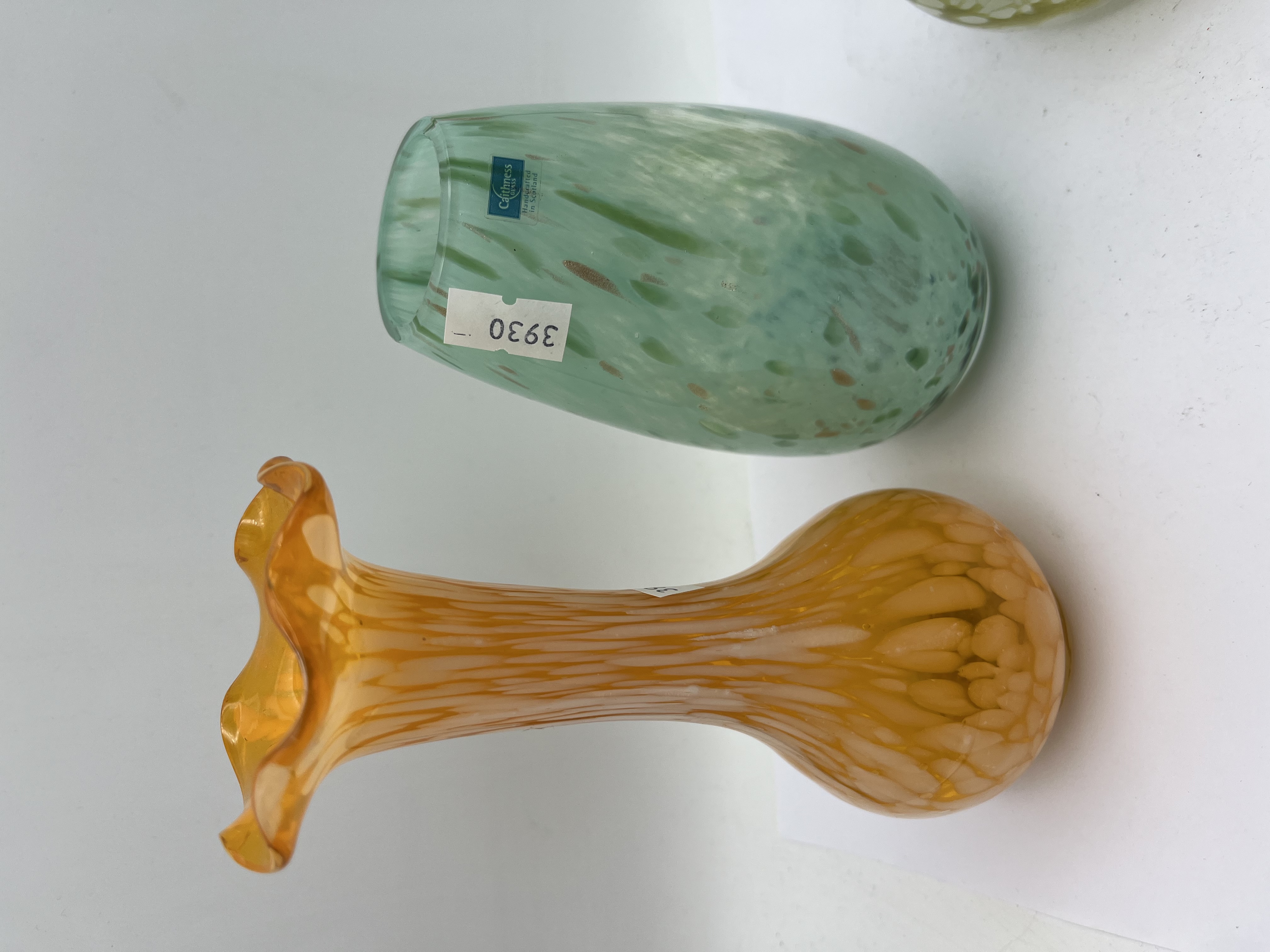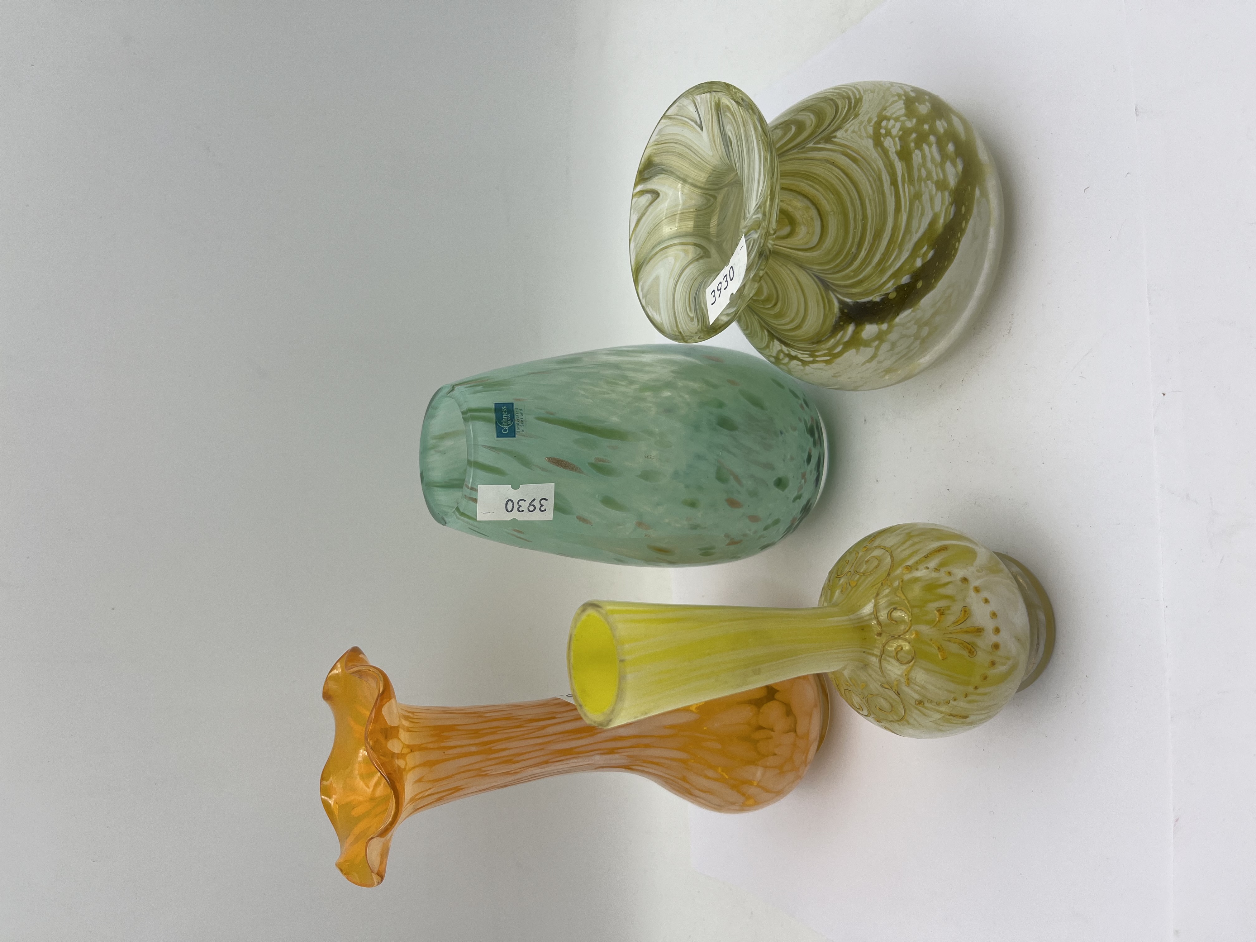 A collection of four art glass vases. The leftmost is a tall orange vase with a ruffled rim, featuring a vertically streaked or pulled-feather internal pattern. Next, a smaller yellow vase displays a striped body with a flaring neck and a bulbous base adorned with intricate gold-colored scrolled decoration. The third vase is a squat, ovoid form in a speckled mint green hue with inclusions of darker green and copper-toned frit; it prominently displays a blue rectangular label reading “Caithness GLASS Handcrafted in Scotland” and a white inventory sticker marked “3930”. The final item is a squat, bulbous vase with a wide, flared mouth, characterized by a distinct swirled pattern in shades of white, light green, and olive green, also bearing a “3930” sticker.