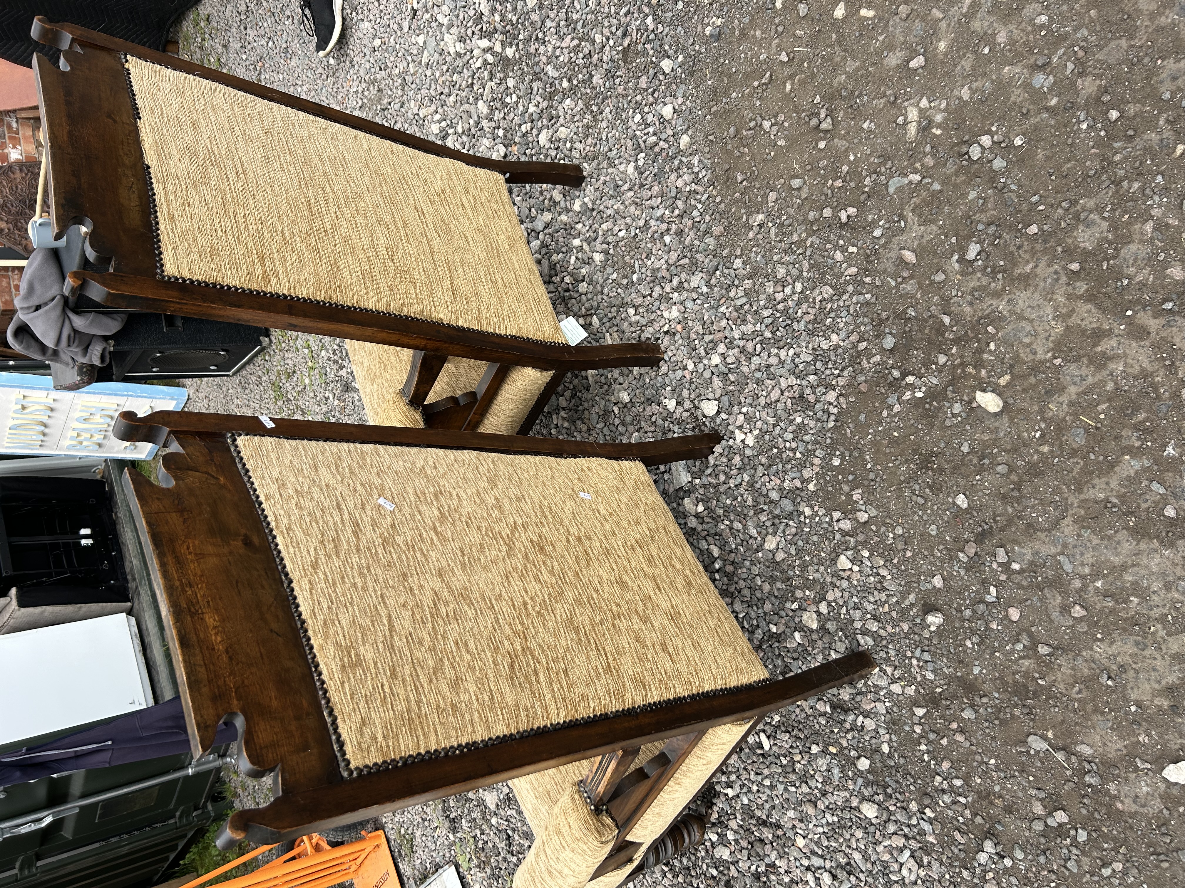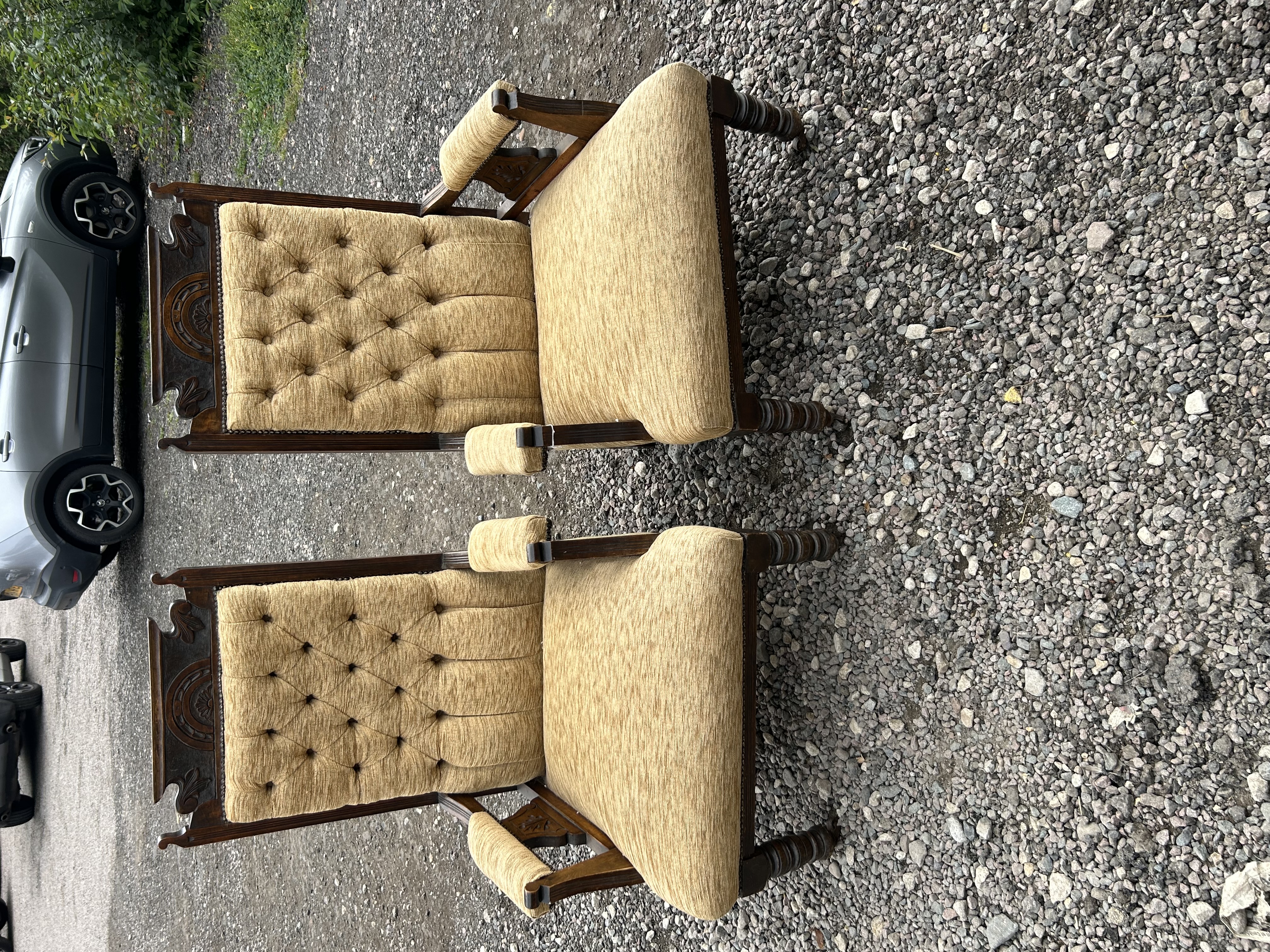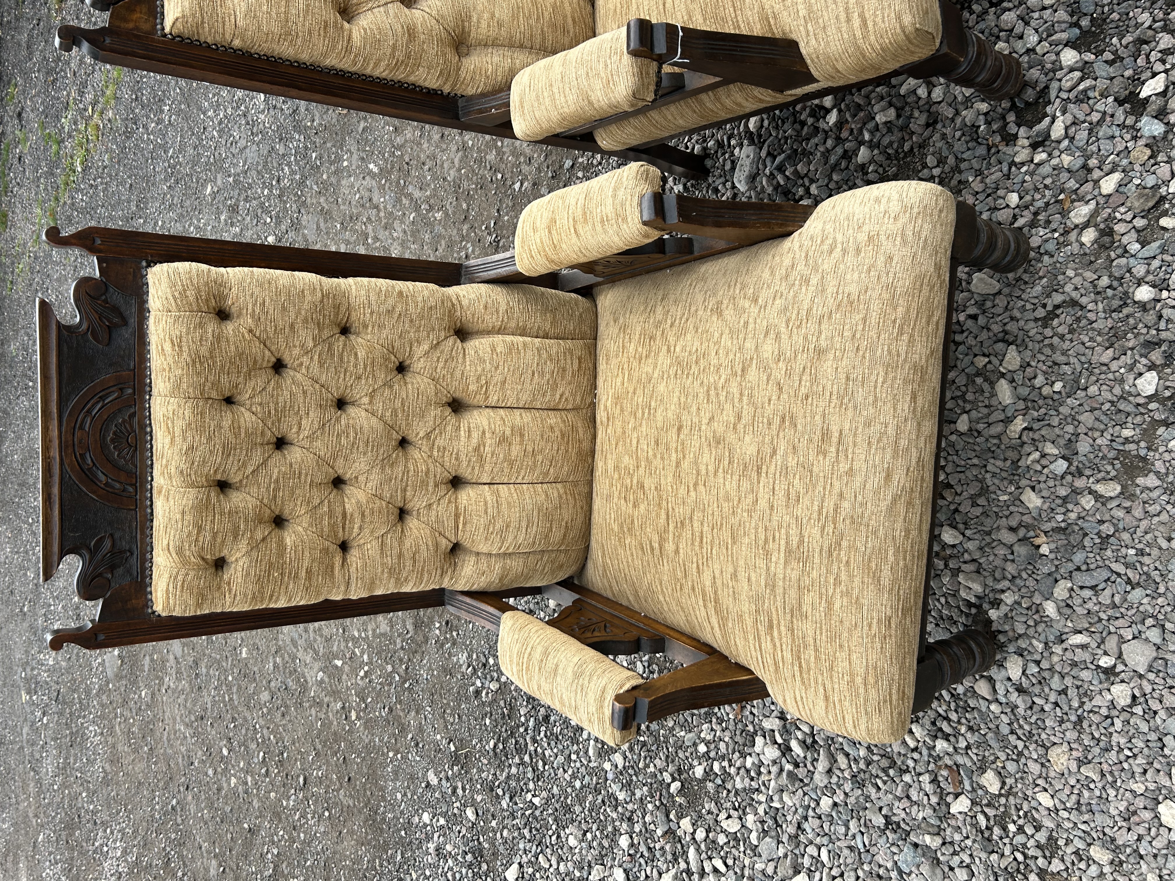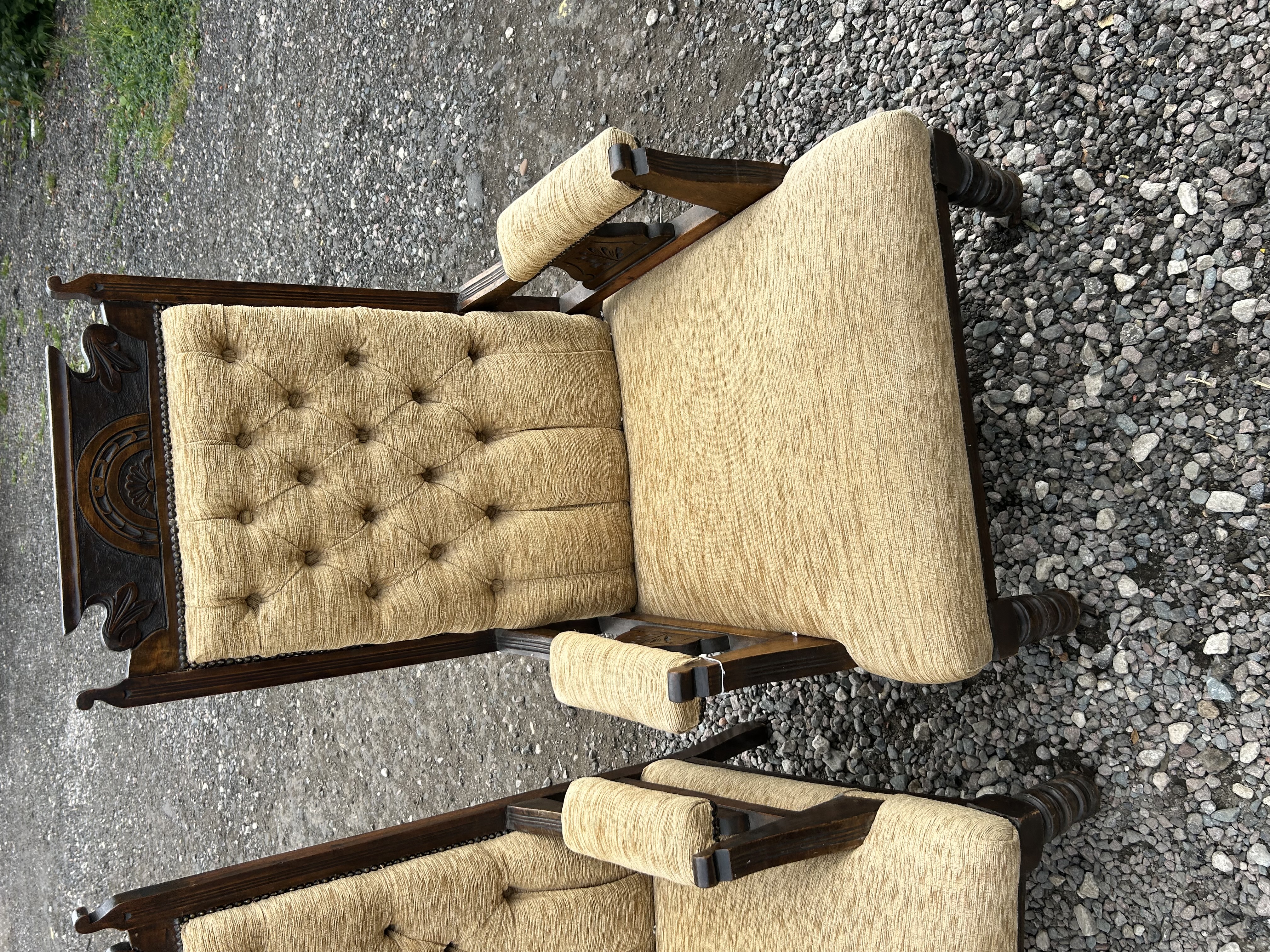 A pair of Edwardian armchairs crafted from dark-stained hardwood, likely oak, exhibiting a revival style with ornate carved cresting rails, turned front legs, and scrolled arm supports. Both high backrests are deeply button-tufted, and the seats and armrests are upholstered in a textured, light golden-brown fabric. Small illegible white stickers are present on the rear of the backrests. No discernible manufacturer’s marks or text are visible.