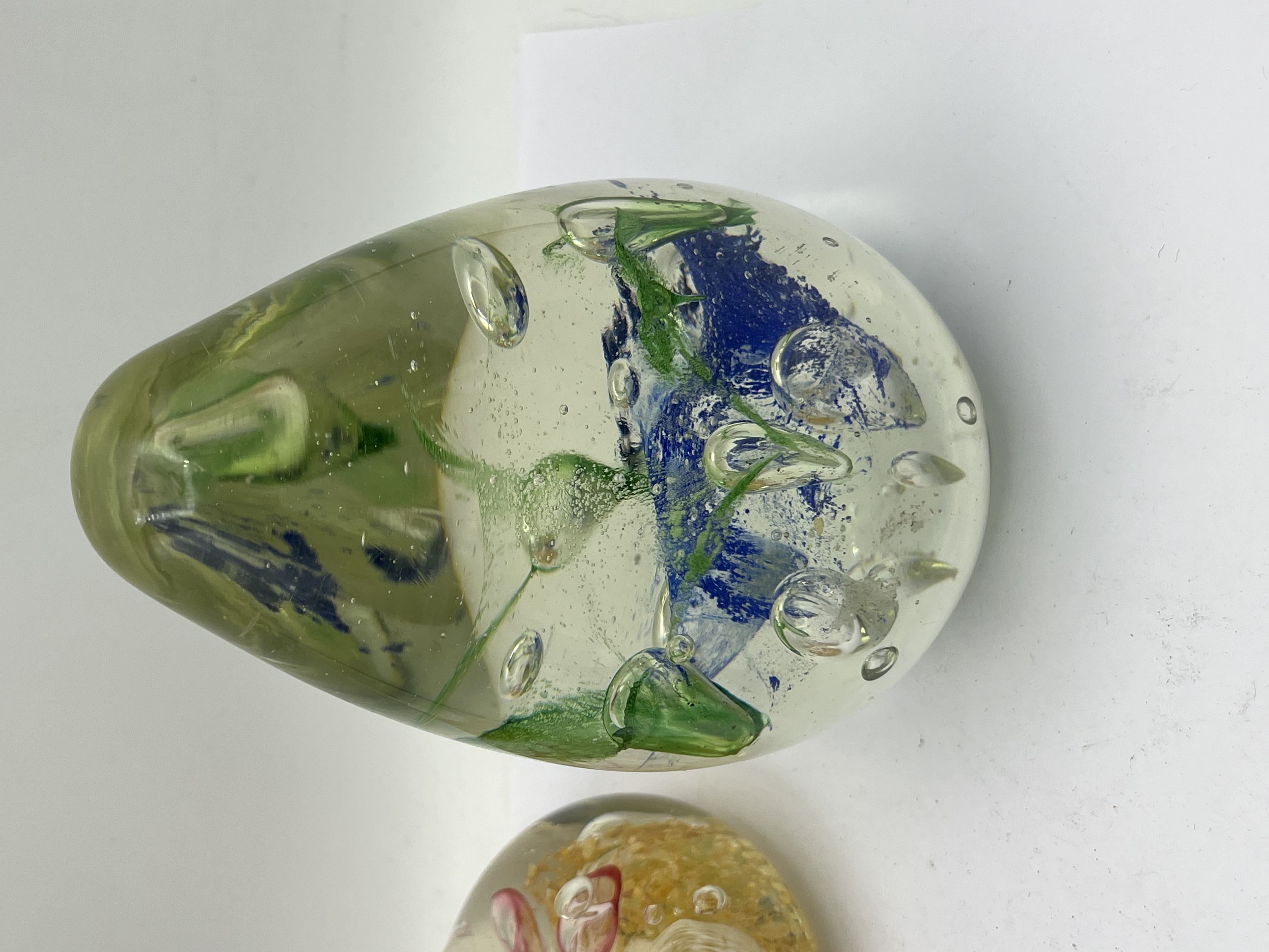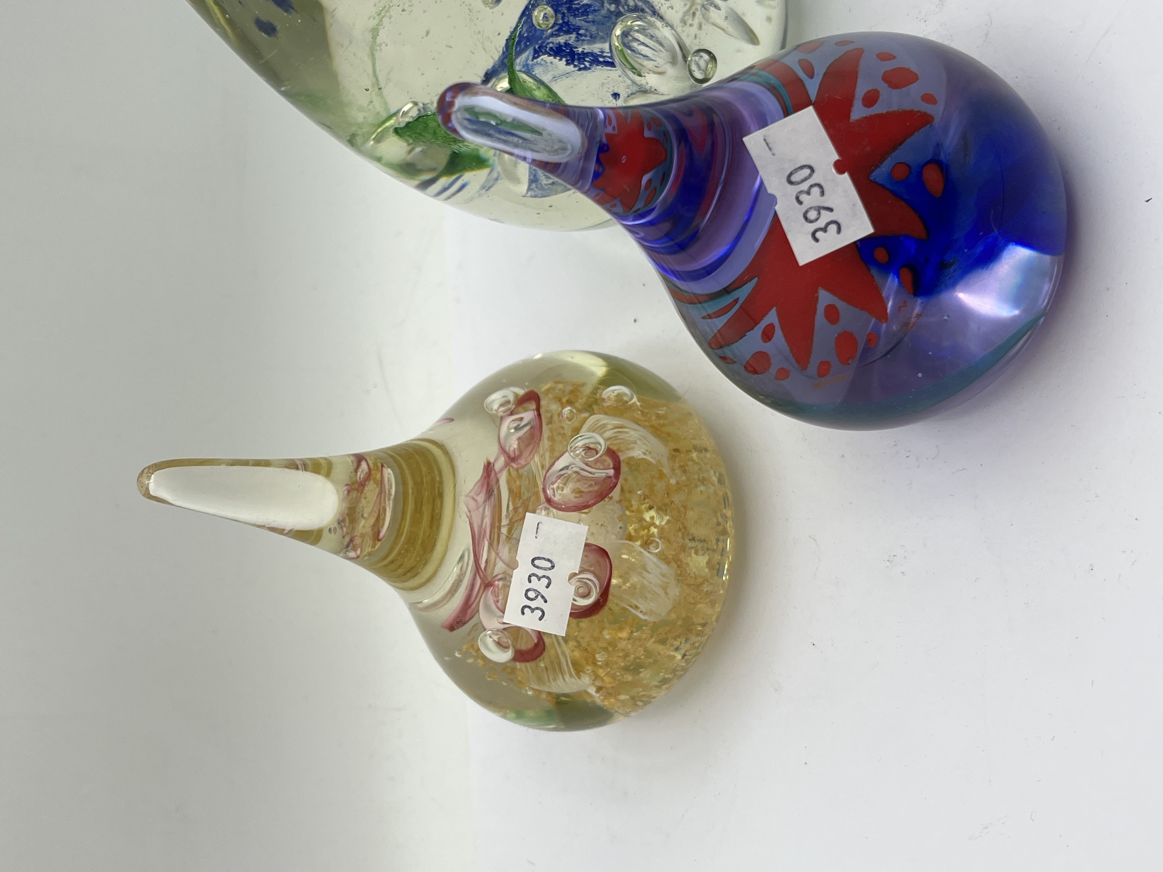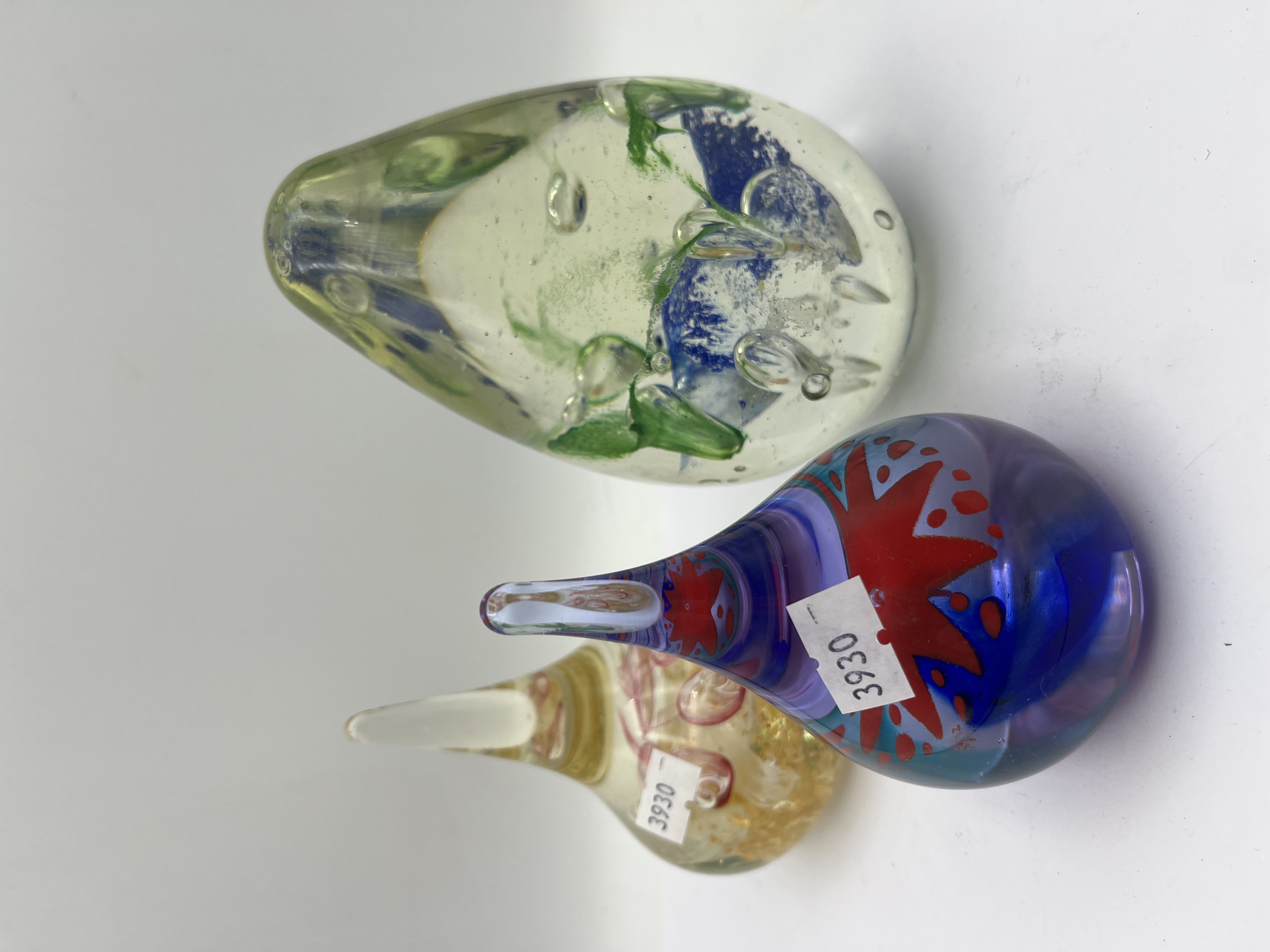 A group of three contemporary art glass paperweights. The two smaller teardrop-shaped paperweights, consistent with designs attributed to Adam Jablonski, feature pointed finials. One contains internal gold-colored flakes and red swirls within clear glass, and the other is predominantly blue with internal red abstract starburst patterns. Both bear white rectangular stickers marked “3930.” The third, larger ovoid-shaped paperweight is clear glass with abstract internal green and blue organic forms and trapped air bubbles.