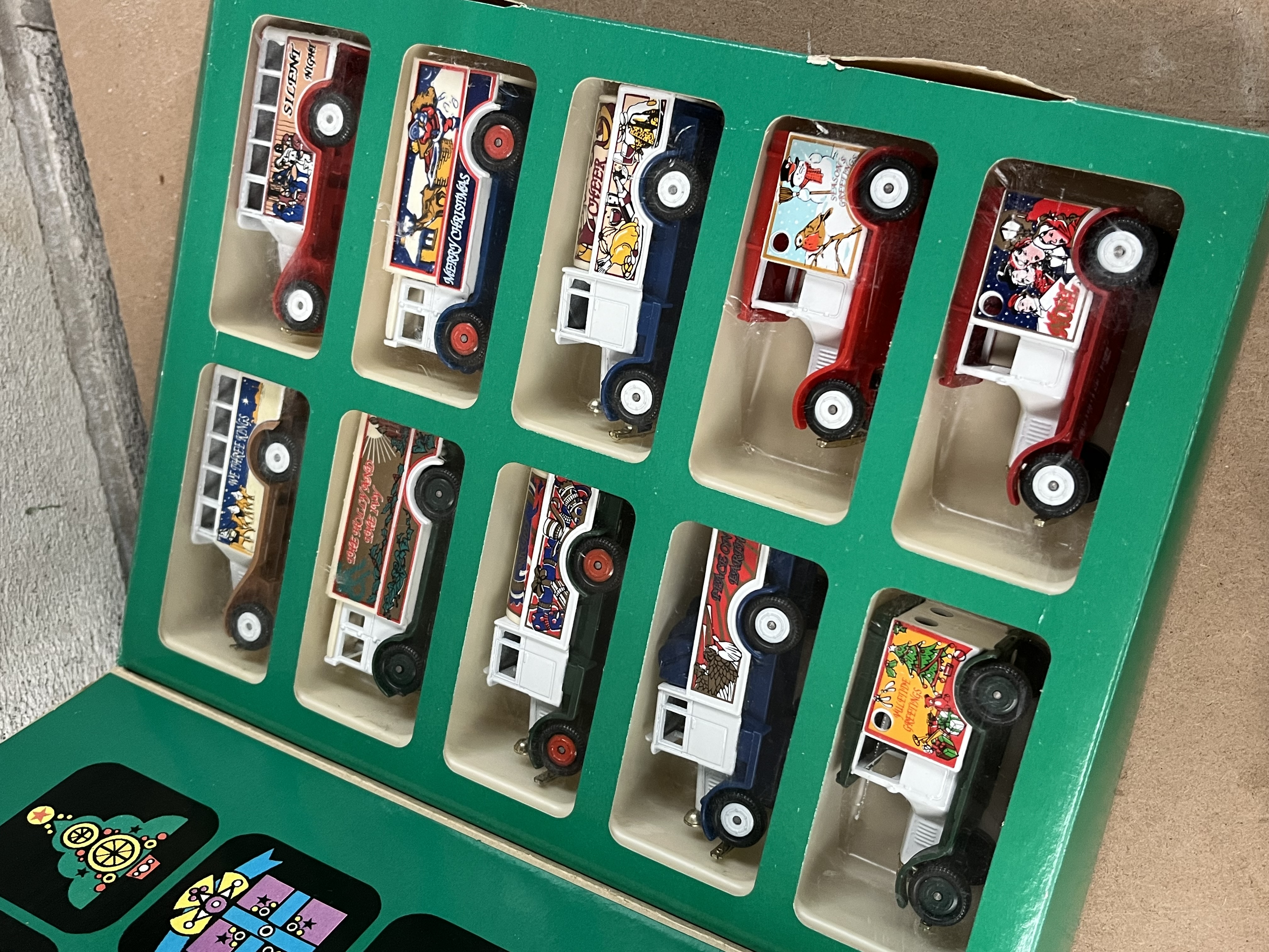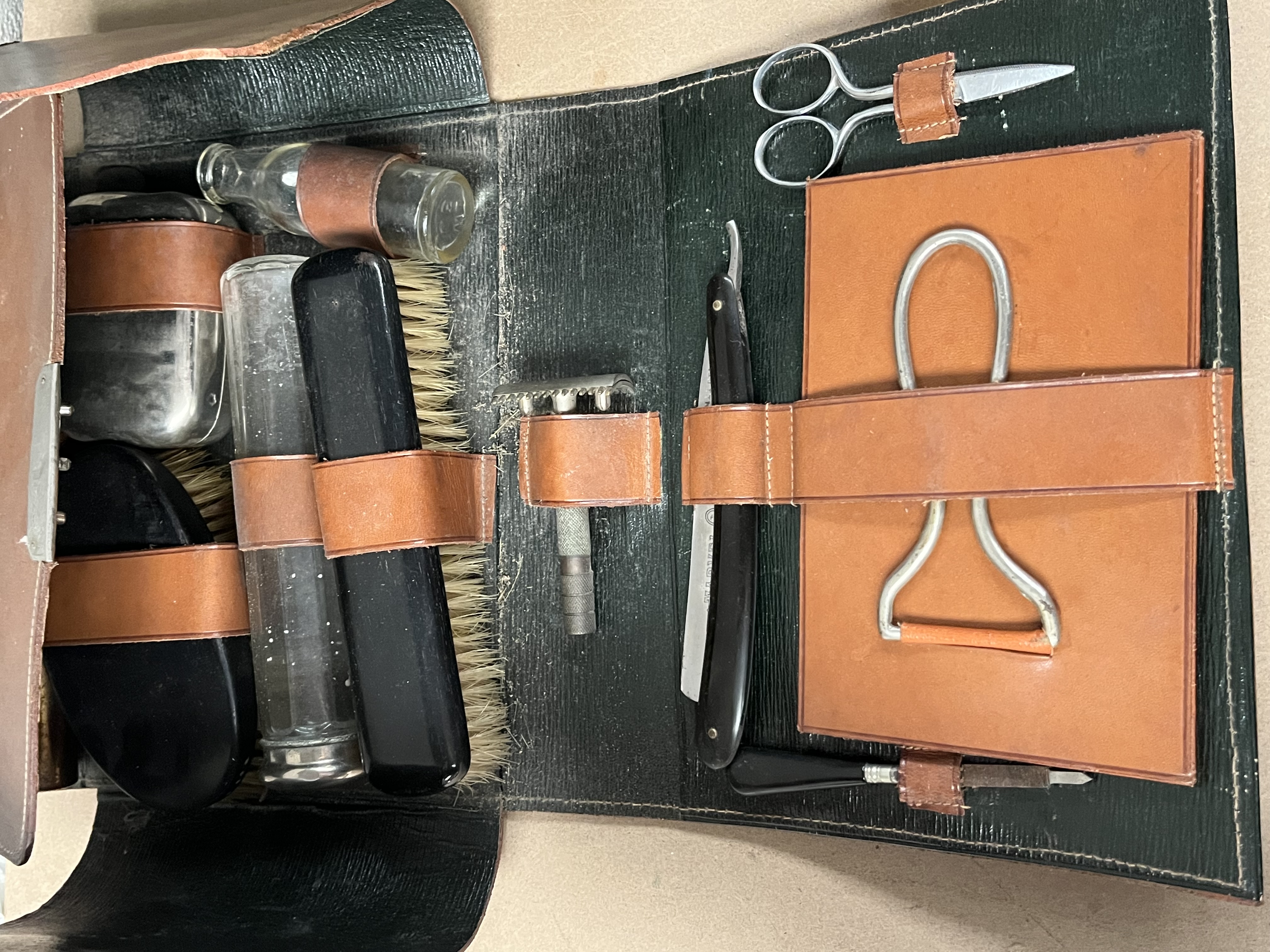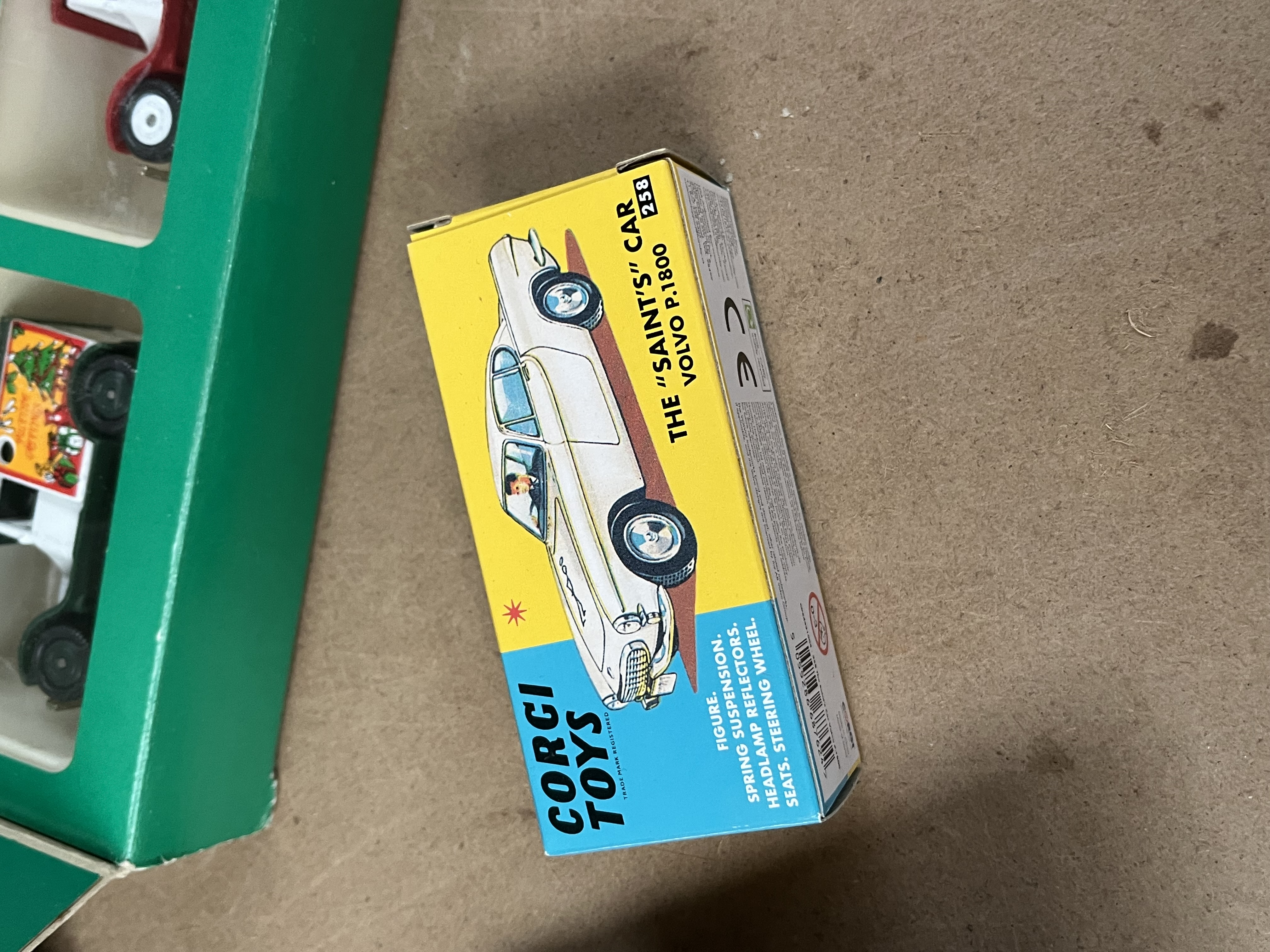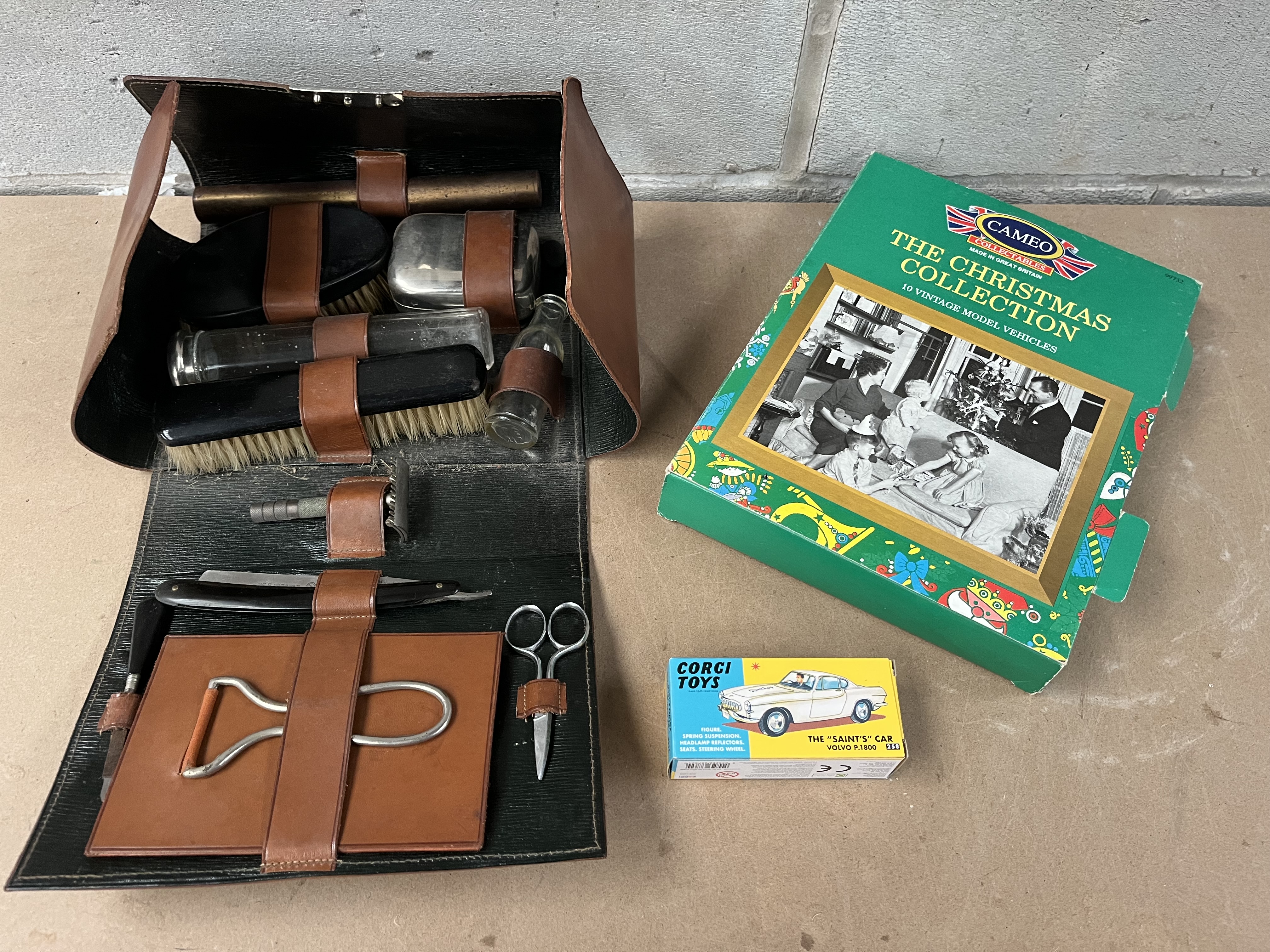 A set of ten Corgi Cameo ‘The Christmas Collection’ die-cast miniature vehicles, specifically early 20th-century style trucks adorned with festive holiday decals. The vehicles are presented in their original green box. Also included is a colorful cardboard ‘CORGI TOYS’ box, model 258, for ‘THE ‘SAINT’S’ CAR’ Volvo P.1800, detailing features like ‘SPRING SUSPENSION’ and ‘FIGURE’, prominently marked ‘Made in Gt. Britain’. Completing the lot is a dark green leather travel grooming or toiletry case with a light brown leather interior, securing various tools including a straight razor, safety razor, scissors, brushes, and glass containers.