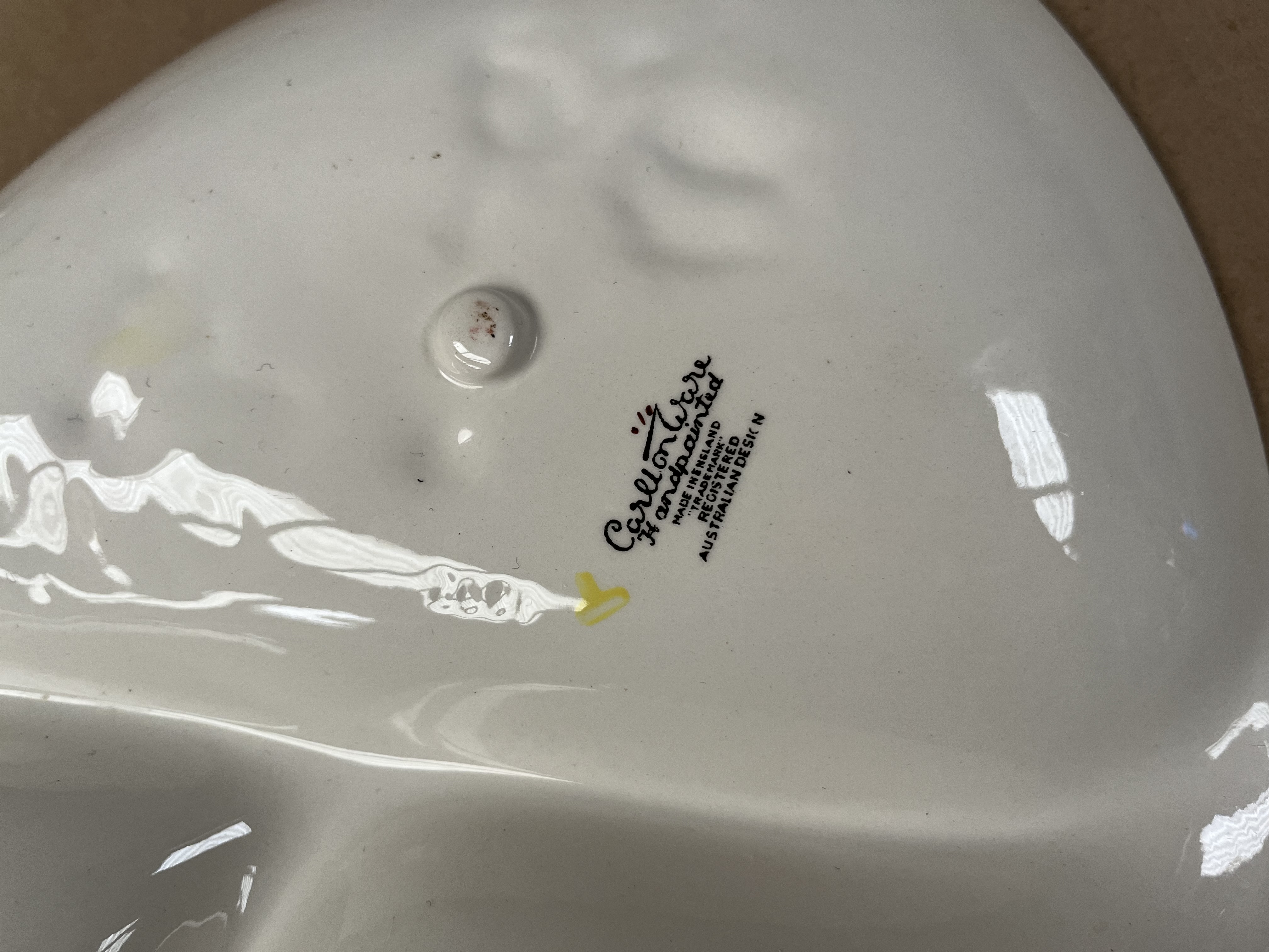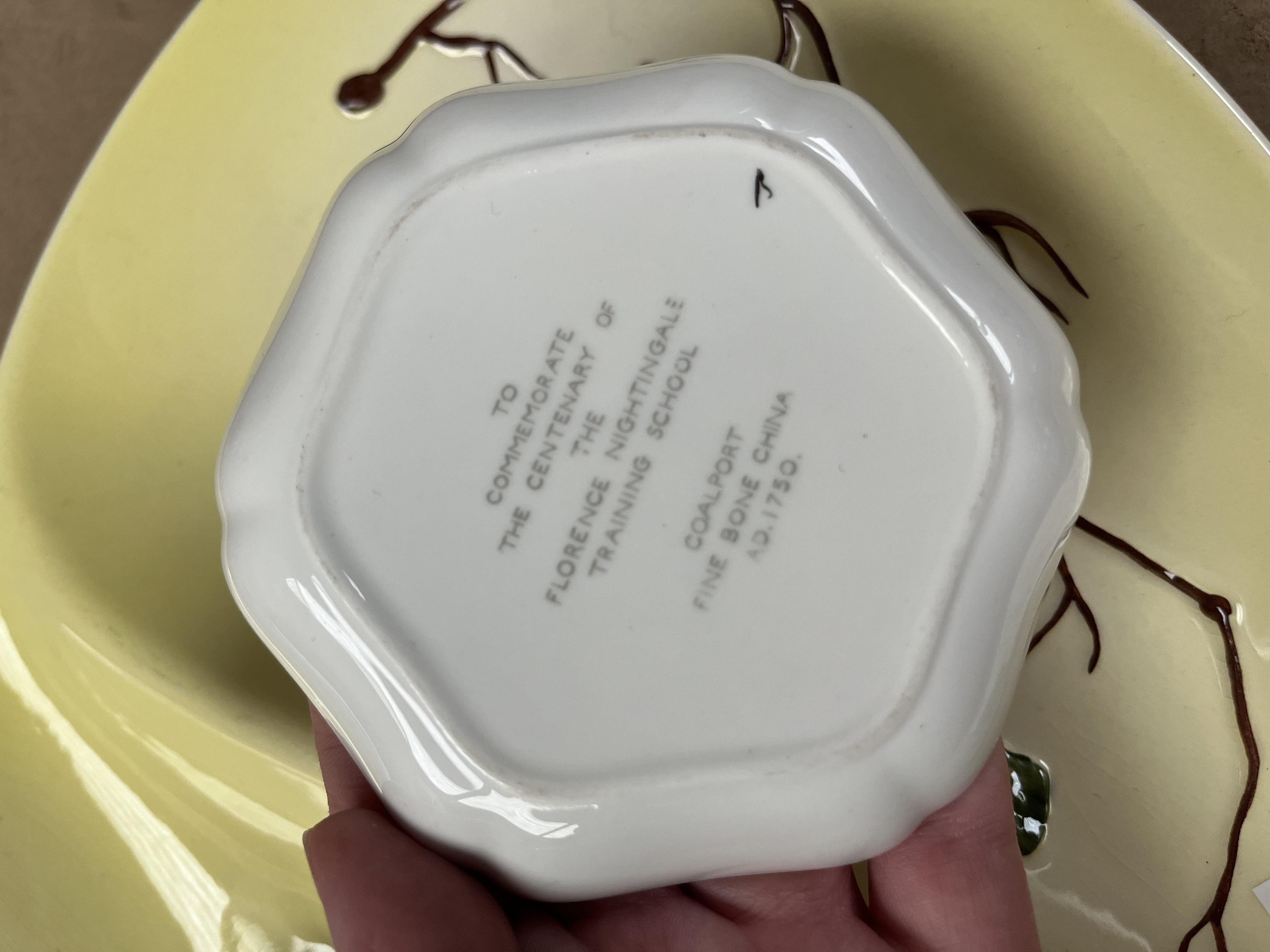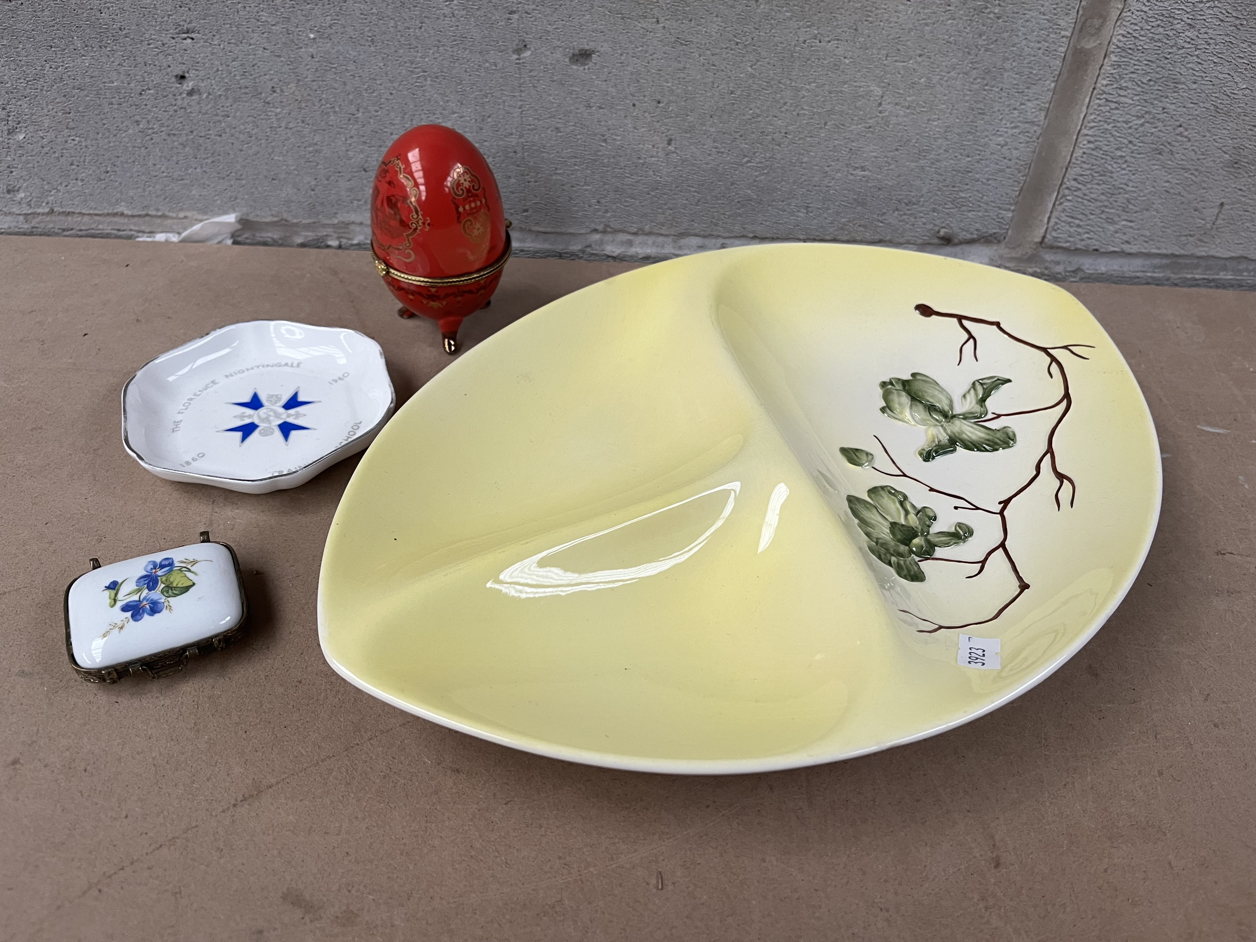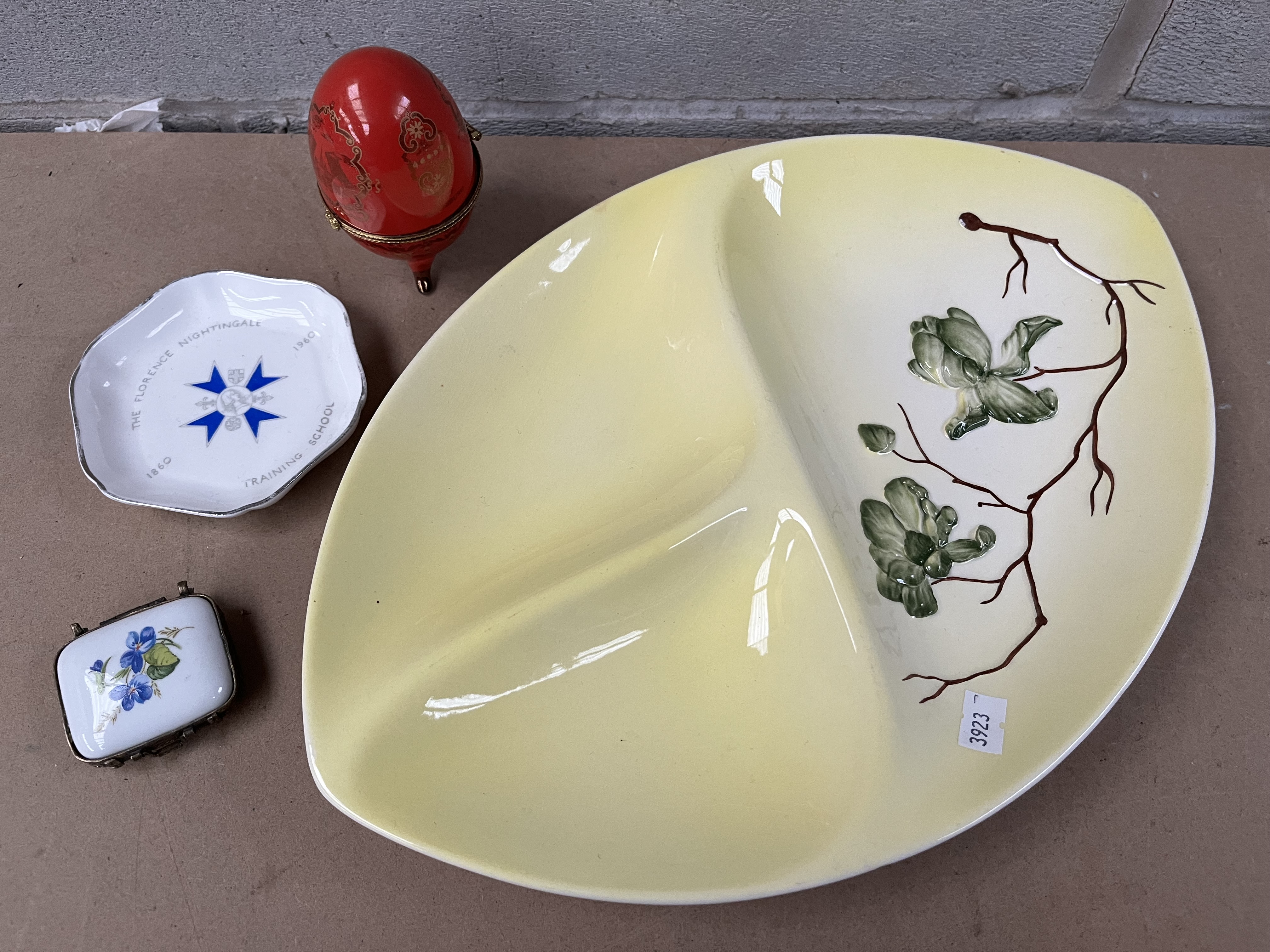 A group of four decorative items. The primary item is a large, pale yellow ceramic divided serving dish by Carlton Ware, in a mid-century style, adorned with hand-painted green foliage. The base is marked “Carlton Ware, Handpainted, Made in England, Registered, Australian Design,” and bears a “3923” sticker. Accompanying this is a small, white hexagonal Coalport Fine Bone China commemorative dish, featuring a blue and gold starburst design. It is marked on the front “THE FLORENCE NIGHTINGALE TRAINING SCHOOL 1860 1960” and on the reverse “TO COMMEMORATE THE CENTENARY OF THE FLORENCE NIGHTINGALE TRAINING SCHOOL COALPORT FINE BONE CHINA AD.1750.” Also present is a red, egg-shaped decorative box, possibly enameled metal, with intricate gold-colored scrollwork, mounted on a three-footed gold-toned stand. Completing the group is a small rectangular hinged trinket box, featuring a white ceramic top panel with blue floral decoration set within a decorative gold-toned metal frame.