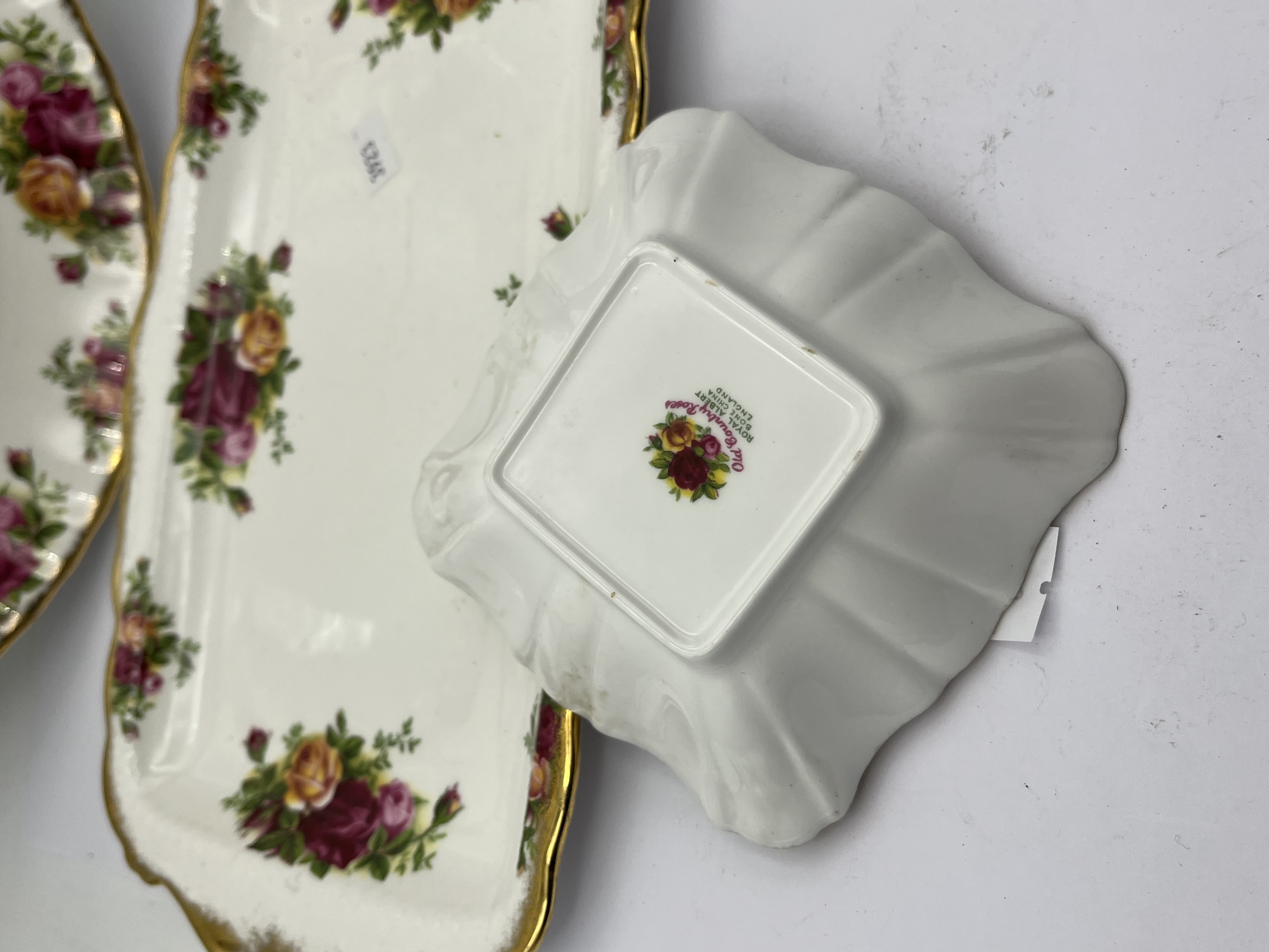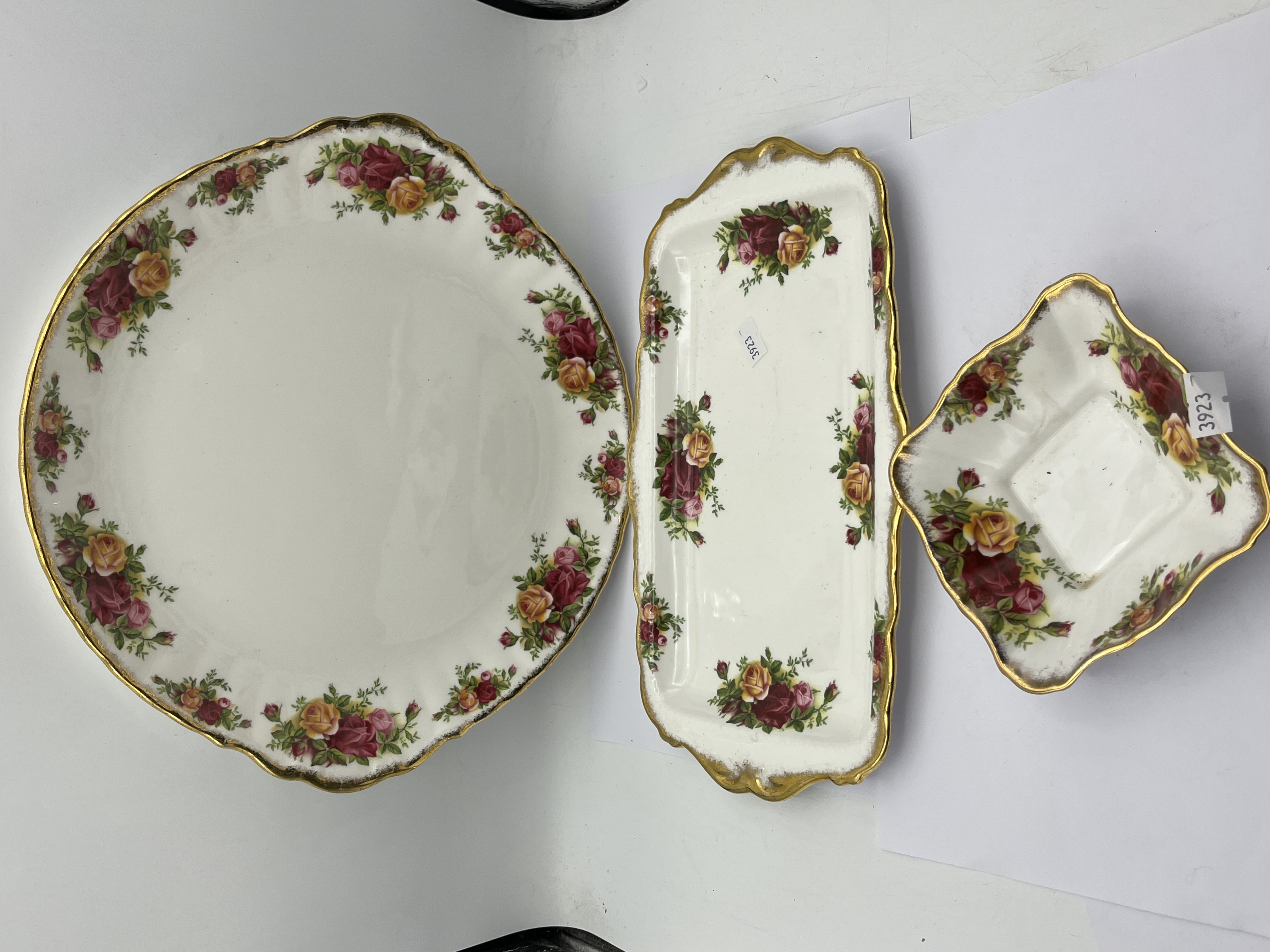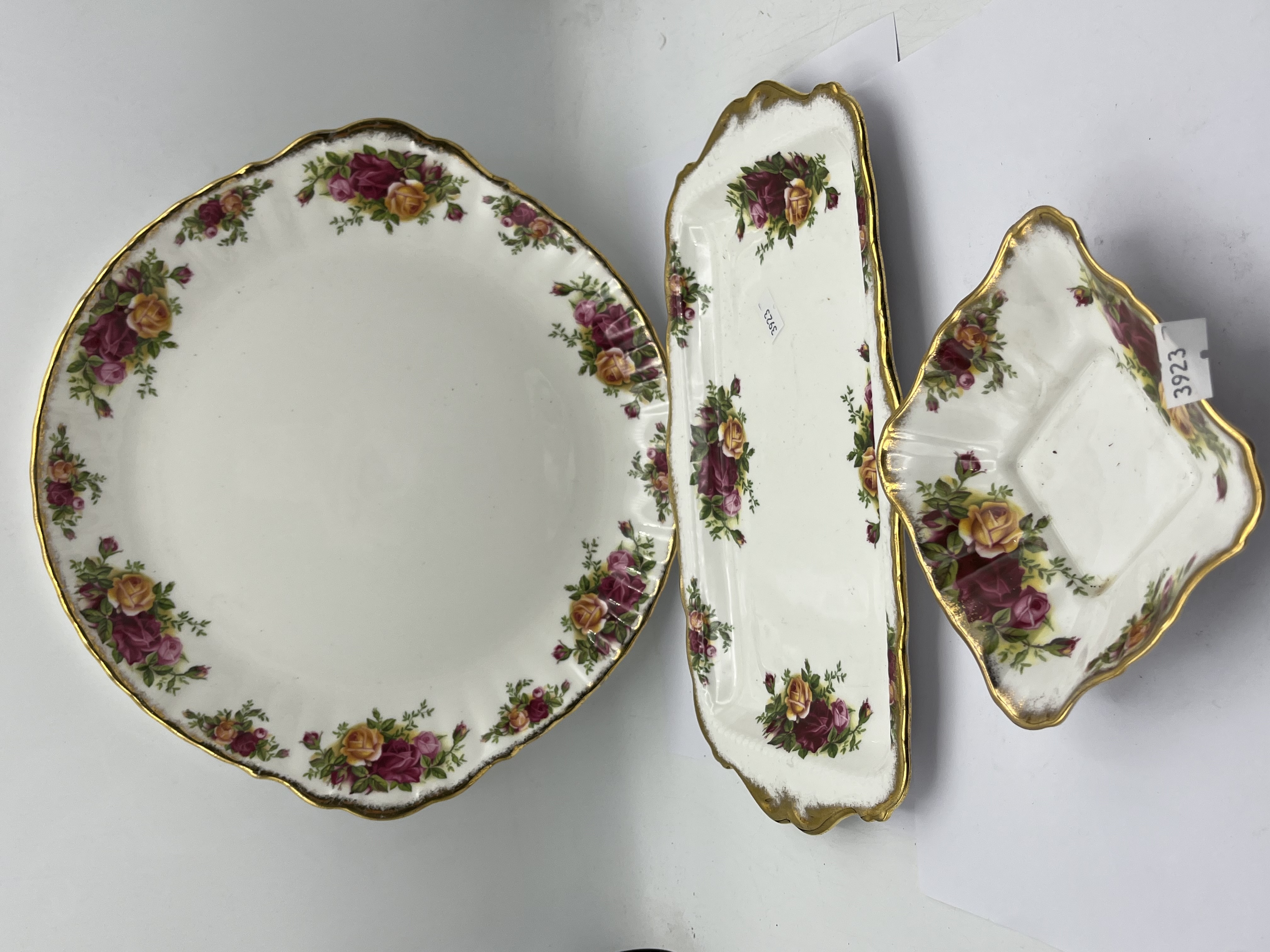 A group of three pieces of Royal Albert ‘Old Country Roses’ bone china tableware. Each piece is decorated with a vibrant pattern of red, pink, yellow, and orange roses amidst green foliage, further enhanced by extensive gold gilding along the scalloped and fluted rims. The lot comprises a large, round scalloped serving plate, a rectangular serving dish with undulating edges, and a small, square fluted bowl. The underside of the small square bowl bears a backstamp identifying the manufacturer as “ROYAL ALBERT,” the material as “BONE CHINA” from “ENGLAND,” and the pattern as “Old Country Roses,” with a copyright date of “1962.”