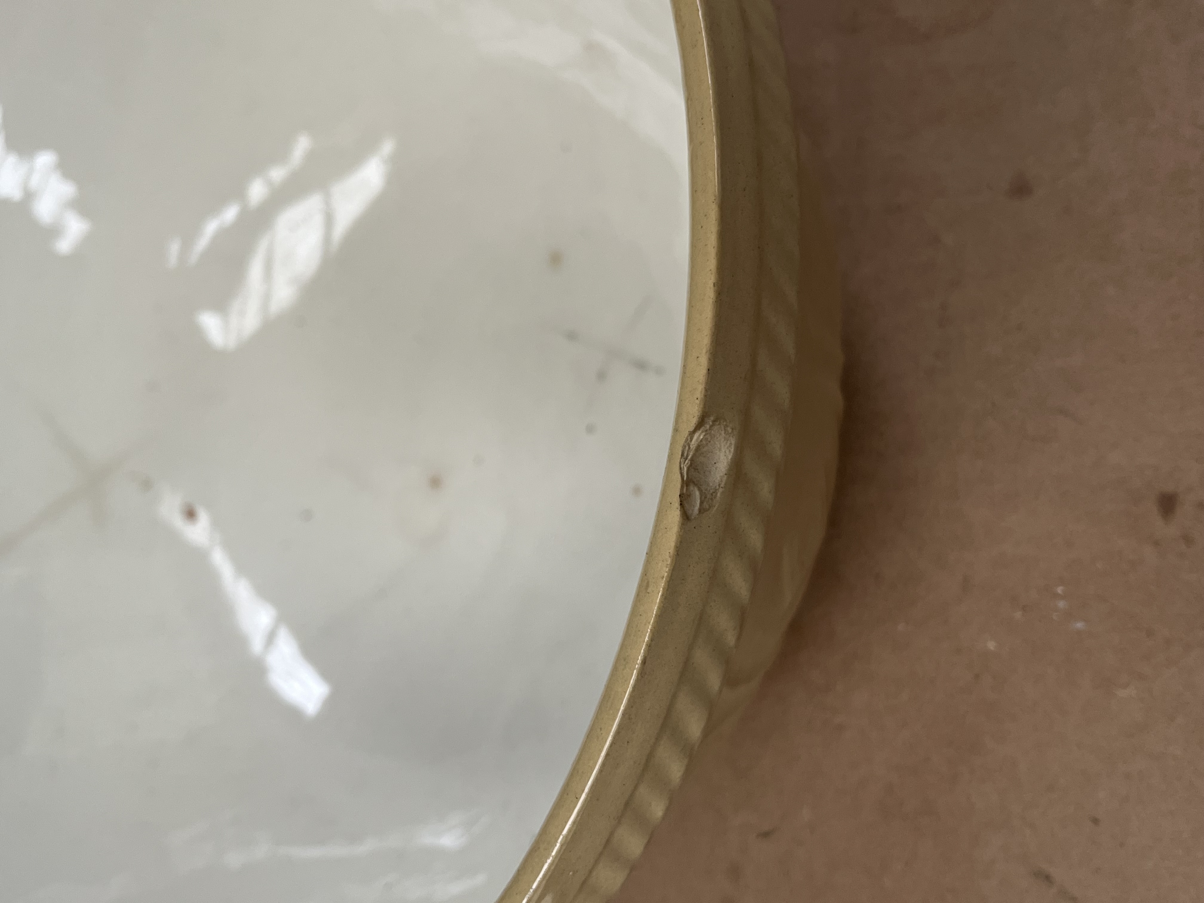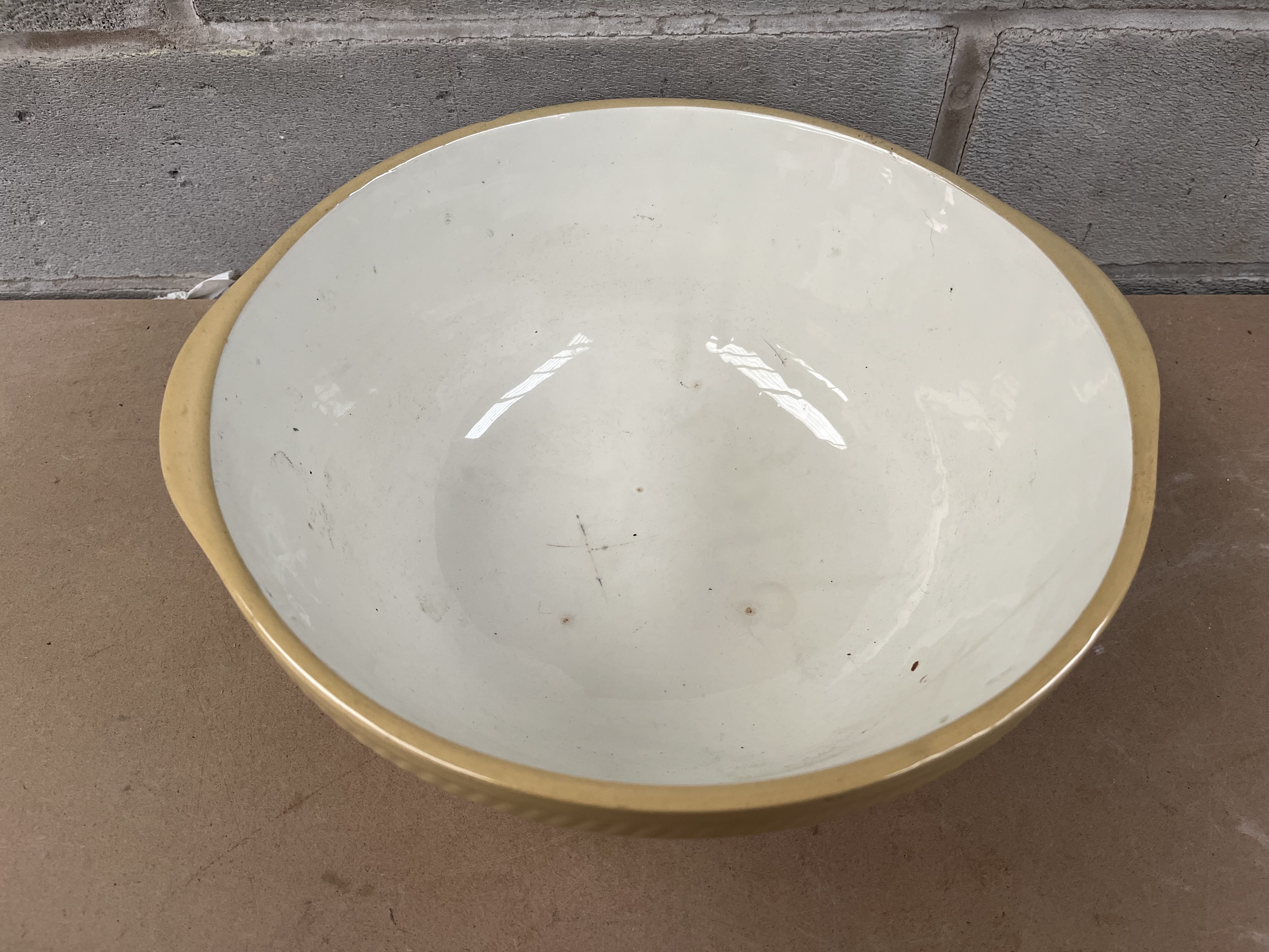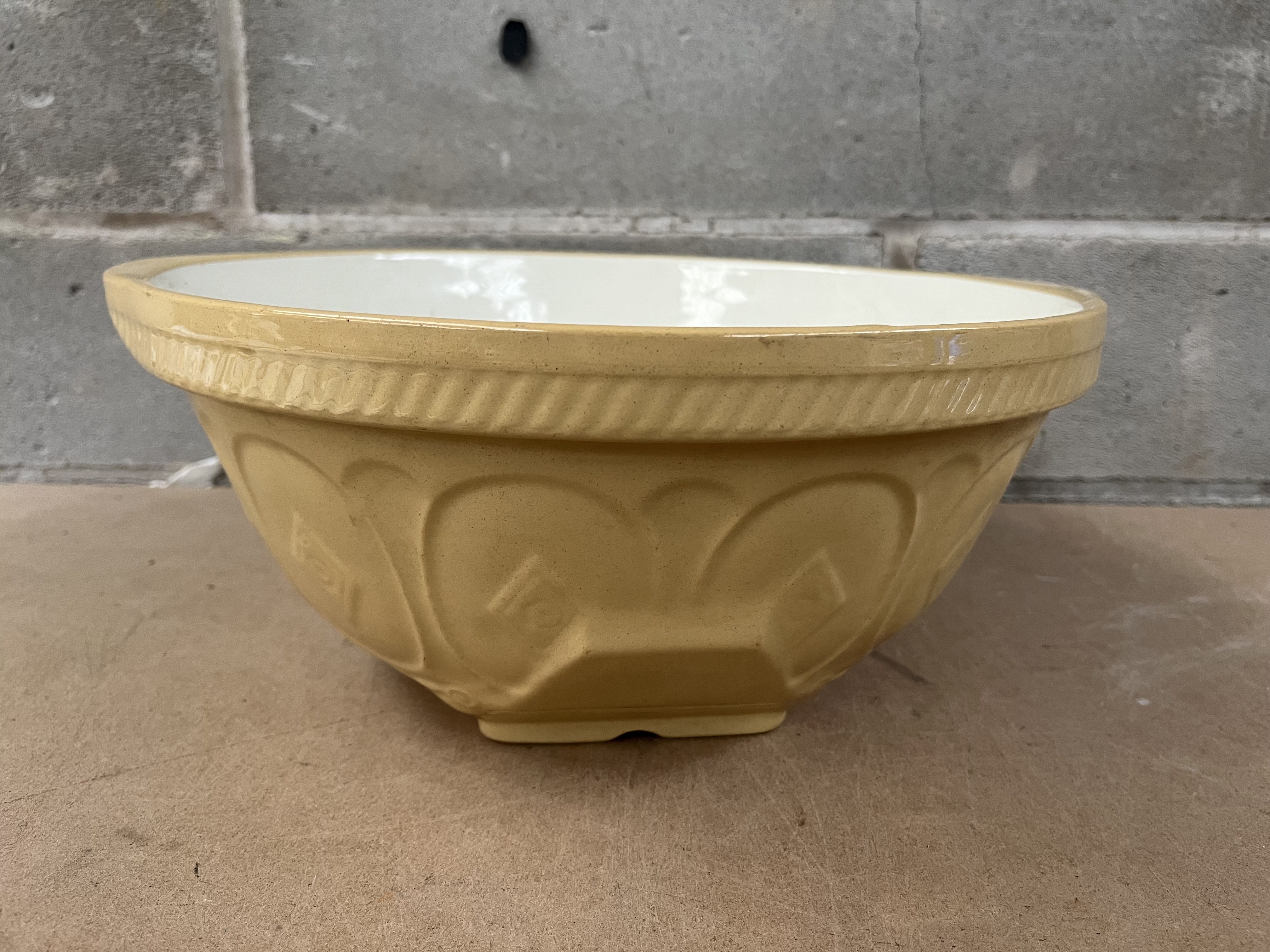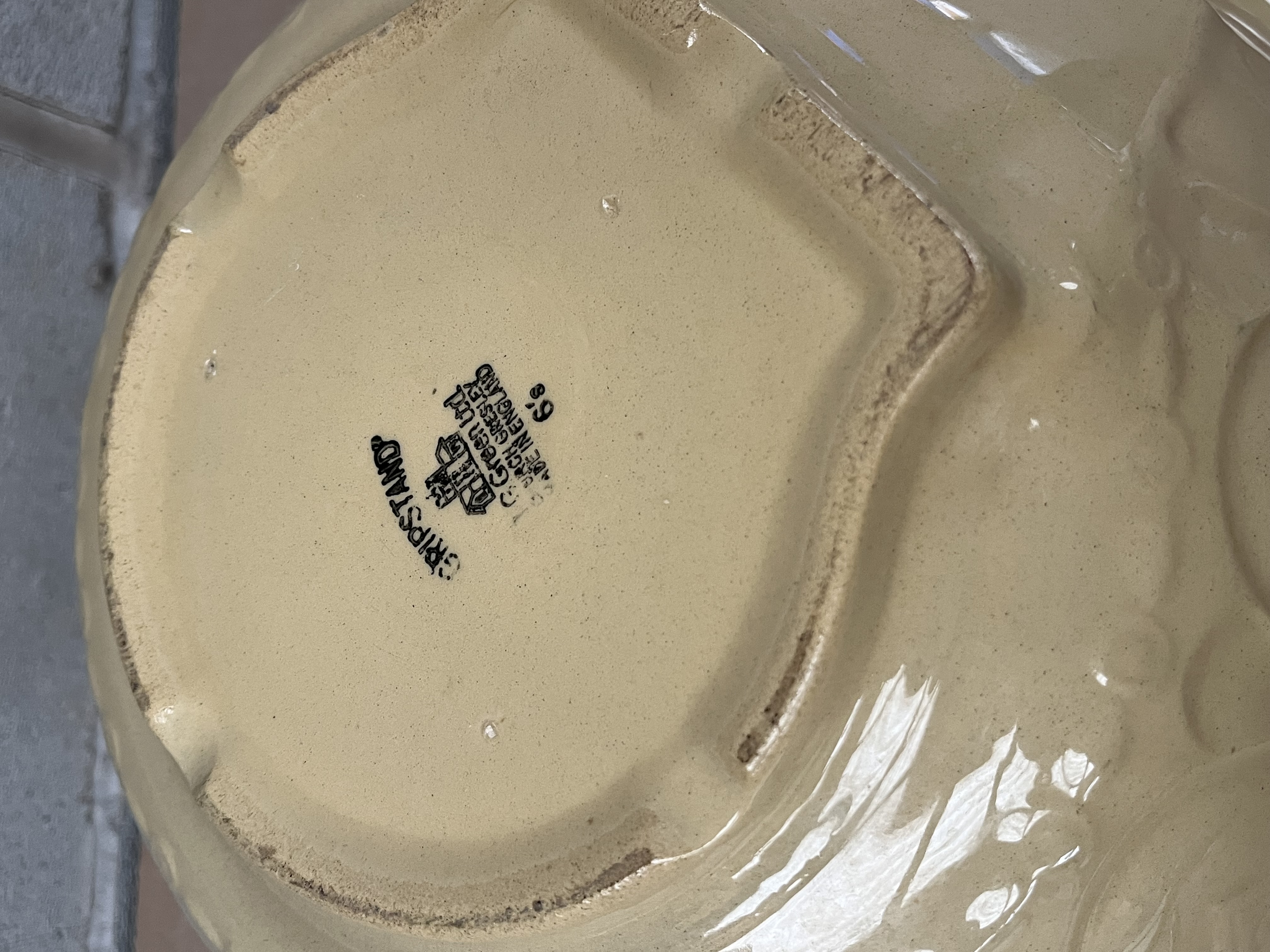 A T.G. Green ‘Gripstand’ Yellow Ware Mixing Bowl. This traditional ceramic mixing bowl features a glazed buff-colored exterior with a continuous embossed decorative band of scroll or leaf motifs, and a contrasting cream-white glazed interior. The base is also buff-glazed with a distinct foot, and marked in black with “GRIPSTAND,” a house-like maker’s mark, “G. Green Ltd,” “Church Gresley,” “MADE IN ENGLAND,” and “6’s.”