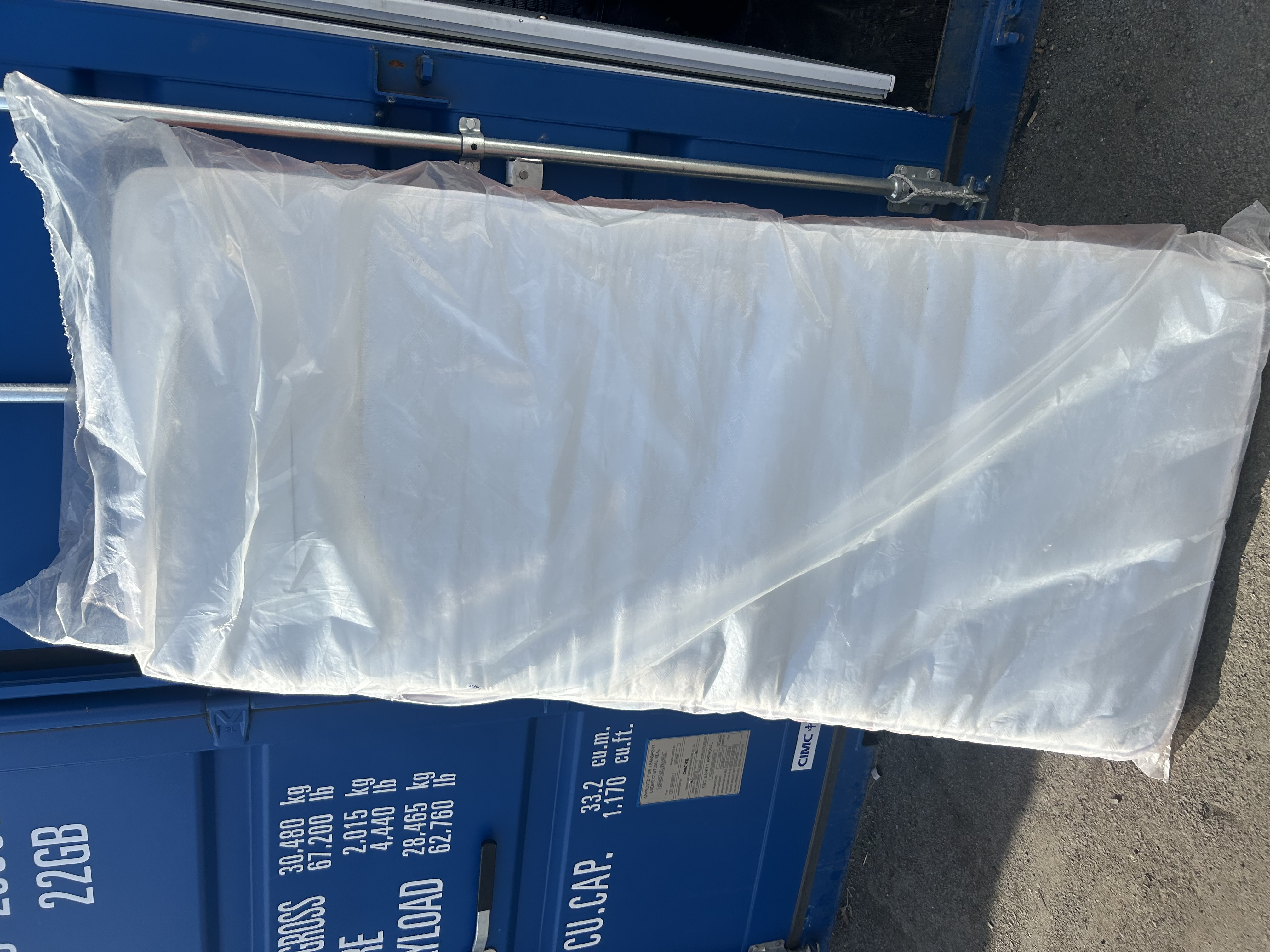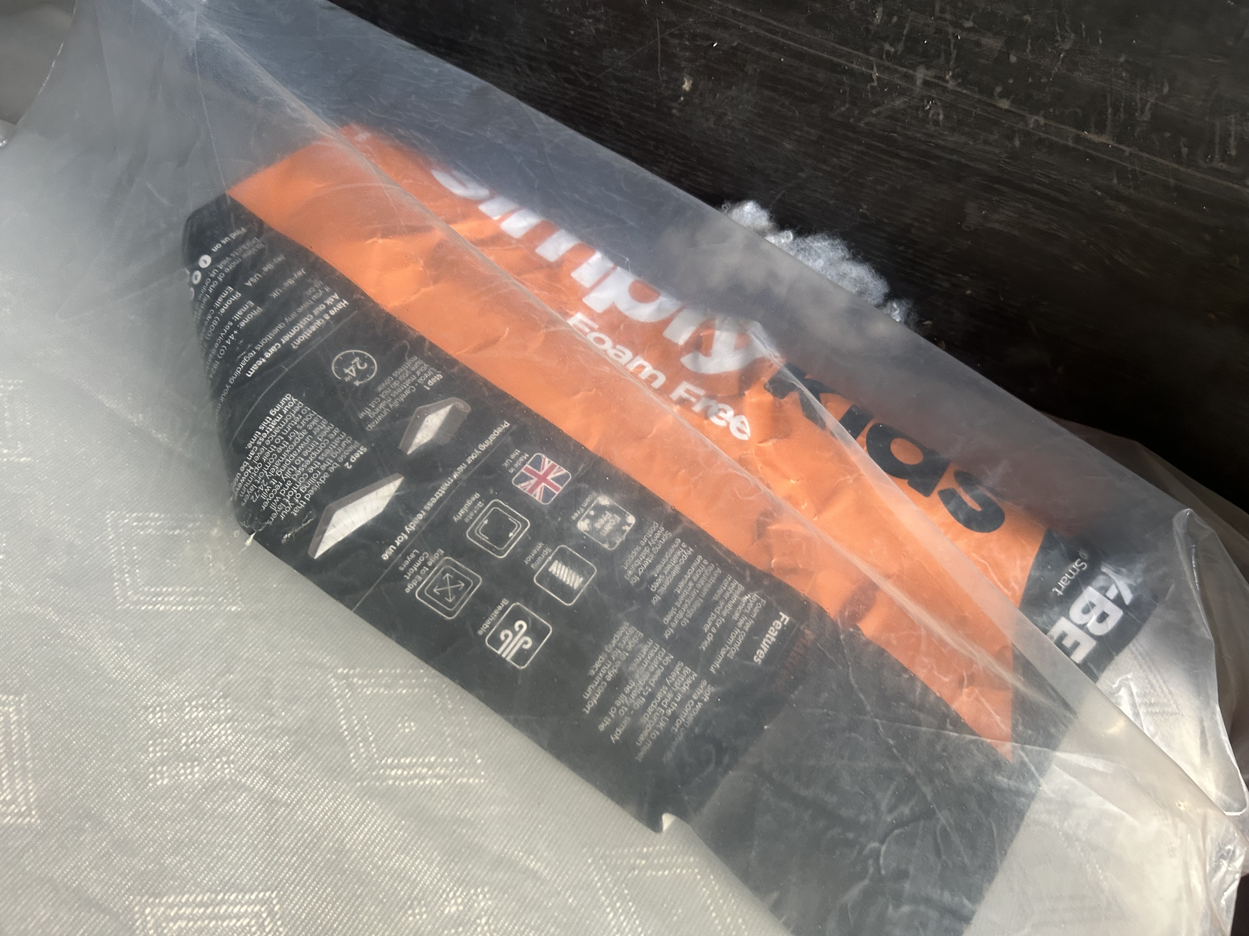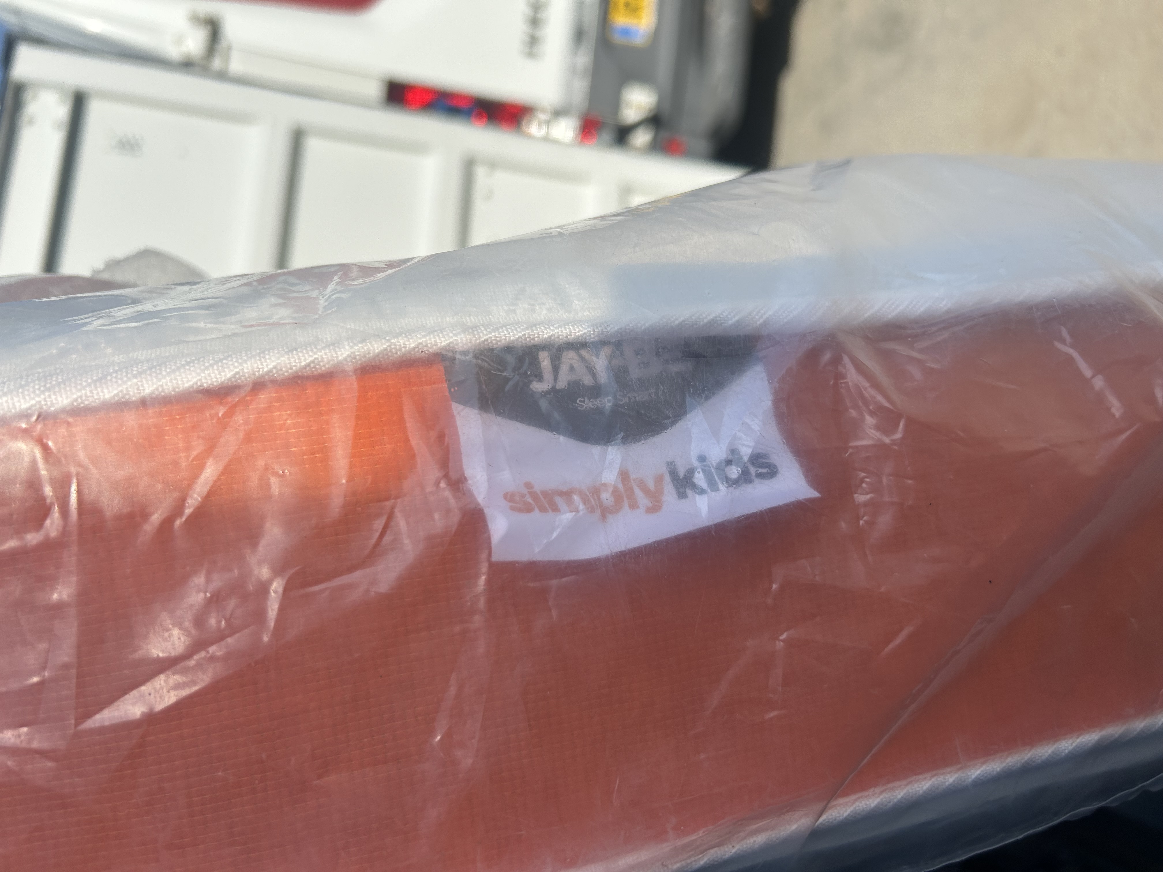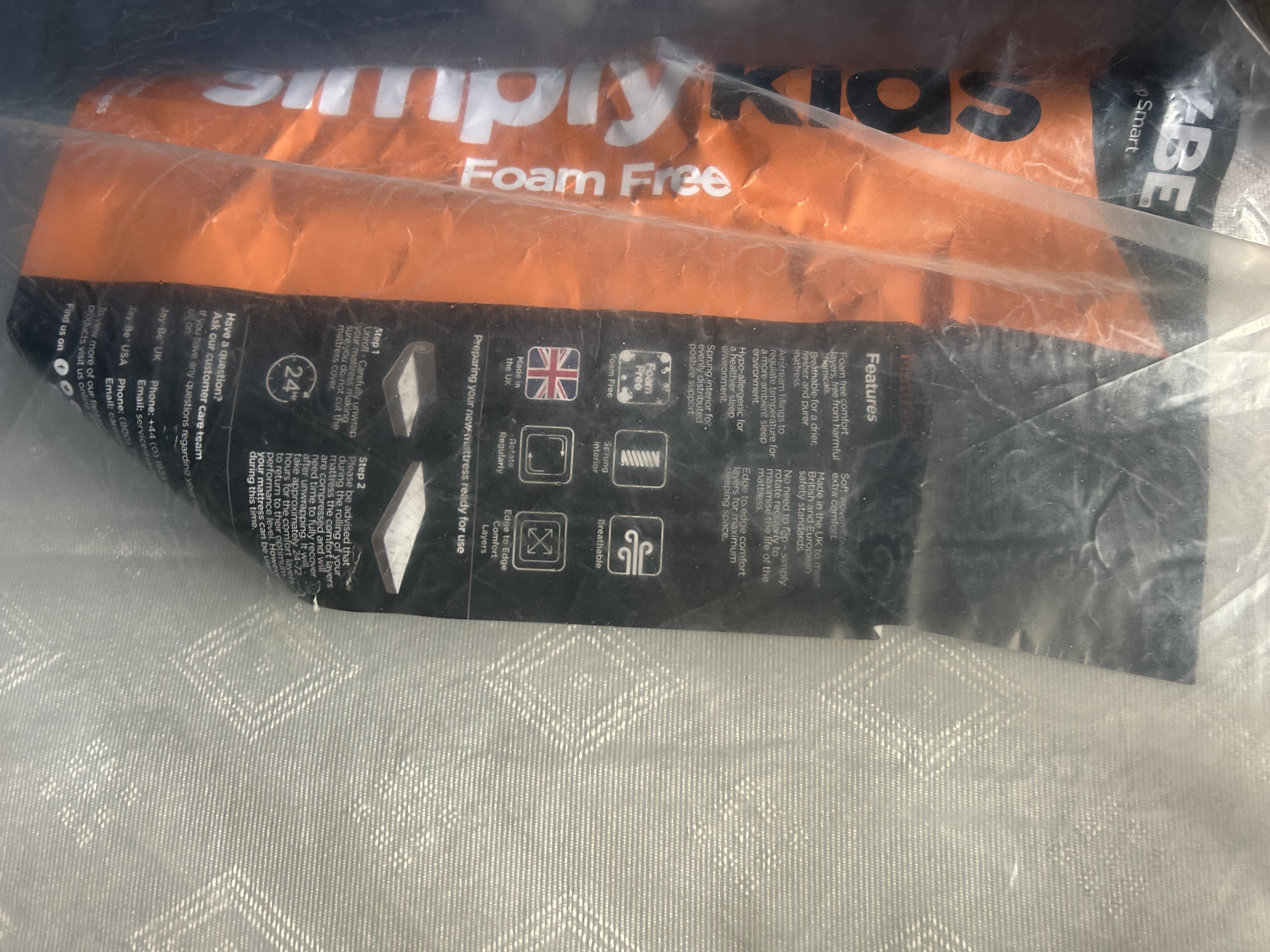A JAY-BE Simply Kids children’s mattress, presented in its original, sealed clear plastic packaging. The mattress features a white, possibly textured or quilted surface, with a prominent orange section visible underneath. It is explicitly labeled ‘Foam Free’ and ‘Made in UK’. Key features highlighted on the packaging include being breathable, anti-allergy, water resistant, having a removable and washable cover, and being safe from harmful chemicals. Instructions for preparing the new mattress for use are also visible on the packaging.