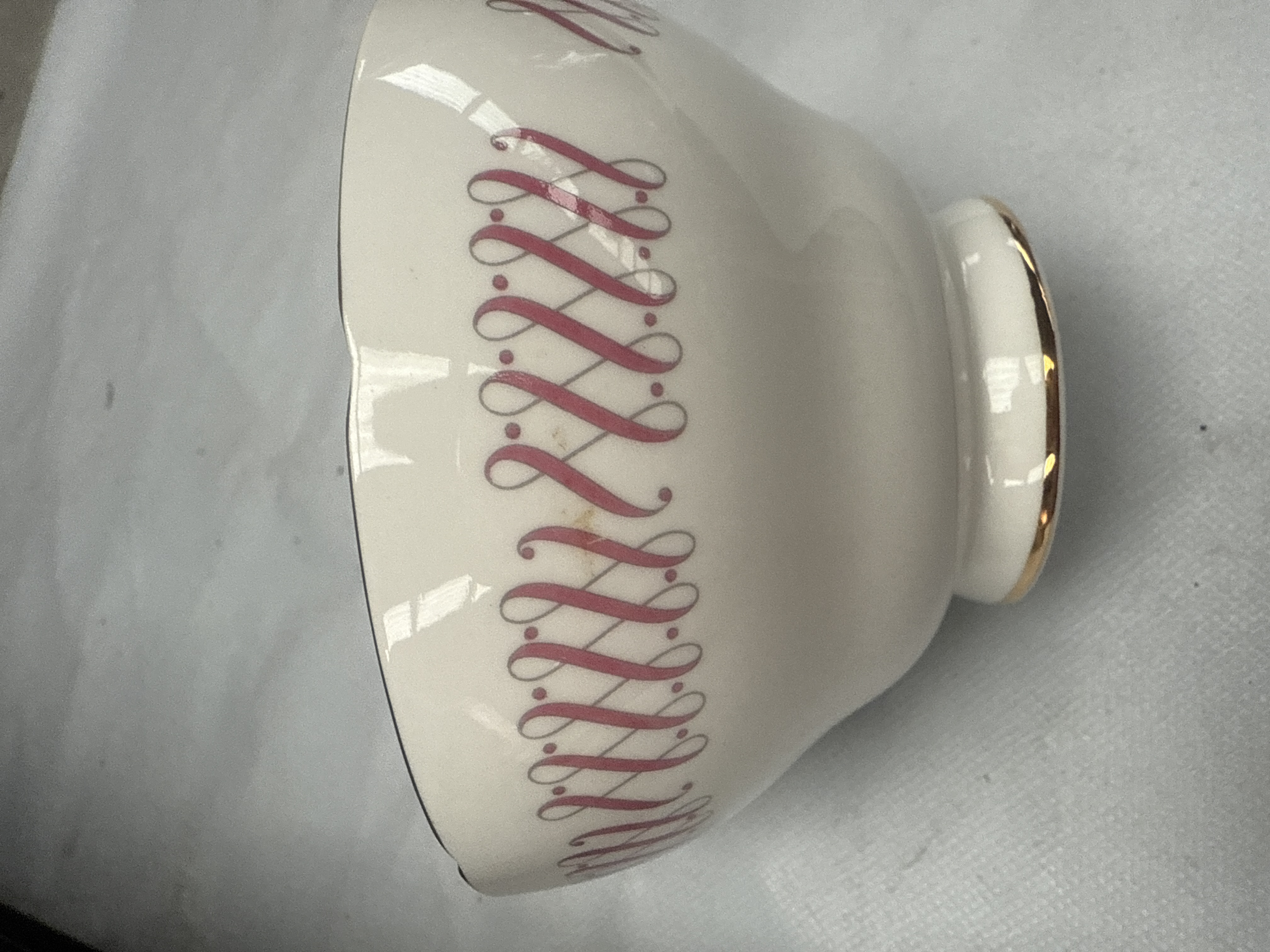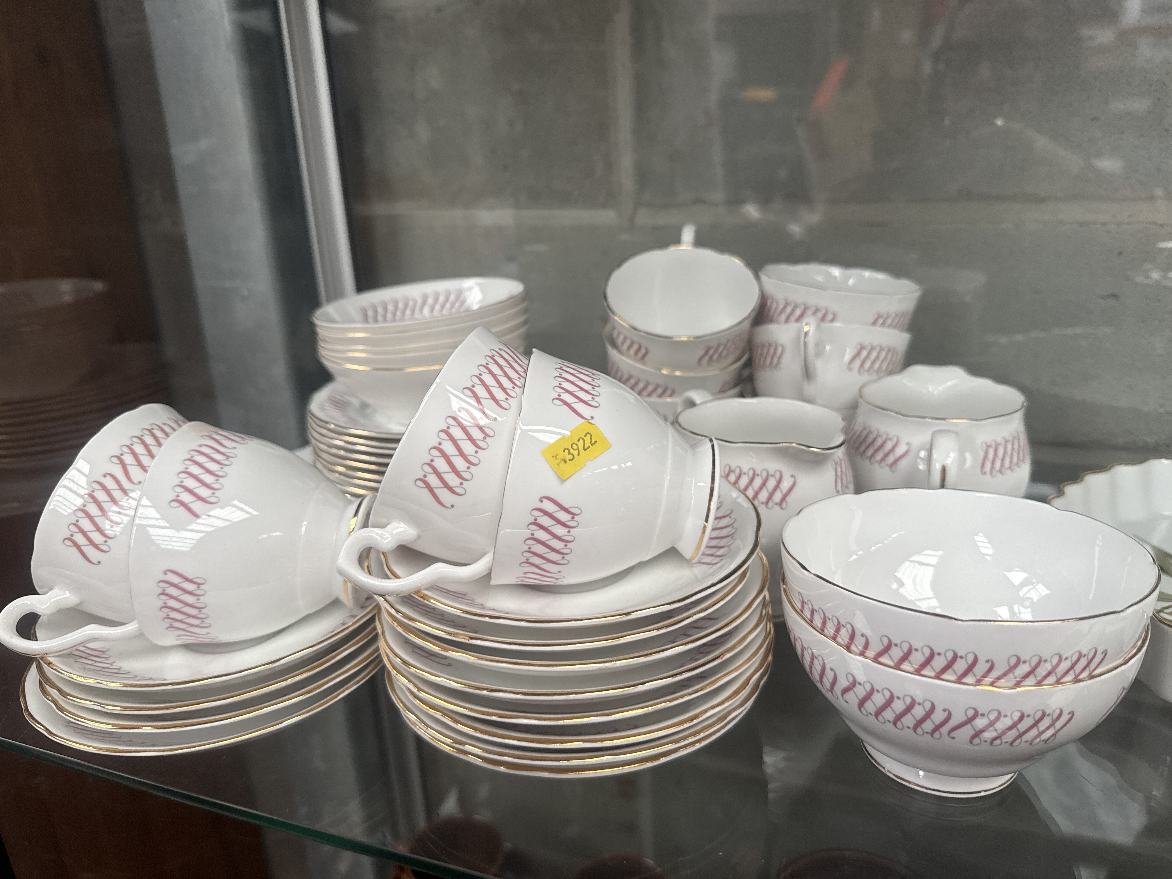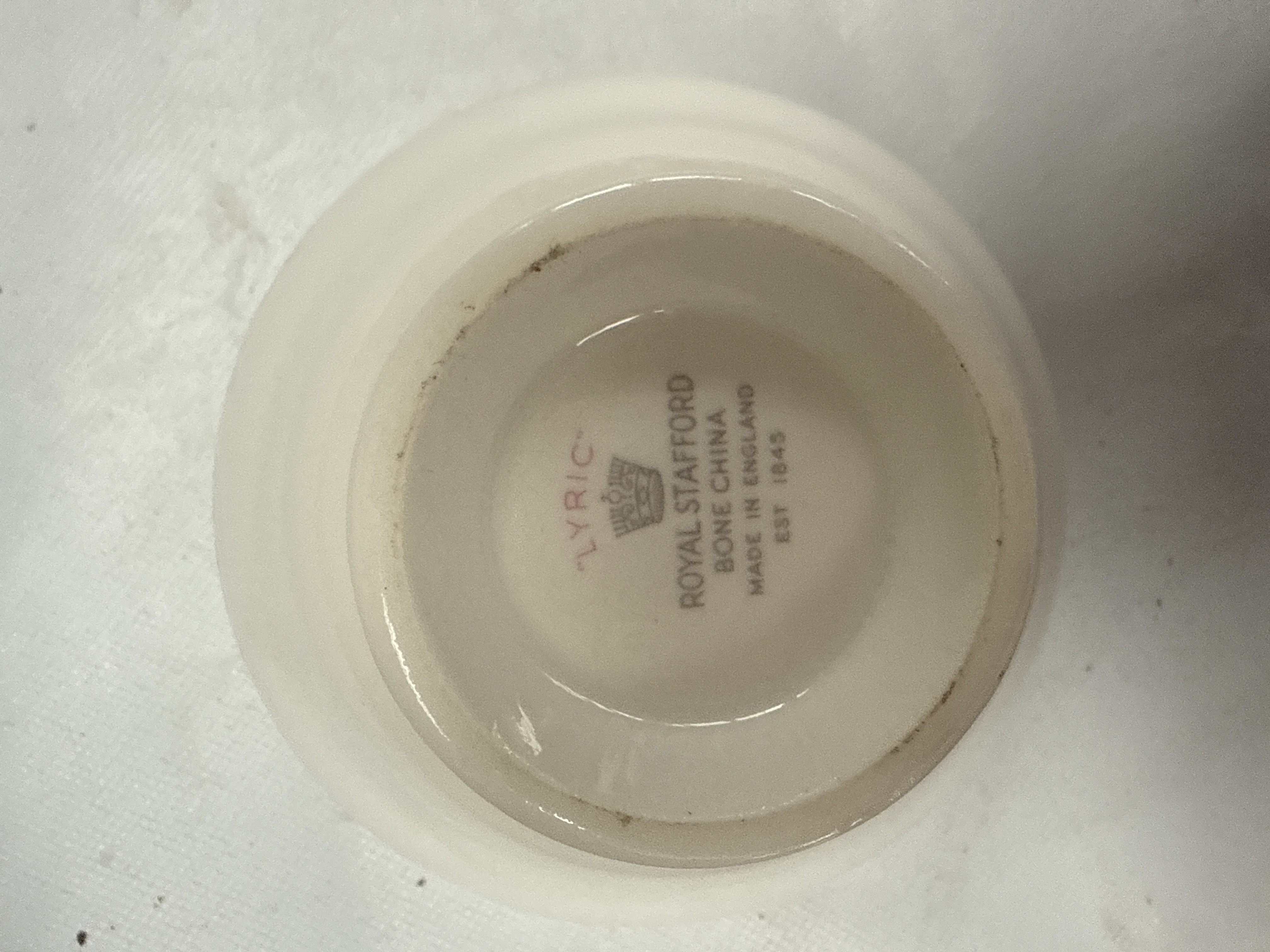 A partial set of Royal Stafford ‘Lyric’ pattern bone china dinnerware or teaware, comprising cups, saucers, small bowls, and two creamers/sugar bowls. Each piece is adorned with a repeating pink ribbon-like motif and gold-colored rims. A visible backstamp on one piece reads “LYRIC” (above a crown symbol), “ROYAL STAFFORD”, “BONE CHINA”, “MADE IN ENGLAND”, and “EST 1845”. One cup also bears a yellow sticker with “£39.22”.