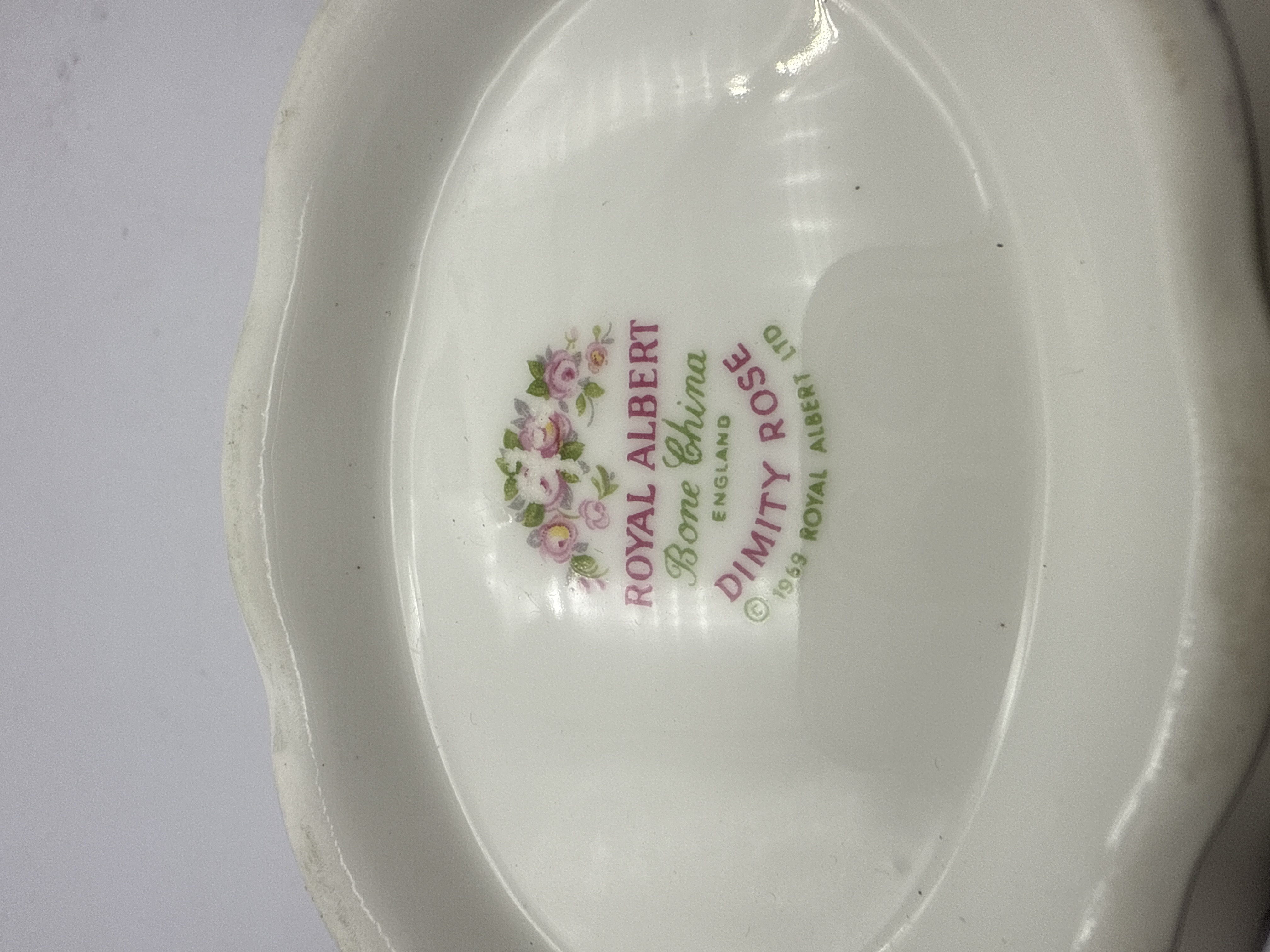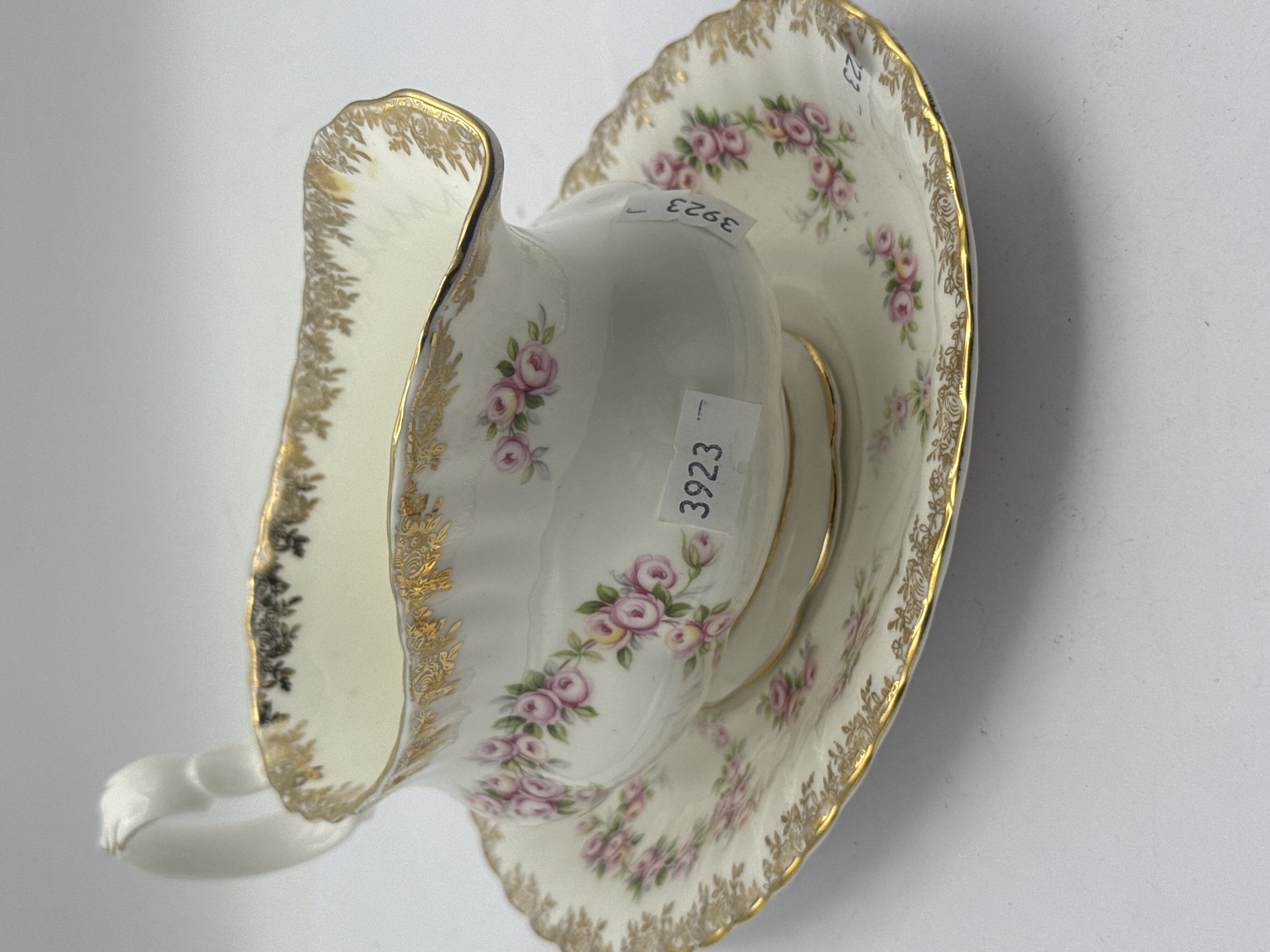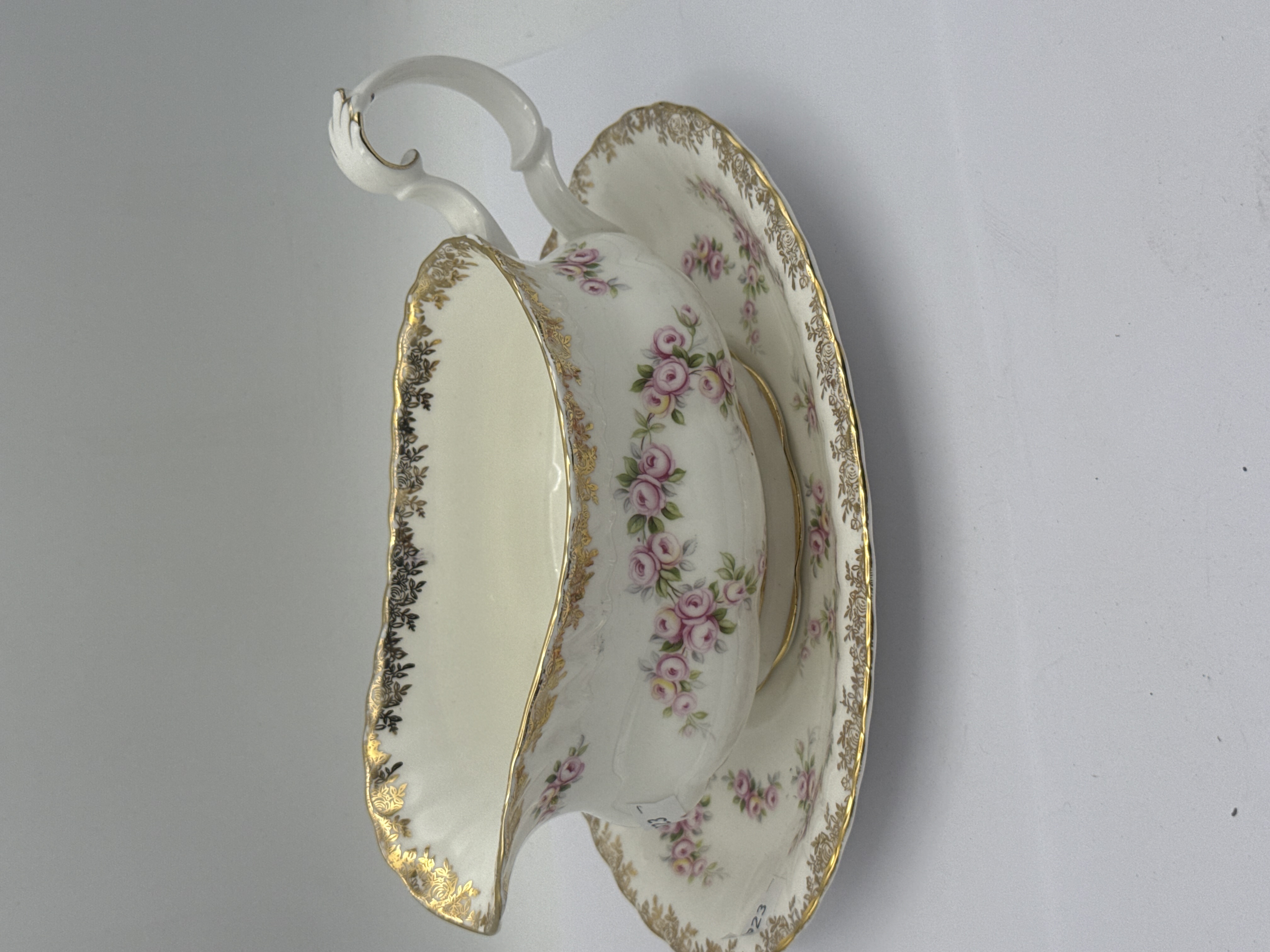 A Royal Albert Dimity Rose bone china gravy boat with integral underplate. Crafted in England, this piece features an ornate, traditional style. The decoration consists of small pink roses and green foliage, extensively trimmed with gold gilding on the scalloped rims, handle, and base. A dark decorative band further details the interior rim. The underside is clearly marked ‘ROYAL ALBERT Bone China ENGLAND DIMITY ROSE © 1969 ROYAL ALBERT LTD,’ indicating production from 1969 or later.