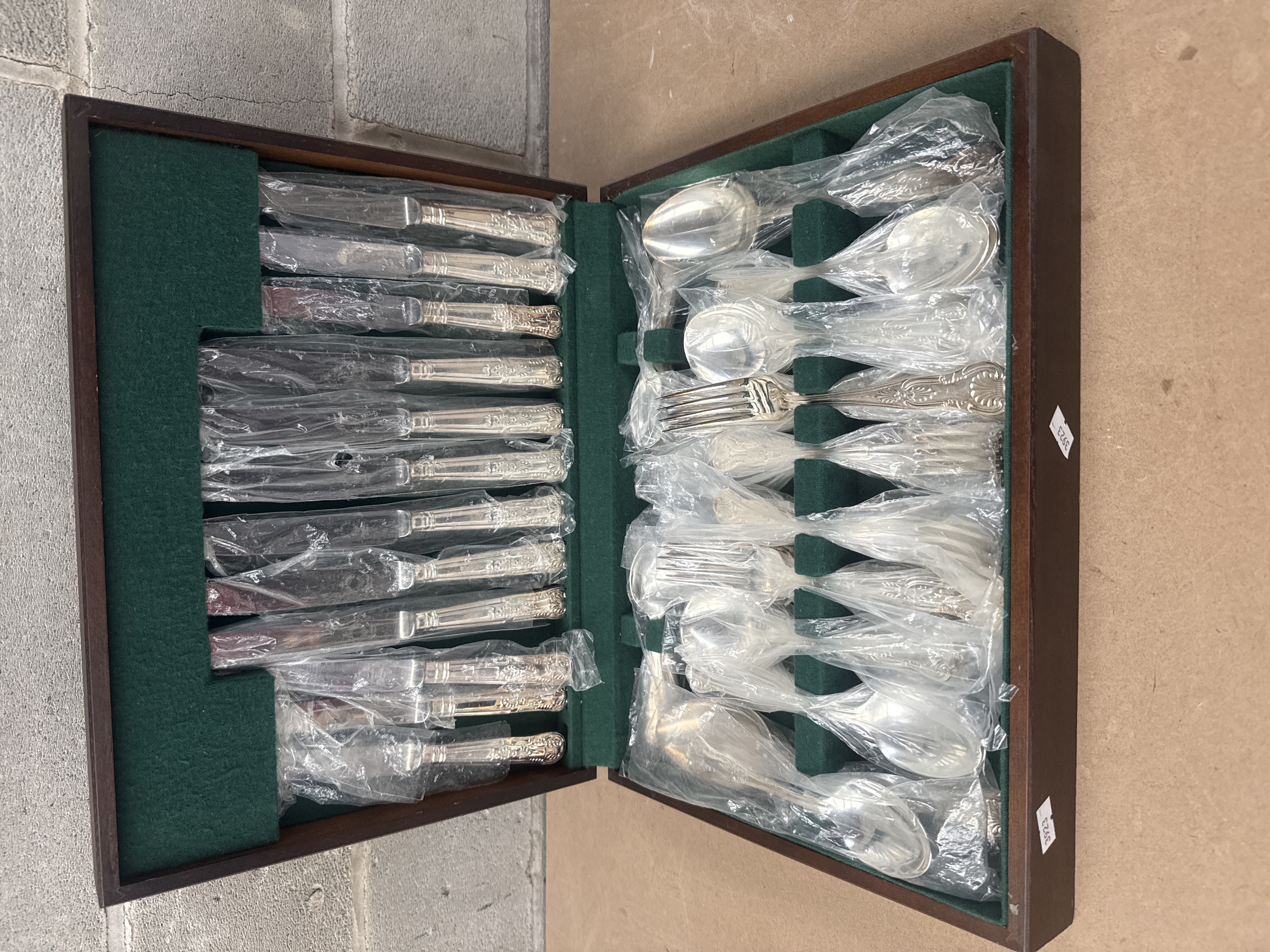 A comprehensive cased flatware set by RANSAT SHEFFIELD ENGLAND. The set is housed within a dark brown wooden box lined with green felt and comprises a substantial quantity of polished metal cutlery. The pieces feature decorative, ornate handles, with most individually wrapped in clear plastic sleeves.