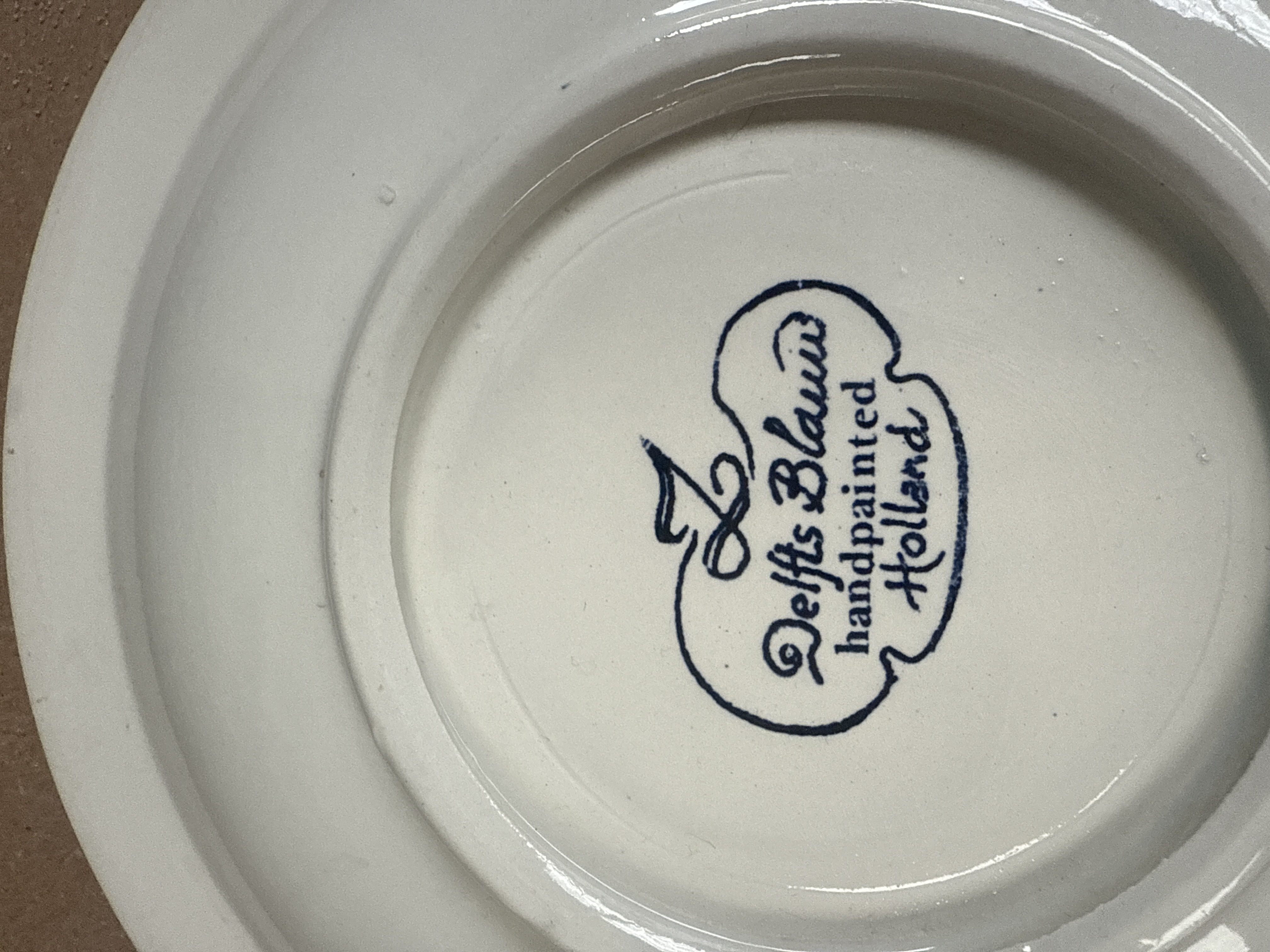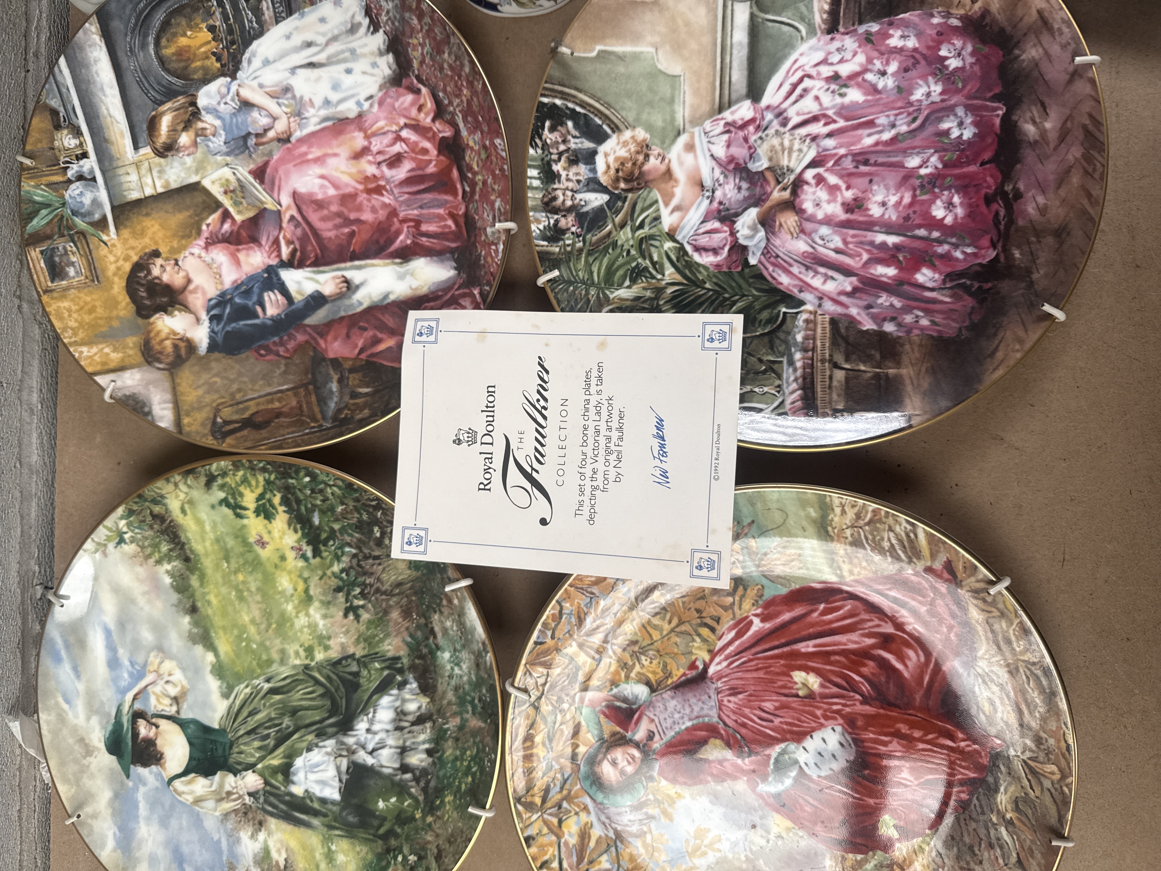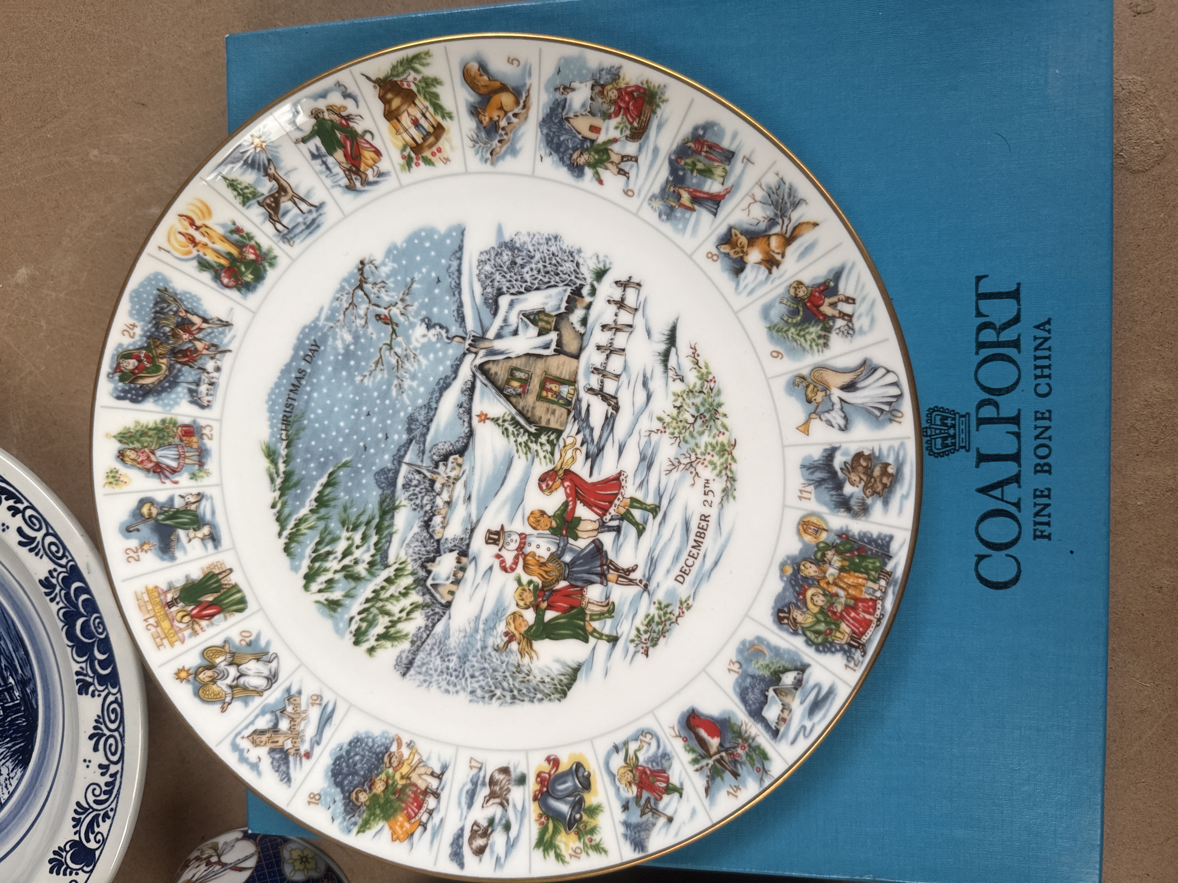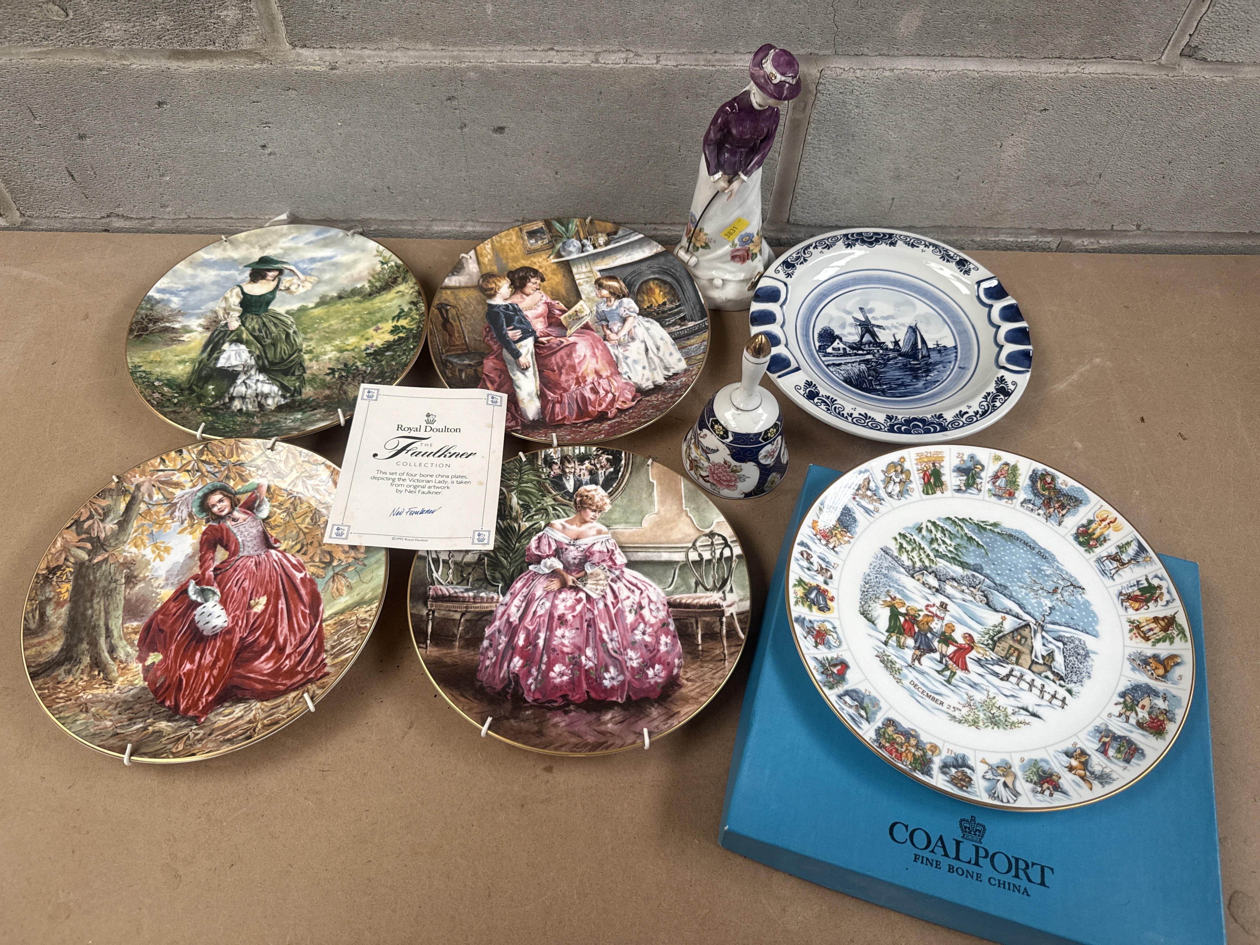 This lot comprises a collection of decorative ceramic items. It includes four Royal Doulton bone china collector plates from “The Faulkner Collection,” dated 1993, depicting Victorian fashion scenes of women in period dresses, accompanied by their original descriptive insert. Also present is a Coalport Fine Bone China Christmas-themed advent plate, numbered 1-24, showcasing a snowy winter village scene. A separate blue and white decorative plate, marked on the reverse “Z Delfts Blauw handpainted Holland,” features a traditional Dutch landscape with windmills, accompanied by a coordinating small ceramic bell. Completing the assortment is a ceramic figurine of a lady in a purple and white Victorian-style gown and hat.