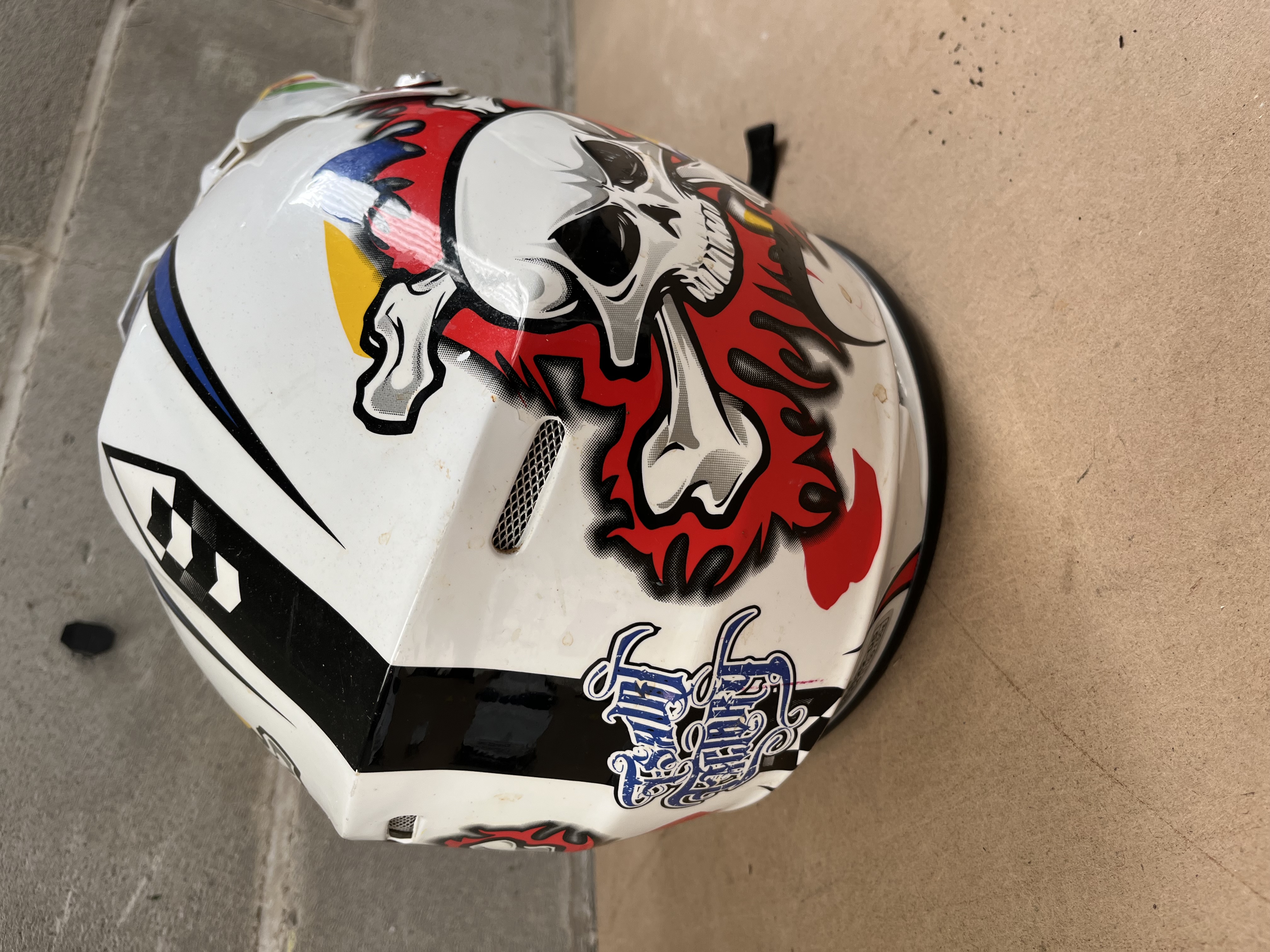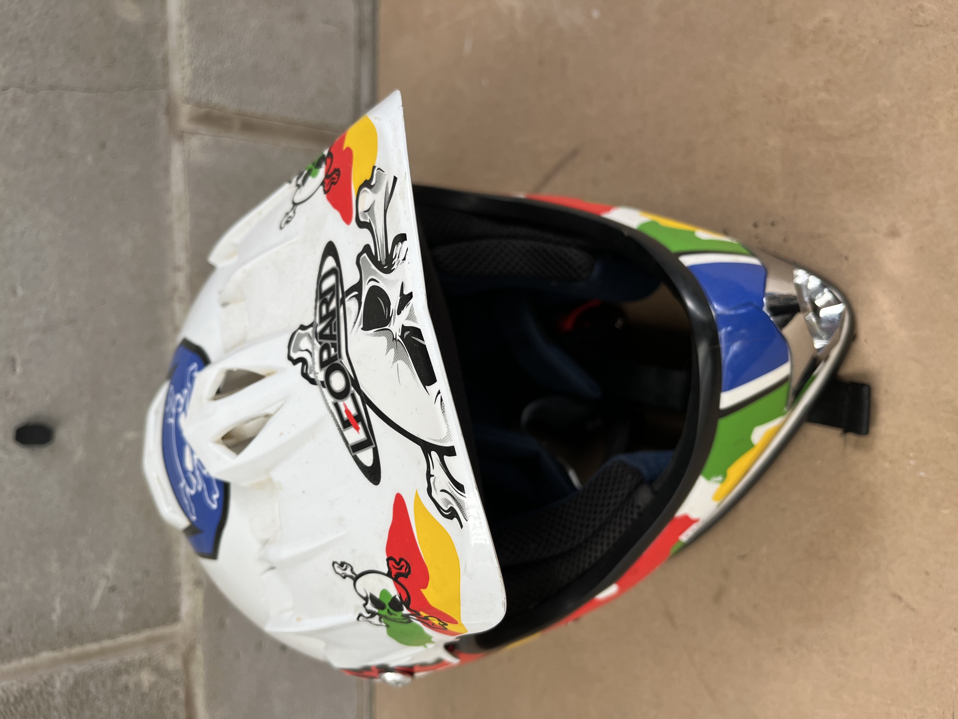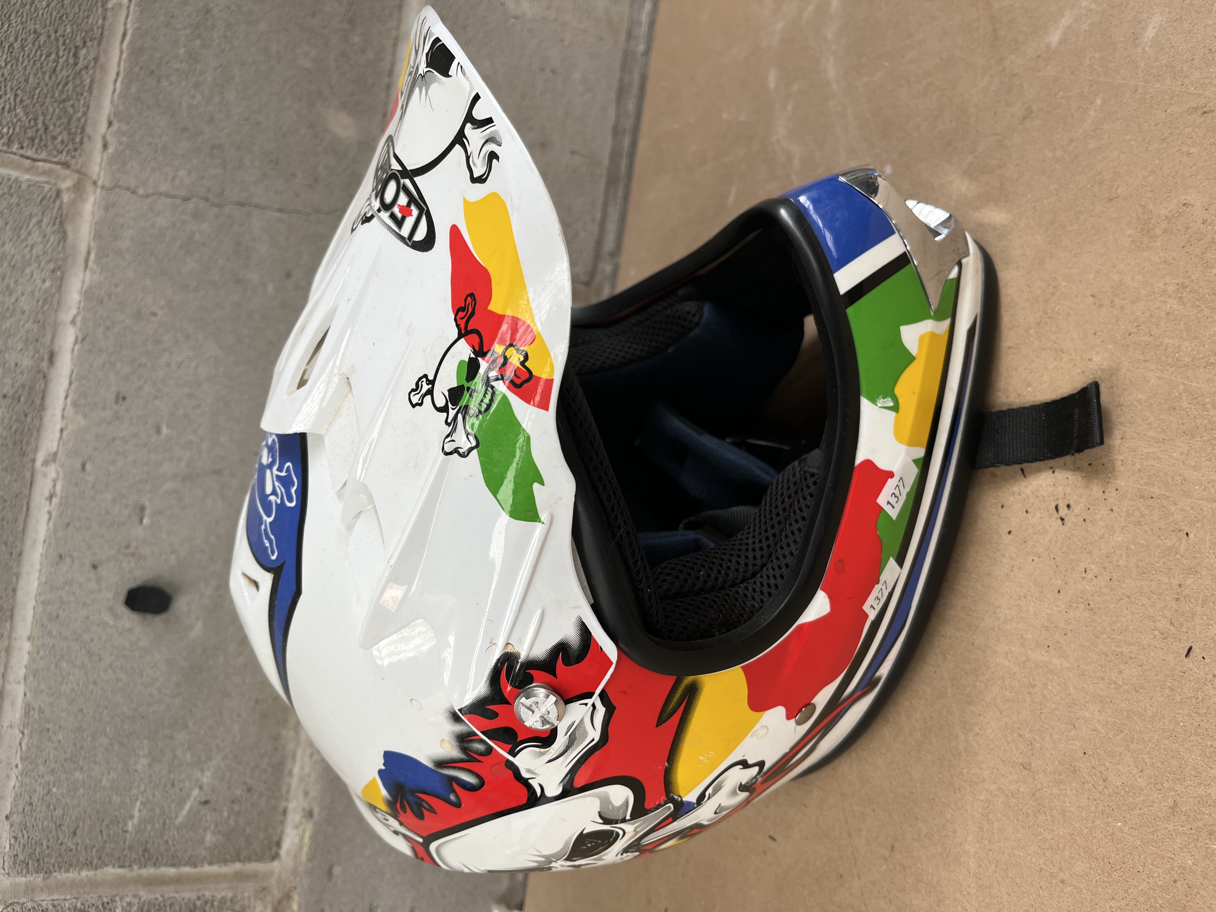 A LEOPARD off-road/motocross full-face helmet, featuring a distinctive skull bones graphic design. The helmet has a white composite shell adorned with an aggressive, multi-color graphic design incorporating skulls, crossbones, flames, and abstract patterns in red, yellow, green, and blue. ‘LEOPARD’ is prominently displayed on the front, and a stylized ‘SPORT CENTURY’ logo with skull and crossbones motifs is visible on the rear. A small number ‘1377’ is present on the lower left side. The interior padding and chin strap appear intact.