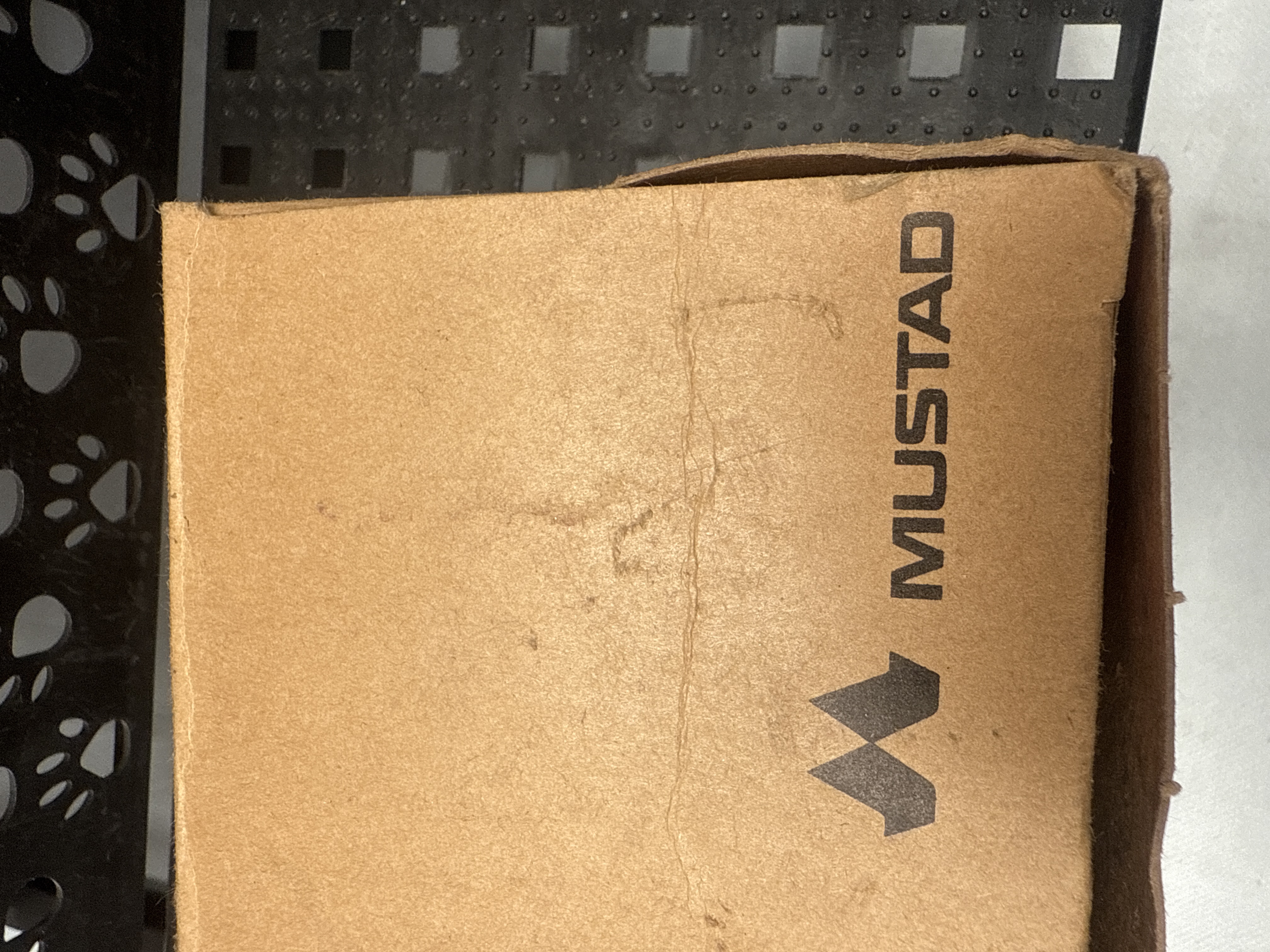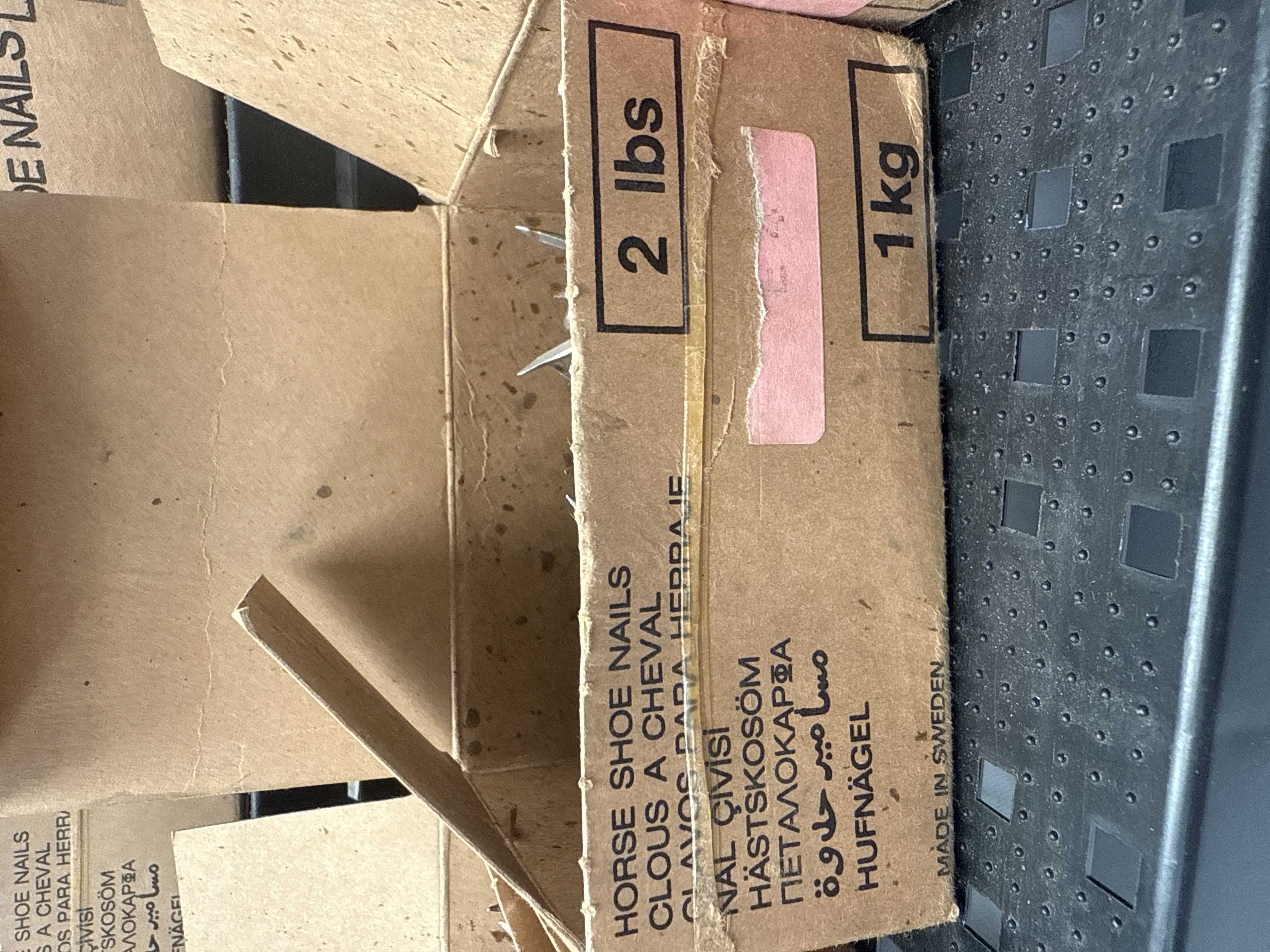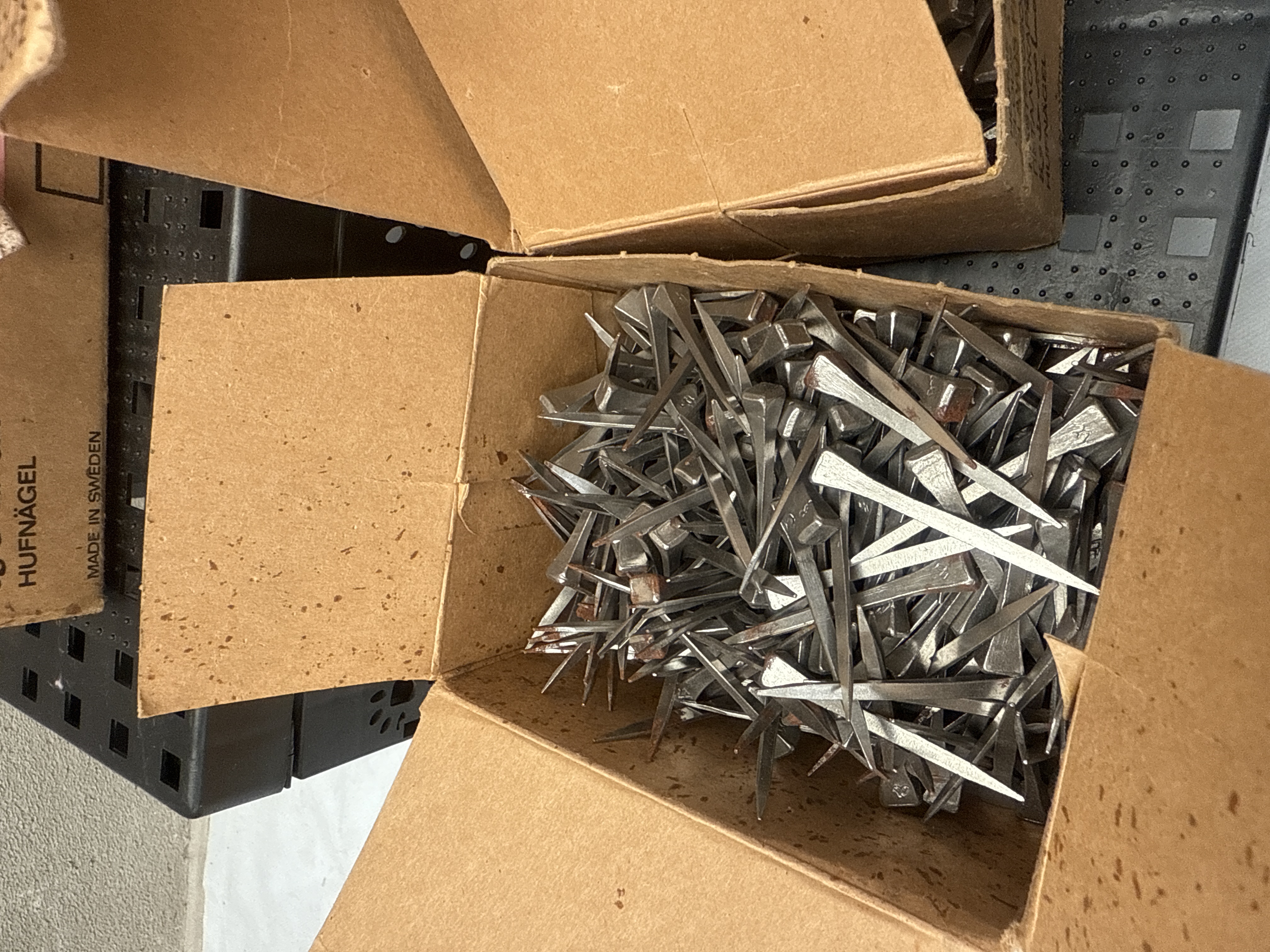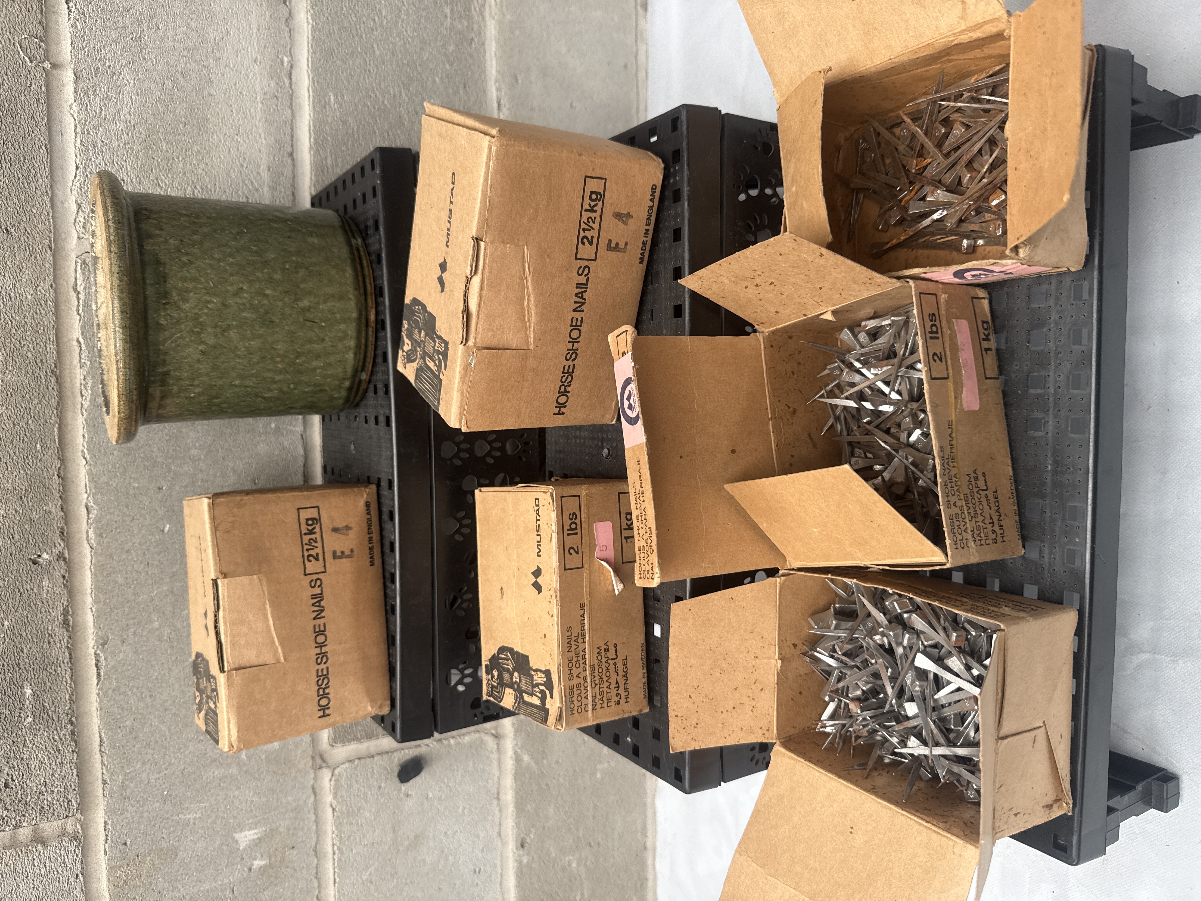 A group of five cardboard boxes containing a quantity of new or unused grey metallic horseshoe nails by Mustad. The boxes are labeled ‘MUSTAD’ and ‘HORSE SHOE NAILS’ with multilingual translations including French (CLOUS A CHEVAL), Spanish (CLAVOS PARA HERRADURA), Turkish (NAL ÇIVISI), Swedish (HÄSTSKOSÖM), Greek (ΠΕΤΑΛΟΚΑΡΦΑ), Arabic (مسامير حلوة), and German/Dutch (HUFNÄGEL). Weight indicators such as ‘2½ kg’, ‘2 lbs’, and ‘1 kg’ are visible, along with the code ‘E 4’. Some boxes are marked ‘MADE IN ENGLAND’, while others state ‘MADE IN SWEDEN’. Accompanying these items is a single, unadorned, dark green-glazed ceramic or stoneware pot.
