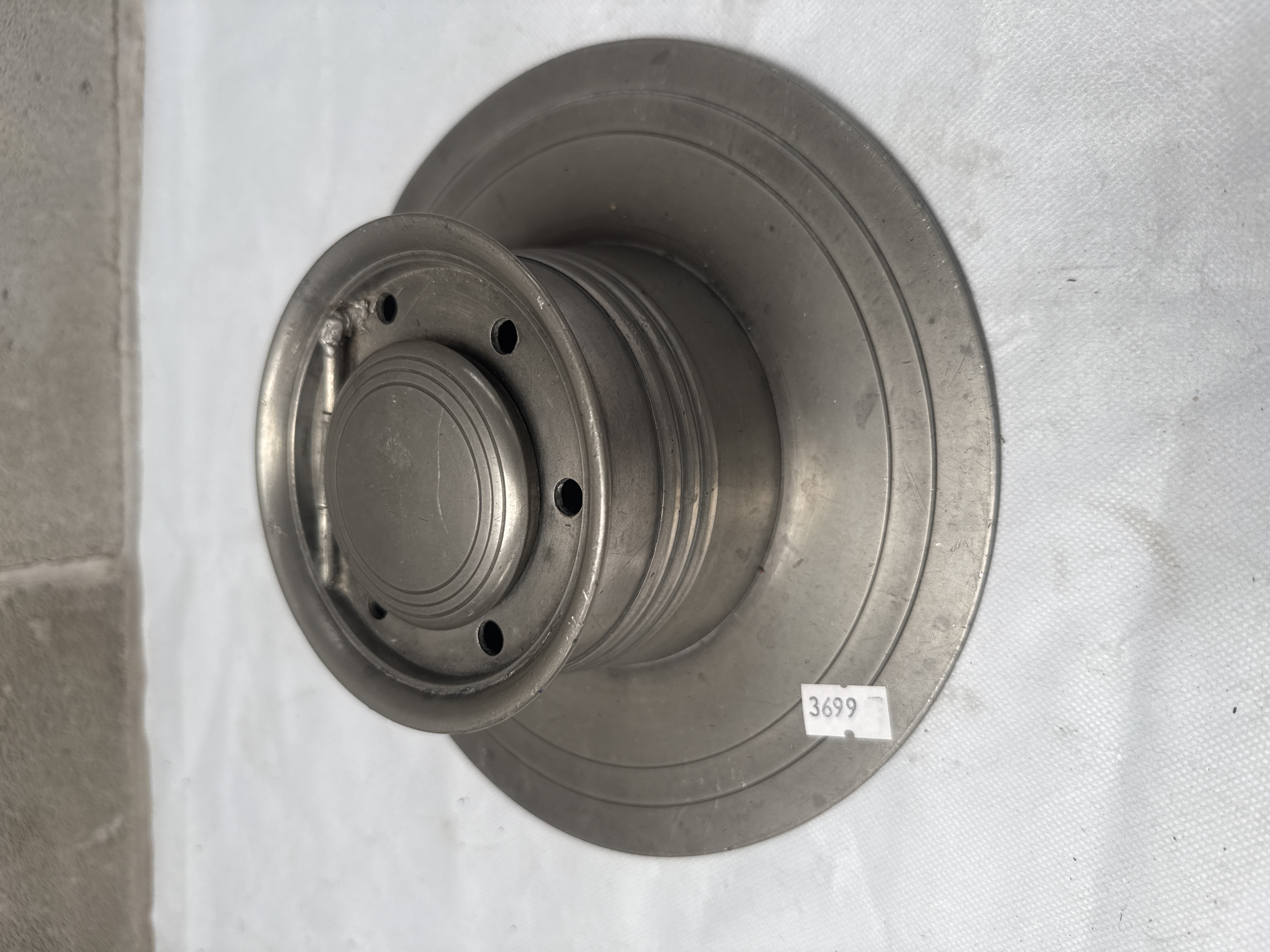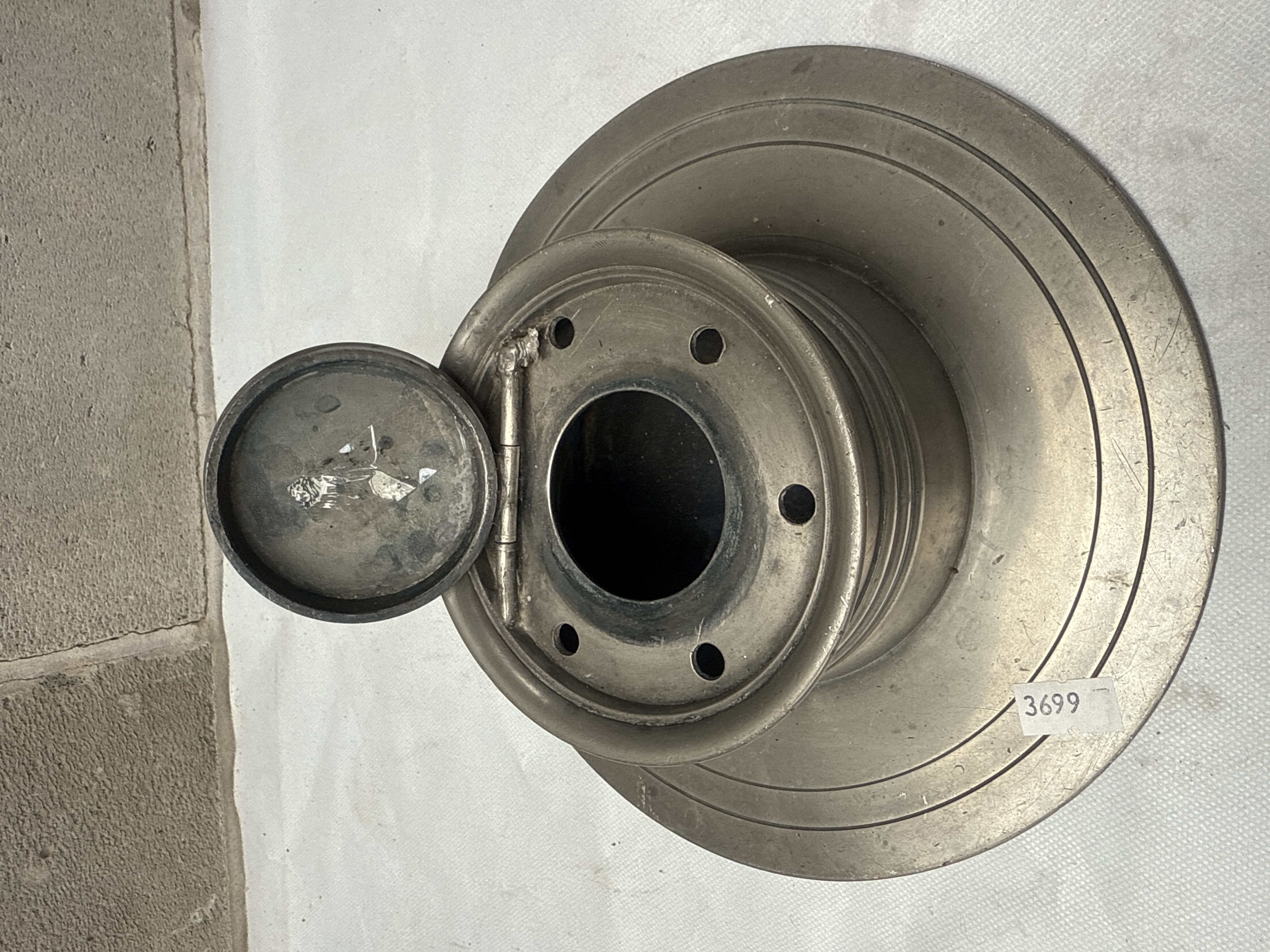An 18th Century pewter Ink Well. This circular object features a broad, flat base supporting a central cylindrical reservoir with concentric rings. It is topped by a hinged, domed lid that opens to a deep cavity. Six small, circular holes are evenly spaced around the rim of the central reservoir. A white rectangular label bearing the number ‘3699’ is affixed to the base.