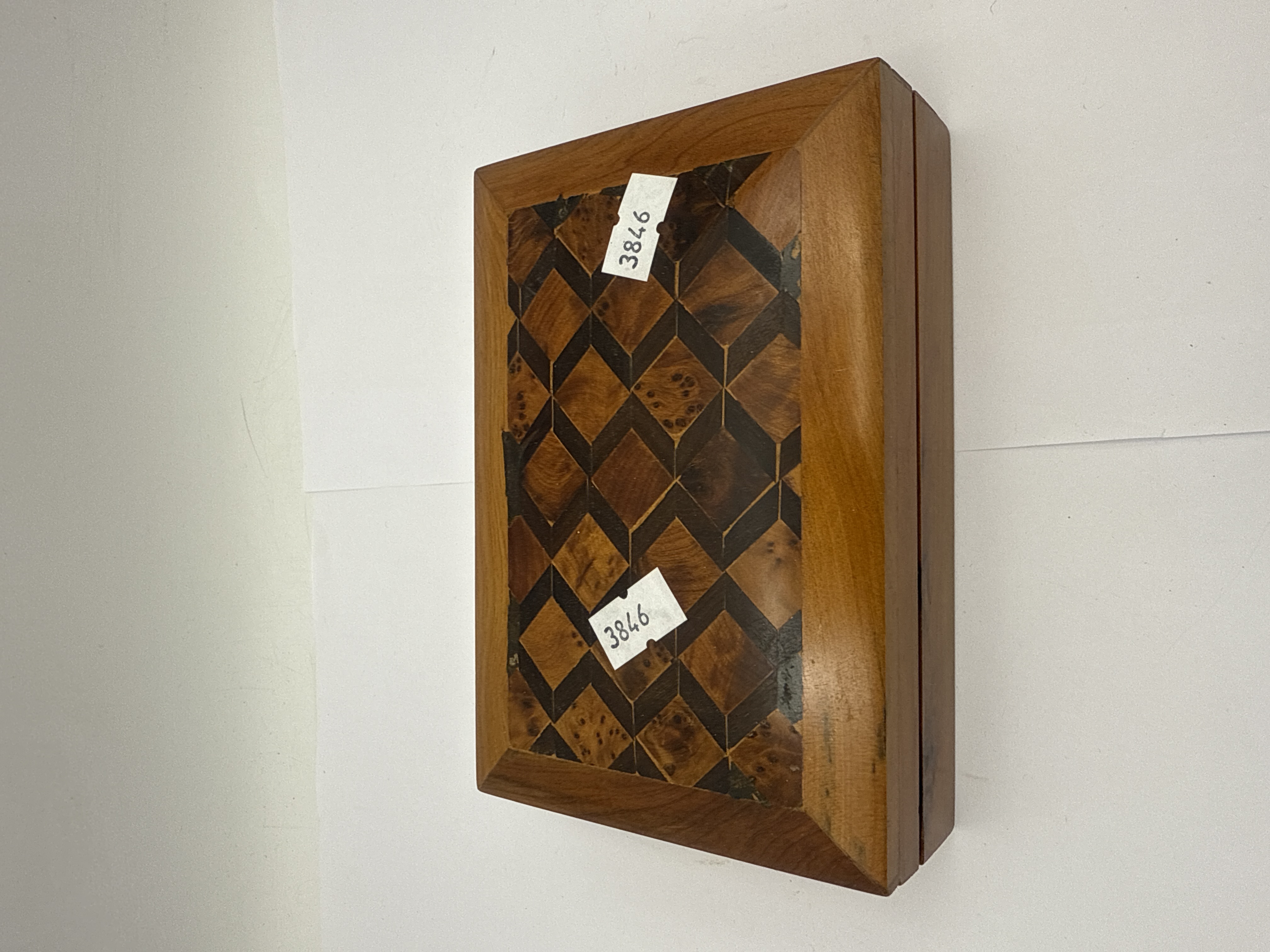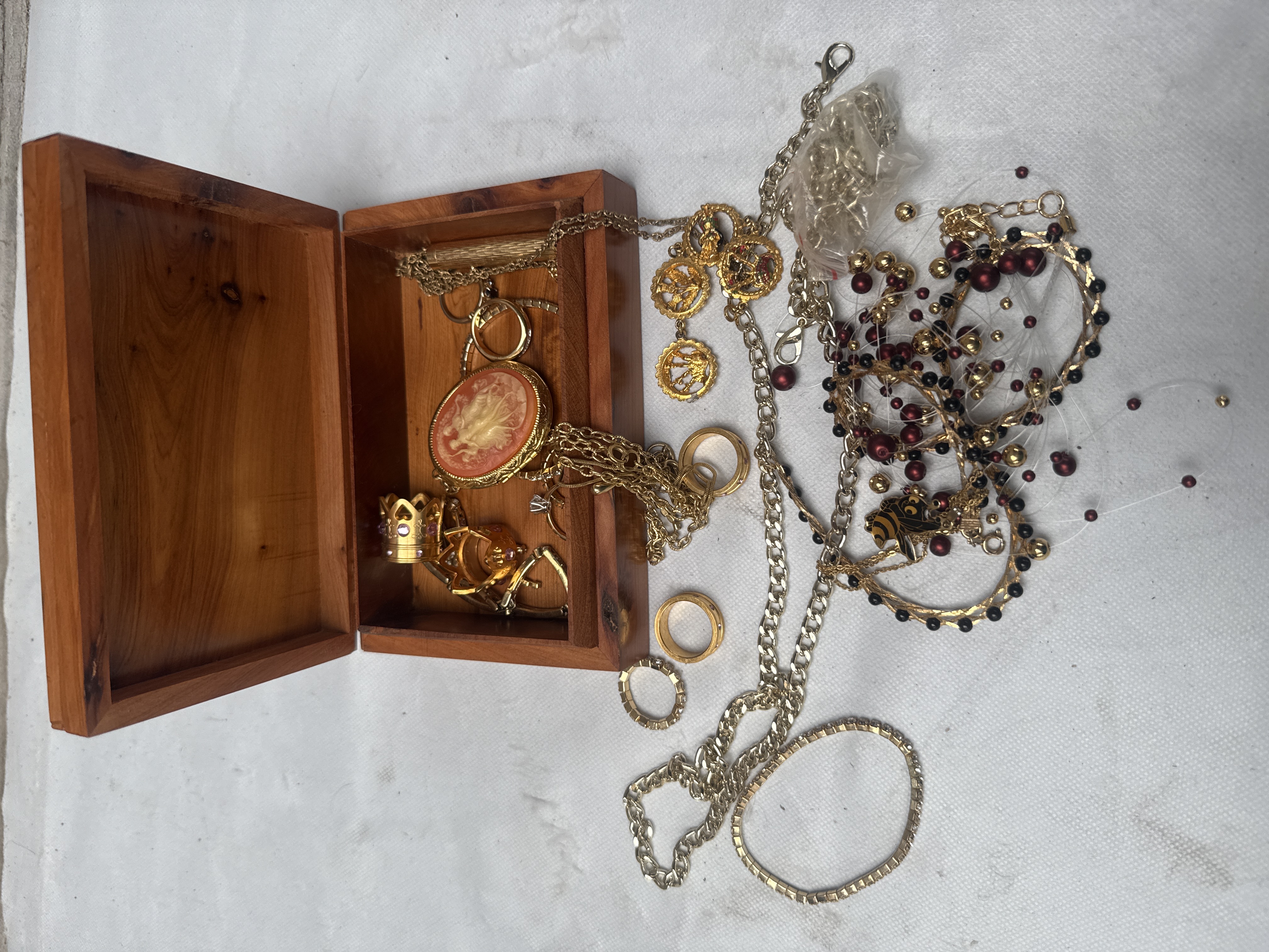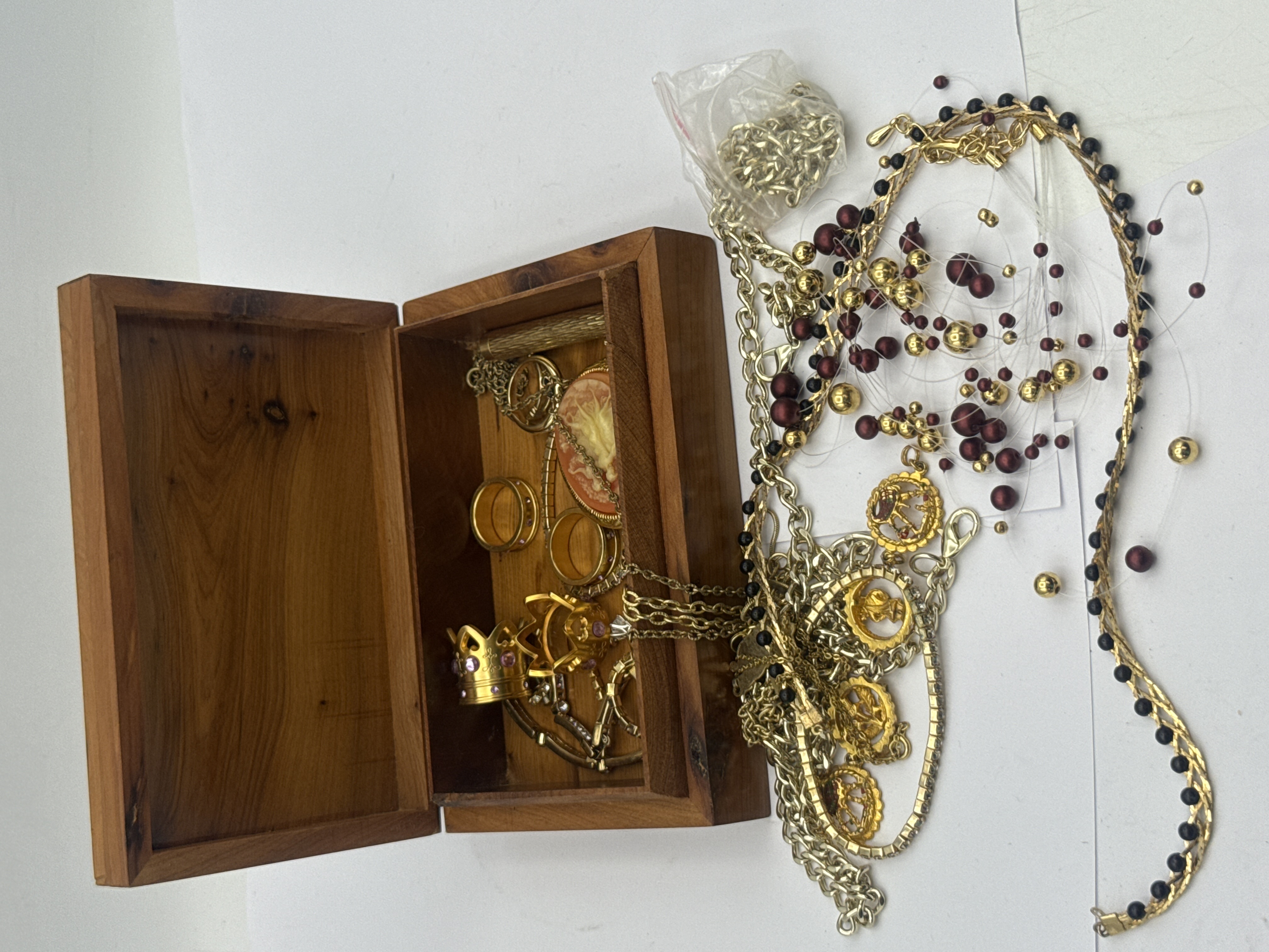 A collection of vintage gold-filled and gold-toned jewelry, presented with a rectangular wooden box. The box features a lid adorned with a geometric inlay composed of various wood types and is marked with two white stickers displaying the number “3846.” The assorted collection of jewelry is primarily fashioned from yellow-toned metal, including chains, rings, earrings, bracelets, and pendants. Prominent items comprise a large cameo-style pendant depicting a female profile, along with multiple beaded strands featuring red, black, and gold-toned beads.