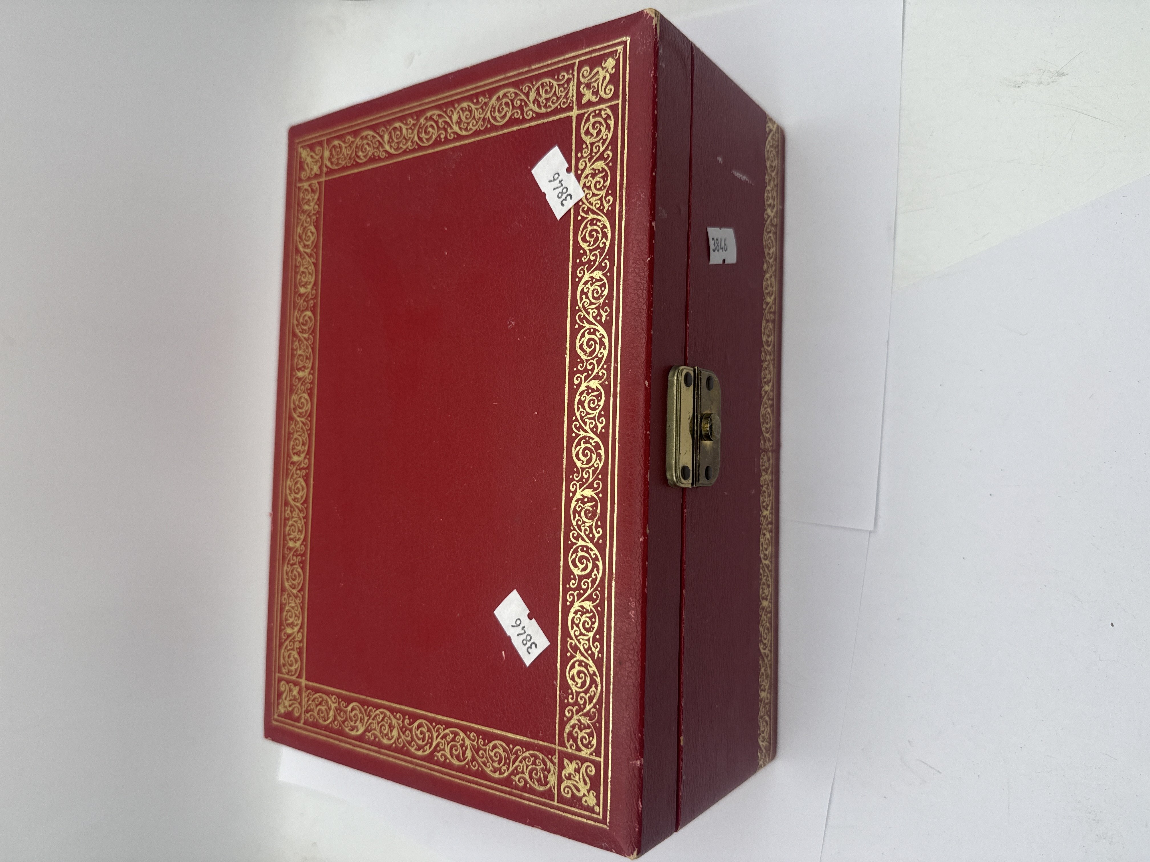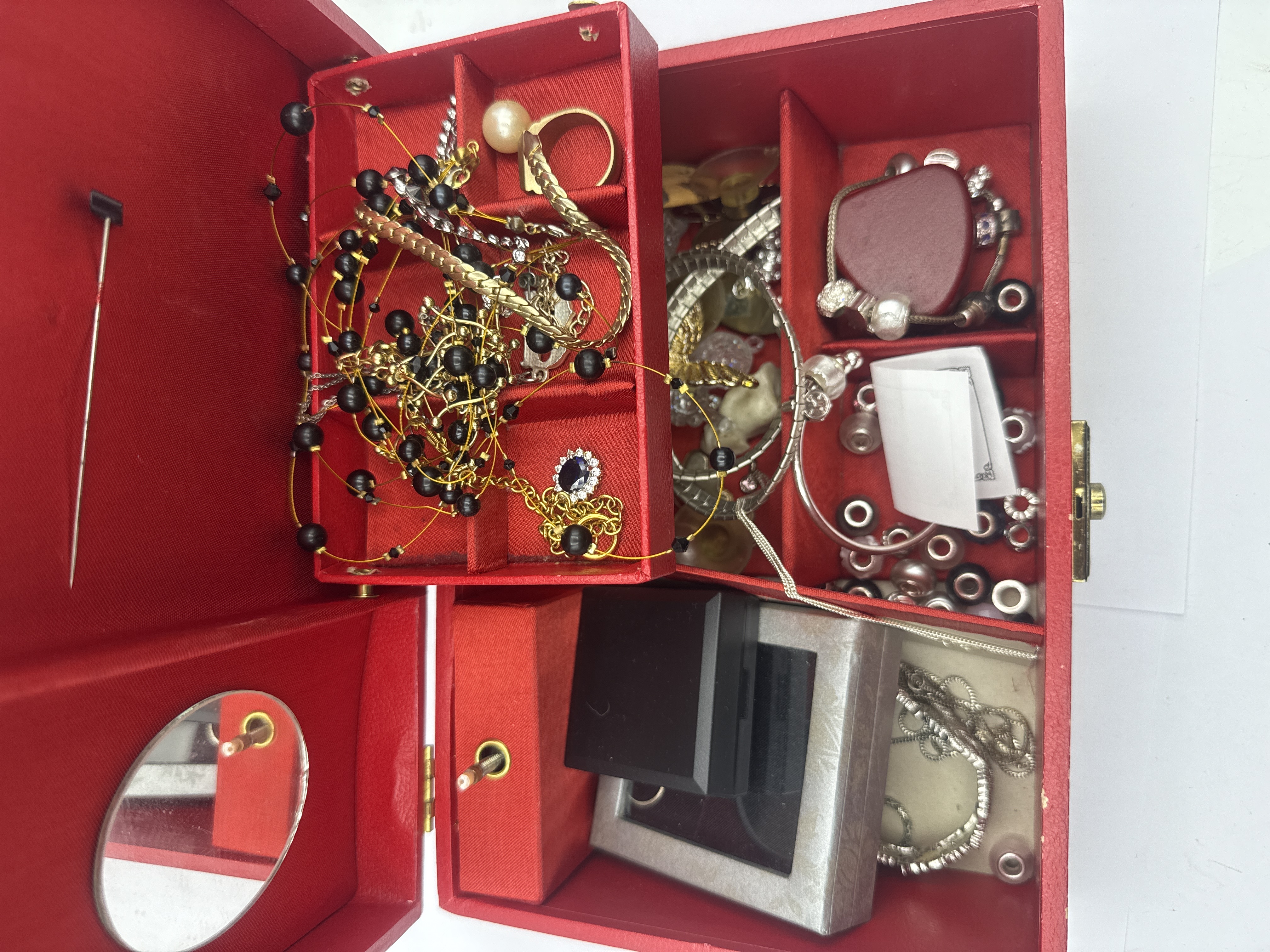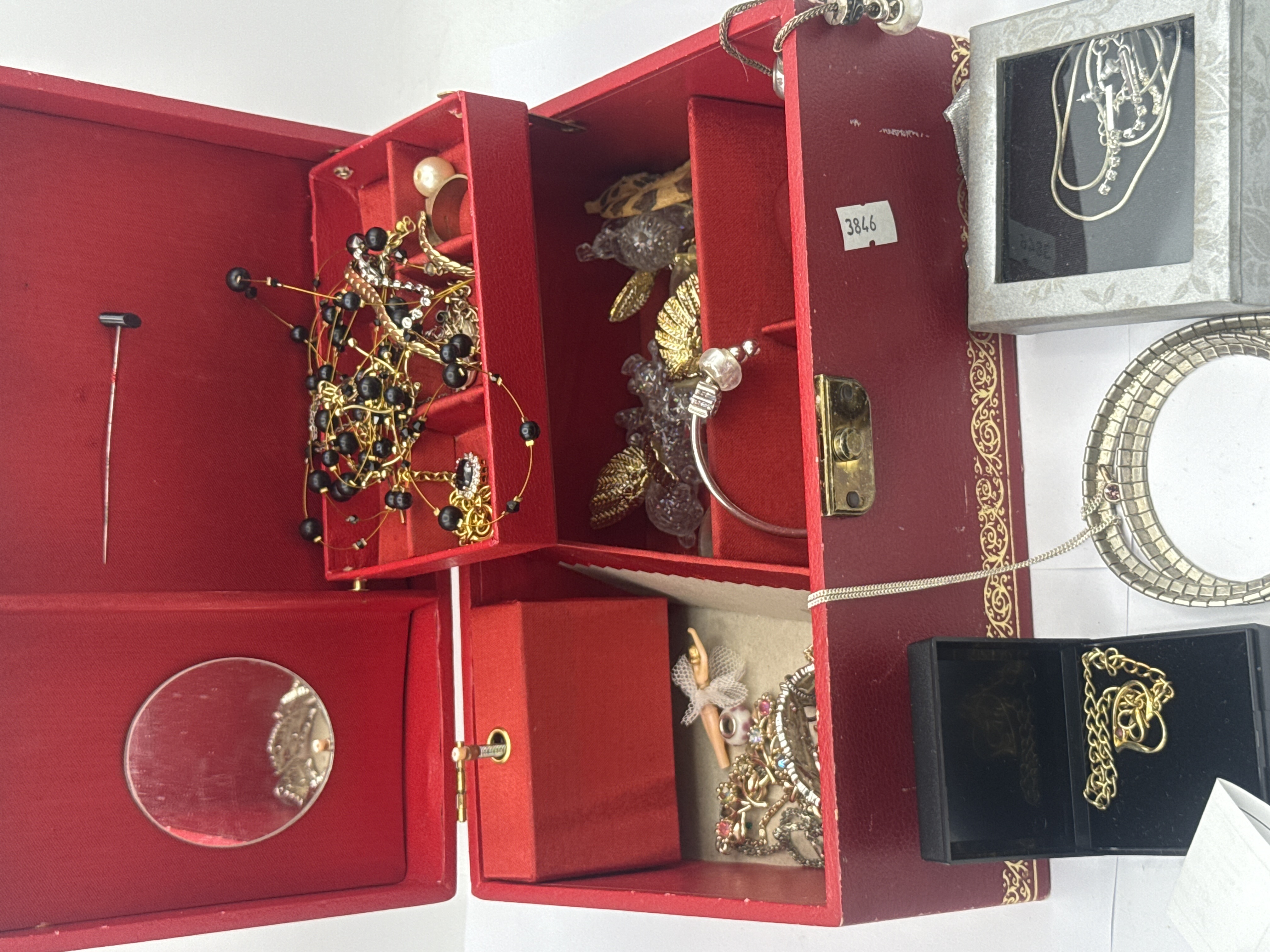 This lot features a multi-tiered, rectangular jewelry box crafted from a red textured material, likely faux leather, adorned with gilded foliate borders and secured by a brass-tone clasp. The interior is lined with red fabric and features a top lid with a small circular mirror, an upper pull-out tray, and a lower main compartment. The box contains an extensive assortment of costume jewelry, including various necklaces, bracelets (bangle, chain, stretch), earrings, and rings. The jewelry comprises a mix of gold-tone and silver-tone base metals, faux pearls, glass, plastic, and imitation gemstones in assorted colors. Also present are two smaller presentation boxes—one black and one silver-grey with a clear lid—each containing a piece of jewelry. Multiple white adhesive labels marked “3846” are visible on the exterior of the main box.