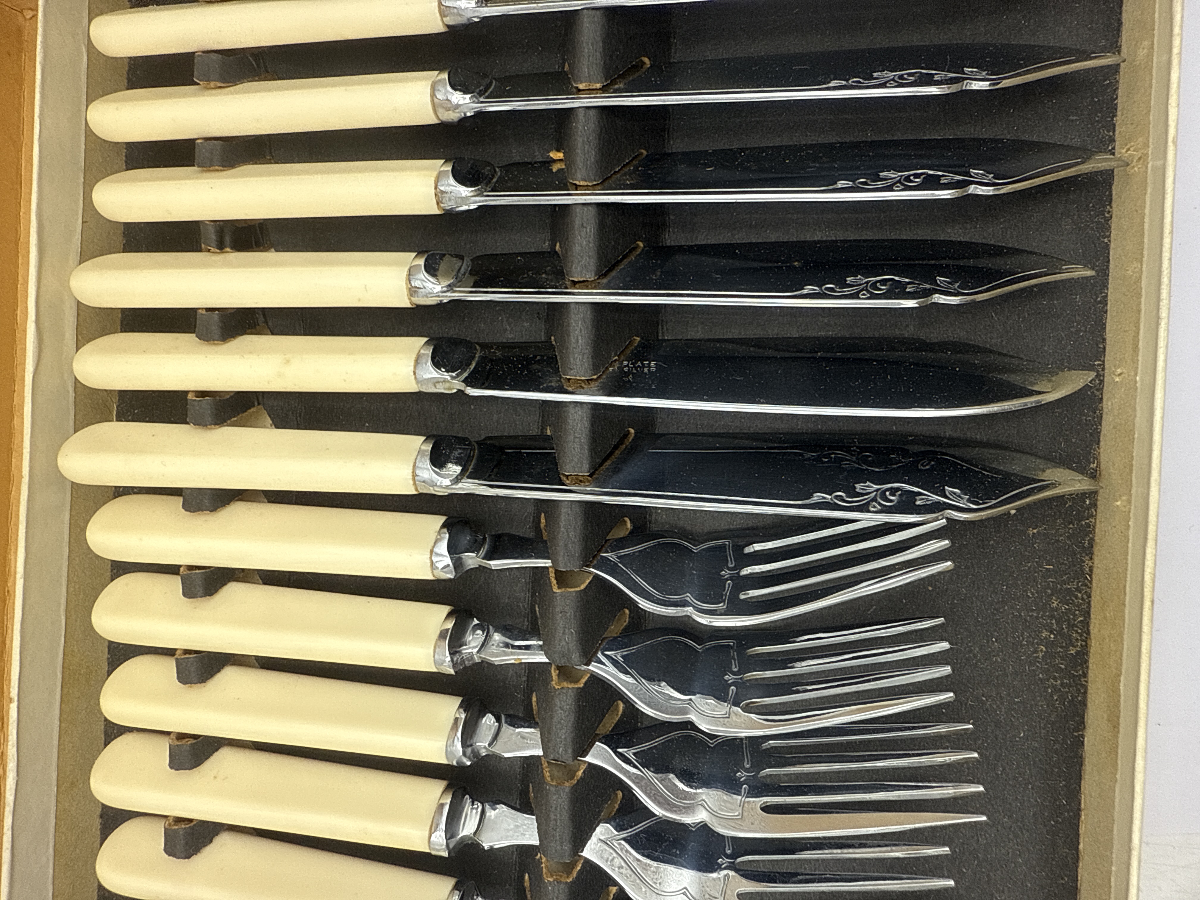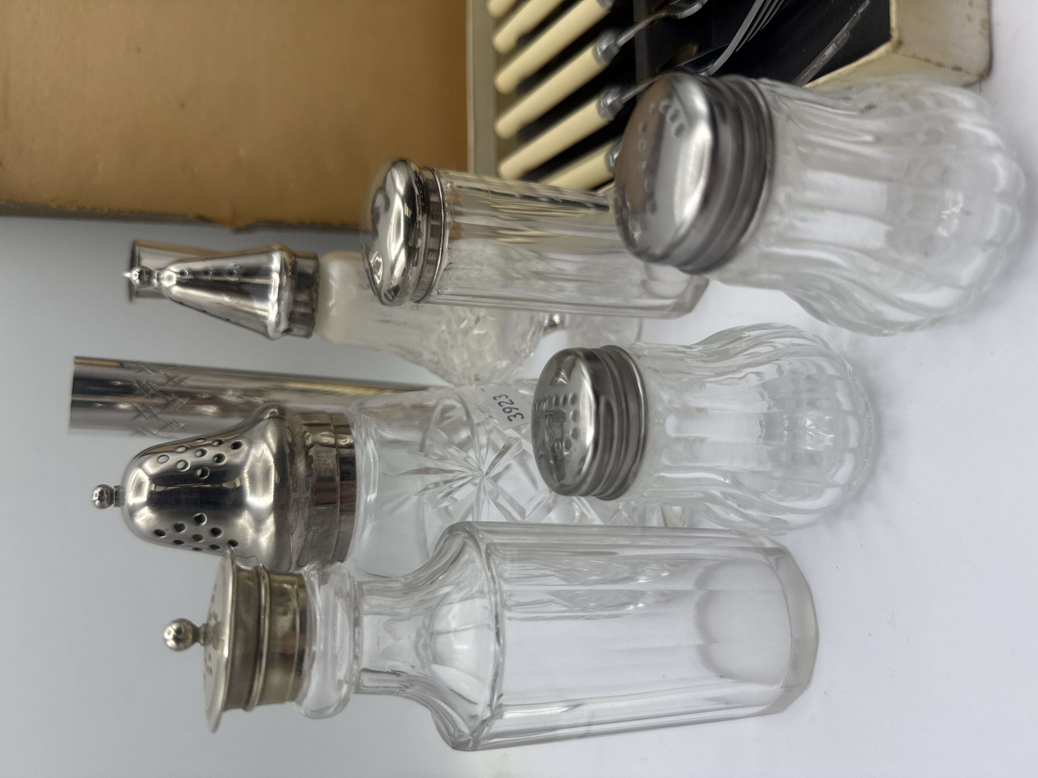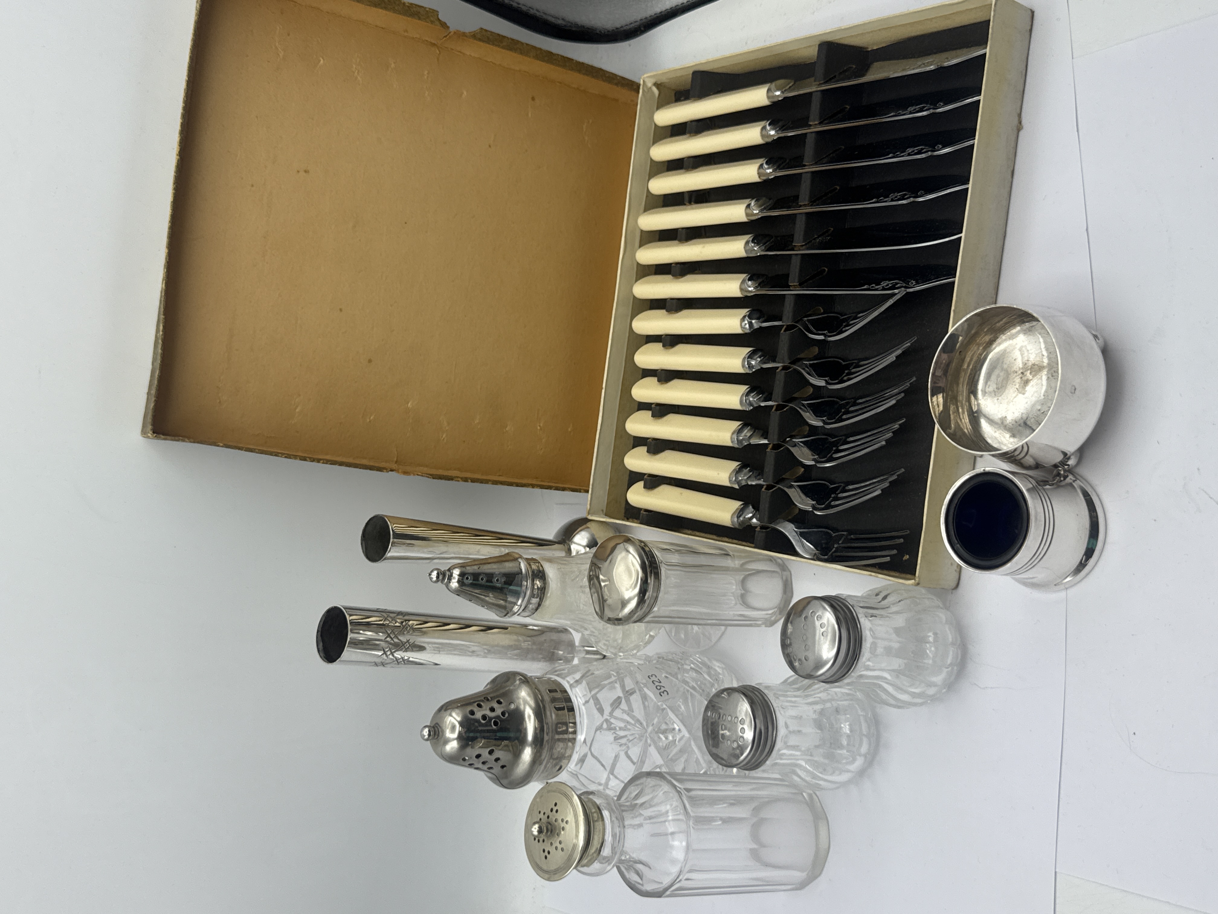 A boxed set of twelve (six knives, six forks) dessert or fish cutlery pieces, likely early to mid-20th century, featuring pale cream-colored composite handles with riveted construction and metal blades/tines, some blades bearing etched decoration. Also included is an assortment of clear glass condiment vessels, comprising various shakers and bottles with silver-colored metal tops, one prominent cut-glass shaker displaying a white sticker with the number ‘3923’. Further items consist of two tall, slender silver-colored metal flutes or vases, one with decorative engraving, and two small, footed silver-colored metal dishes, possibly salt cellars.