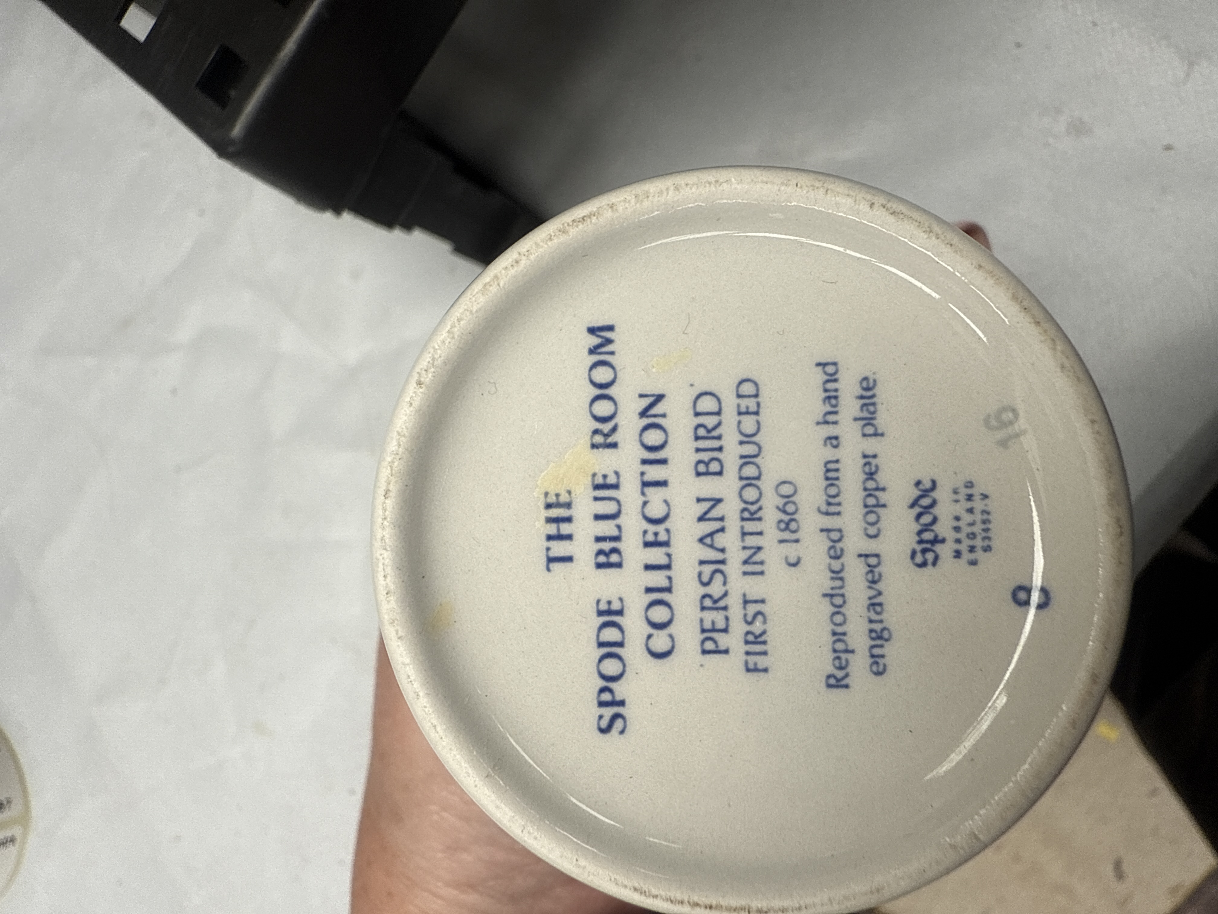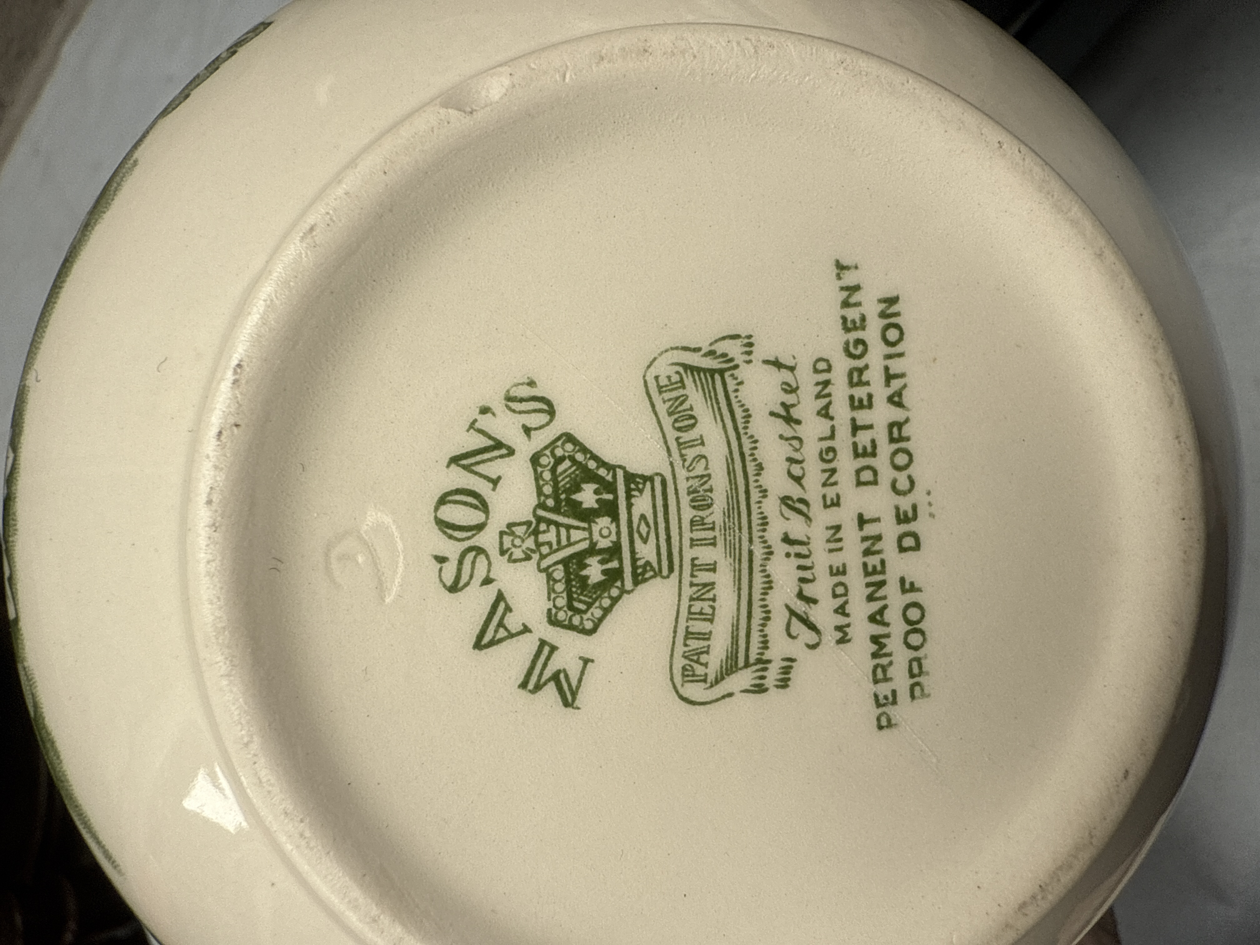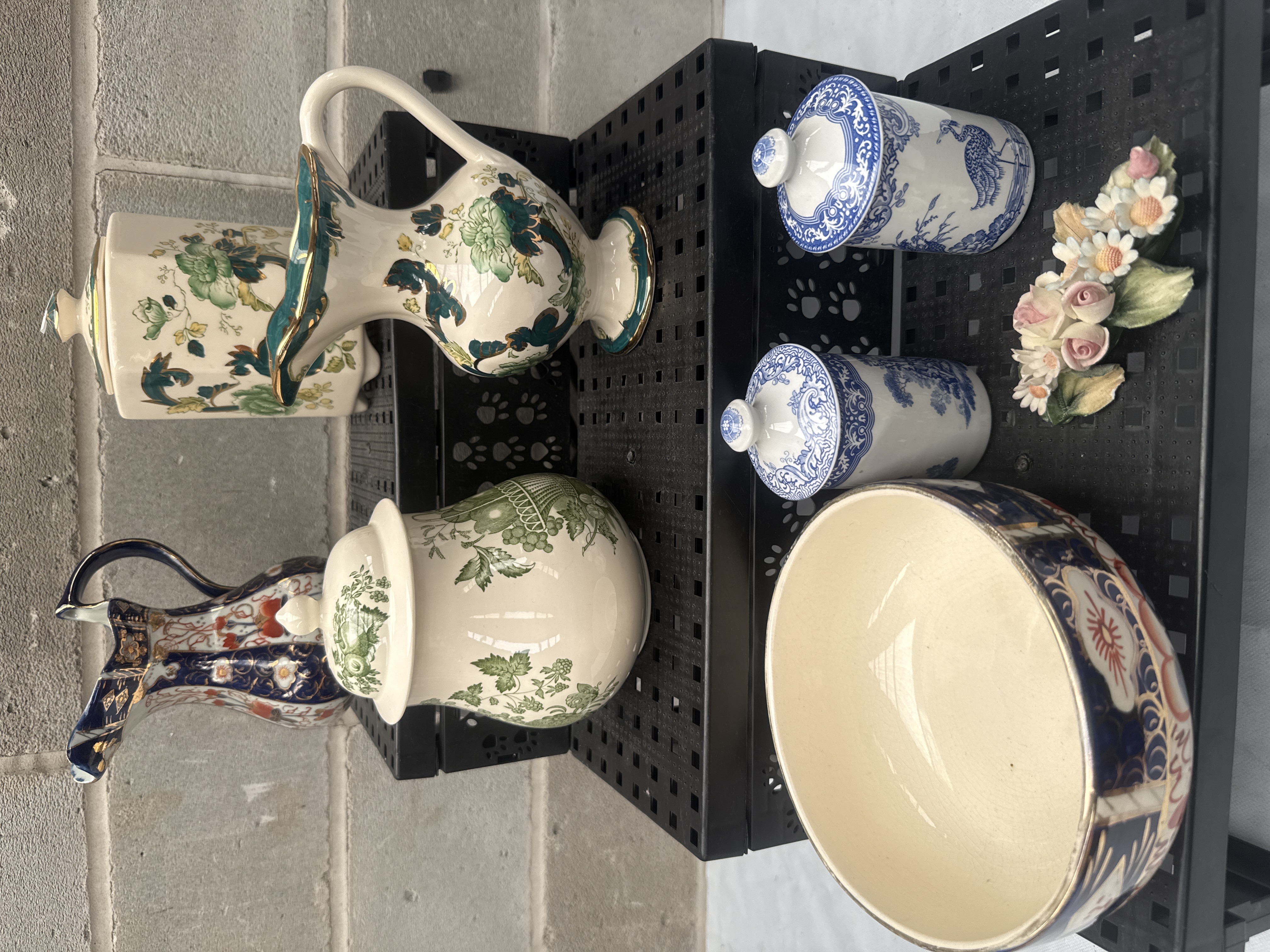 A collection of nine assorted ceramic and decorative items. This lot includes a Mason’s Patent Ironstone ‘Fruit Basket’ covered jar, marked ‘Made in England’ and ‘Permanent Detergent Proof Decoration’, featuring prominent green and gold floral/foliate patterns. Also present are two Spode ‘The Blue Room Collection Persian Bird’ lidded canisters, marked ‘First introduced c. 1860’ and ‘Reproduced from a hand engraved copper plate’, ‘Made in England’, displaying distinctive blue and white oriental-inspired bird and floral motifs. The collection further comprises several jugs or pitchers, a large bowl, and a small porcelain-like floral arrangement. Other ceramic pieces feature various decorative styles, including rich dark blue and red floral designs and additional green and gold foliate patterns.