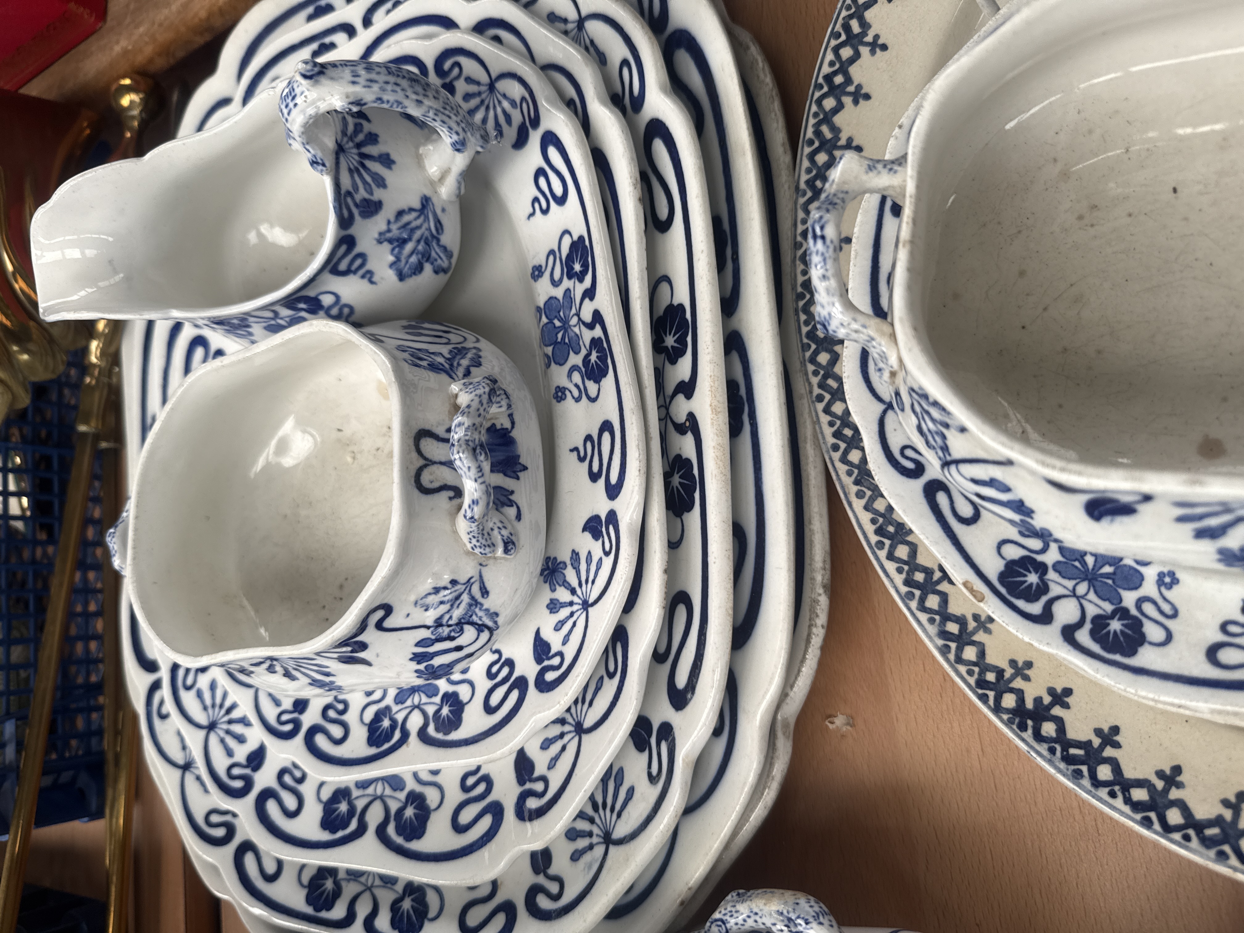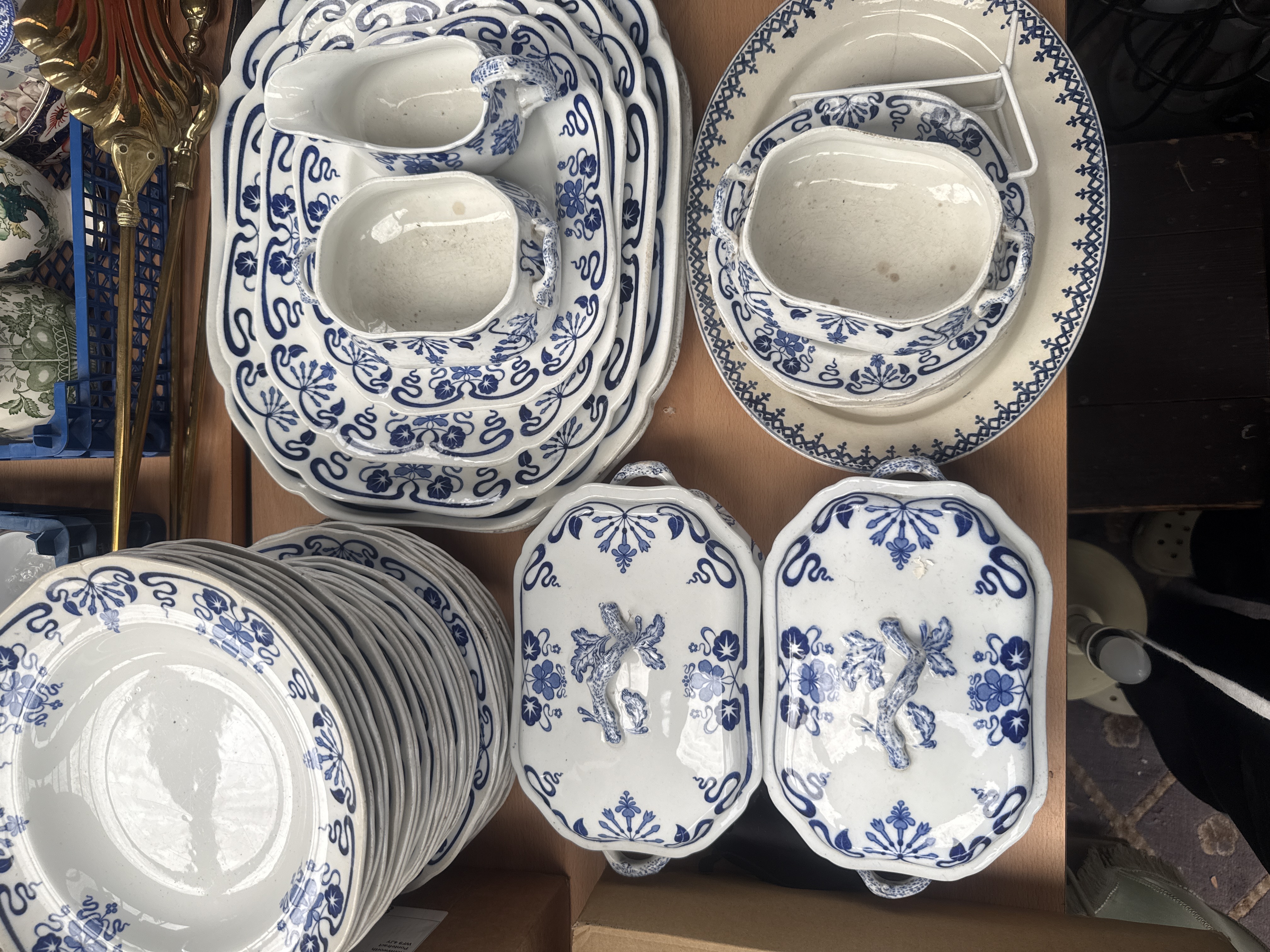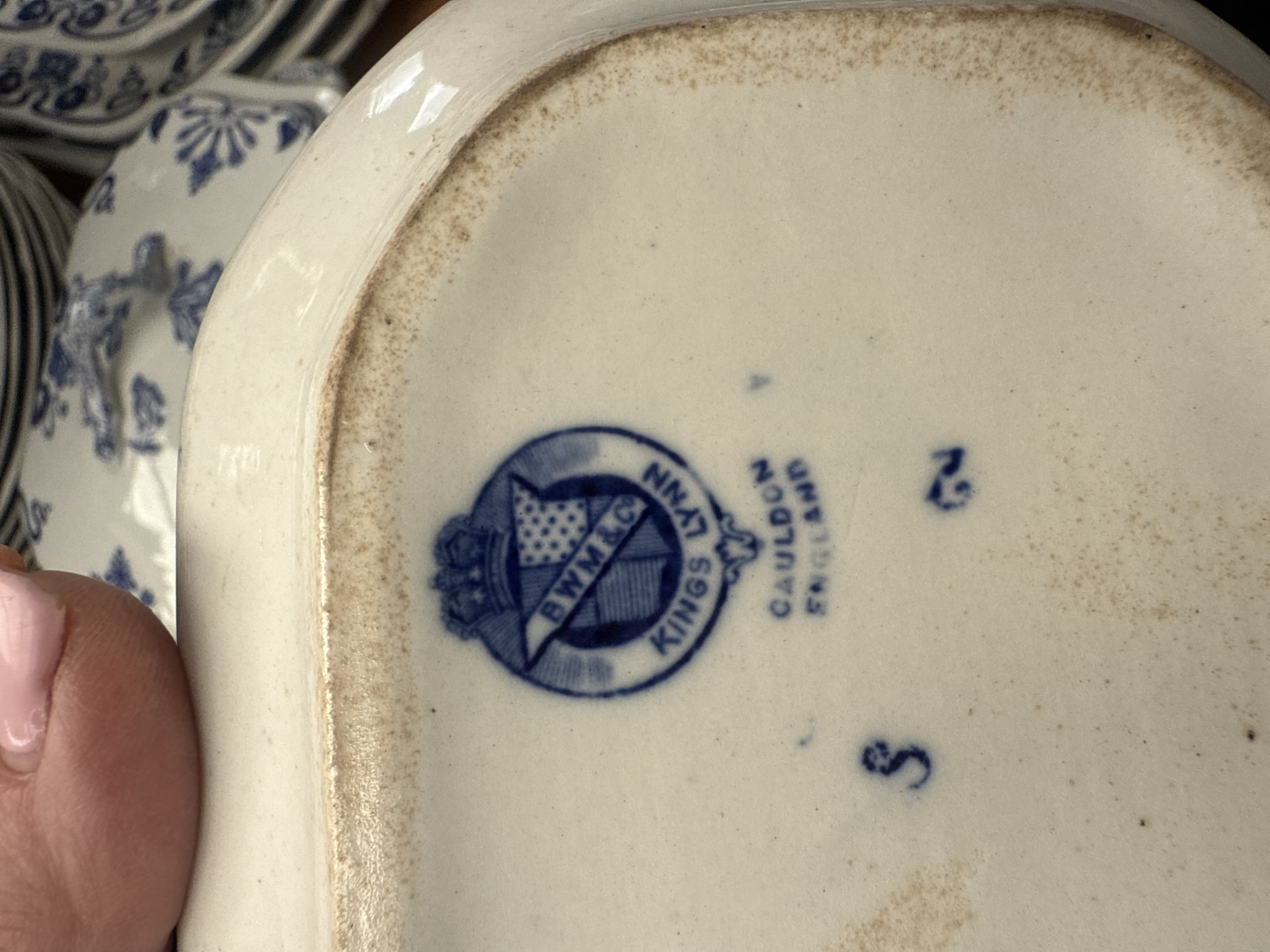 A 44 piece set of BWM & C ‘Kings Lynn’ blue and white transfer-printed dinnerware. This substantial quantity of ceramic tableware primarily comprises numerous plates, two distinct lidded tureens or covered serving dishes, and smaller bowls or gravy boats. The consistent decorative style features intricate floral and scroll motifs on a white ground, with some pieces exhibiting scalloped edges. A prominent backstamp on one item clearly displays a crowned shield emblem with ‘BWM & C’, ‘KINGS LYNN’, and ‘CAULDON ENGLAND’ below, accompanied by impressed numerals ‘S’ and ‘2’. The material appears to be earthenware or ironstone.