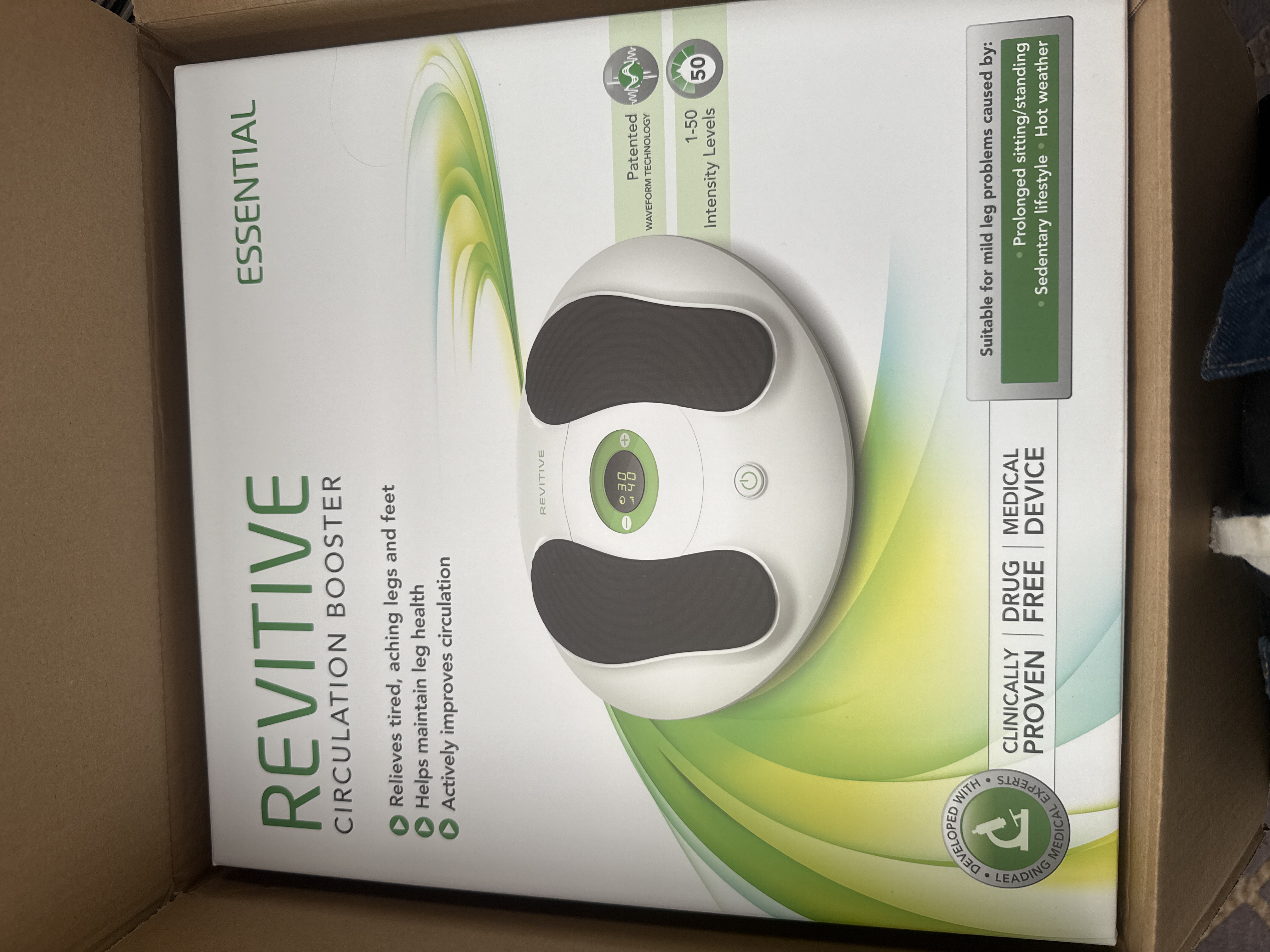 A Revitive Essential Circulation Booster, a contemporary electronic medical device, presented in its original retail packaging. The glossy white and green cardboard box features the product name “REVITIVE CIRCULATION BOOSTER ESSENTIAL” and displays an image of the device, which is a white, oval-shaped unit with two dark grey foot pads, a central green digital display showing “30 40”, and a power button. The packaging highlights features and claims in English, including “Patented Waveform Technology,” “1-50 Intensity Levels,” “Clinically Proven,” “Drug Free,” and “Medical Device.” The device is intended for relieving tired legs and improving circulation for issues related to prolonged sitting/standing, a sedentary lifestyle, or hot weather.