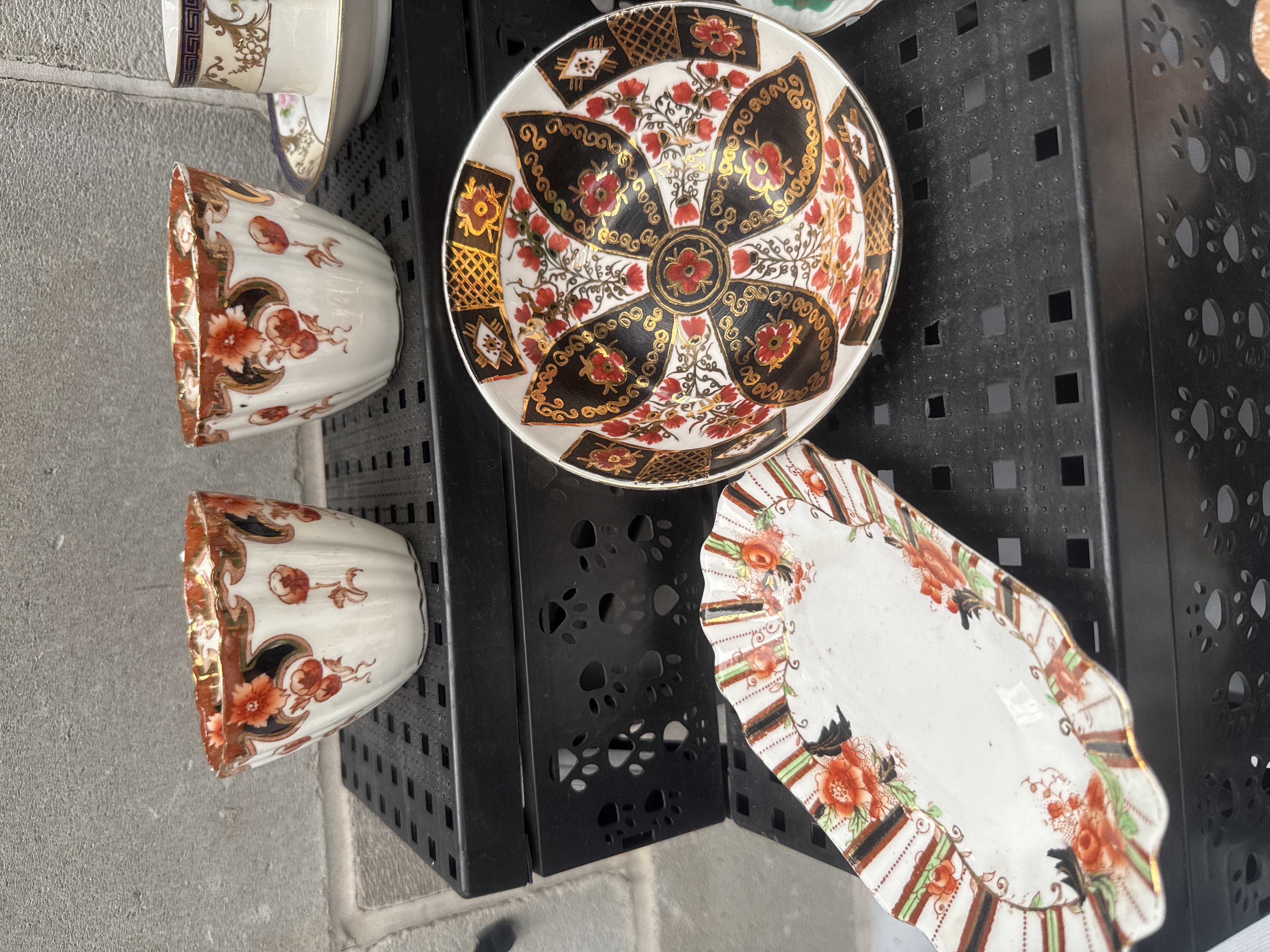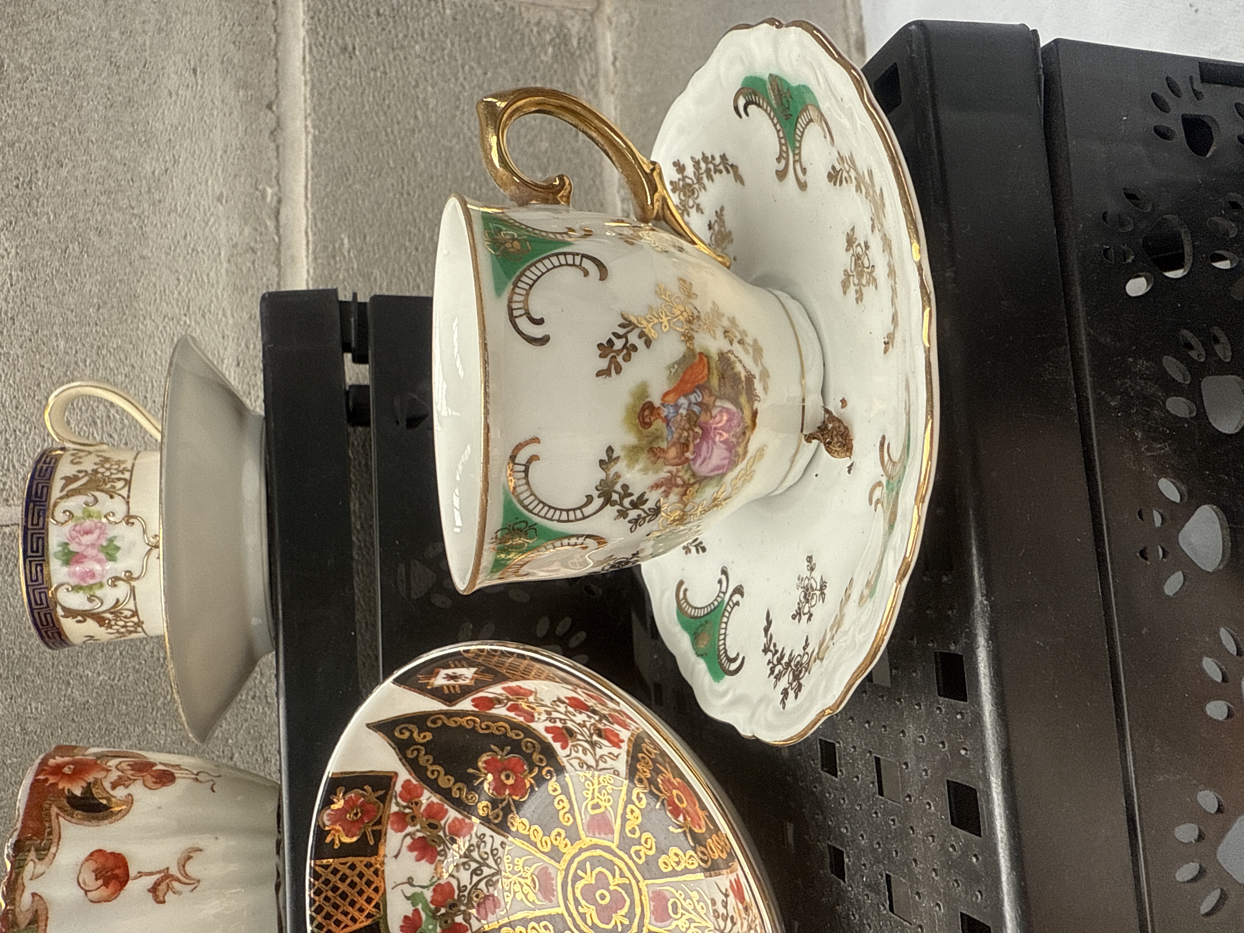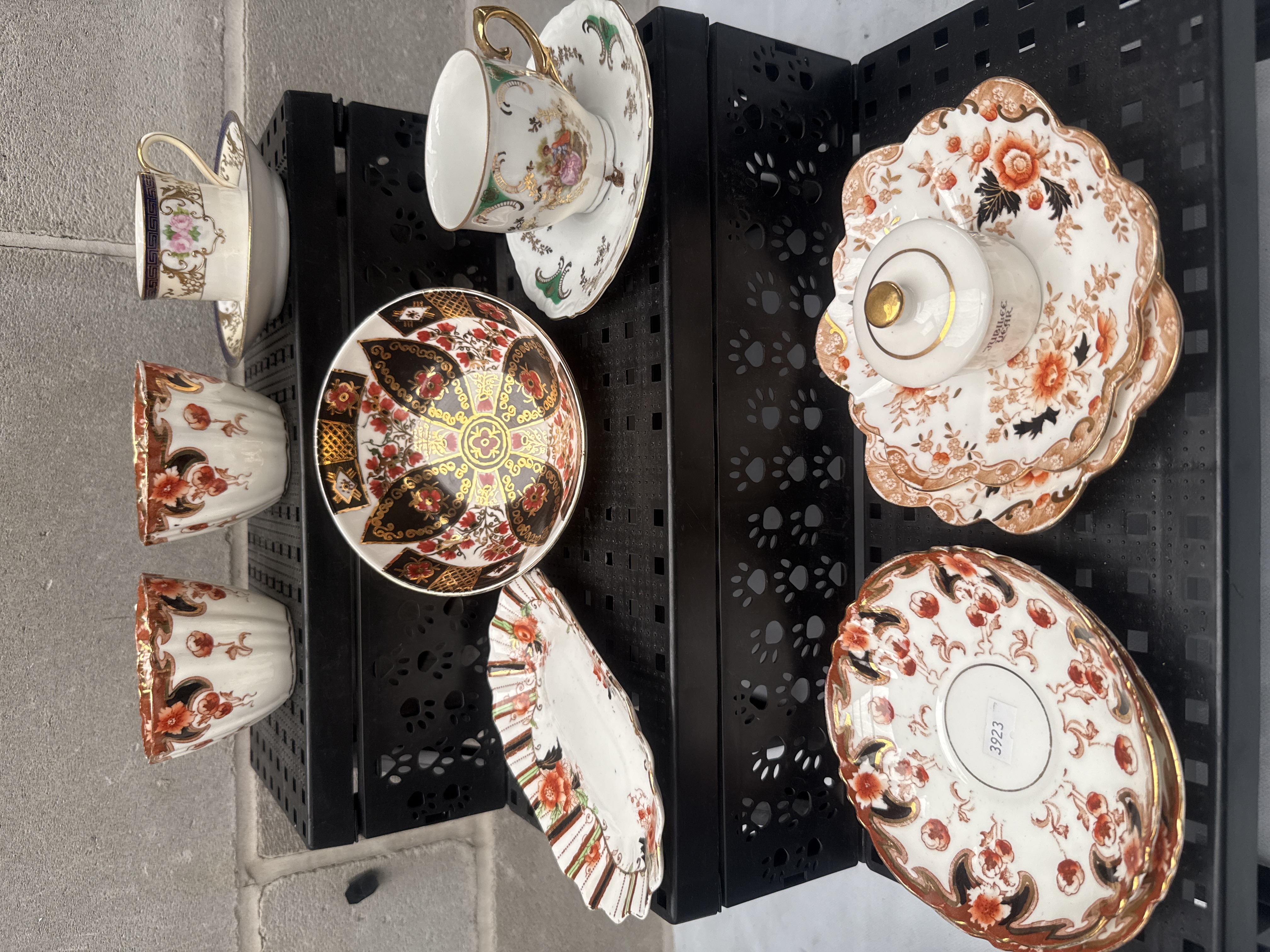 A diverse collection of decorative porcelain tableware, predominantly featuring the Royal Crown Derby ‘Kings’ pattern. The ‘Kings’ pattern items display ornate, multi-color floral motifs in an Imari-style palette of black, red, orange, and gold, with extensive gilt accents and ruffled or scalloped edges. This group includes two fluted footed bowls, a large central bowl, a rectangular dish, an oval dish marked with a white sticker reading “3923”, a small lidded pot, and two scalloped plates. Also present are two teacup and saucer sets; one features delicate pink florals, and the other displays a Rococo-style genre scene with green borders. The overall aesthetic suggests European manufacture, consistent with the late 19th to early 20th century period.