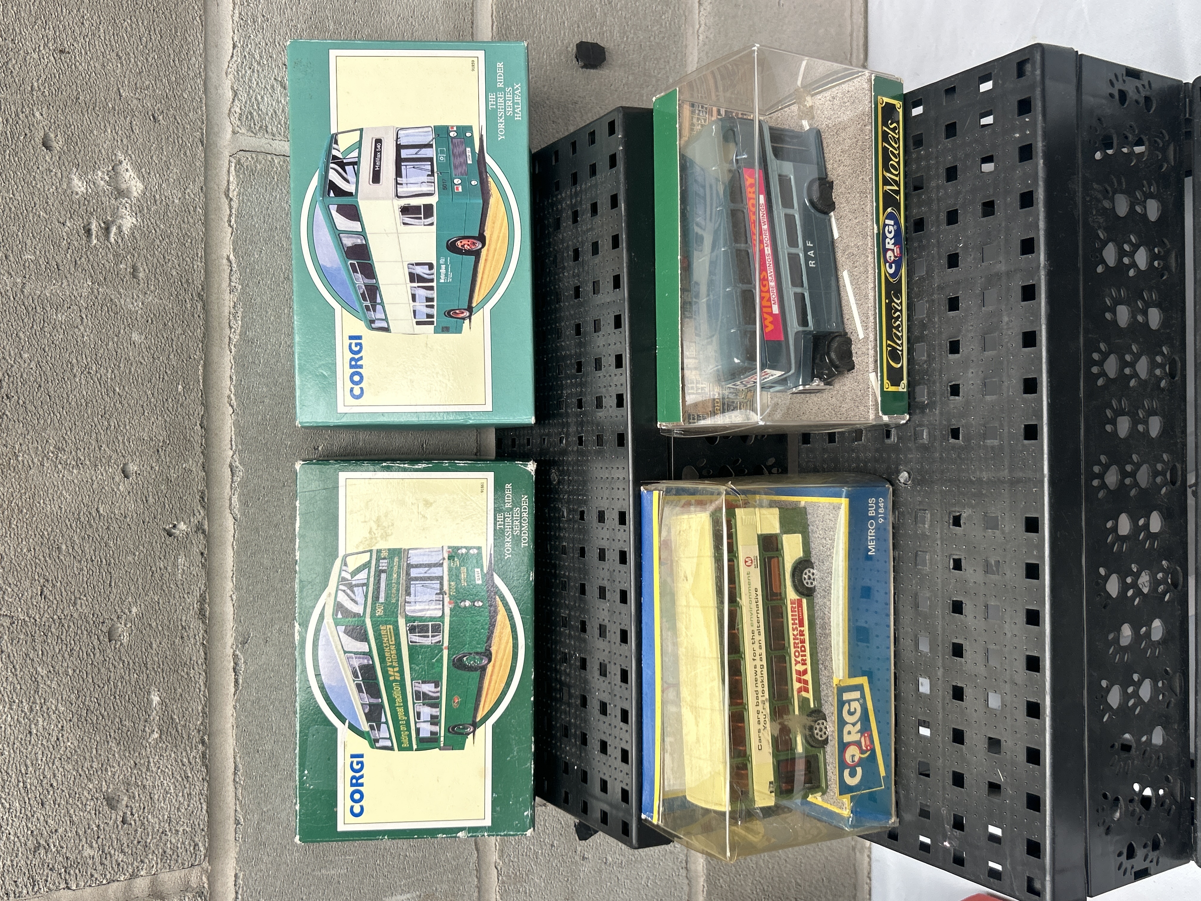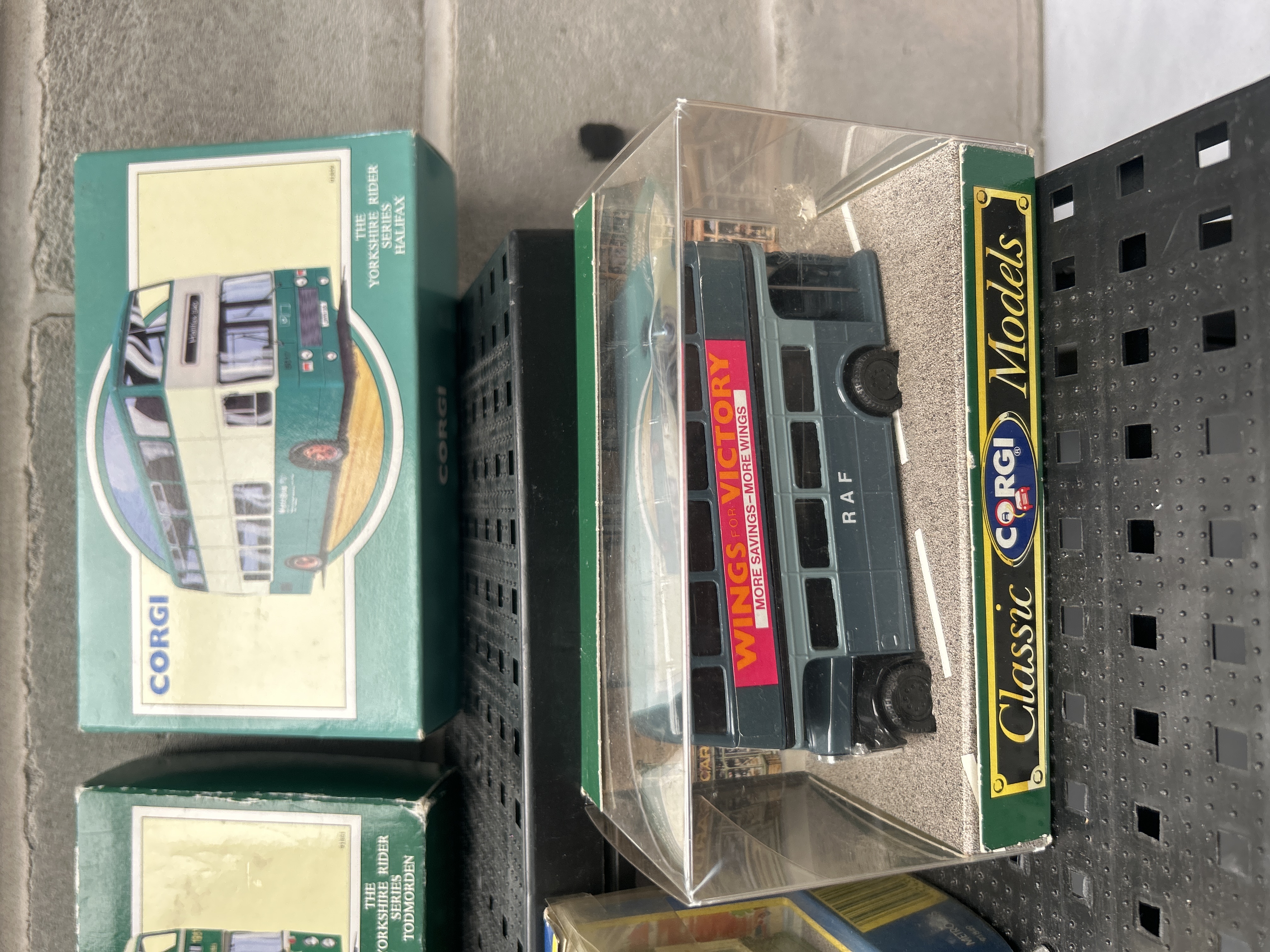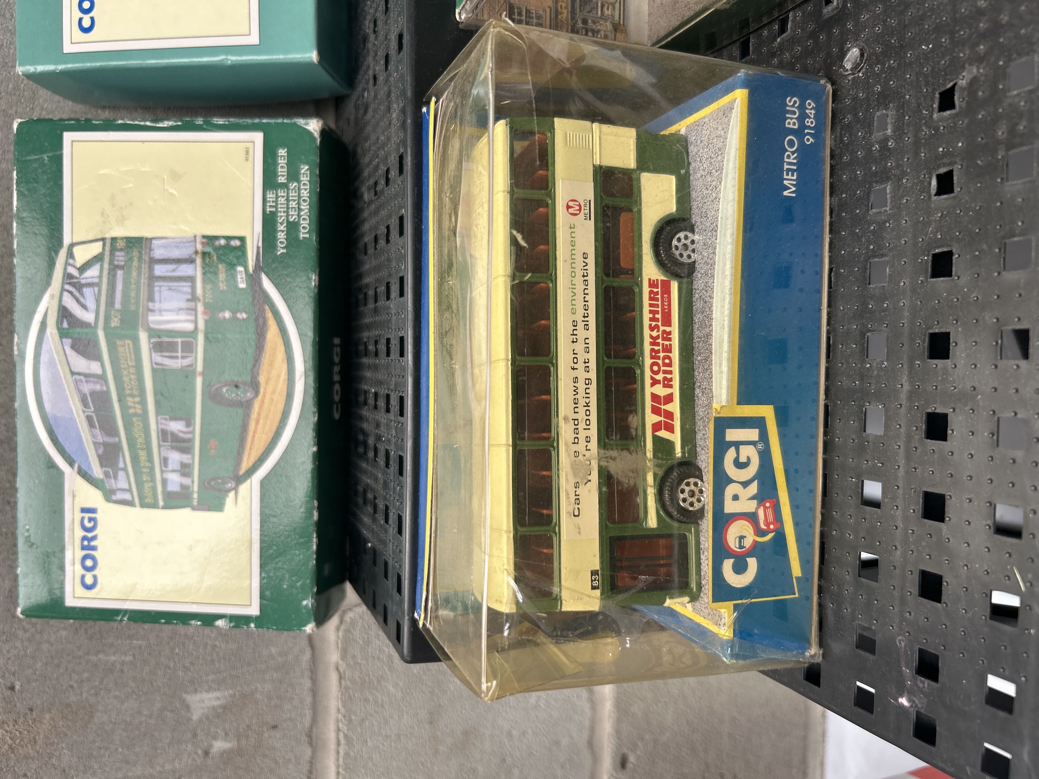 A group of four vintage Corgi die-cast model double-decker buses, presented in their original packaging. Two models are housed in clear plastic display cases atop cardboard bases: one is a cream and green “YORKSHIRE RIDER” Metro Bus (model 91849) with environmental messaging, and the other is a dark blue/grey “Classic CORGI Models” bus featuring “WINGS for VICTORY” and “RAF” livery. The remaining two models are depicted on their respective “THE YORKSHIRE RIDER SERIES” cardboard boxes, identifying them as “TODMORDEN” and “HALIFAX” variants. All items are constructed from die-cast metal and plastic.