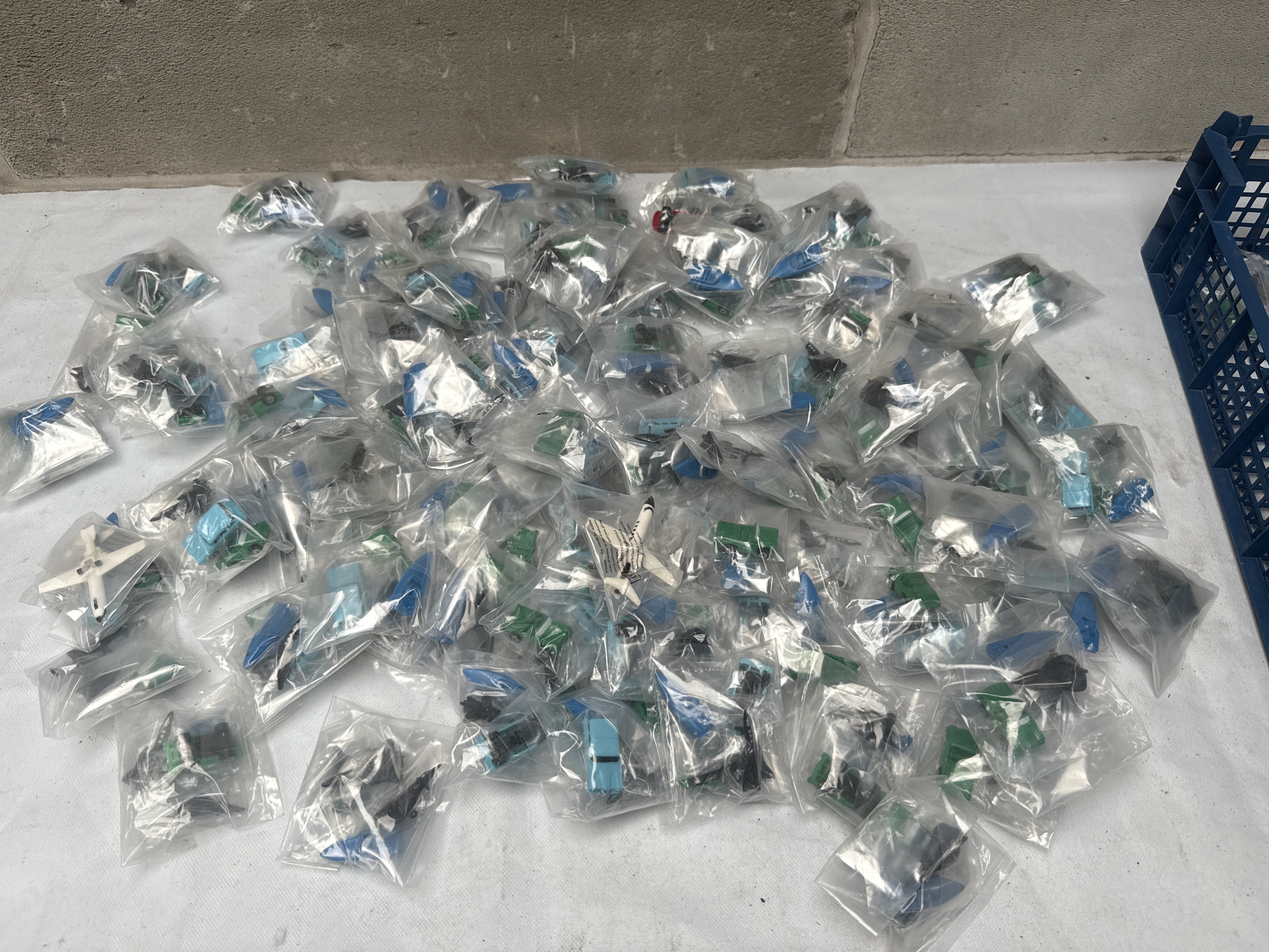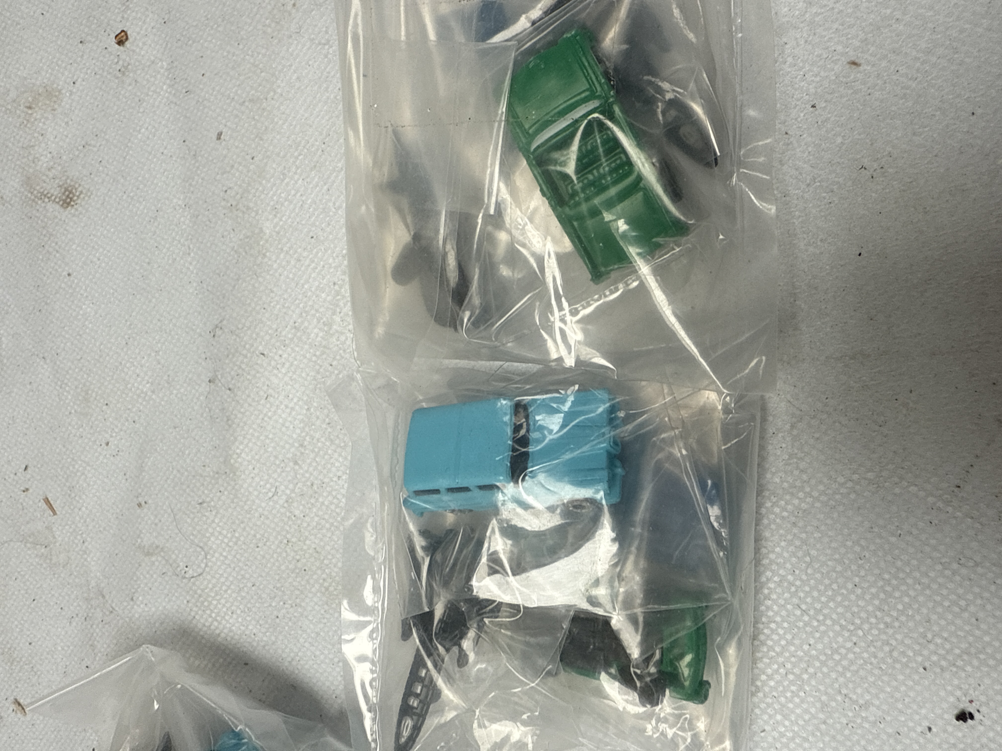 A collection of Micro Machines miniature toy vehicles. This lot comprises numerous individually packaged miniature plastic toy vehicles, and possibly aircraft or structural components. The items exhibit a simple, mass-produced toy style, consistent with a late 20th to early 21st-century period. They are predominantly molded from plastic in various colors, including blue, green, white, and black. Each item is sealed within its original individual clear plastic bag.