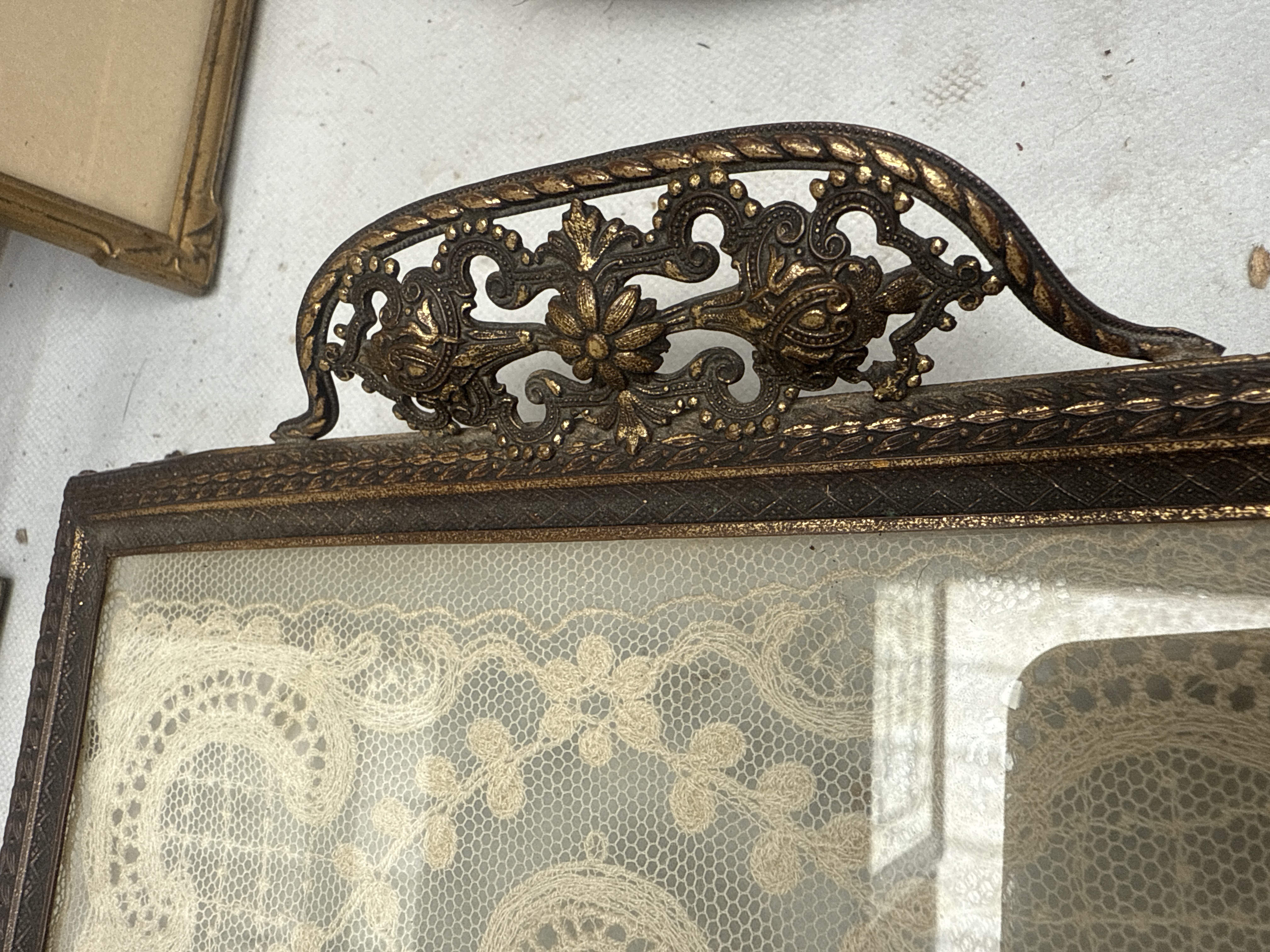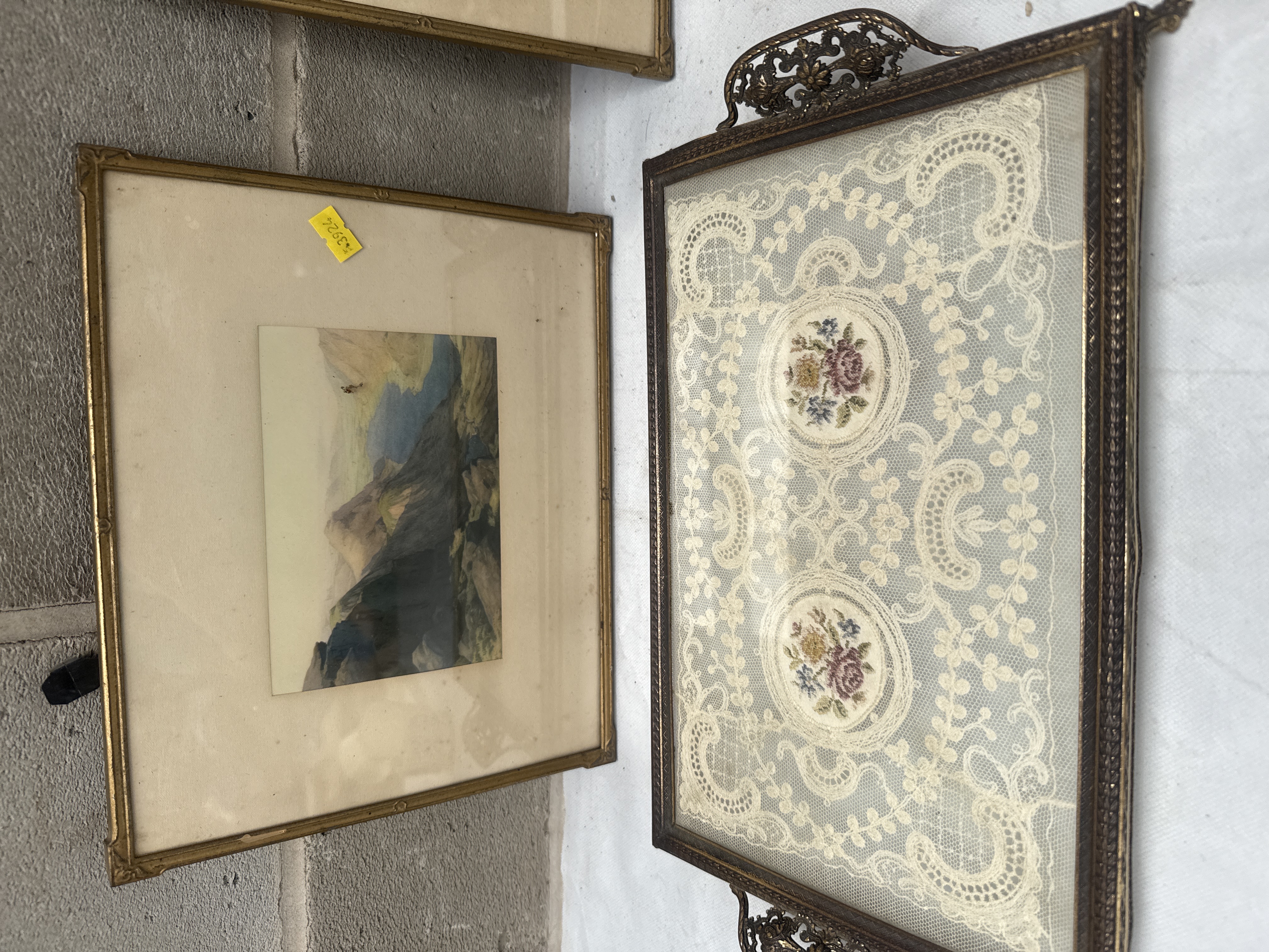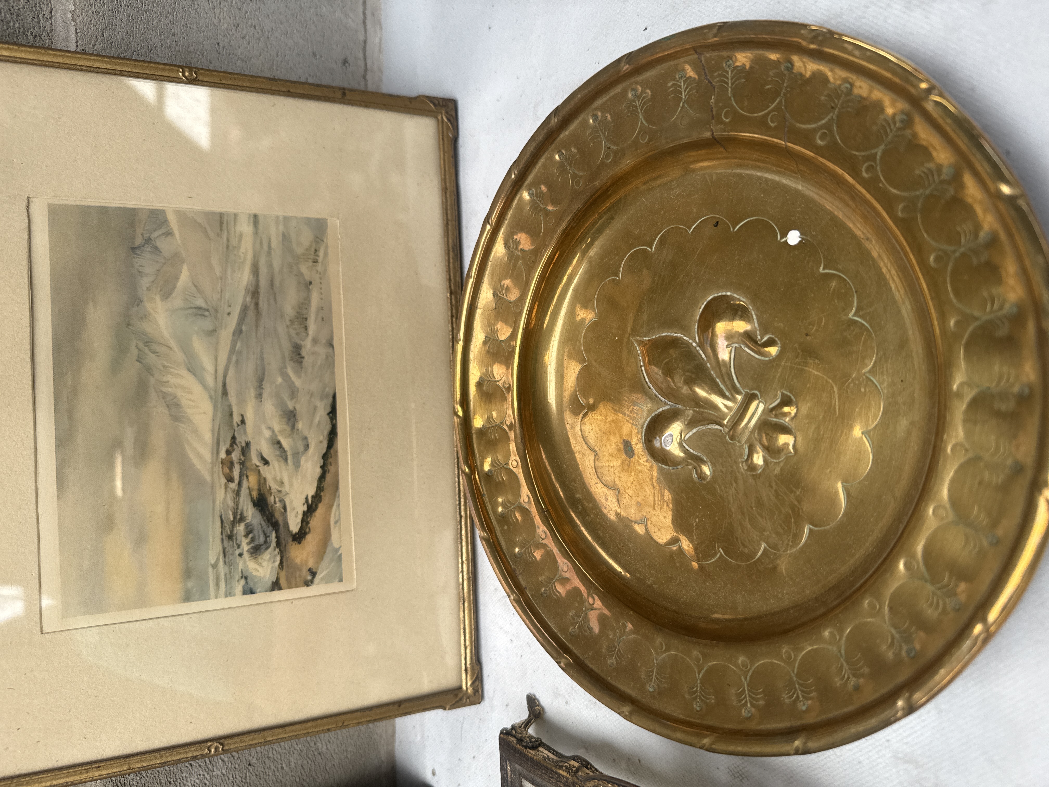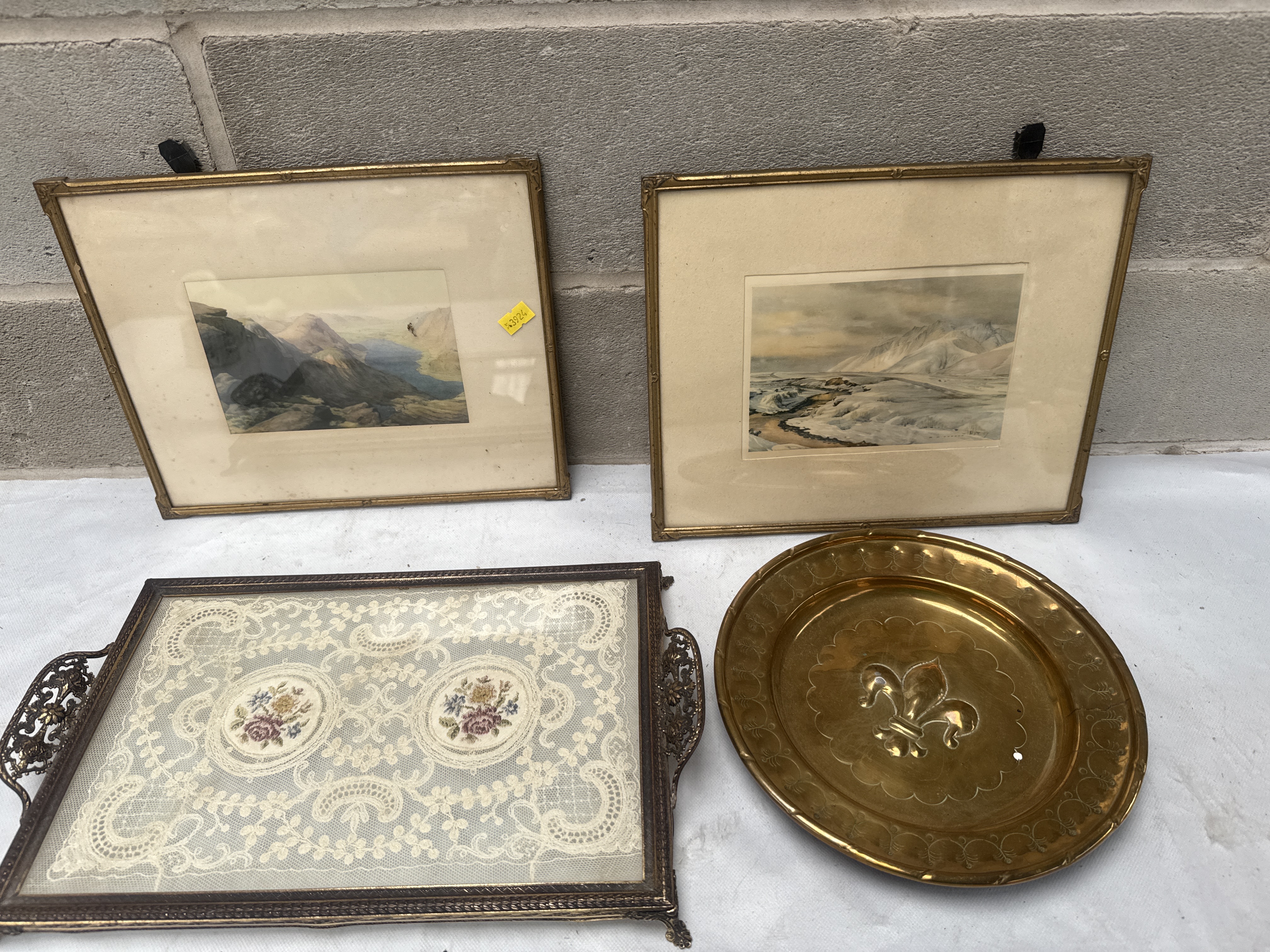 This lot comprises a collection of four decorative items. The primary item, identified through web intelligence, is a Vintage Made In England Solid Brass Wall Plate. This circular brass plate is adorned with a central embossed Fleur-de-lis motif, surrounded by a scalloped border and etched scrollwork. Also included are a pair of framed mountainous landscape scenes, presented in ornate gilt wood frames. The rectangular serving tray features an ornate, dark patinated metal frame with scrolled handles, enclosing a glass panel over a cream-colored lace ground with two embroidered floral roundels. The framed artworks are likely watercolors or prints. The serving tray suggests a Victorian or Edwardian period. The gilt wood frames of the artworks likely date to the late 19th or early 20th century.