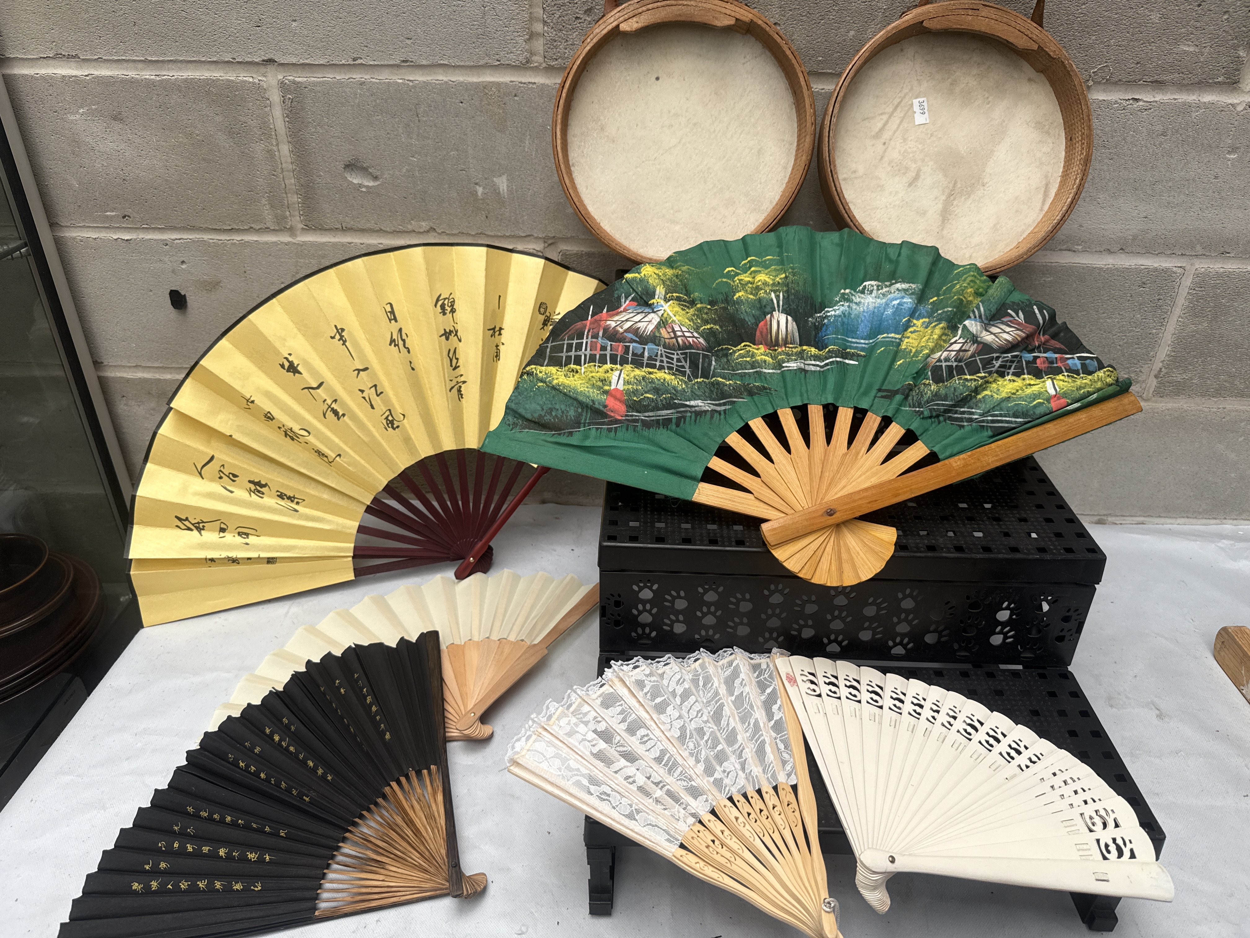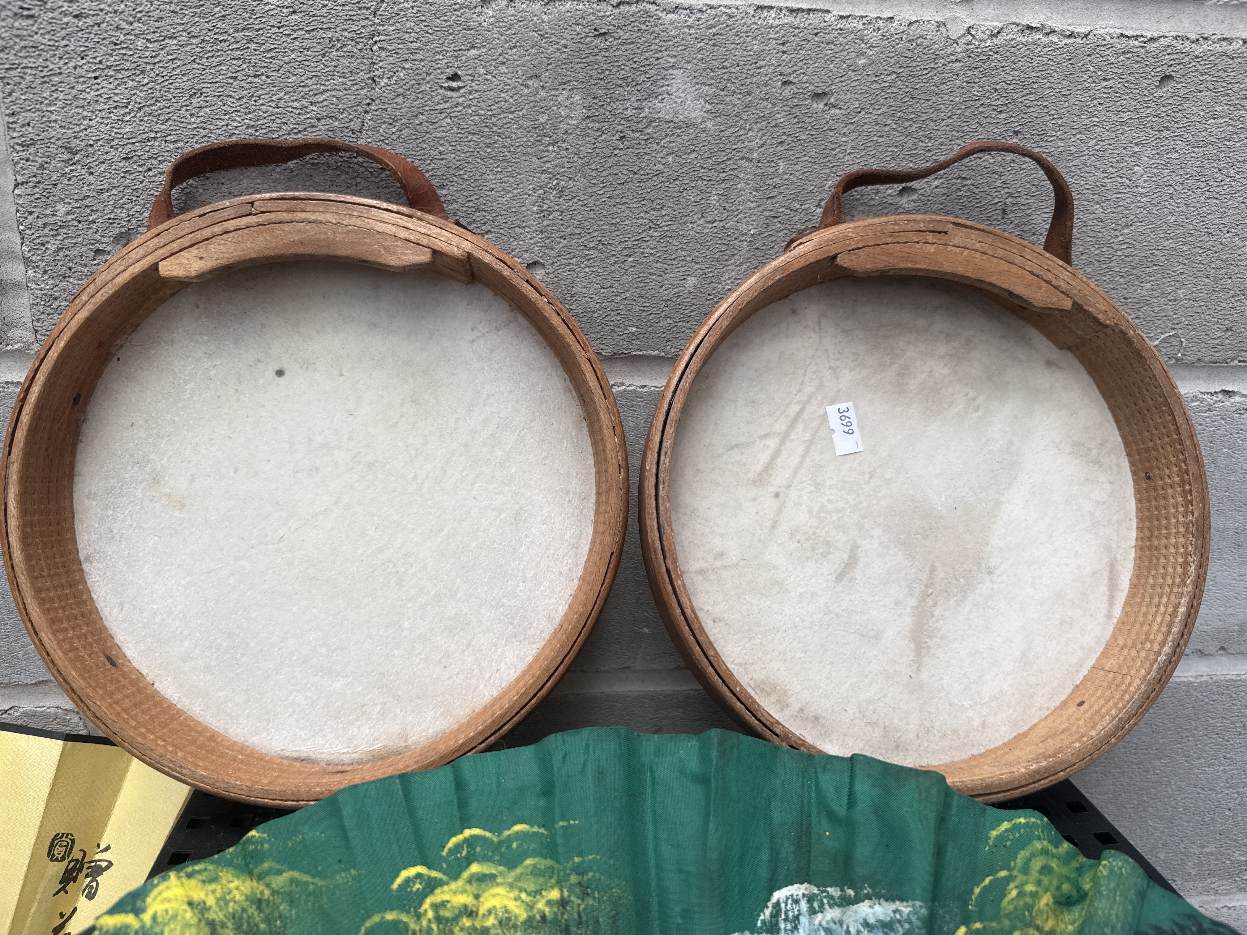 A diverse group of decorative items comprising two circular, shallow, drum-like objects, each featuring light wood rims, natural hide or parchment heads, and brown leather carrying loops; one head bears a white sticker with the handwritten number “3699.” Also included are two large folding fans: one with a yellow paper or silk leaf, adorned with extensive black Chinese calligraphy, translated in part as “Cold river snow shadow,” “Mountains bright, waters clear,” and including lines from Tang dynasty poems such as “Moon rises, startling mountain birds” and “Sun rises, river flowers redder than fire”; the other large fan features a green fabric or paper leaf hand-painted with a landscape scene depicting houses and trees by a body of water. Completing the assortment are six smaller folding fans, which include examples with black paper leaves featuring white calligraphy, plain cream or tan paper leaves, and white paper leaves, some of which exhibit lace-like cutouts or decorative printed patterns, all mounted on light wooden frames.