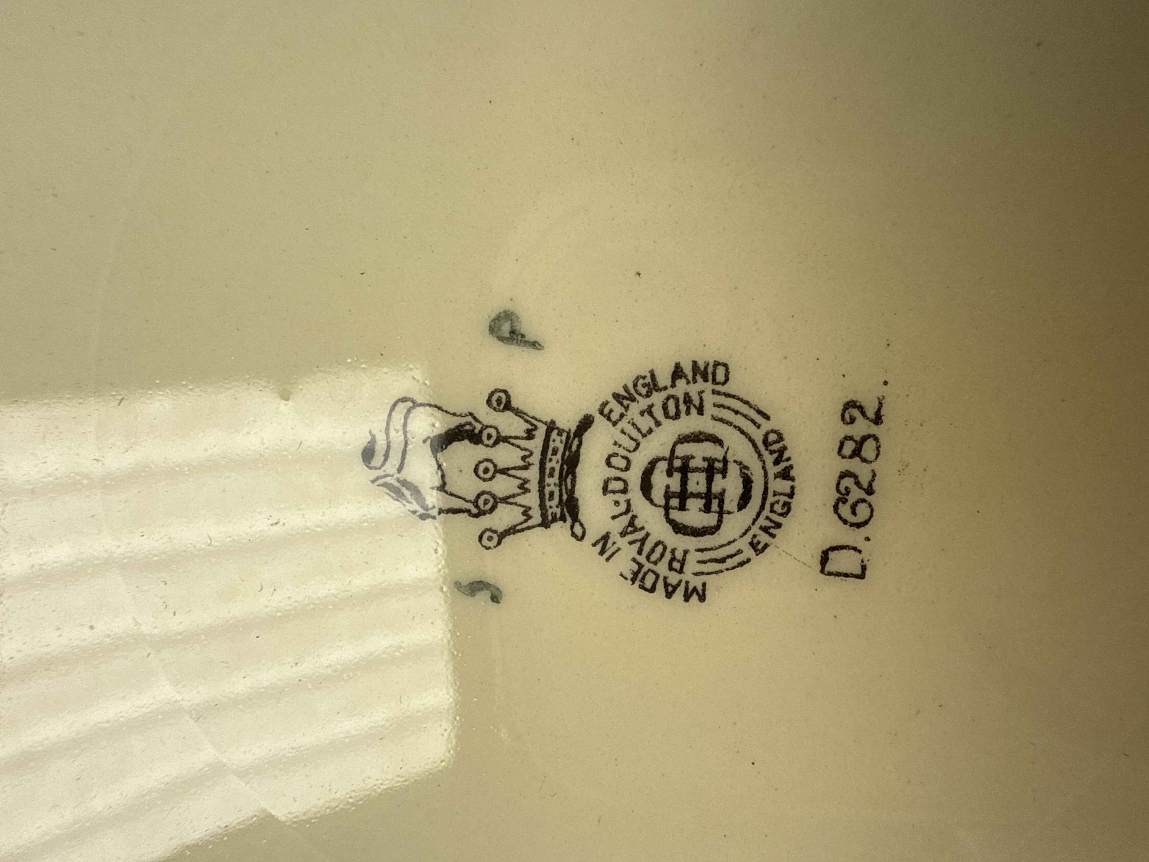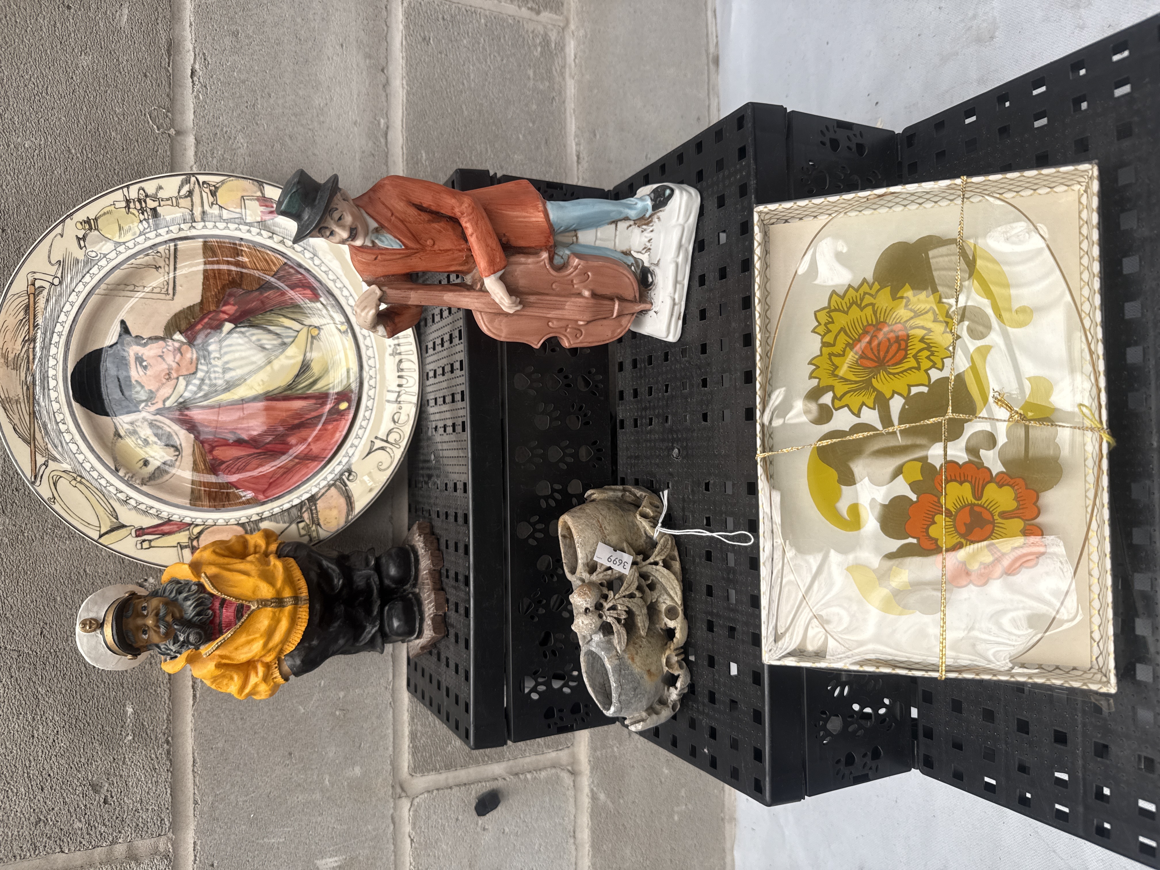 A group of decorative objects, led by a cream-colored Royal Doulton ceramic plate. The plate features a portrait of a gentleman and the inscription “Der Stumpf” (The Stump) on the front. The reverse is clearly marked “MADE IN ROYAL DOULTON ENGLAND”, “ENGLAND”, and “D.6282.” alongside the Royal Doulton crown. The lot also includes two painted ceramic or resin figurines: one depicting a male captain or sailor in a yellow jacket, and another of a male musician in a red jacket playing a cello-like instrument. Below these sits an irregularly shaped, rustic-textured vessel, possibly ceramic or natural stone. Completing the arrangement is a boxed set of four square decorative items, likely placemats or coasters, enclosed in plastic and string, featuring a vibrant yellow and orange floral motif.