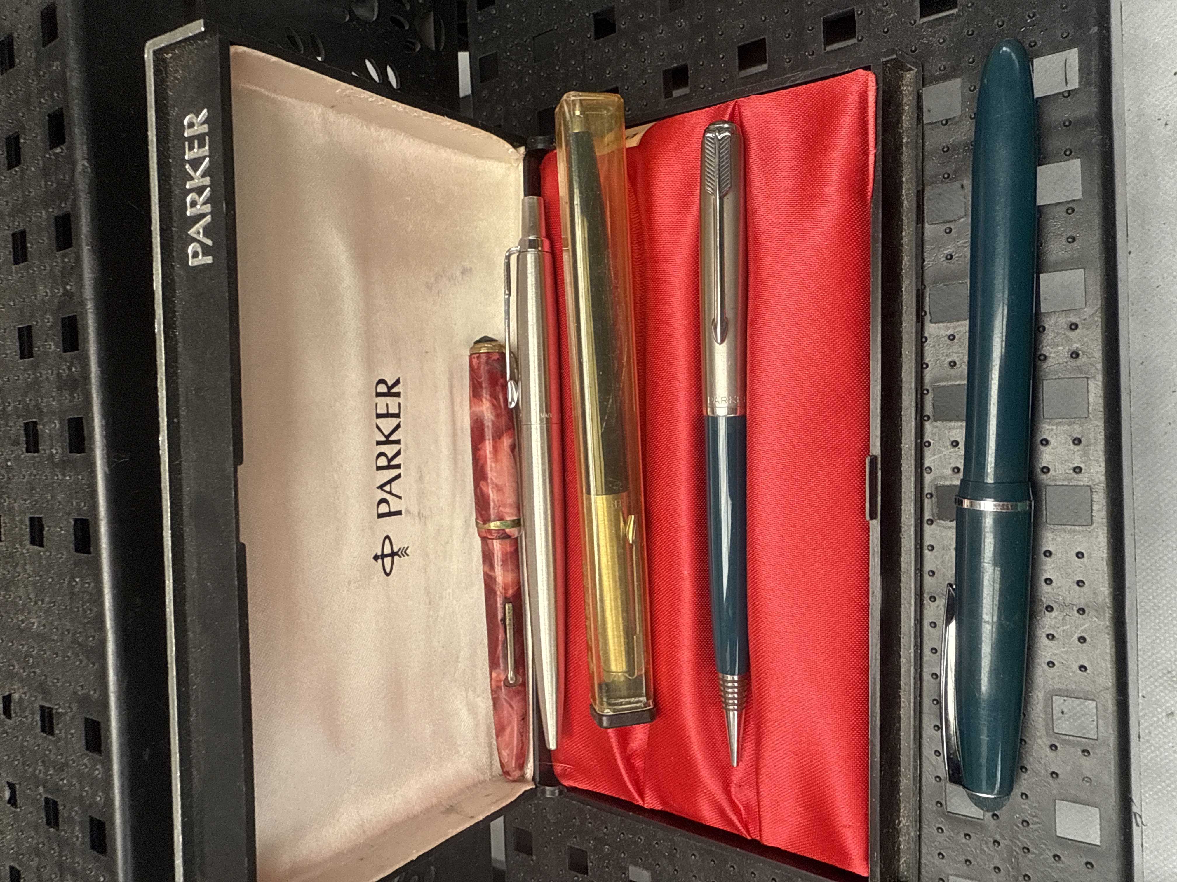 A collection of five vintage Parker writing instruments, including three fountain pens, one ballpoint/rollerball, and one mechanical pencil, displayed within and alongside a branded Parker presentation box. The pens feature diverse materials such as mottled red resin, solid teal resin, silver-tone metal, gold-tone accents, and a clear amber-tinted plastic barrel. Visible markings include “PARKER” prominently displayed on the box exterior and interior lid, accompanied by the distinctive Parker arrow logo, with the brand name also visible on at least one pen’s cap band, indicating a probable mid-20th century manufacturing period.
