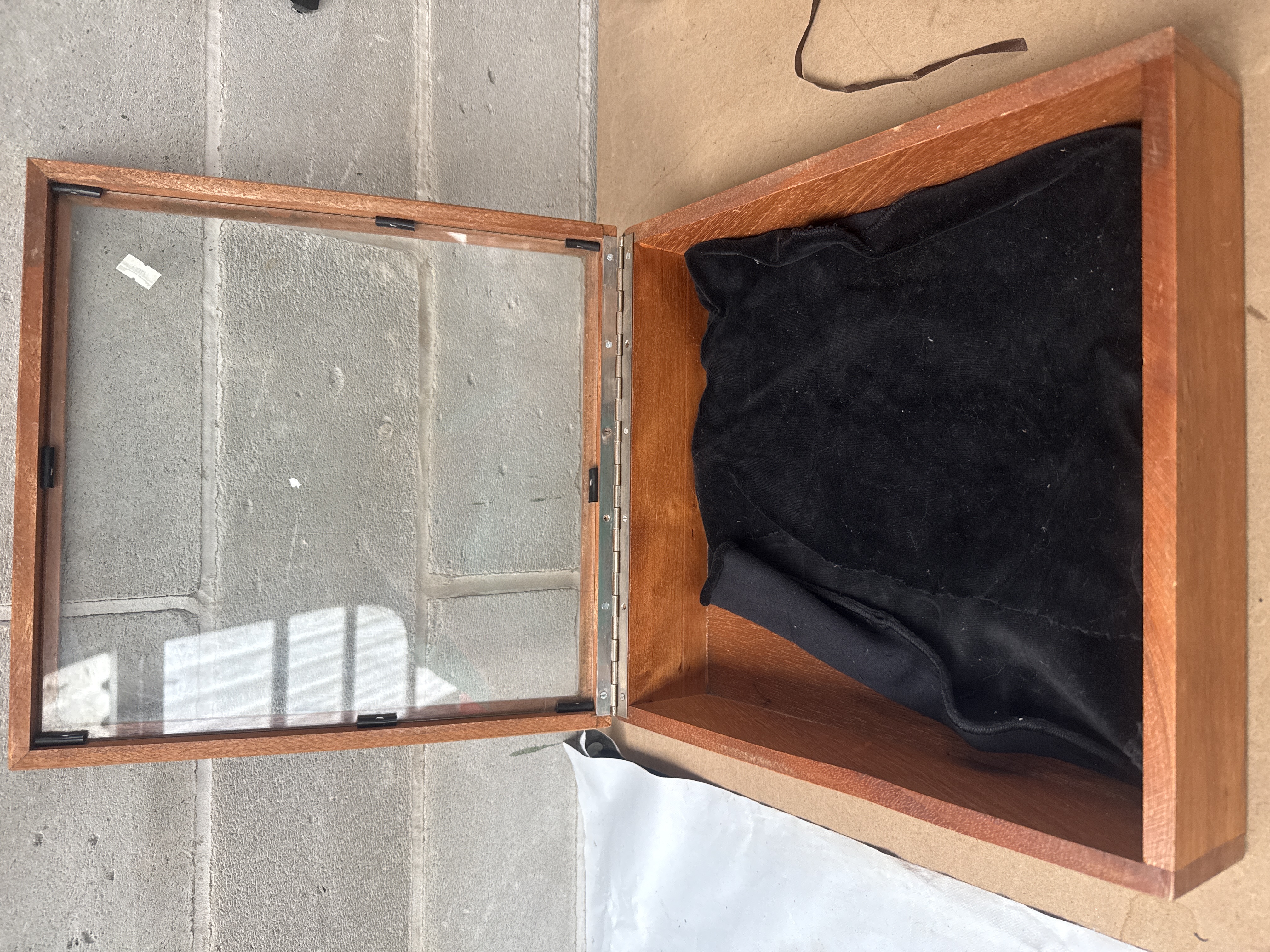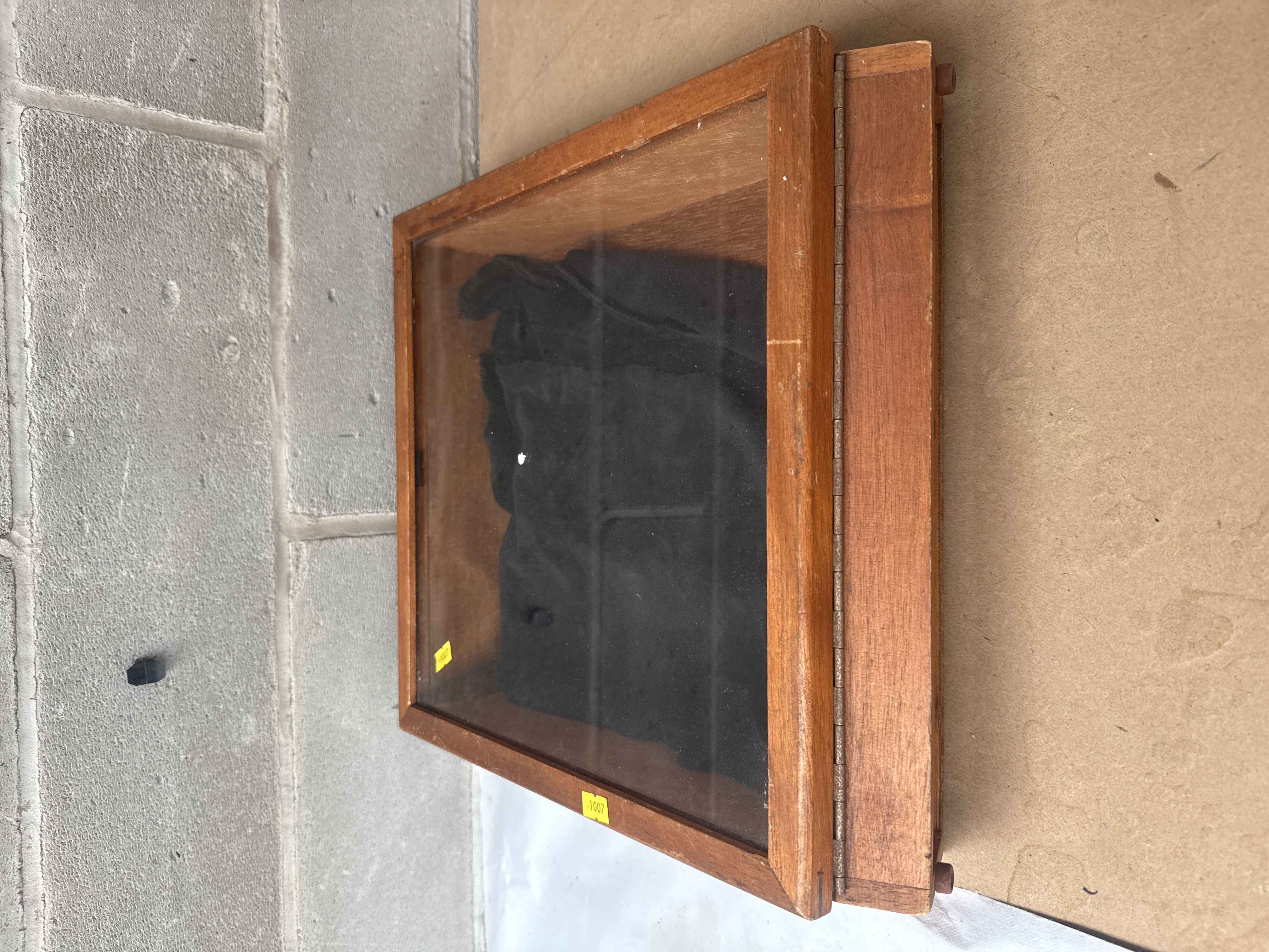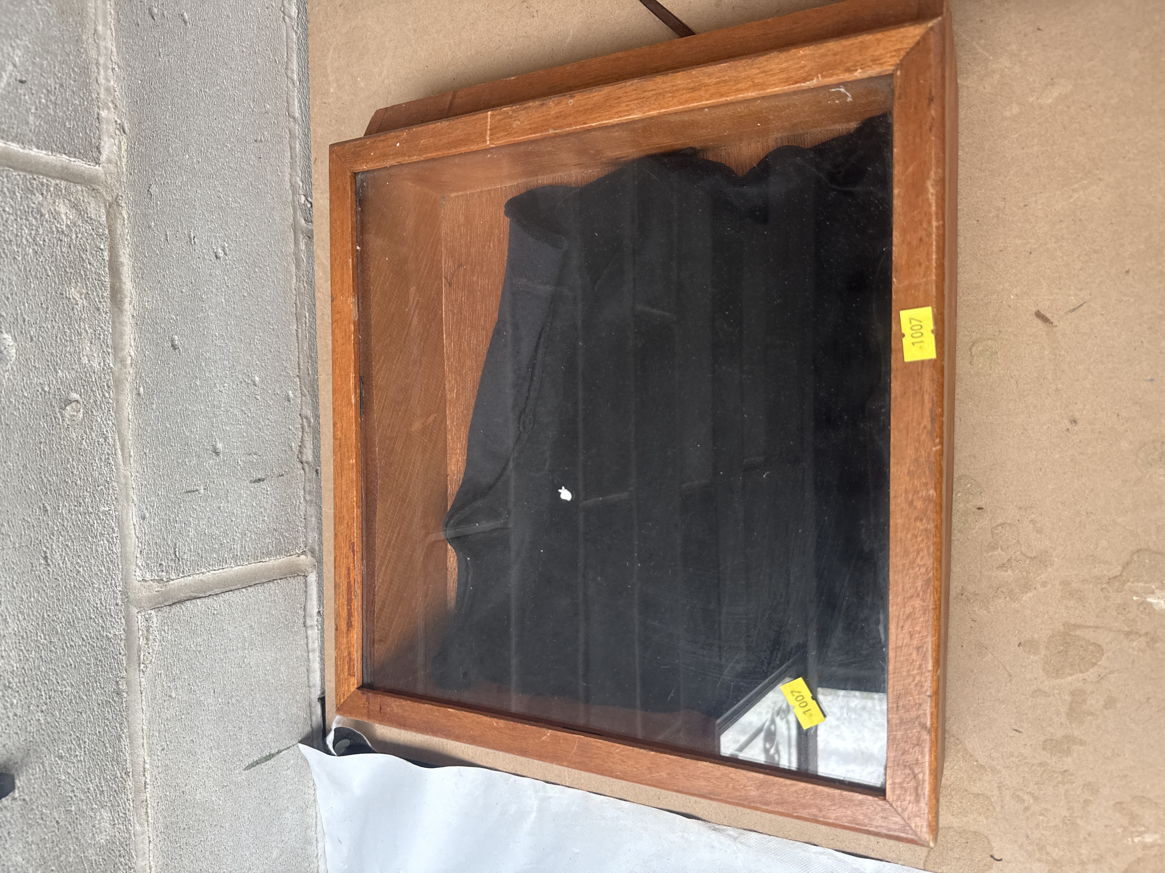 A rectangular, hinged display case, also known as a shadow box or presentation box, constructed from reddish-brown stained wood, possibly mahogany or a similar hardwood. It features a clear glass lid and silver-toned metal hinges. The interior base is lined with black velvet or velour fabric. Two yellow adhesive labels marked “1007” and “A007” are affixed to the glass, serving as visible inventory or lot numbers.