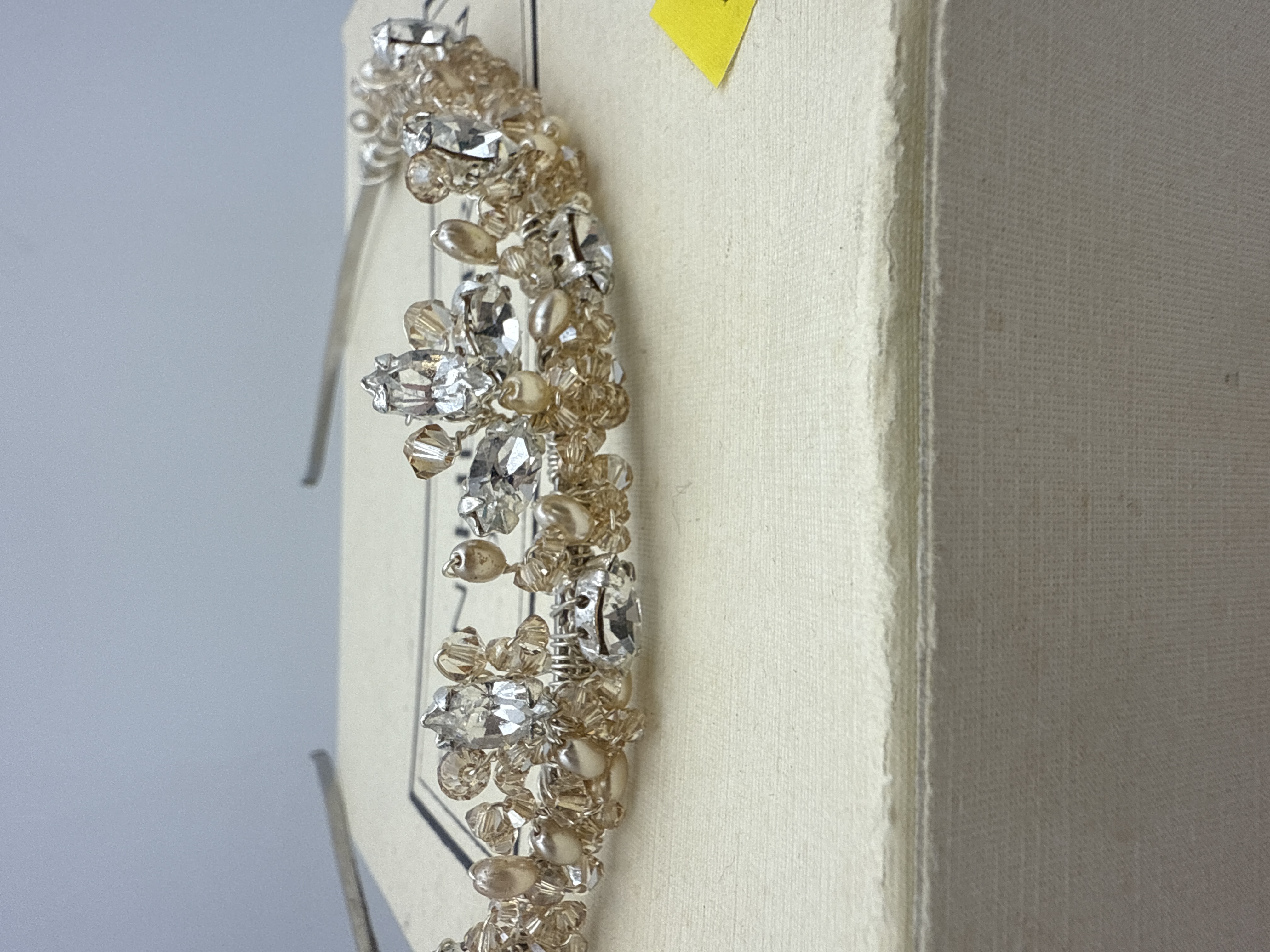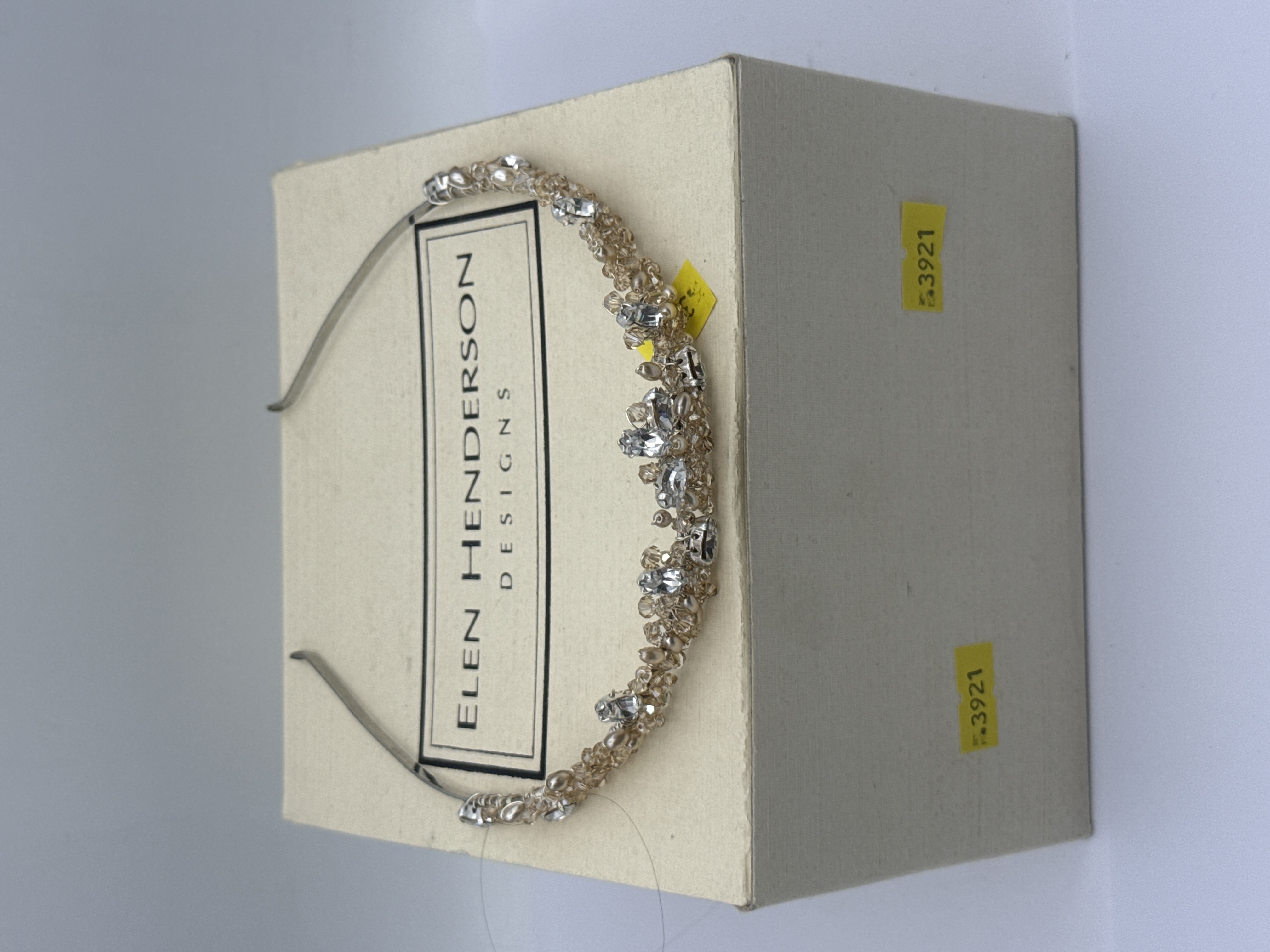 An Elen Henderson Designs bridal headpiece, featuring a silver-tone metal band adorned with a curvilinear arrangement of clear and champagne-colored faceted beads, small ivory/cream faux pearls, and larger clear faceted stones. The item is presented in its original cream-colored box, which prominently displays the English text “ELEN HENDERSON DESIGNS” and two yellow inventory stickers marked “F4 3921”.