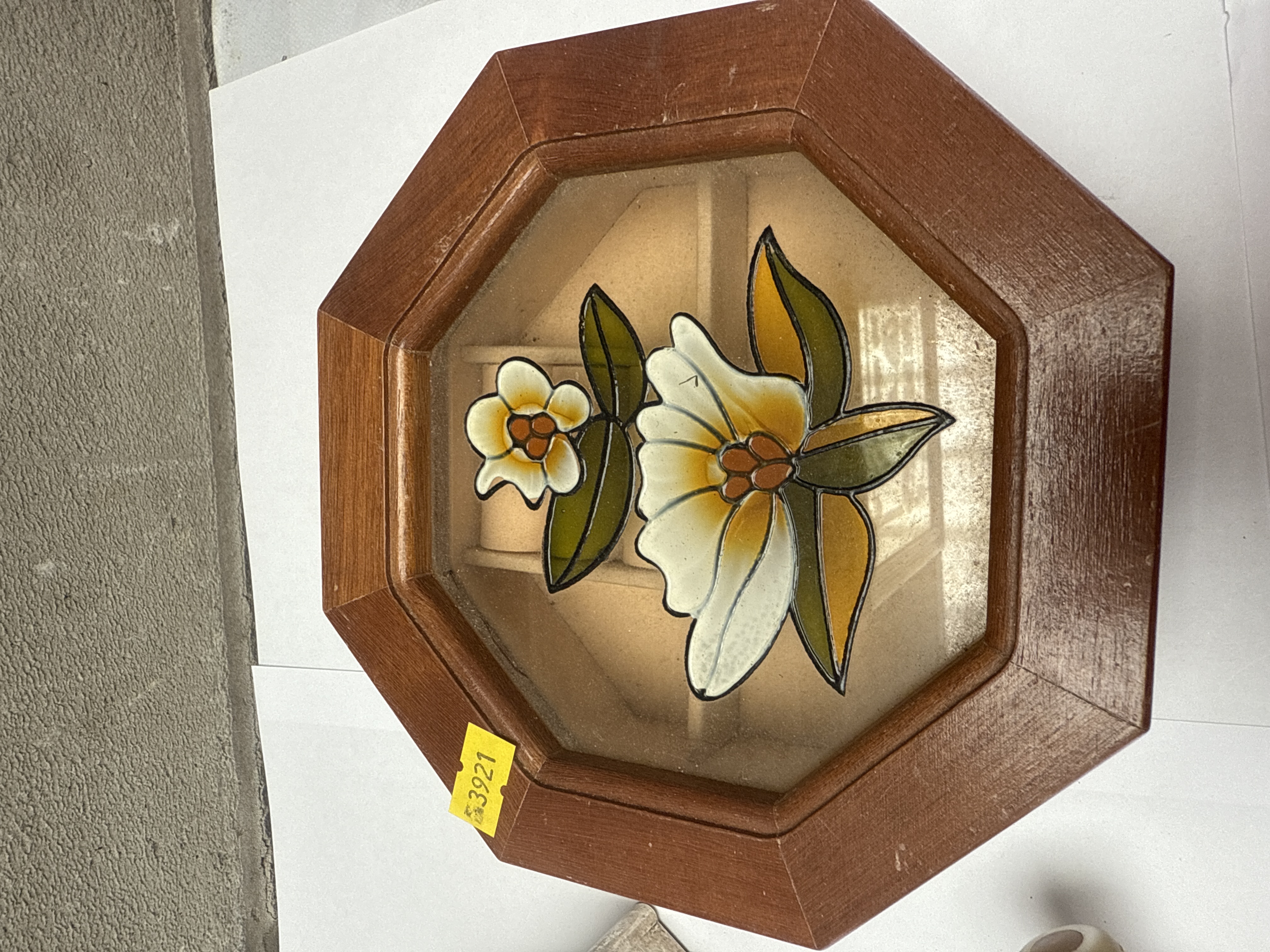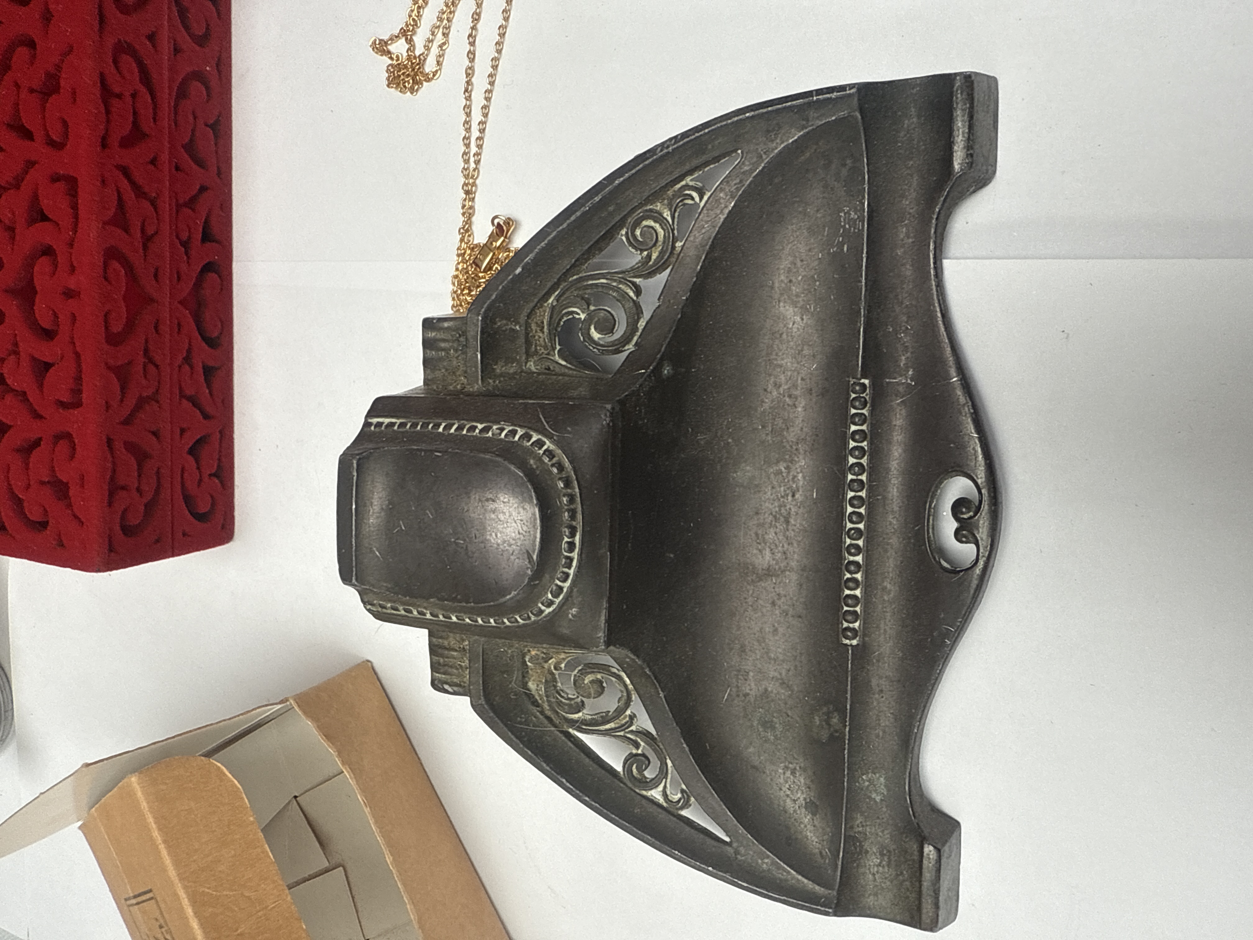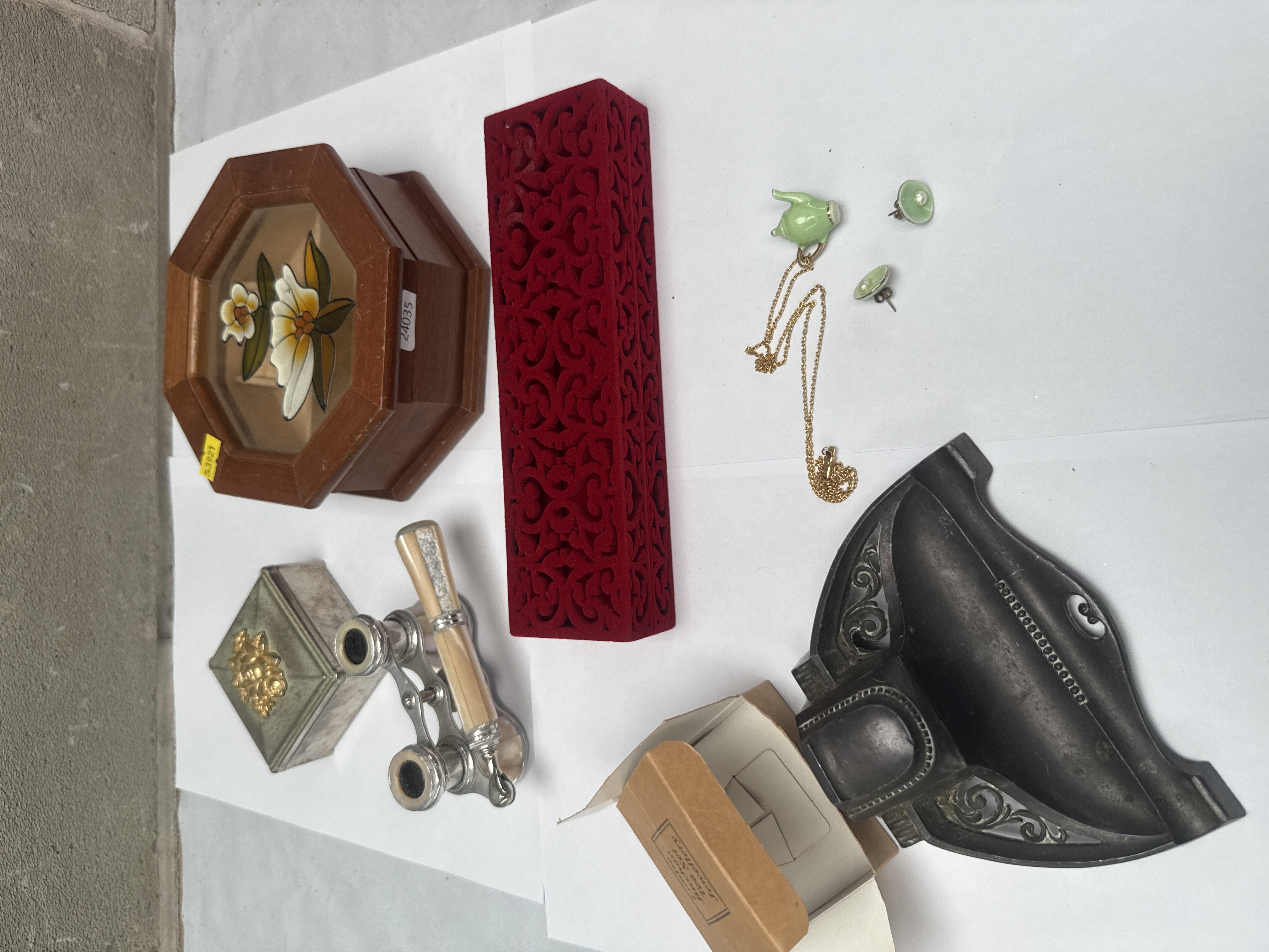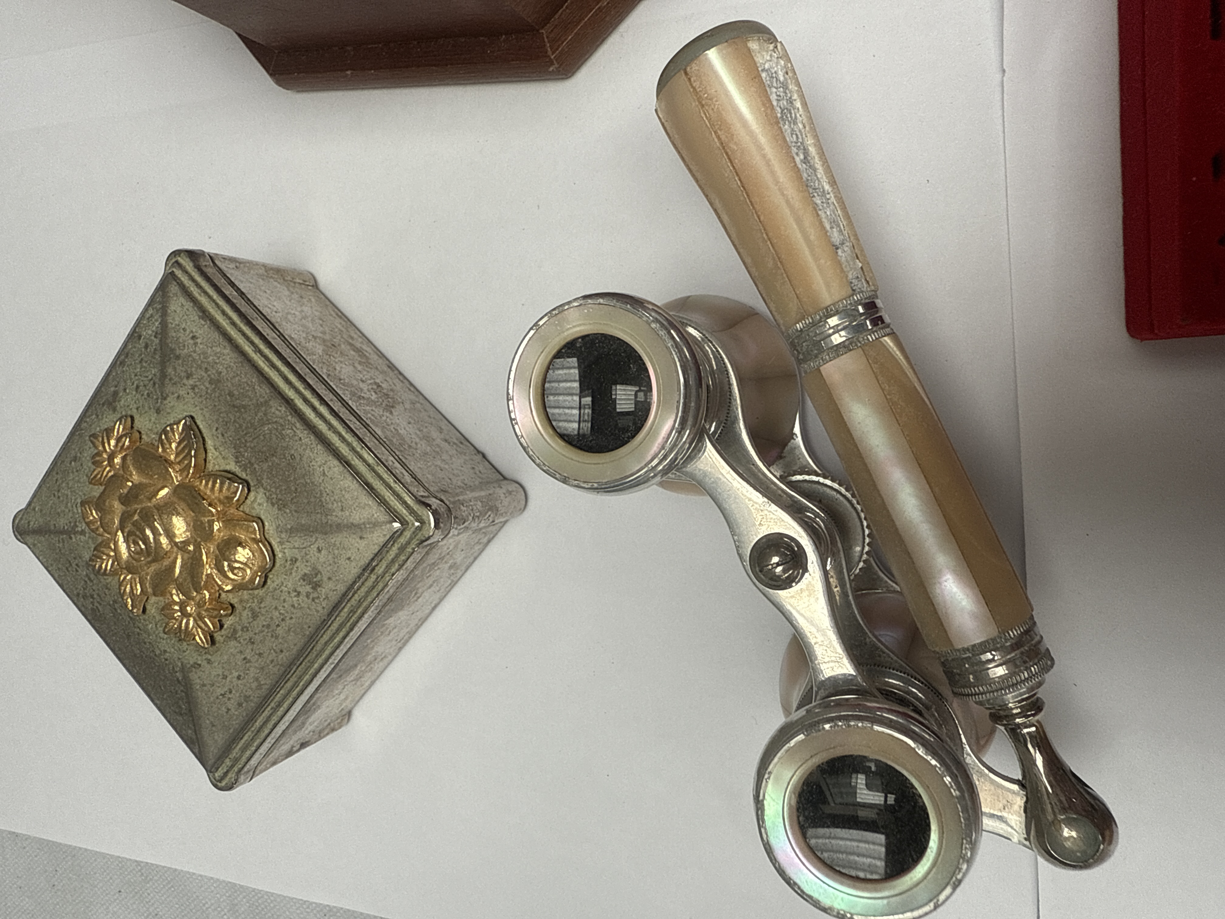 A varied collection comprising seven distinct items. Included is a square, silver-toned metal trinket box with a gilded floral appliqué lid. A pair of silver-toned metal opera glasses features mother-of-pearl handles and is marked “MADE IN FRANCE.” Also present is an octagonal wooden box with a glass lid adorned with a painted white and yellow floral design, bearing inventory stickers “F.3921” and “24035.” A rectangular red velvet-covered box with an embossed pattern on its lid is part of the lot. A heavy, dark metal desk accessory, likely a rocker blotter or paperweight, features decorative scrollwork and a curvilinear base, possibly Art Nouveau in style. An associated small, open brown cardboard box is marked “MADE IN GERMANY.” The collection is completed by a small lot of gold-toned costume jewelry, including a necklace with a green enamel teapot pendant, a plain chain, and two matching green enamel stud earrings.