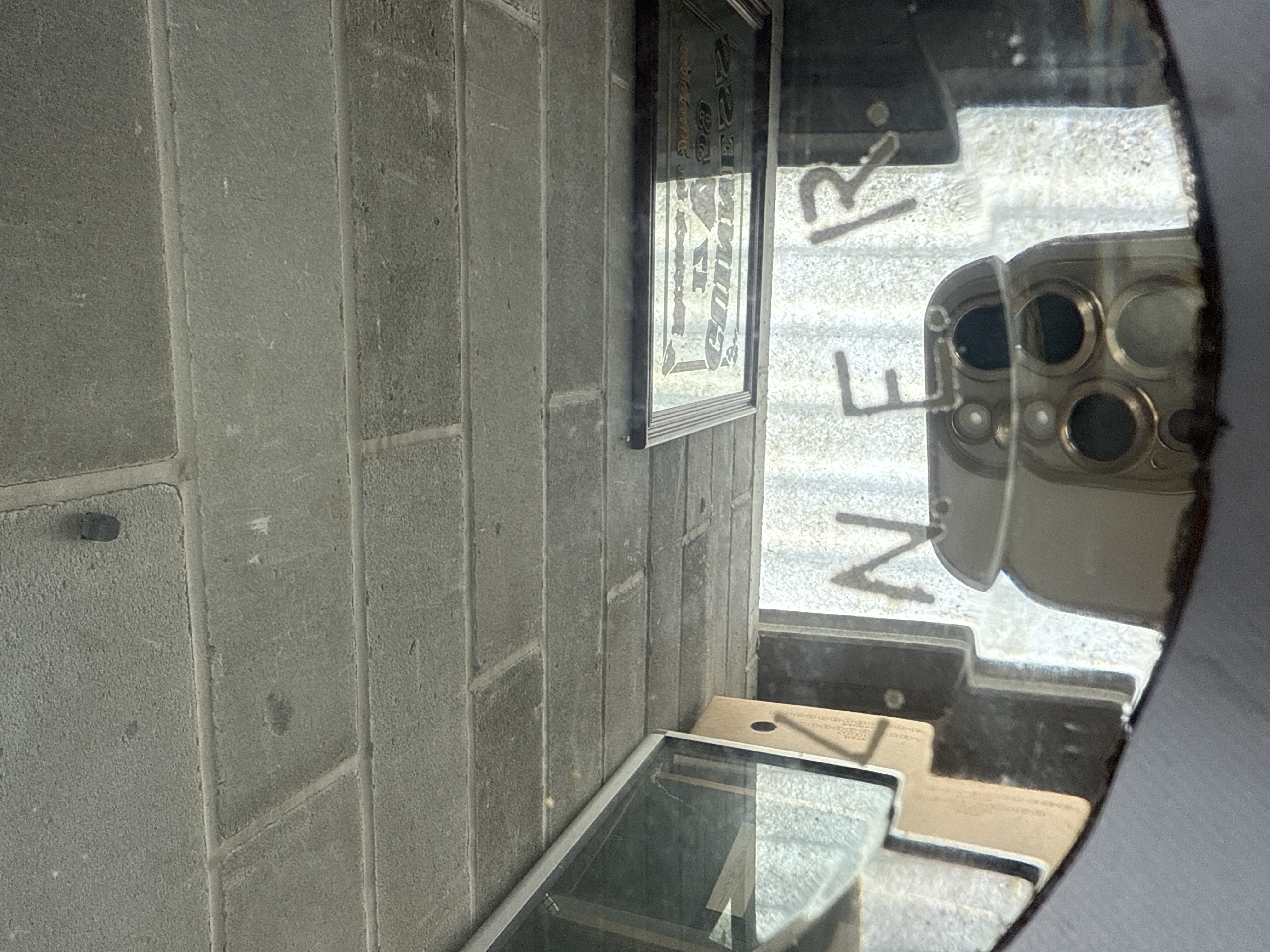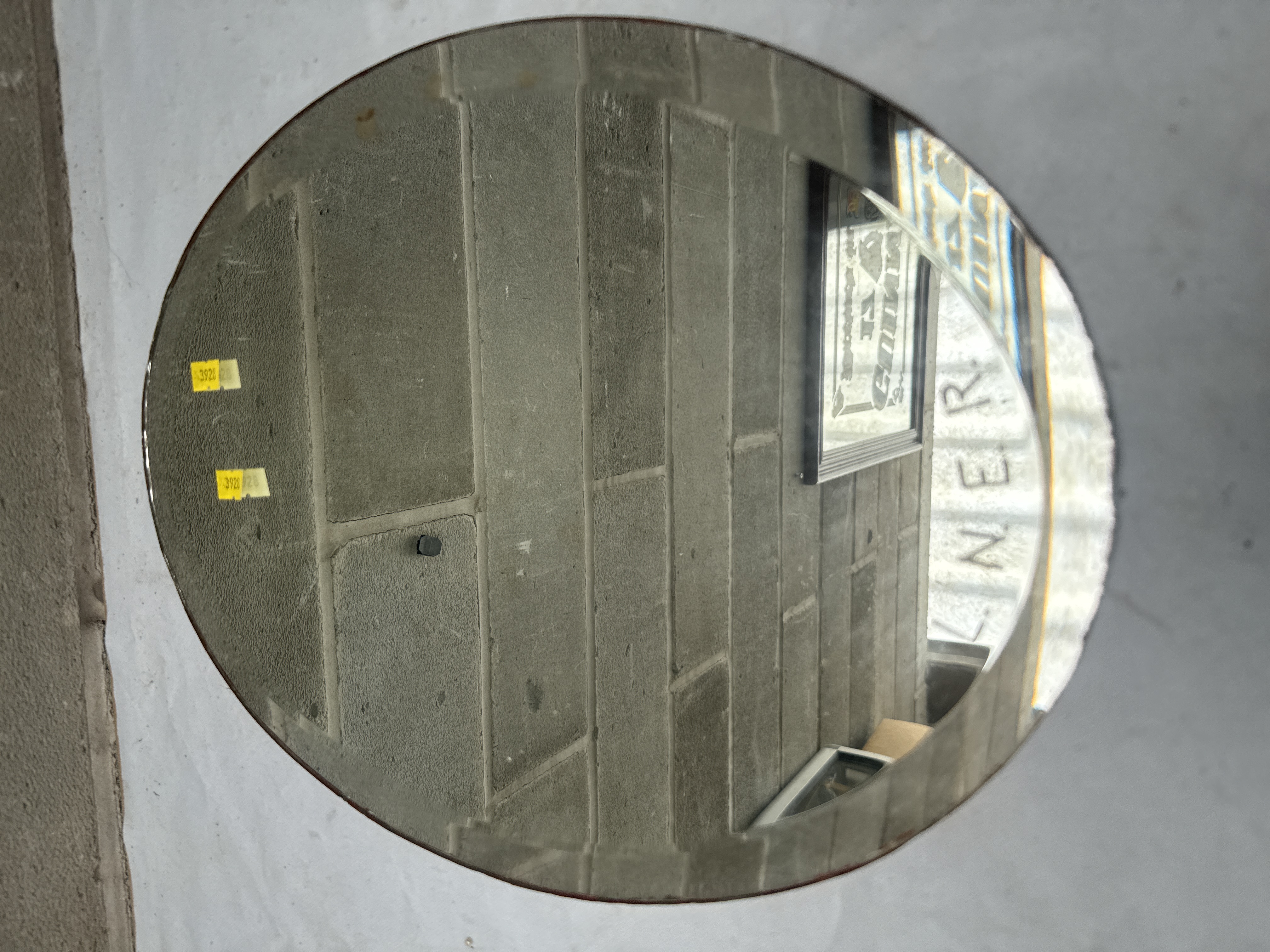 An oval beveled glass mirror, prominently featuring the etched or applied English word ‘LNER’ in a sans-serif font. Consistent with a minimalist design, likely from the Art Deco or mid-century modern period. The mirror exhibits a clear reflection.