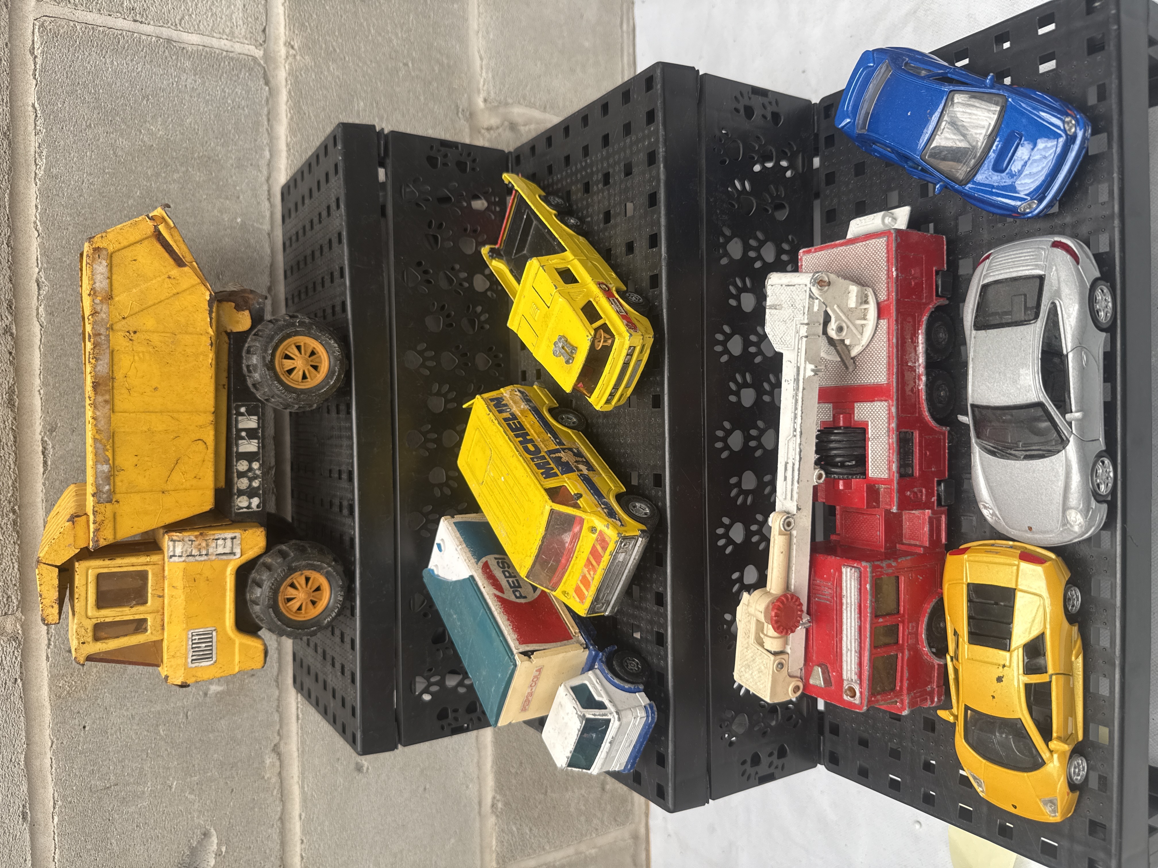 A collection of nine assorted die-cast toy vehicles, crafted from painted metal and plastic, representing various periods from the mid-20th century to early 21st century. The collection includes a large, vintage-style yellow dump truck, with faint “MADE IN GREAT BRITAIN” markings visible on its underside. Also featured are a white and blue box truck marked “PEPSI-COLA,” a yellow van prominently displaying “MICHELIN” branding with its logo, and a yellow pickup truck with visible “Firestone” text and a pair of binoculars in its bed. The group further comprises a red fire engine, a yellow sports car, a silver sports car, and a blue sedan.
