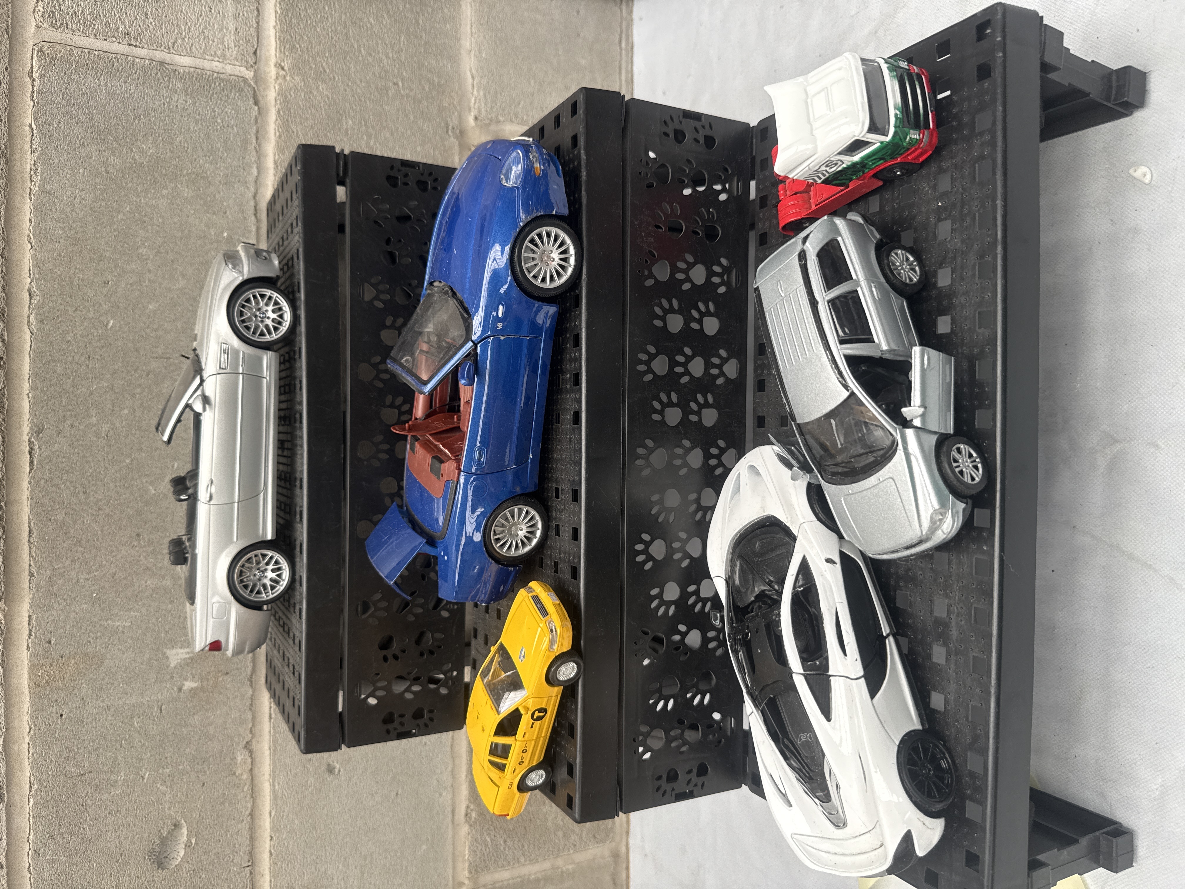 A collection of seven assorted die-cast model vehicles, primarily of modern design, by makers such as Burago and Maisto, constructed from a combination of die-cast metal and plastic. The collection includes six specifically identified models: a silver BMW M3 convertible, a yellow Ford Crown Victoria-style taxi bearing the markings “TAXI,” “NYC,” and “7C43” with a stylized “T” logo, a blue Maserati convertible with a visible “V8” badge, a white McLaren-style sports car, a silver Volvo XC90-style SUV, and a red, white, and green semi-truck cab with partially visible “DHS” lettering on its side stripe. The models are displayed on black plastic modular shelving units adorned with paw-print cutouts.