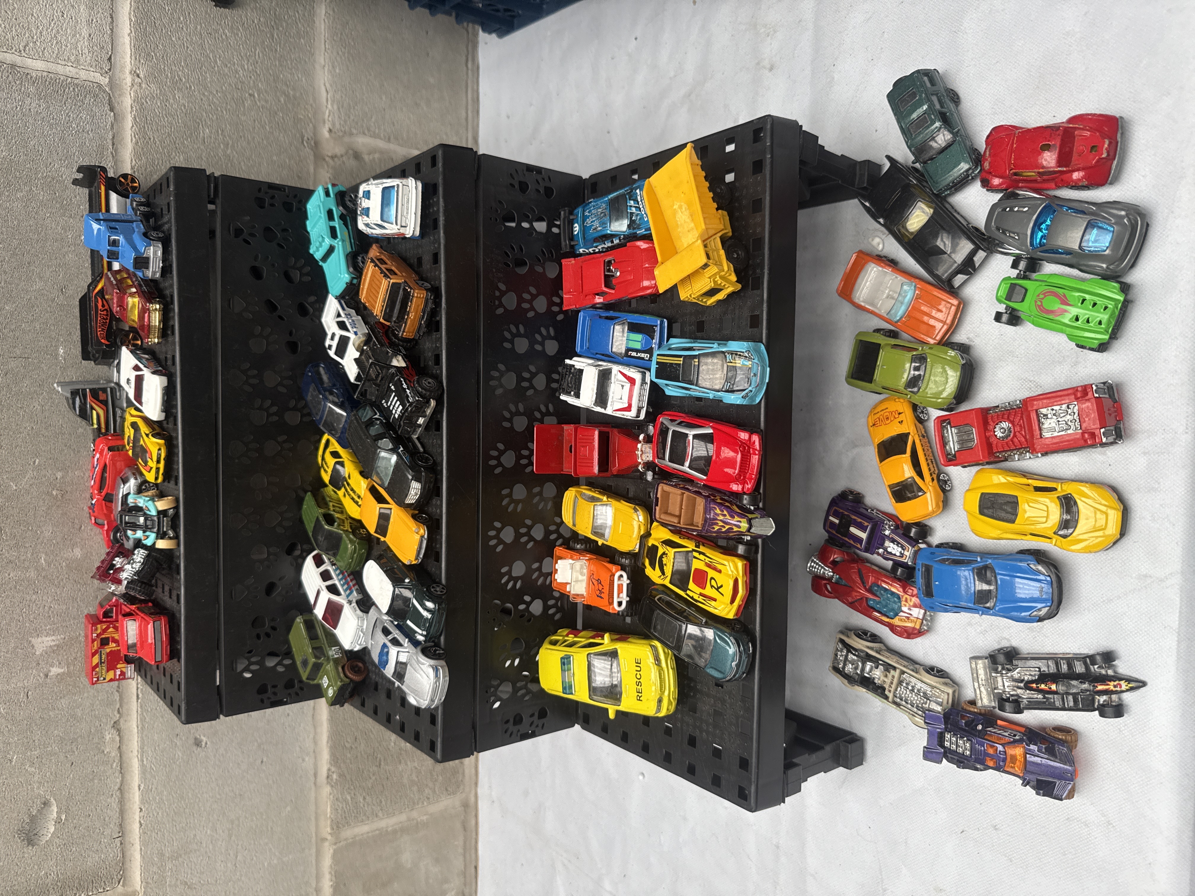 A collection of approximately 60-70 miniature die-cast model vehicles, predominantly by Hot Wheels and Matchbox, presented on black modular plastic display shelves with paw-print cutouts. The vehicles encompass a variety of cars, trucks, SUVs, and specialized service vehicles, reflecting a predominantly contemporary style ranging from classic designs to modern and fantasy types, indicative of late 20th to early 21st-century production. Each vehicle is constructed from a die-cast metal body with a plastic chassis and details. Visible markings include “RESCUE”, “AMBULANCE”, “POLICE”, “HOT WHEELS”, “CHRYSLER”, “DODGE”, “FALKEN”, “TURNING POINT”, and “MOVE”, along with various numerical identifiers.