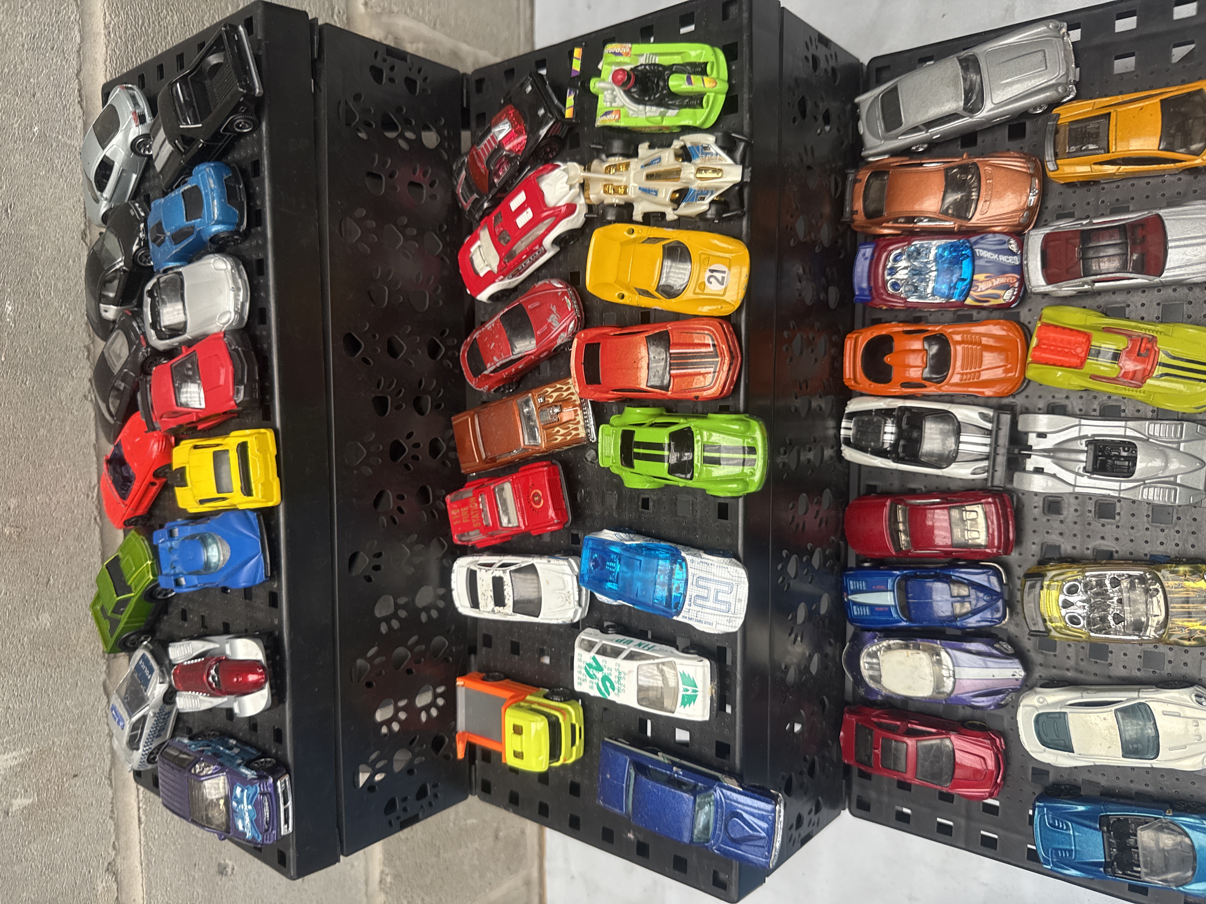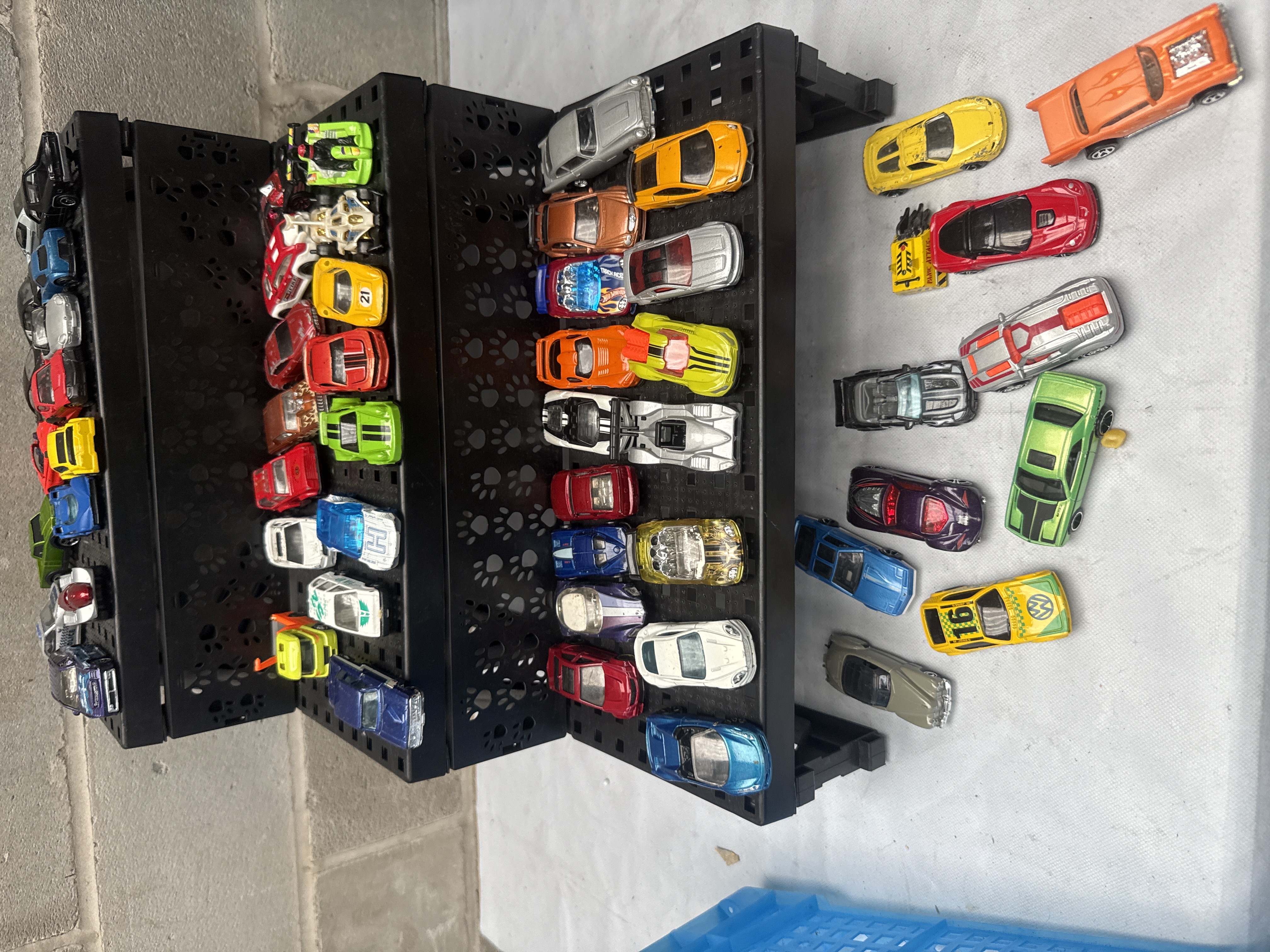 A collection of Hot Wheels 1:64 scale die-cast toy cars, comprising approximately 60 or more miniature vehicles typical of the modern to contemporary period. Each car features a metal body with plastic components. The collection is partially presented on black, tiered display shelves adorned with paw print cutouts, while other vehicles rest on a white surface. Visible markings include the number “21” on one yellow car and “16” along with a stylized “W” or “M” logo on another yellow vehicle.