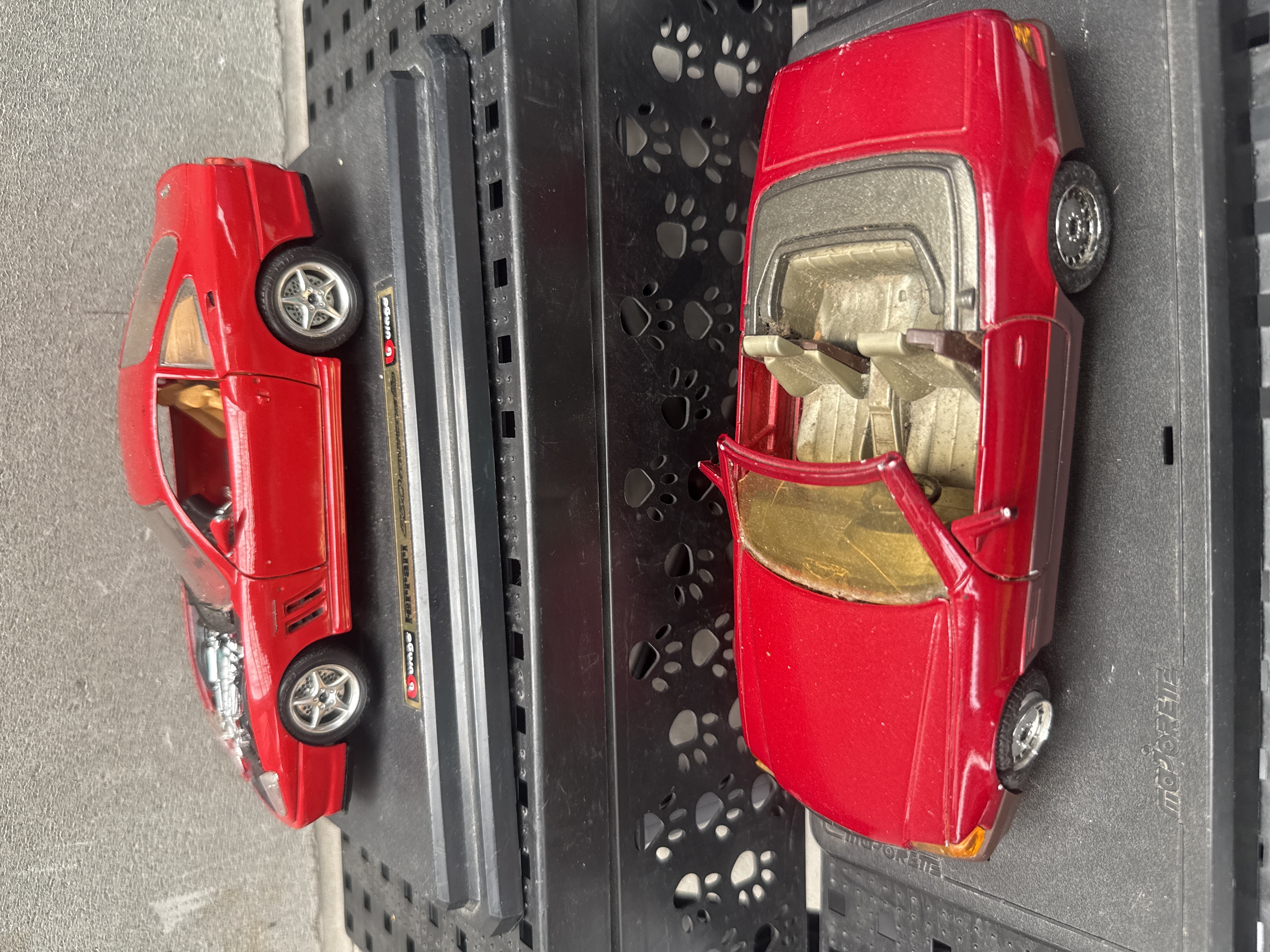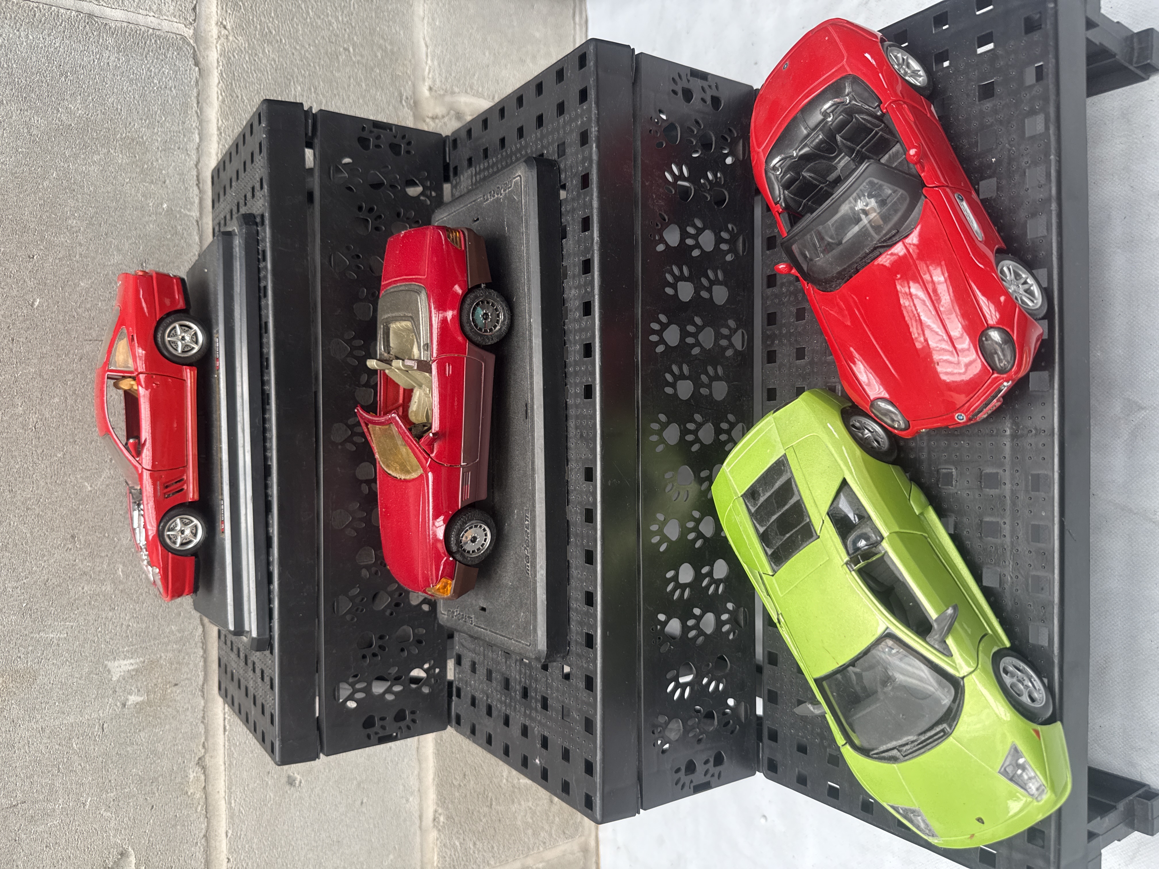A group of four die-cast model cars, primarily by Maisto and Bburago, likely 1:18 scale ‘Special Edition’ models, dating from the late 20th to early 21st century. The lot includes a red Bburago Ferrari coupe, a red Maisto convertible, a bright green coupe resembling a Lamborghini, and a red convertible suggestive of a Mercedes-Benz SL model with ‘SL’ visible on the rear license plate area. All models are displayed on black, tiered plastic risers featuring paw-print cutouts.