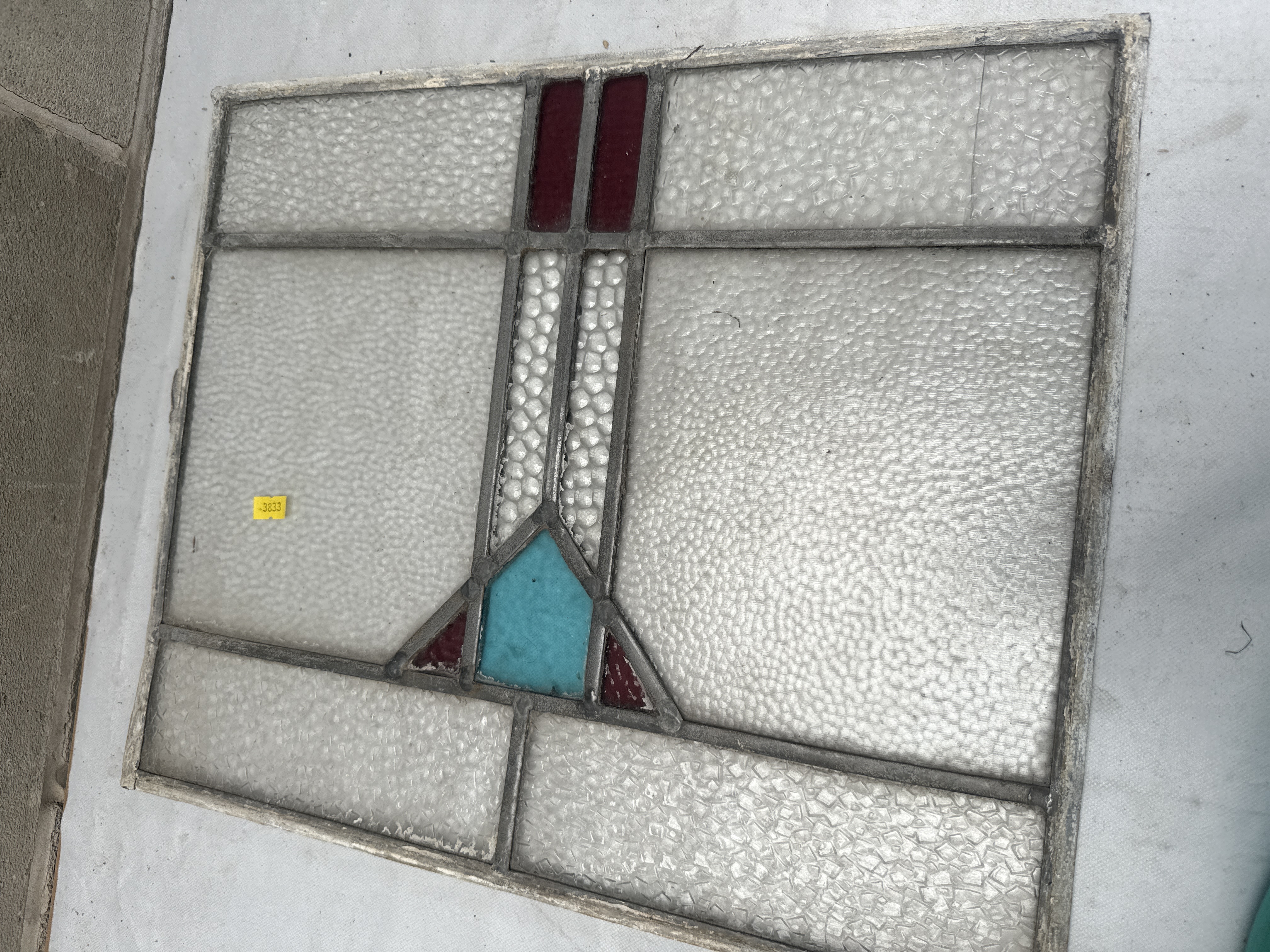 An Old English leaded stained glass window panel, rectangular in form, constructed with various clear textured glass panes. The design is accented by opaque teal-blue and deep red glass segments, forming a geometric pattern evocative of Art Deco or Prairie School styles, likely dating from the early to mid-20th century. The glass pieces are held together by dark metal cames, likely lead or zinc. A small yellow sticker displaying the number “J-3833” is affixed to one of the clear textured panes.